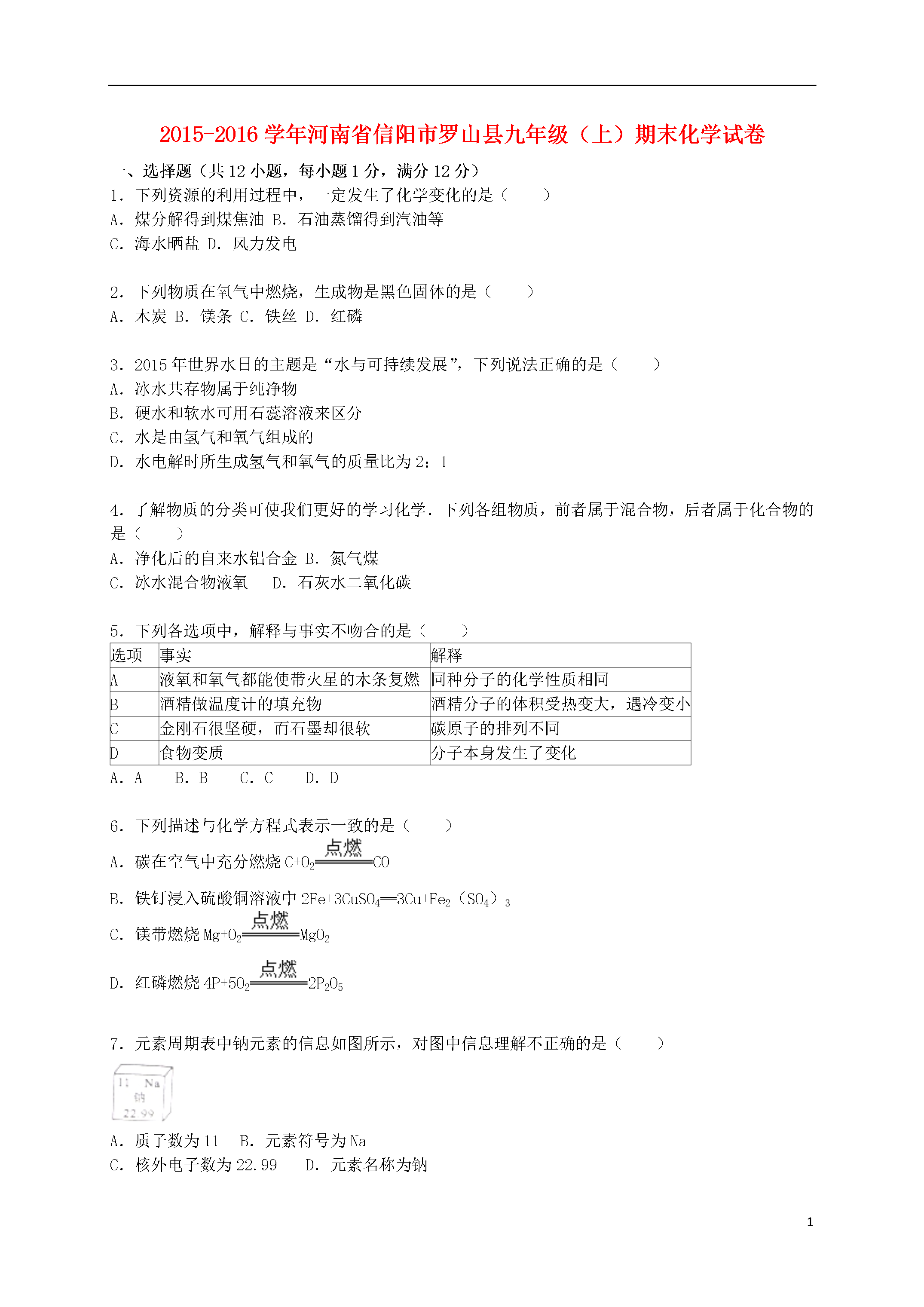 试题-河南-2016_河南省信阳市罗山县2015-2016学年九年级化学上学期期末试题(含解析) 新人教版.doc