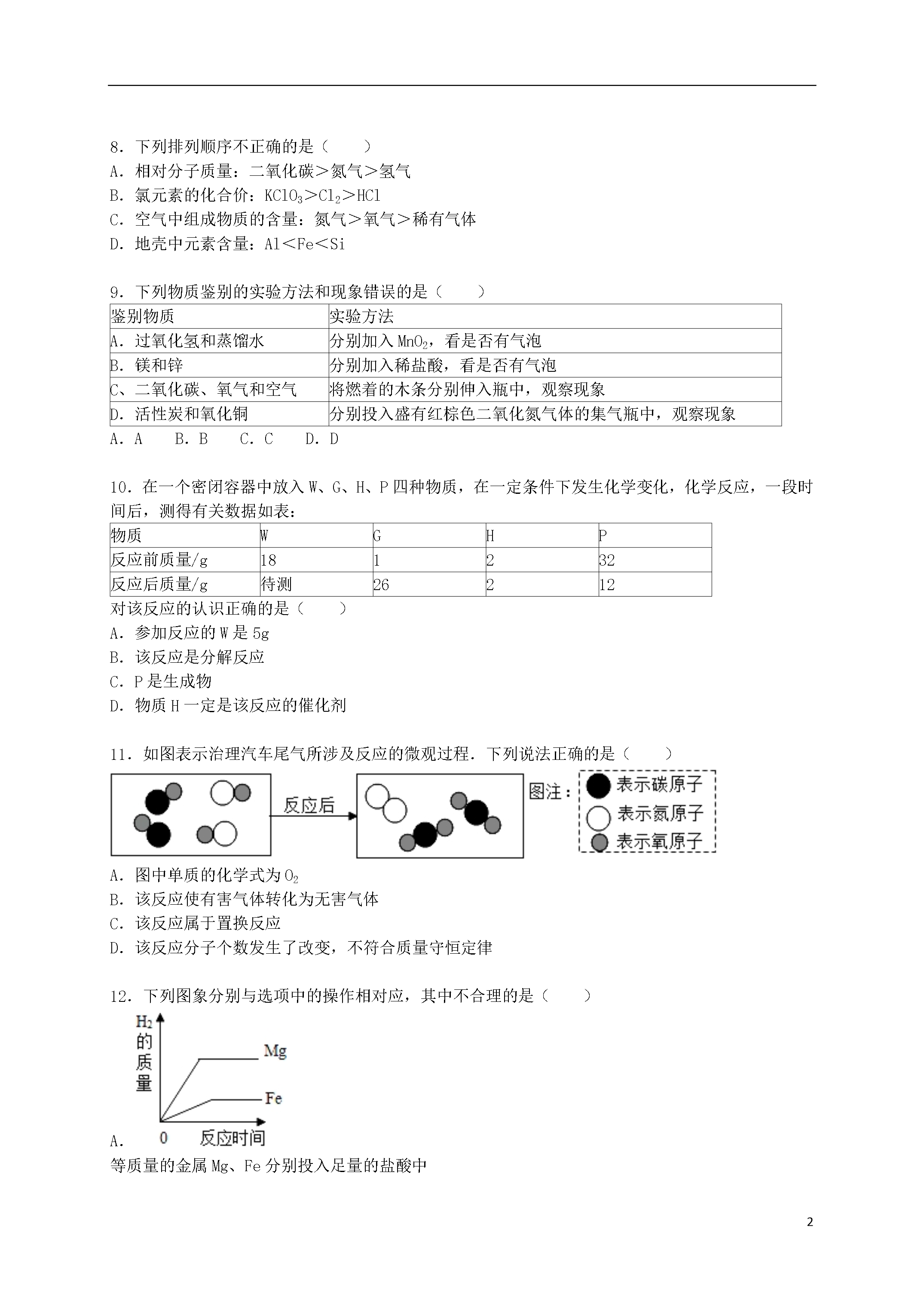 182015-2016学年河南省信阳市罗山县九年级(上)期末化学试卷一、选择题(共12小题,每小题1分,满分12分)1.下列资源的利用过程中,一定发生了化学变化的是()A.煤分解得到煤焦油B.石油蒸馏得到汽油等C.海水晒盐D.风力发电2.下列物质在氧气中燃烧,生成物是黑色固体的是()A.木炭B.镁条C.铁丝D.红磷3.2015年世界水日的主题是“水与可持续发展”,下列说法正确的是()A.冰水共存物属于纯净物B.硬水和软水可用石蕊溶液来区分C.水是由氢气和氧气组成的D.水电解时所生成氢气和氧气的质量比为2:14.了解物质的分类可使我们更好的学习化学.下列各组物质,前者属于混合物,后者属于化合物的是()A.净化后的自来水铝合金B.氮气煤C.冰水混合物液氧D.石灰水二氧化碳5.下列各选项中,解释与事实不吻合的是()选项事实解释A液氧和氧气都能使带火星的木条复燃同种分子的化学性质相同B酒精做温度计的填充物酒精分子的体积受热变大,遇冷变小C金刚石很坚硬,而石墨却很软碳原子的排列不同D食物变质分子本身发生了变化A.AB.BC.CD.D6.下列描述与化学方程式表示一致的是()A.碳在空气中充分燃烧C+O2COB.铁钉浸入硫酸铜溶液中2Fe+3CuSO4═3Cu+Fe2(SO4)3C.镁带燃烧Mg+O2MgO2D.红磷燃烧4P+5O22P2O57.元素周期表中钠元素的信息如图所示,对图中信息理解不正确的是()A.质子数为11B.元素符号为NaC.核外电子数为22.99D.元素名称为钠8.下列排列顺序不正确的是()A.相对分子质量:二氧化碳>氮气>氢气B.氯元素的化合价:KClO3>Cl2>HClC.空气中组成物质的含量:氮气>氧气>稀有气体D.地壳中元素含量:Al<Fe<Si9.下列物质鉴别的实验方法和现象错误的是()鉴别物质实验方法A.过氧化氢和蒸馏水分别加入MnO2,看是否有气泡B.镁和锌分别加入稀盐酸,看是否有气泡C、二氧化碳、氧气和空气将燃着的木条分别伸入瓶中,观察现象D.活性炭和氧化铜分别投入盛有红棕色二氧化氮气体的集气瓶中,观察现象A.AB.BC.CD.D10.在一个密闭容器中放入W、G、H、P四种物质,在一定条件下发生化学变化,化学反应,一段时间后,测得有关数据如表:物质WGHP反应前质量/g181232反应后质量/g待测26212对该反应的认识正确的是()A.参加反应的W是5gB.该反应是分解反应C.P是生成物D.物质H一定是该反应的催化剂11.如图表示治理汽车尾气所涉及反应的微观过程.下列说法正确的是()A.图中单质的化学式为O2B.该反应使有害气体转化为无害气体C.该反应属于置换反应D.该反应分子个数发生了改变,不符合质量守恒定律12.下列图象分别与选项中的操作相对应,其中不合理的是()A.等质量的金属Mg、Fe分别投入足量的盐酸中B.充分加热氯酸钾与二氧化锰的混合物C.水的电解D.一定量的石灰石加入过量稀盐酸中二、填空题(共6小题,每小题2分,满分16分)13.在C、H、O、Ca四种元素中,选择元素组成合适物质用化学式填空.(1)能做燃料的氧化物是;(2)可用于实验室制取二氧化碳的物质是.14.如图是元素周期表的一部分.原子序数为10的元素名称为;氟原子的核外电子数为,等质量的氧气和氟气中,所含原子数较少的是.8O氧16.009F氟19.0010Ne20.1815.天然气完全燃烧的化学方程式为;消防队员常用高压水枪灭火,其灭火的原理是;氢气作燃料的优点是(答出一条即可).16.如图是某反应的微现示意图.图中的单质为;该反应前后化合价没有发生变化的元素为;生成物的质量比为.17.已知,A、B、C、D四种物质之间存在以下转化关系,其中C是单质,D是相对分子质量最小的氧化物.试回答(1)写出浅绿色溶液B中溶质的化学式;(2)A→C的化学方程式为,C→D的化学方程式为.18.在点燃条件下,2.6gC2H2与7.2gO2恰好完全反应,生成6.6gCO2、1.8gH2O和xgCO.则x=;化学方程式为.三、解答题(共5小题,满分22分)19.在碳、一氧化碳、二氧化碳、氧气四种物质中,每一种物质都有不同于其他三种物质的特点,例如:碳:常温常压下是固体,其它三种是气体.请根据示例,填空:(1)一氧化碳:;(2)二氧化碳:;(3)氧气:.20.按要求写出下列化学方程式(1)二氧化碳能够使澄清的石灰水变浑浊(2)钠与水反应生成氢氧化钠和氢气.21.金属活动性顺序在工农业生产和科学研究中有重要应用.(1)铝比较活泼,为什么铝制品却有很好的抗腐蚀性能?(2)农业上不能用铁制容器配制农药波尔多液(含硫酸铜),请用方程式解释.(3)探究实验:分别用不同量的锌加入到一定量的Mg(NO3)2、Cu(NO3)2、AgNO3混合溶液中,充分反应后过滤.以下