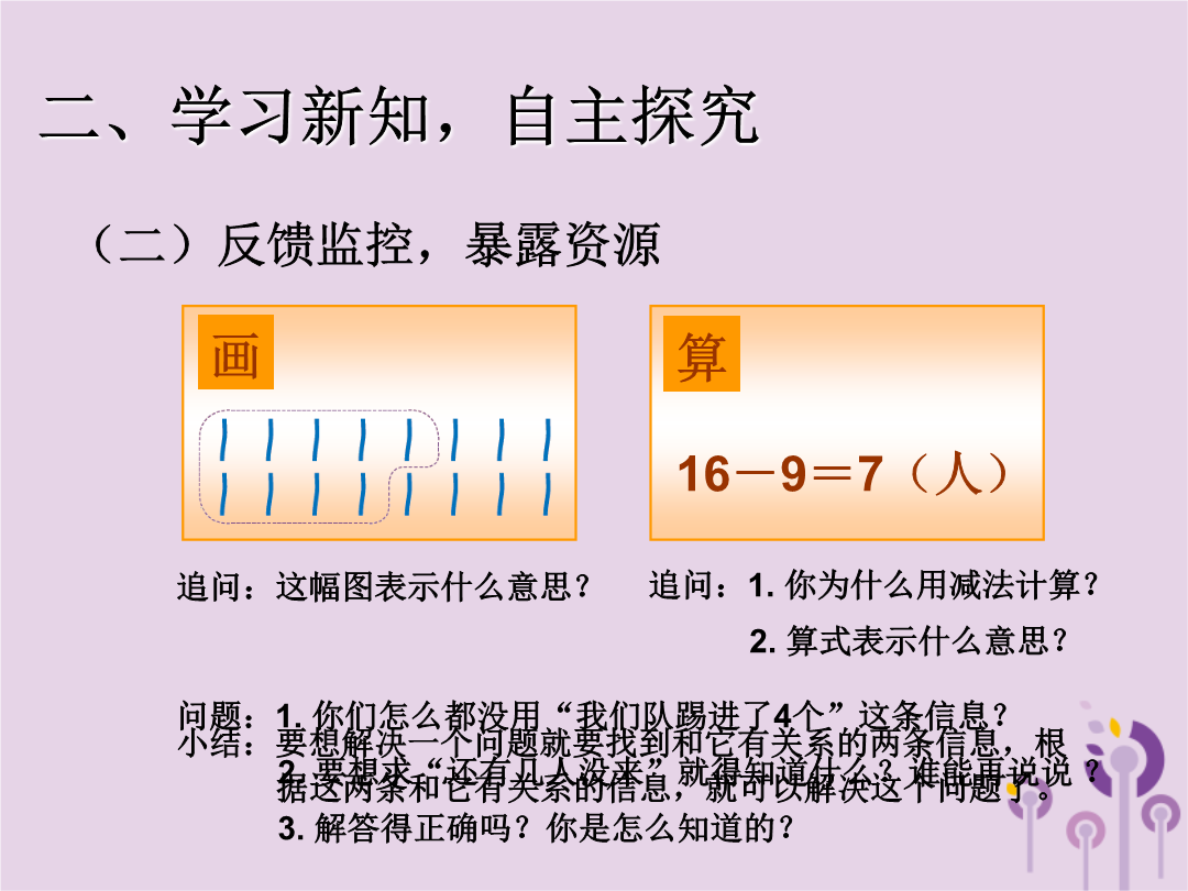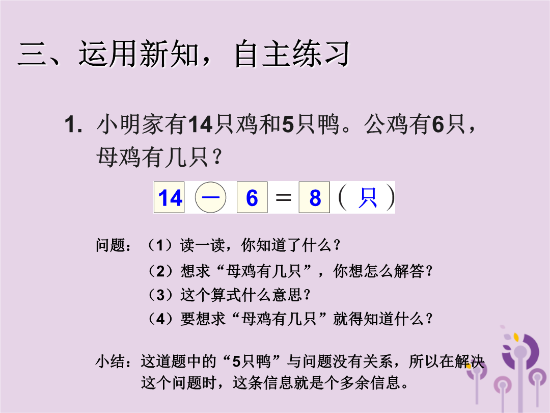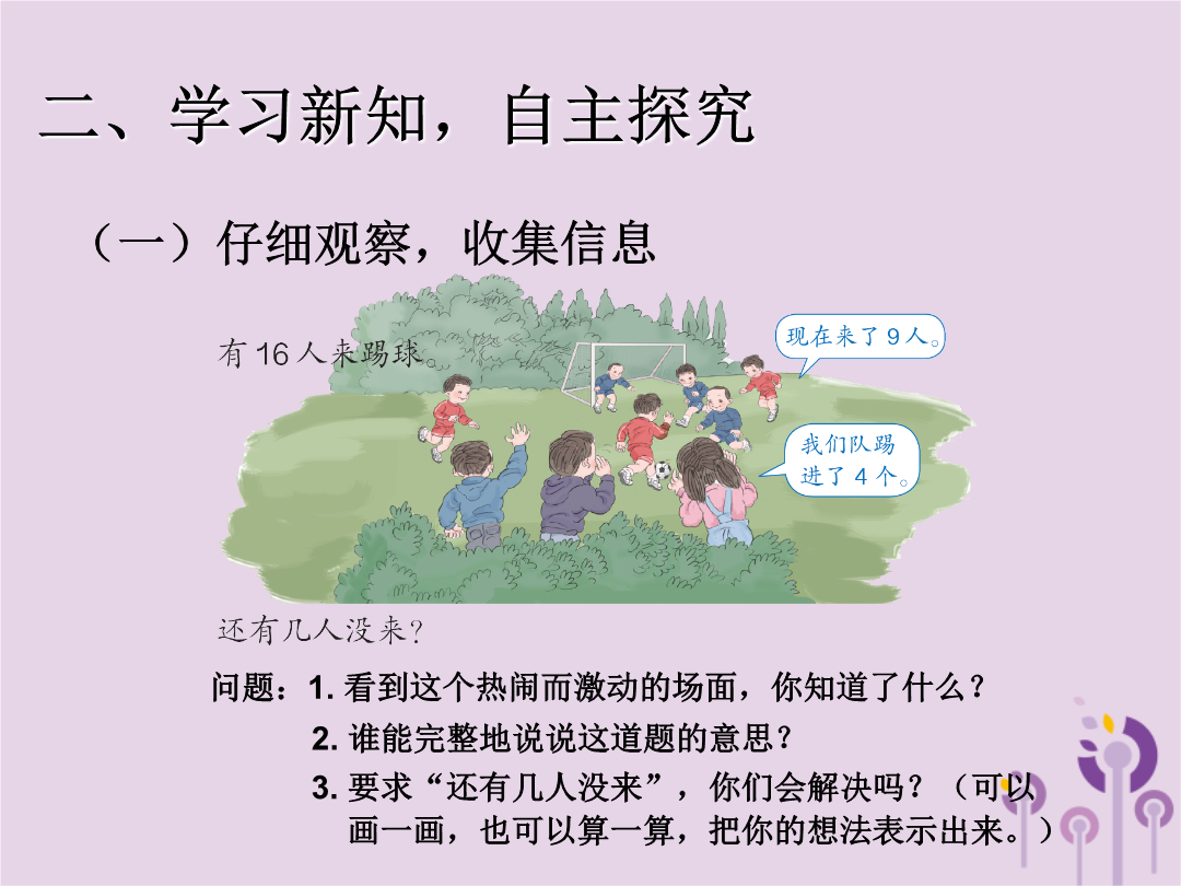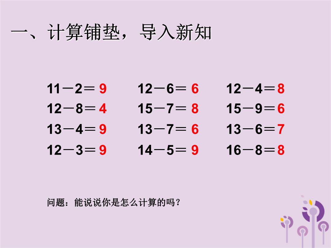 20以内的退位减法一、计算铺垫,导入新知二、学习新知,自主探究2.要想求“还有几人没来”就得知道什么?谁能再说说?三、运用新知,自主练习三、运用新知,自主练习三、运用新知,自主练习4.红红买了15本课外书和13个笔记本,其中有7本故事书,其他类的书有几本?作业:练习五,第1题、第4题。