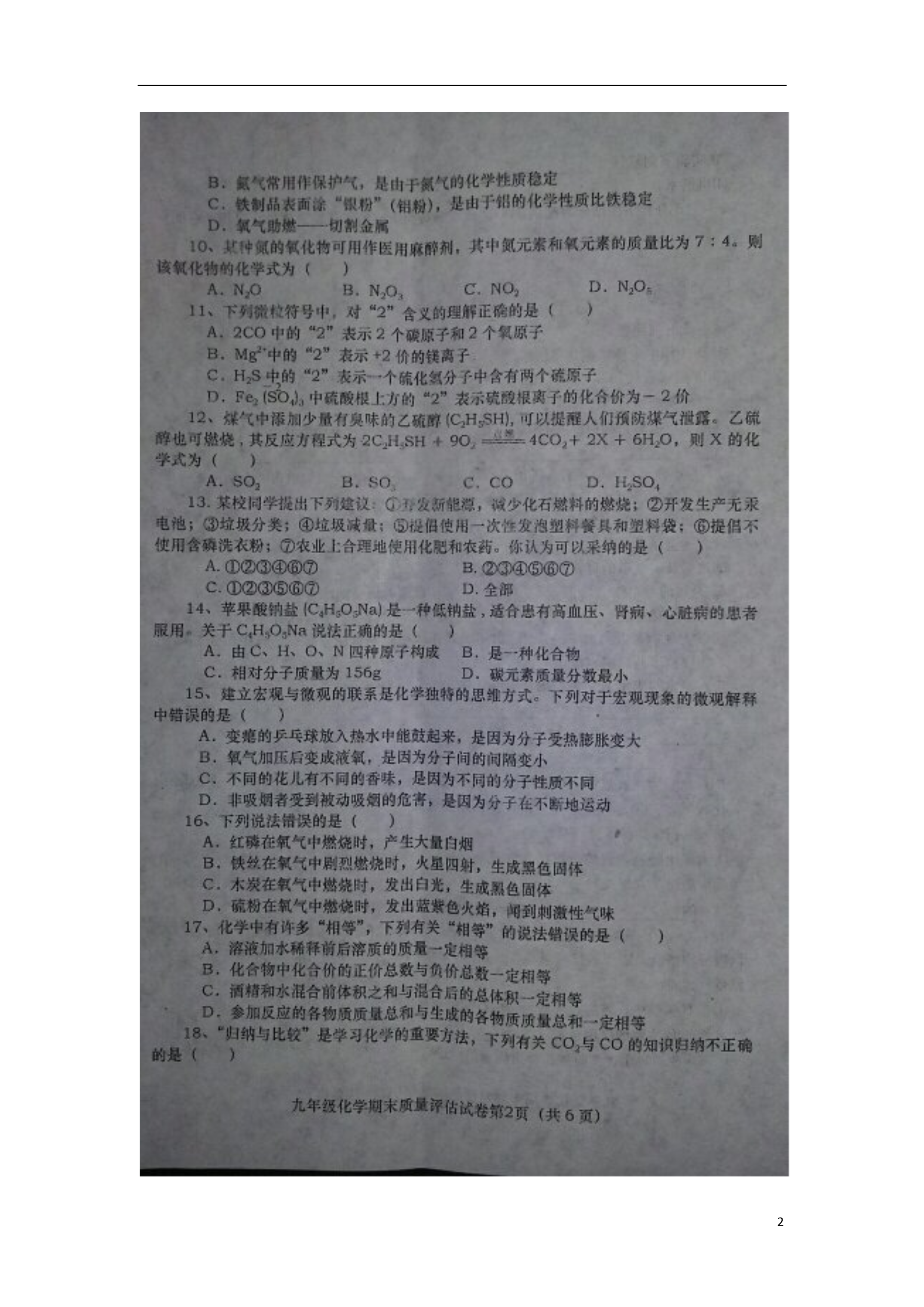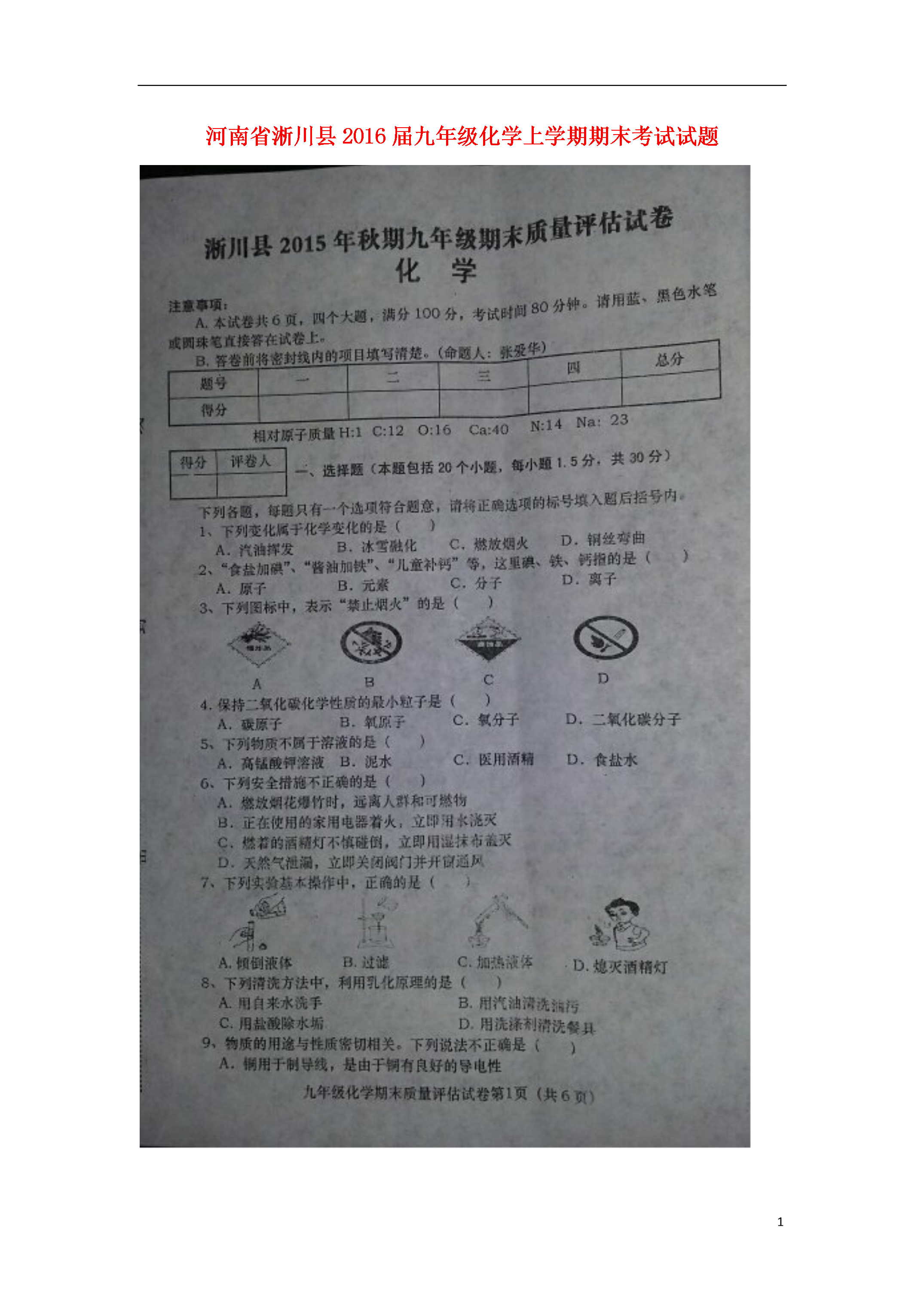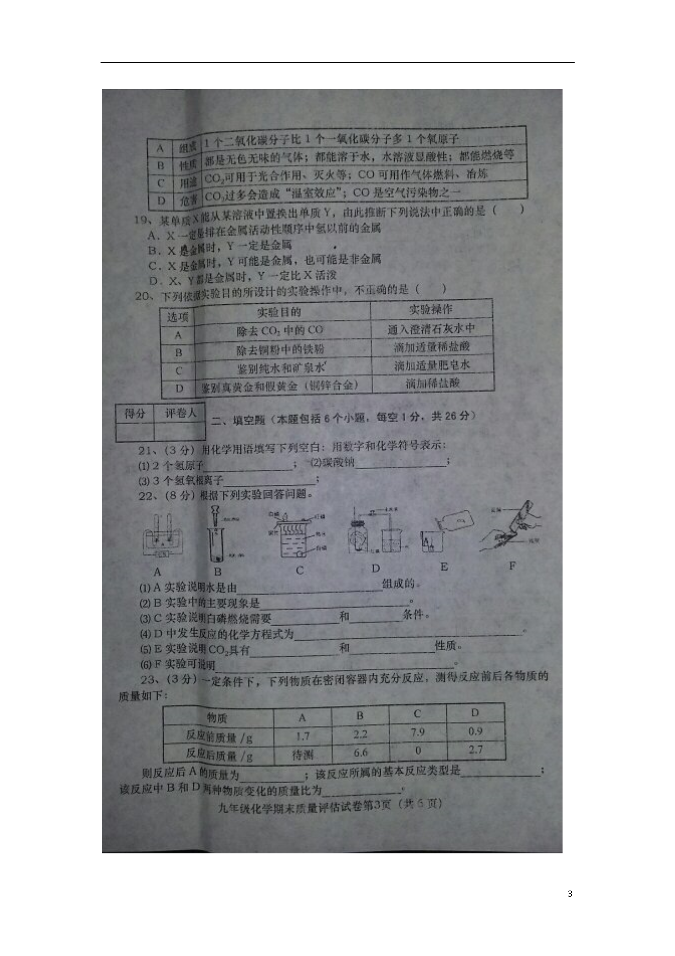 8河南省淅川县2016届九年级化学上学期期末考试试题淅川县2015年秋期九年级期终质量评估试卷化学参考答案注意事项:1.答出其他合理答案,请参照评分标准给分。2.没有特别要求写化学式的,写化学式或名称均得分。选择题(每小题1.5分,共30分)题号12345678910答案CBDDBBCDCA题号11121314151617181920答案DAABACCBCA二、填空题(每空1分,共26分)21、(1)2H;(2)Na2CO3;(3)3OH-22、1)氢元素和氧元素;2)剧烈反应,并有大量气泡生成;3)与氧气接触,温度达到白磷的着火点;4)4P+5O22P2O55)密度比空气大,不燃烧也不支持燃烧;6)黄铜比纯铜的硬度大;23、3.4g分解反应22:924、(1)①2质子数②分子③BC(2)BD25.(1)水(2)B(3)甲(4)BD26.碳原子的排列方式不同2CO+O22CO2(3CO+Fe2O32Fe+3CO2CO+CuOCu+CO2CO2+C2CO等)分子的构成不同三、简答题(共24分)27、反应物的浓度(1分)反应物的浓度越大,反应速率越快;如物质在氧气中燃烧比在空气中快得多(1分)。(反应物的接触面积反应物的接触面积越大,反应速率越快;如煤粉的燃烧比煤块快得多。)(合理即可)28、(1)2H2O22H2O+O2↑(1分)(2)3Fe+2O2Fe3O4(1分)(3)Zn+H2SO4=ZnSO4+H2↑(1分)(4)2H2O2H2↑+O2↑(1分)29、5(1分)100(1分)凹液面的最低处(1分)氯化钠没有全部倒入烧杯中(1分)量取时,仰视读数(1分)【药品受潮或称量时,药品与砝码放反(游码有读数)或烧杯不干燥或氯化钠中混有杂质或倾倒时有些氯化钠漏在桌子上等等】30、(1)Al(铝)(1分)(2)A(1分)(3)Ⅰ)A:3CO+Fe2O3高温2Fe+3CO(1分)B:CO2+Ca(OH)2==CaCO3↓+H2O(1分)C:2CO+O2点燃2CO2(1分)Ⅱ)④③②①⑥⑤(1分)(4)Fe+H2SO4====FeSO4+H2↑(1分)CuSO4[或Cu(NO3)2或CuCl2溶液或用名称表达](1分)31、(1)紫(或不变色);(1分)作对比实验(1分)(或得出水不能使紫色石蕊纸花变红)(2)不能;(1分)(3)在A装置中通二氧化碳。(1分)(或增加一个实验,在干燥的二氧化碳中,放晒干紫色石蕊纸花,试纸不变色.)(4)试纸又变蓝(1分)四、综合运用题(共20分)32、(1)C(1分)(2)石油(1分)CH4+2O2点燃CO2+2H2O(1分)(3)CO2(1分)①③(1分)(4)CO2+2NH3高温高压CO(NH2)2+H2O(1分)33、(1)长颈漏斗(1分)(2)B(1分)固体与液体反应且不需加热(1分)C(1分)(3)检查装置的气密性(1分)2KMnO4K2MnO4+MnO2+O2↑(1分)C或E(1分)(4)75%(2分)26.4g(共5分)