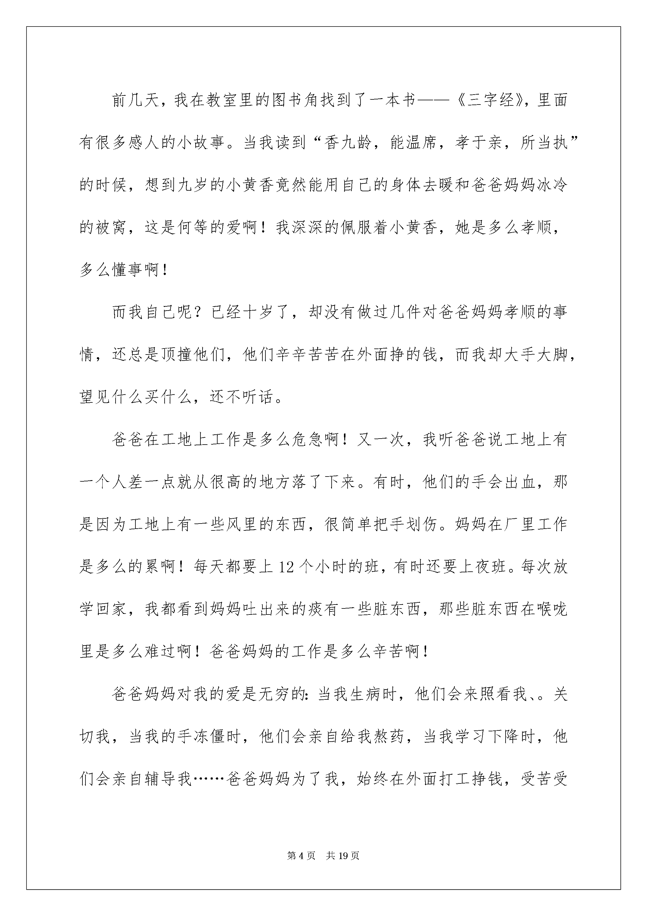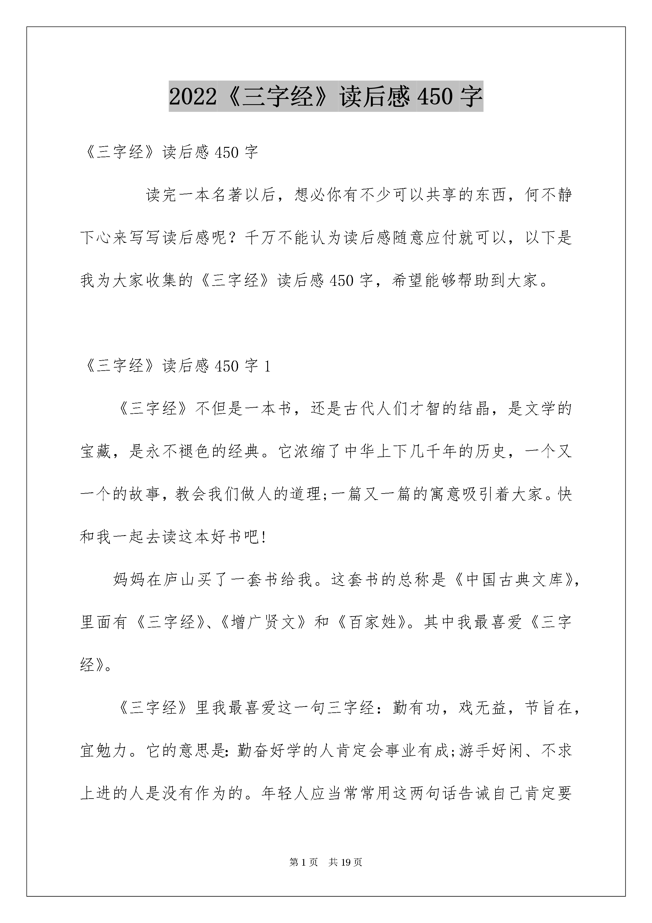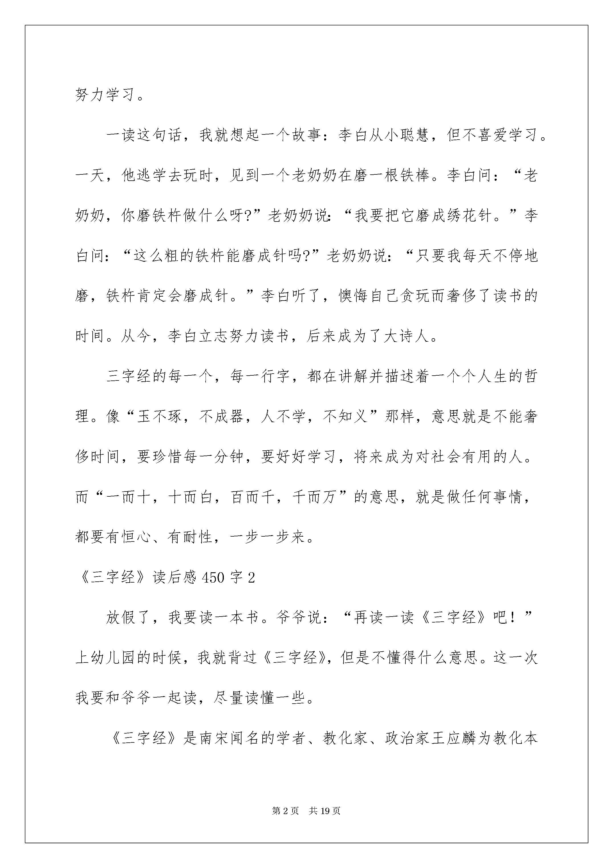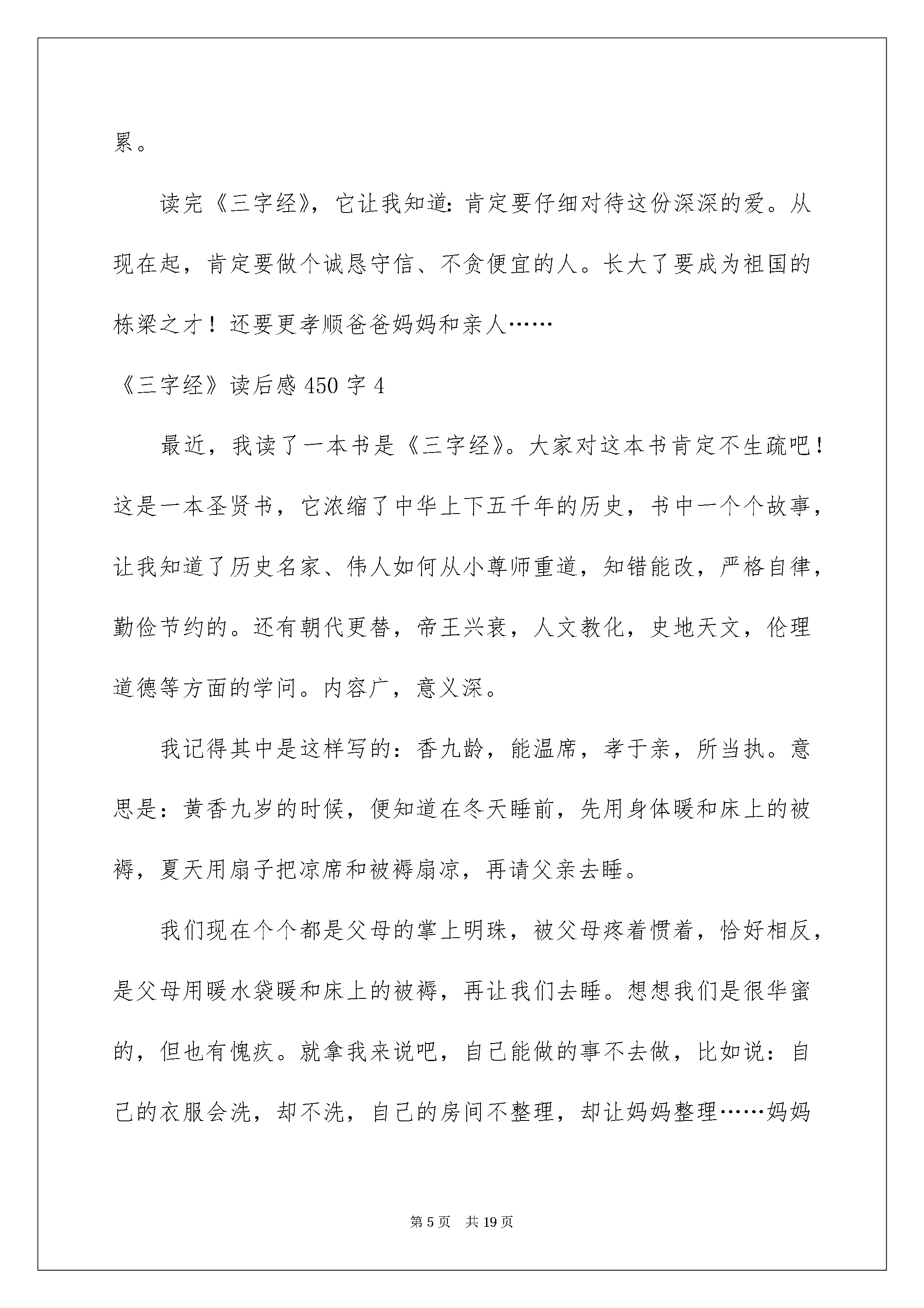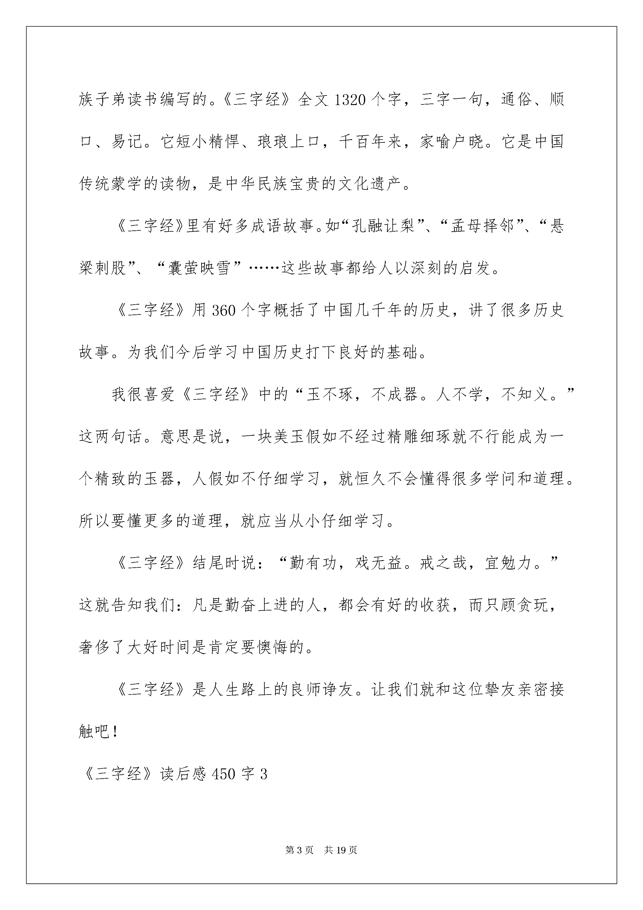 2022《三字经》读后感450字《三字经》读后感450字读完一本名著以后,想必你有不少可以共享的东西,何不静下心来写写读后感呢?千万不能认为读后感随意应付就可以,以下是我为大家收集的《三字经》读后感450字,希望能够帮助到大家。《三字经》读后感450字1《三字经》不但是一本书,还是古代人们才智的结晶,是文学的宝藏,是永不褪色的经典。它浓缩了中华上下几千年的历史,一个又一个的故事,教会我们做人的道理;一篇又一篇的寓意吸引着大家。快和我一起去读这本好书吧!妈妈在庐山买了一套书给我。这套书的总称是《中国古典文库》,里面有《三字经》、《增广贤文》和《百家姓》。其中我最喜爱《三字经》。《三字经》里我最喜爱这一句三字经:勤有功,戏无益,节旨在,宜勉力。它的意思是:勤奋好学的人肯定会事业有成;游手好闲、不求上进的人是没有作为的。年轻人应当常常用这两句话告诫自己肯定要努力学习。一读这句话,我就想起一个故事:李白从小聪慧,但不喜爱学习。一天,他逃学去玩时,见到一个老奶奶在磨一根铁棒。李白问:“老奶奶,你磨铁杵做什么呀?”老奶奶说:“我要把它磨成绣花针。”李白问:“这么粗的铁杵能磨成针吗?”老奶奶说:“只要我每天不停地磨,铁杵肯定会磨成针。”李白听了,懊悔自己贪玩而奢侈了读书的时间。从今,李白立志努力读书,后来成为了大诗人。三字经的每一个,每一行字,都在讲解并描述着一个个人生的哲理。像“玉不琢,不成器,人不学,不知义”那样,意思就是不能奢侈时间,要珍惜每一分钟,要好好学习,将来成为对社会有用的人。而“一而十,十而白,百而千,千而万”的意思,就是做任何事情,都要有恒心、有耐性,一步一步来。《三字经》读后感450字2放假了,我要读一本书。爷爷说:“再读一读《三字经》吧!”上幼儿园的时候,我就背过《三字经》,但是不懂得什么意思。这一次我要和爷爷一起读,尽量读懂一些。《三字经》是南宋闻名的学者、教化家、政治家王应麟为教化本族子弟读书编写的。《三字经》全文1320个字,三字一句,通俗、顺口、易记。它短小精悍、琅琅上口,千百年来,家喻户晓。它是中国传统蒙学的读物,是中华民族宝贵的文化遗产。《三字经》里有好多成语故事。如“孔融让梨”、“孟母择邻”、“悬梁刺股”、“囊萤映雪”……这些故事都给人以深刻的启发。《三字经》用360个字概括了中国几千年的历史,讲了很多历史故事。为我们今后学习中国历史打下良好的基础。我很喜爱《三字经》中的“玉不琢,不成器。人不学,不知义。”这两句话。意思是说,一块美玉假如不经过精雕细琢就不行能成为一个精致的玉器,人假如不仔细学习,就恒久不会懂得很多学问和道理。所以要懂更多的道理,就应当从小仔细学习。《三字经》结尾时说:“勤有功,戏无益。戒之哉,宜勉力。”这就告知我们:凡是勤奋上进的人,都会有好的收获,而只顾贪玩,奢侈了大好时间是肯定要懊悔的。《三字经》是人生路上的良师诤友。让我们就和这位挚友亲密接触吧!《三字经》读后感450字3前几天,我在教室里的图书角找到了一本书——《三字经》,里面有很多感人的小故事。当我读到“香九龄,能温席,孝于亲,所当执”的时候,想到九岁的小黄香竟然能用自己的身体去暖和爸爸妈妈冰冷的被窝,这是何等的爱啊!我深深的佩服着小黄香,她是多么孝顺,多么懂事啊!而我自己呢?已经十岁了,却没有做过几件对爸爸妈妈孝顺的事情,还总是顶撞他们,他们辛辛苦苦在外面挣的钱,而我却大手大脚,望见什么买什么,还不听话。爸爸在工地上工作是多么危急啊!又一次,我听爸爸说工地上有一个人差一点就从很高的地方落了下来。有时,他们的手会出血,那是因为工地上有一些风里的东西,很简单把手划伤。妈妈在厂里工作是多么的累啊!每天都要上12个小时的班,有时还要上夜班。每次放学回家,我都看到妈妈吐出来的痰有一些脏东西,那些脏东西在喉咙里是多么难过啊!爸爸妈妈的工作是多么辛苦啊!爸爸妈妈对我的爱是无穷的:当我生病时,他们会来照看我、。关切我,当我的手冻僵时,他们会亲自给我熬药,当我学习下降时,他们会亲自辅导我……爸爸妈妈为了我,始终在外面打工挣钱,受苦受累。读完《三字经》,它让我知道:肯定要仔细对待这份深深的爱。从现在起,肯定要做个诚恳守信、不贪便宜的人。长大了要成为祖国的栋梁之才!还要更孝顺爸爸妈妈和亲人……《三字经》读后感450字4最近,我读了一本书是《三字经》。大家对这本书肯定不生疏吧!这是一本圣贤书,它浓缩了中华上下五千年的历史,书中一个个故事,让我知道了历史名家、伟人如何从小尊师重道,知错能改,严格自律,勤俭节约的。还有朝代更替,帝王兴衰,人文教化,史地天文,伦理道德等方面的学问。内容广,意义深。我