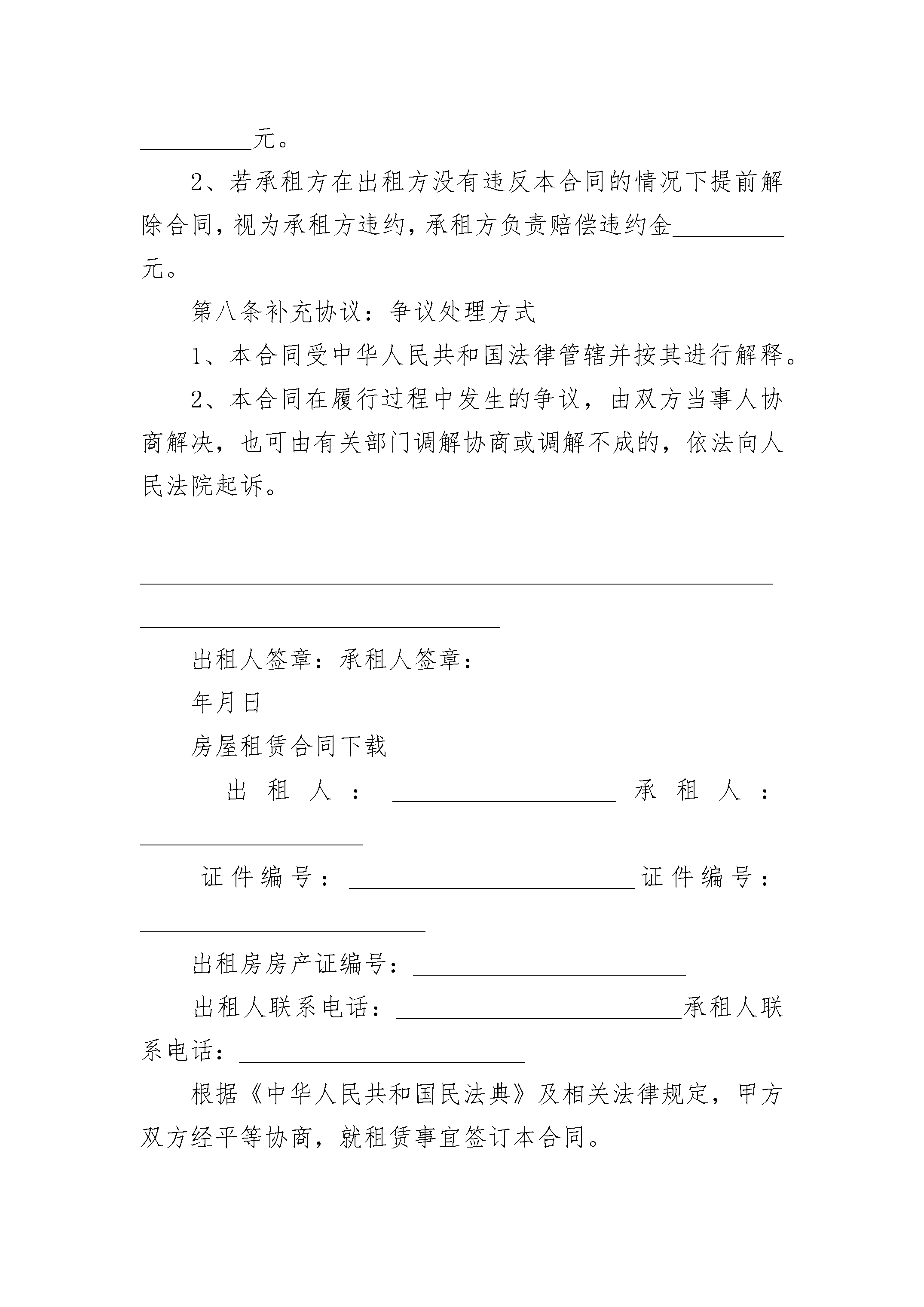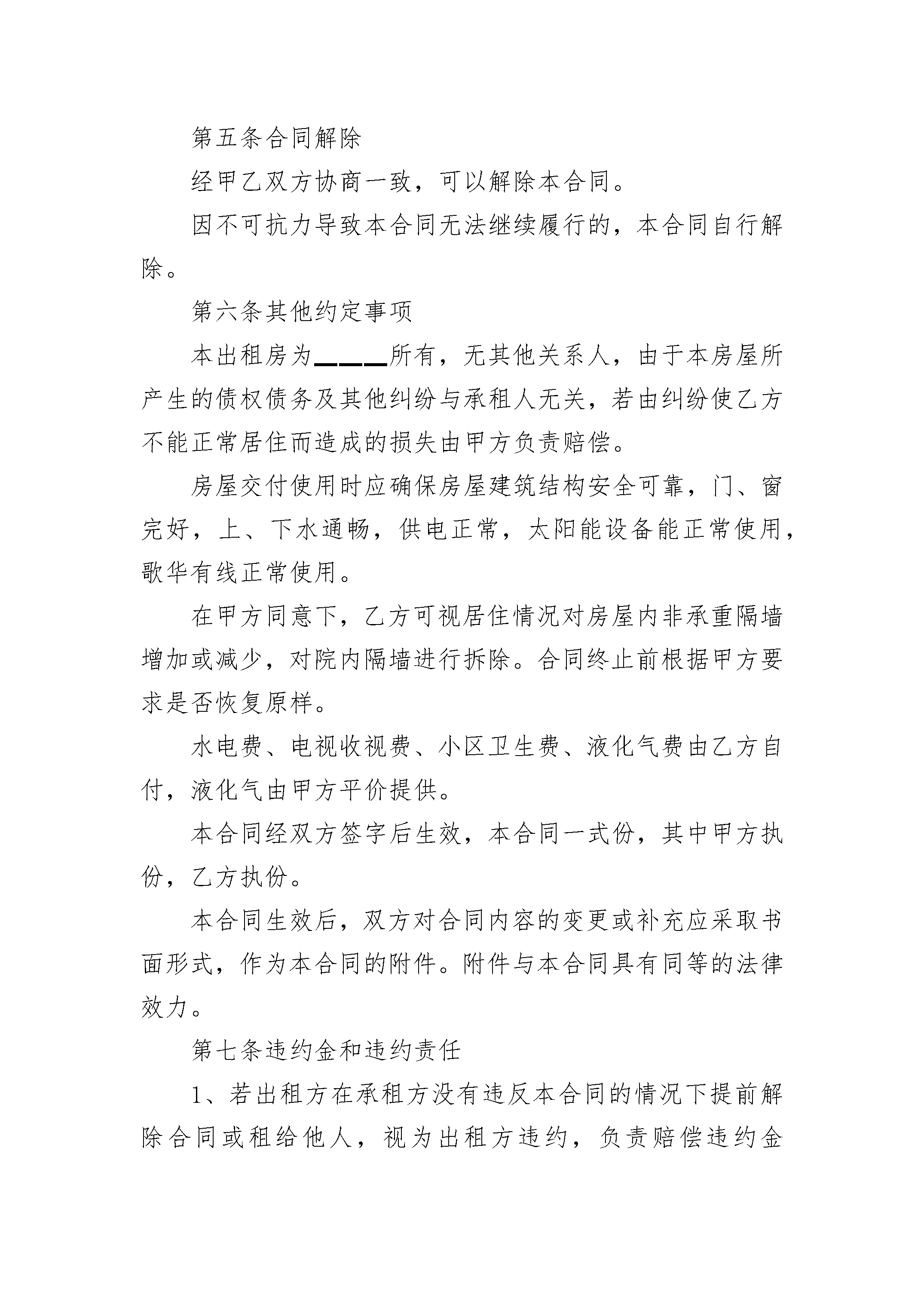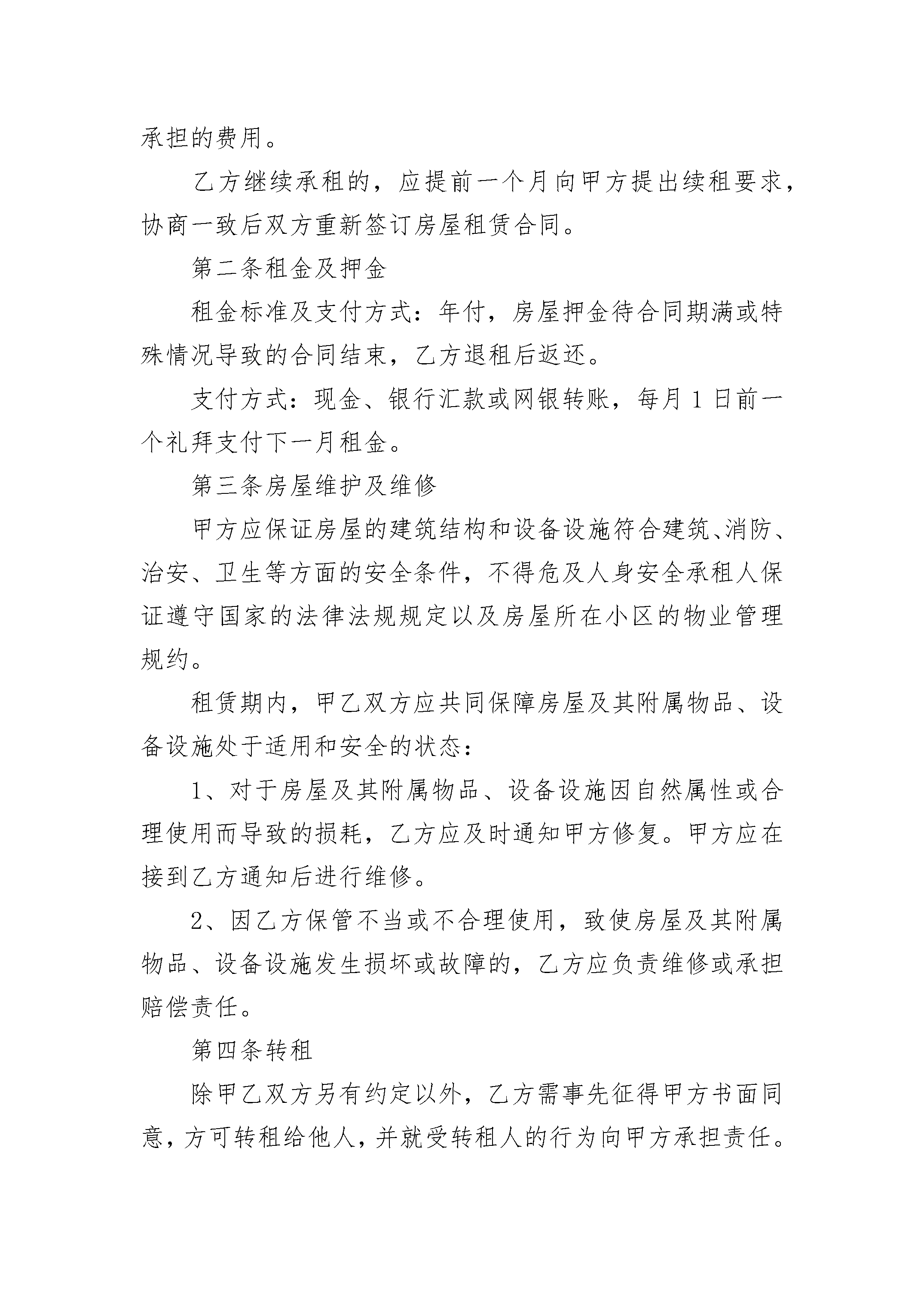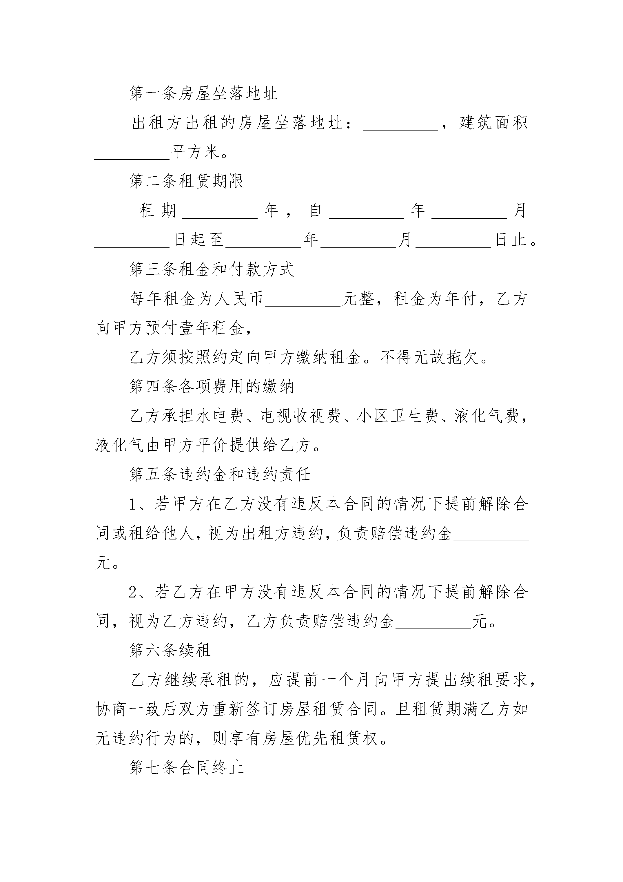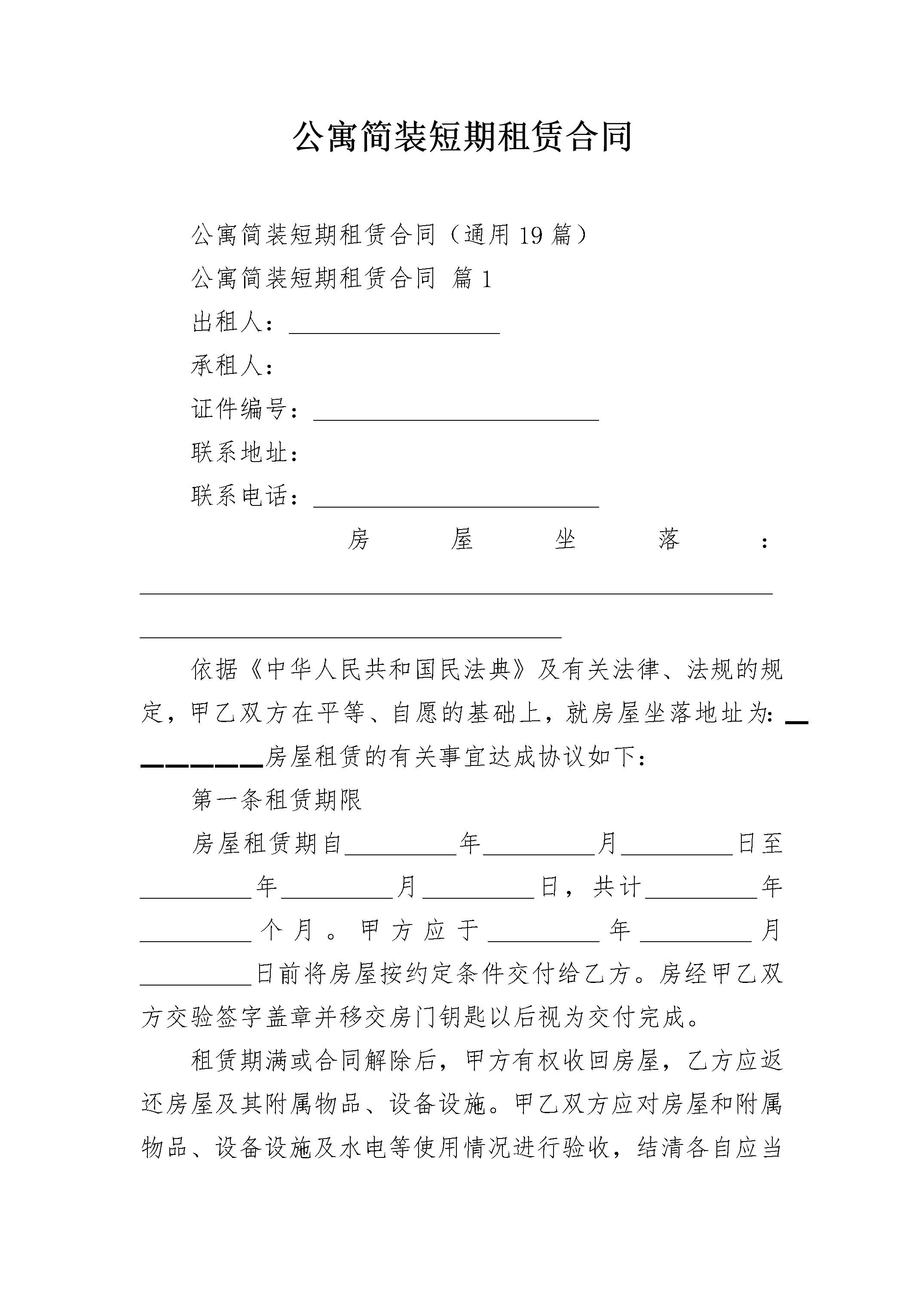 公寓简装短期租赁合同公寓简装短期租赁合同(通用19篇)公寓简装短期租赁合同篇1出租人:_________________承租人:证件编号:_______________________联系地址:联系电话:_______________________房屋坐落:_____________________________________________________________________________________依据《中华人民共和国民法典》及有关法律、法规的规定,甲乙双方在平等、自愿的基础上,就房屋坐落地址为:▁▁▁▁▁▁房屋租赁的有关事宜达成协议如下:第一条租赁期限房屋租赁期自_________年_________月_________日至_________年_________月_________日,共计_________年_________个月。甲方应于_________年_________月_________日前将房屋按约定条件交付给乙方。房经甲乙双方交验签字盖章并移交房门钥匙以后视为交付完成。租赁期满或合同解除后,甲方有权收回房屋,乙方应返还房屋及其附属物品、设备设施。甲乙双方应对房屋和附属物品、设备设施及水电等使用情况进行验收,结清各自应当承担的费用。乙方继续承租的,应提前一个月向甲方提出续租要求,协商一致后双方重新签订房屋租赁合同。第二条租金及押金租金标准及支付方式:年付,房屋押金待合同期满或特殊情况导致的合同结束,乙方退租后返还。支付方式:现金、银行汇款或网银转账,每月1日前一个礼拜支付下一月租金。第三条房屋维护及维修甲方应保证房屋的建筑结构和设备设施符合建筑、消防、治安、卫生等方面的安全条件,不得危及人身安全承租人保证遵守国家的法律法规规定以及房屋所在小区的物业管理规约。租赁期内,甲乙双方应共同保障房屋及其附属物品、设备设施处于适用和安全的状态:1、对于房屋及其附属物品、设备设施因自然属性或合理使用而导致的损耗,乙方应及时通知甲方修复。甲方应在接到乙方通知后进行维修。2、因乙方保管不当或不合理使用,致使房屋及其附属物品、设备设施发生损坏或故障的,乙方应负责维修或承担赔偿责任。第四条转租除甲乙双方另有约定以外,乙方需事先征得甲方书面同意,方可转租给他人,并就受转租人的行为向甲方承担责任。第五条合同解除经甲乙双方协商一致,可以解除本合同。因不可抗力导致本合同无法继续履行的,本合同自行解除。第六条其他约定事项本出租房为▁▁▁所有,无其他关系人,由于本房屋所产生的债权债务及其他纠纷与承租人无关,若由纠纷使乙方不能正常居住而造成的损失由甲方负责赔偿。房屋交付使用时应确保房屋建筑结构安全可靠,门、窗完好,上、下水通畅,供电正常,太阳能设备能正常使用,歌华有线正常使用。在甲方同意下,乙方可视居住情况对房屋内非承重隔墙增加或减少,对院内隔墙进行拆除。合同终止前根据甲方要求是否恢复原样。水电费、电视收视费、小区卫生费、液化气费由乙方自付,液化气由甲方平价提供。本合同经双方签字后生效,本合同一式份,其中甲方执份,乙方执份。本合同生效后,双方对合同内容的变更或补充应采取书面形式,作为本合同的附件。附件与本合同具有同等的法律效力。第七条违约金和违约责任1、若出租方在承租方没有违反本合同的情况下提前解除合同或租给他人,视为出租方违约,负责赔偿违约金_________元。2、若承租方在出租方没有违反本合同的情况下提前解除合同,视为承租方违约,承租方负责赔偿违约金_________元。第八条补充协议:争议处理方式1、本合同受中华人民共和国法律管辖并按其进行解释。2、本合同在履行过程中发生的争议,由双方当事人协商解决,也可由有关部门调解协商或调解不成的,依法向人民法院起诉。________________________________________________________________________________出租人签章:承租人签章:年月日房屋租赁合同下载出租人:__________________承租人:__________________证件编号:_______________________证件编号:_______________________出租房房产证编号:______________________出租人联系电话:_______________________承租人联系电话:_______________________根据《中华人民共和国民法典》及相关法律规定,甲方双方经平等协商,就租赁事宜签订本合同。第一条房屋坐落地址出租方出租的房屋坐落地址:_________,建筑面积_________平方米。第二条租赁期限租期_________年,自_________年_________月________