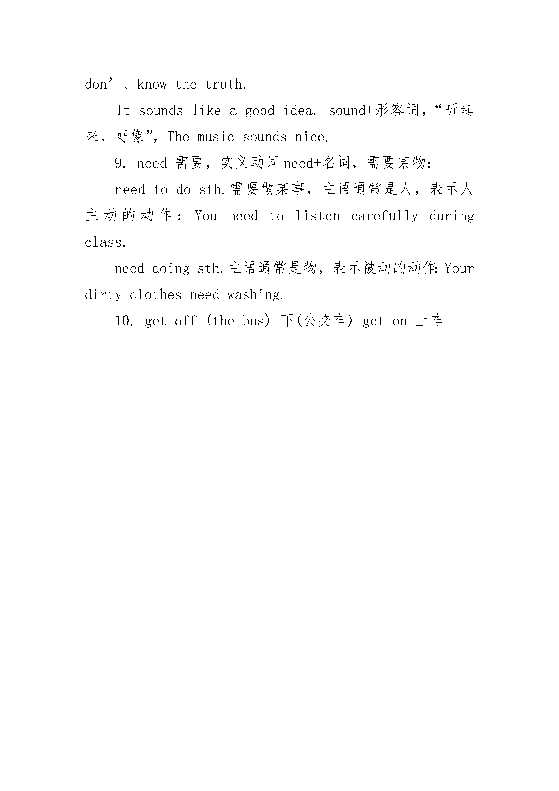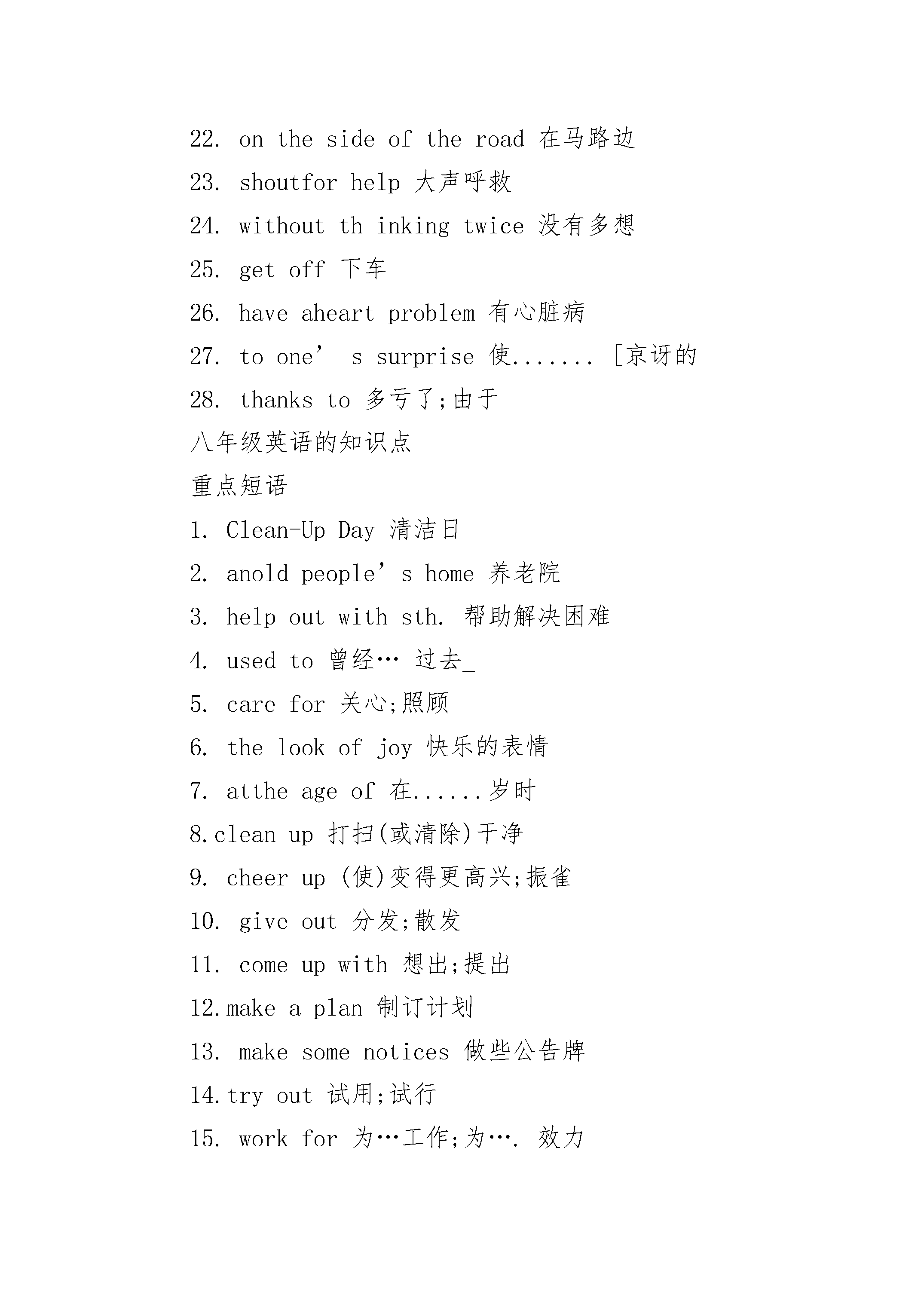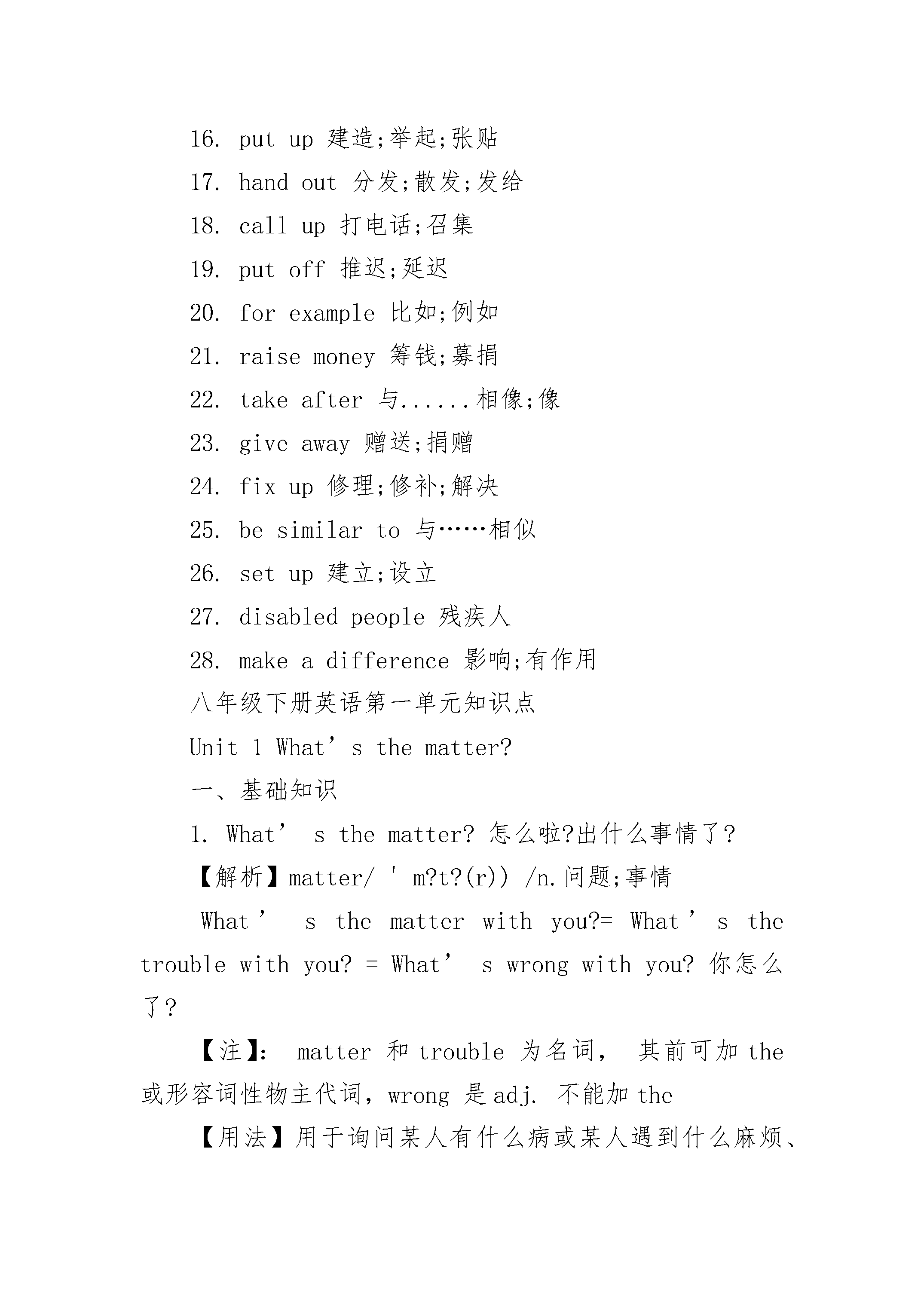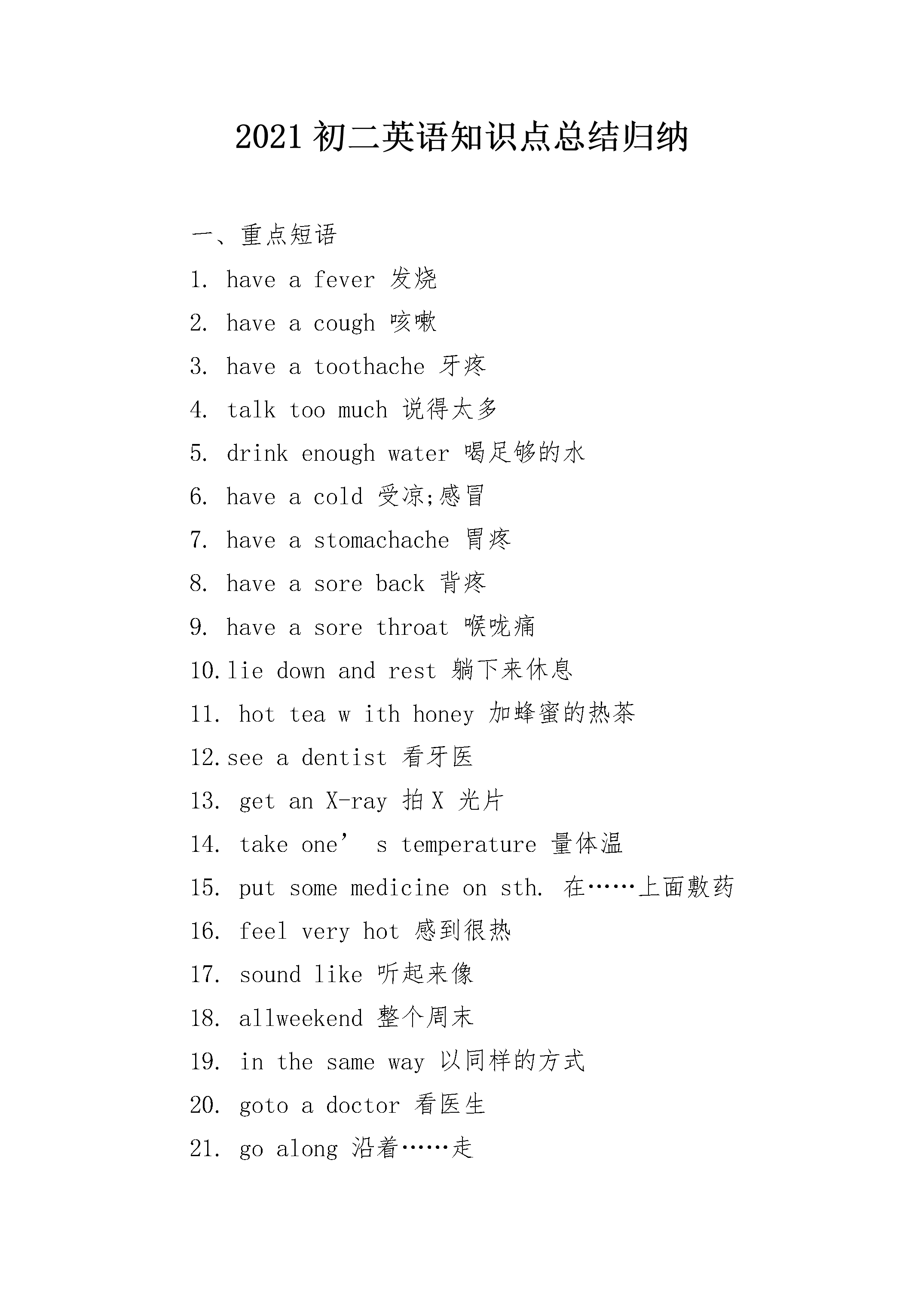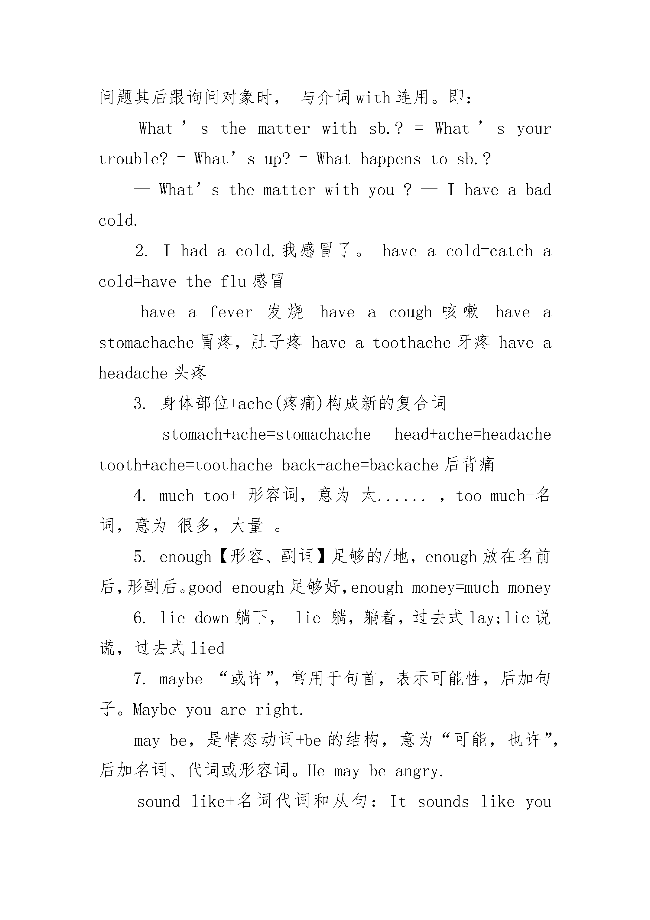 2021初二英语知识点总结归纳一、重点短语1.haveafever发烧2.haveacough咳嗽3.haveatoothache牙疼4.talktoomuch说得太多5.drinkenoughwater喝足够的水6.haveacold受凉;感冒7.haveastomachache胃疼8.haveasoreback背疼9.haveasorethroat喉咙痛10.liedownandrest躺下来休息11.hotteawithhoney加蜂蜜的热茶12.seeadentist看牙医13.getanX-ray拍X光片14.takeone’stemperature量体温15.putsomemedicineonsth.在……上面敷药16.feelveryhot感到很热17.soundlike听起来像18.allweekend整个周末19.inthesameway以同样的方式20.gotoadoctor看医生21.goalong沿着……走22.onthesideoftheroad在马路边23.shoutforhelp大声呼救24.withoutthinkingtwice没有多想25.getoff下车26.haveaheartproblem有心脏病27.toone’ssurprise使.......[京讶的28.thanksto多亏了;由于八年级英语的知识点重点短语1.Clean-UpDay清洁日2.anoldpeople’shome养老院3.helpoutwithsth.帮助解决困难4.usedto曾经…过去_5.carefor关心;照顾6.thelookofjoy快乐的表情7.attheageof在......岁时8.cleanup打扫(或清除)干净9.cheerup(使)变得更高兴;振雀10.giveout分发;散发11.comeupwith想出;提出12.makeaplan制订计划13.makesomenotices做些公告牌14.tryout试用;试行15.workfor为…工作;为….效力16.putup建造;举起;张贴17.handout分发;散发;发给18.callup打电话;召集19.putoff推迟;延迟20.forexample比如;例如21.raisemoney筹钱;募捐22.takeafter与......相像;像23.giveaway赠送;捐赠24.fixup修理;修补;解决25.besimilarto与……相似26.setup建立;设立27.disabledpeople残疾人28.makeadifference影响;有作用八年级下册英语第一单元知识点Unit1What’sthematter?一、基础知识1.What’sthematter?怎么啦?出什么事情了?【解析】matter/'m?t?(r))/n.问题;事情What’sthematterwithyou?=What’sthetroublewithyou?=What’swrongwithyou?你怎么了?【注】:matter和trouble为名词,其前可加the或形容词性物主代词,wrong是adj.不能加the【用法】用于询问某人有什么病或某人遇到什么麻烦、问题其后跟询问对象时,与介词with连用。即:What’sthematterwithsb.?=What’syourtrouble?=What’sup?=Whathappenstosb.?—What’sthematterwithyou?—Ihaveabadcold.2.Ihadacold.我感冒了。haveacold=catchacold=havetheflu感冒haveafever发烧haveacough咳嗽haveastomachache胃疼,肚子疼haveatoothache牙疼haveaheadache头疼3.身体部位+ache(疼痛)构成新的复合词stomach+ache=stomachachehead+ache=headachetooth+ache=toothacheback+ache=backache后背痛4.muchtoo+形容词,意为太......,toomuch+名词,意为很多,大量。5.enough【形容、副词】足够的/地,enough放在名前后,形副后。goodenough足够好,enoughmoney=muchmoney6.liedown躺下,lie躺,躺着,过去式lay;lie说谎,过去式lied7.maybe“或许”,常用于句首,表示可能性,后加句子。Maybeyouareright.maybe,是情态动词+be的结构,意为“可能,也许”,后加名词、代词或形容词。Hemaybeangry.soundlike+名词代词和从句:Itsoundslikeyoudon’tknow