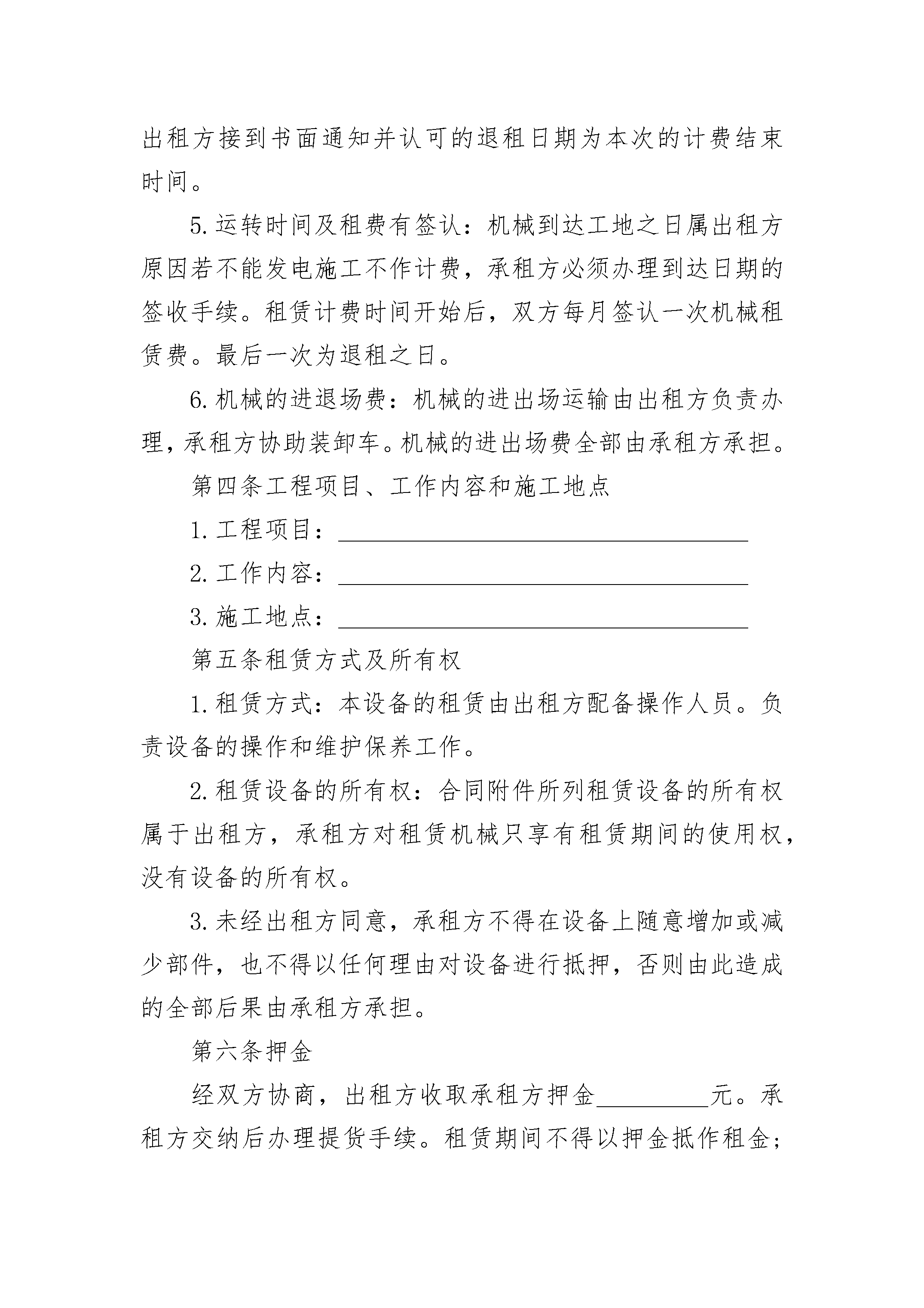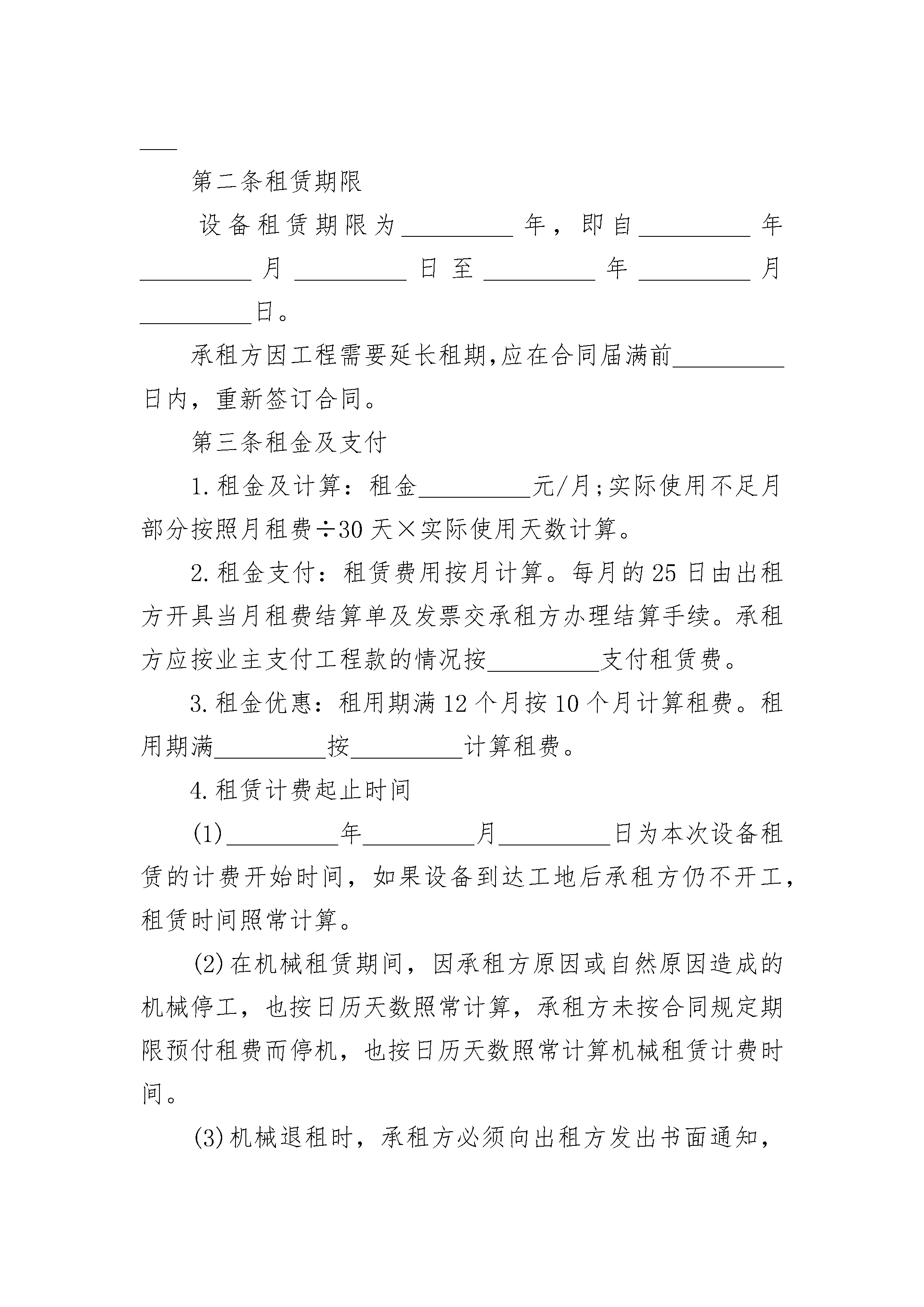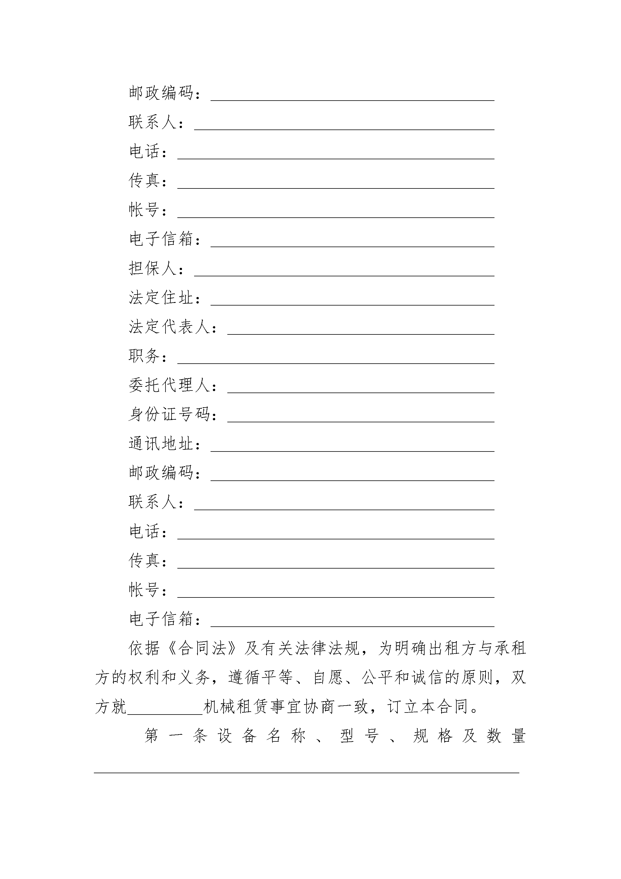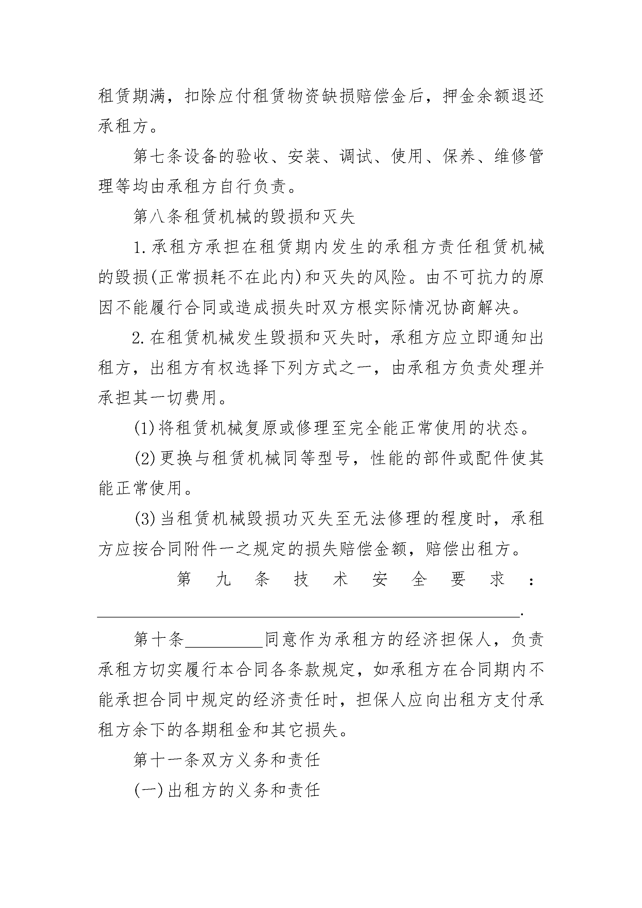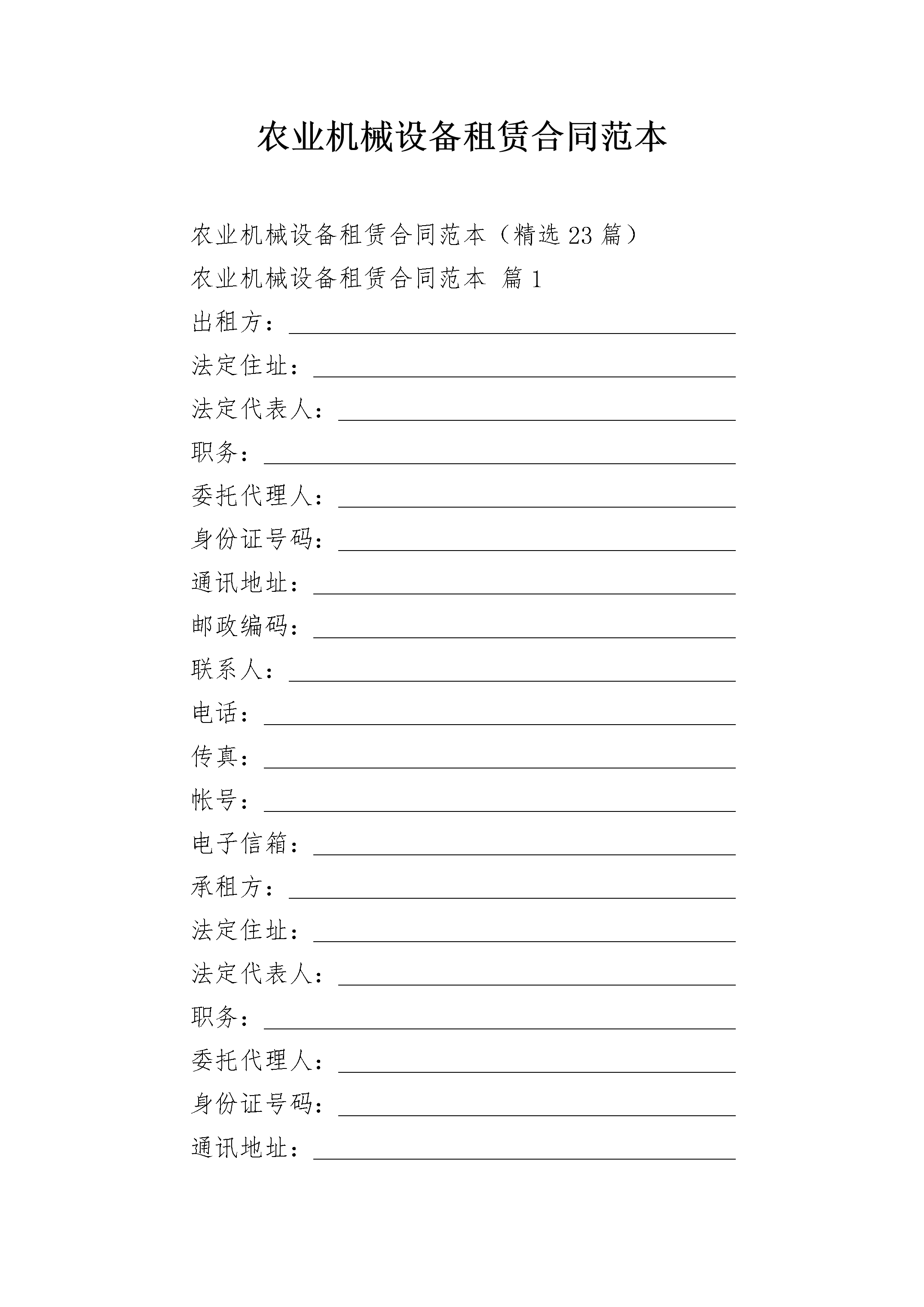 农业机械设备租赁合同范本农业机械设备租赁合同范本(精选23篇)农业机械设备租赁合同范本篇1出租方:____________________________________法定住址:__________________________________法定代表人:________________________________职务:______________________________________委托代理人:________________________________身份证号码:________________________________通讯地址:__________________________________邮政编码:__________________________________联系人:____________________________________电话:______________________________________传真:______________________________________帐号:______________________________________电子信箱:__________________________________承租方:____________________________________法定住址:__________________________________法定代表人:________________________________职务:______________________________________委托代理人:________________________________身份证号码:________________________________通讯地址:__________________________________邮政编码:__________________________________联系人:____________________________________电话:______________________________________传真:______________________________________帐号:______________________________________电子信箱:__________________________________担保人:____________________________________法定住址:__________________________________法定代表人:________________________________职务:______________________________________委托代理人:________________________________身份证号码:________________________________通讯地址:__________________________________邮政编码:__________________________________联系人:____________________________________电话:______________________________________传真:______________________________________帐号:______________________________________电子信箱:__________________________________依据《合同法》及有关法律法规,为明确出租方与承租方的权利和义务,遵循平等、自愿、公平和诚信的原则,双方就_________机械租赁事宜协商一致,订立本合同。第一条设备名称、型号、规格及数量______________________________________________________第二条租赁期限设备租赁期限为_________年,即自_________年_________月_________日至_________年_________月_________日。承租方因工程需要延长租期,应在合同届满前_________日内,重新签订合同。第三条租金及支付1.租金及计算:租金_________元/月;实际使用不足月部分按照月租费÷30天×实际使用天数计算。2.租金支付:租赁费用按月计算。每月的25日由出租方开具当月租费结算单及发票交承租方办理结算手续。承租方应按业主支付工程款的情况按_________支付租赁