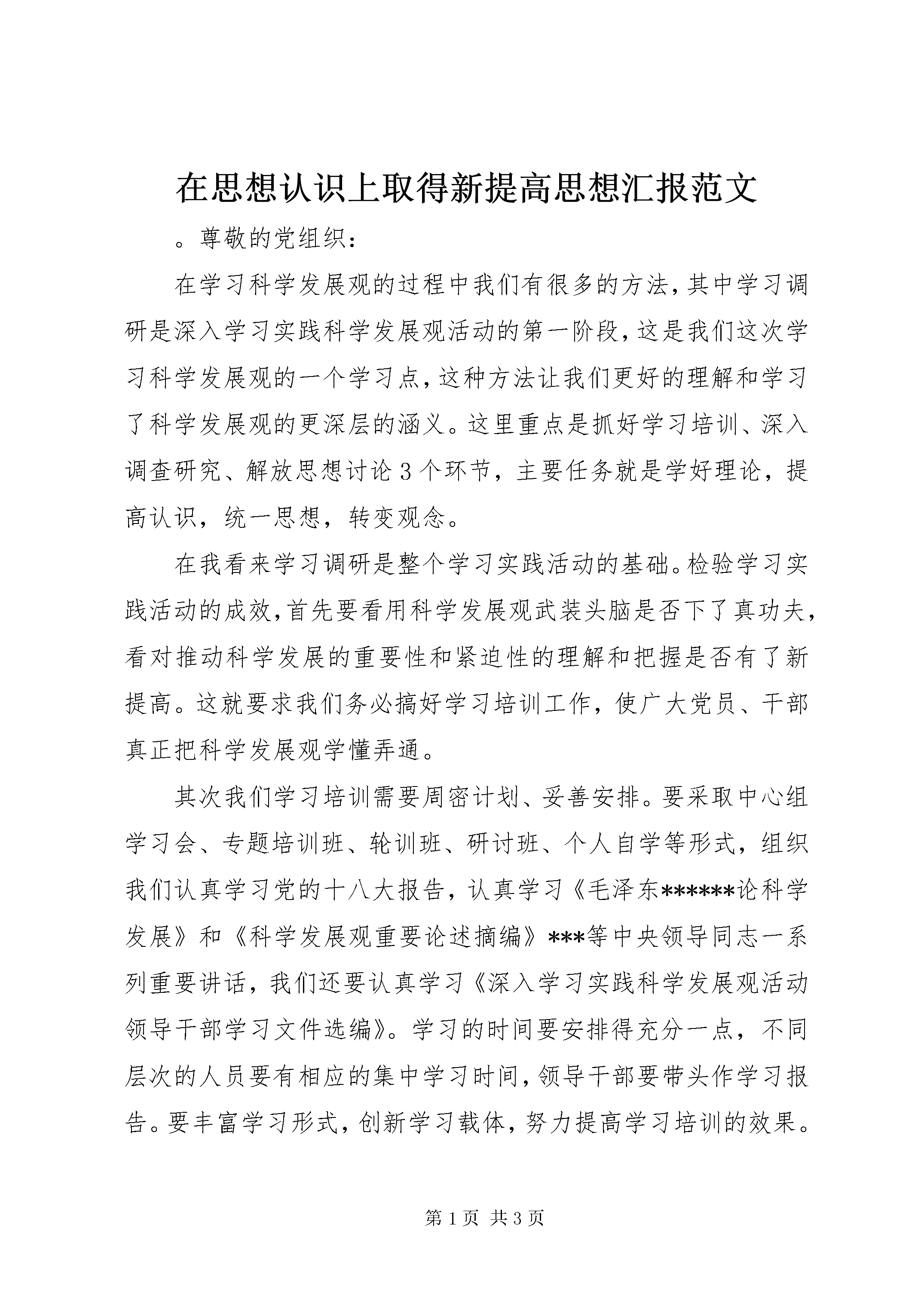 在思想认识上取得新提高思想汇报范文。尊敬的党组织:在学习科学发展观的过程中我们有很多的方法,其中学习调研是深入学习实践科学发展观活动的第一阶段,这是我们这次学习科学发展观的一个学习点,这种方法让我们更好的理解和学习了科学发展观的更深层的涵义。这里重点是抓好学习培训、深入调查研究、解放思想讨论3个环节,主要任务就是学好理论,提高认识,统一思想,转变观念。在我看来学习调研是整个学习实践活动的基础。检验学习实践活动的成效,首先要看用科学发展观武装头脑是否下了真功夫,看对推动科学发展的重要性和紧迫性的理解和把握是否有了新提高。这就要求我们务必搞好学习培训工作,使广大党员、干部真正把科学发展观学懂弄通。其次我们学习培训需要周密计划、妥善安排。要采取中心组学习会、专题培训班、轮训班、研讨班、个人自学等形式,组织我们认真学习党的十八大报告,认真学习《毛泽东******论科学发展》和《科学发展观重要论述摘编》***等中央领导同志一系列重要讲话,我们还要认真学习《深入学习实践科学发展观活动领导干部学习文件选编》。学习的时间要安排得充分一点,不同层次的人员要有相应的集中学习时间,领导干部要带头作学习报告。要丰富学习形式,创新学习载体,努力提高学习培训的效果。当然学风问题至关重要。要坚持发扬理论联系实际的马克思主义学风,坚持改造主观世界与改造客观世界相统一,紧密联系经济社会发展和党员、干部队伍建设实际,把深入学习科学发展观与继续解放思想、坚持改革开放、推动科学发展、促进社会和谐有机结合起来,与加强和改进党的建设有机结合起来,真正领会和掌握科学发展观的重大意义、科学内涵、精神实质和根本要求。学习培训只是我们深入学习、提高认识的一个重要途径,整个学习实践活动都要把深入学习、提高认识贯穿始终,切实做到组织学习、开展研讨以科学发展观为主要内容,查找问题、分析原因以科学发展观为基本依据,破解难题、完善思路以科学发展观为重要指导,解决问题、创新机制以服务和推动科学发展为根本目的。最后实现思想观念的转变与转化,这是学习培训的最终目的,也是衡量我们在思想认识上是否取得新提高的重要标志。通过深入学习,我们应切实转变不适应、不符合科学发展观要求的思想观念,进一步把科学发展观转化为推动科学发展的坚强意志、谋划科学发展的正确思路、领导科学发展的实际能力、促进科学发展的政策措施,转化为与人民群众同呼吸、共命运、心连心的真挚情感,转化为增强党性修养、提高思想觉悟的自觉行动。这样,我们就一定能够为开展好学习实践活动奠定坚实的基础。此致敬礼。汇报人:xx
