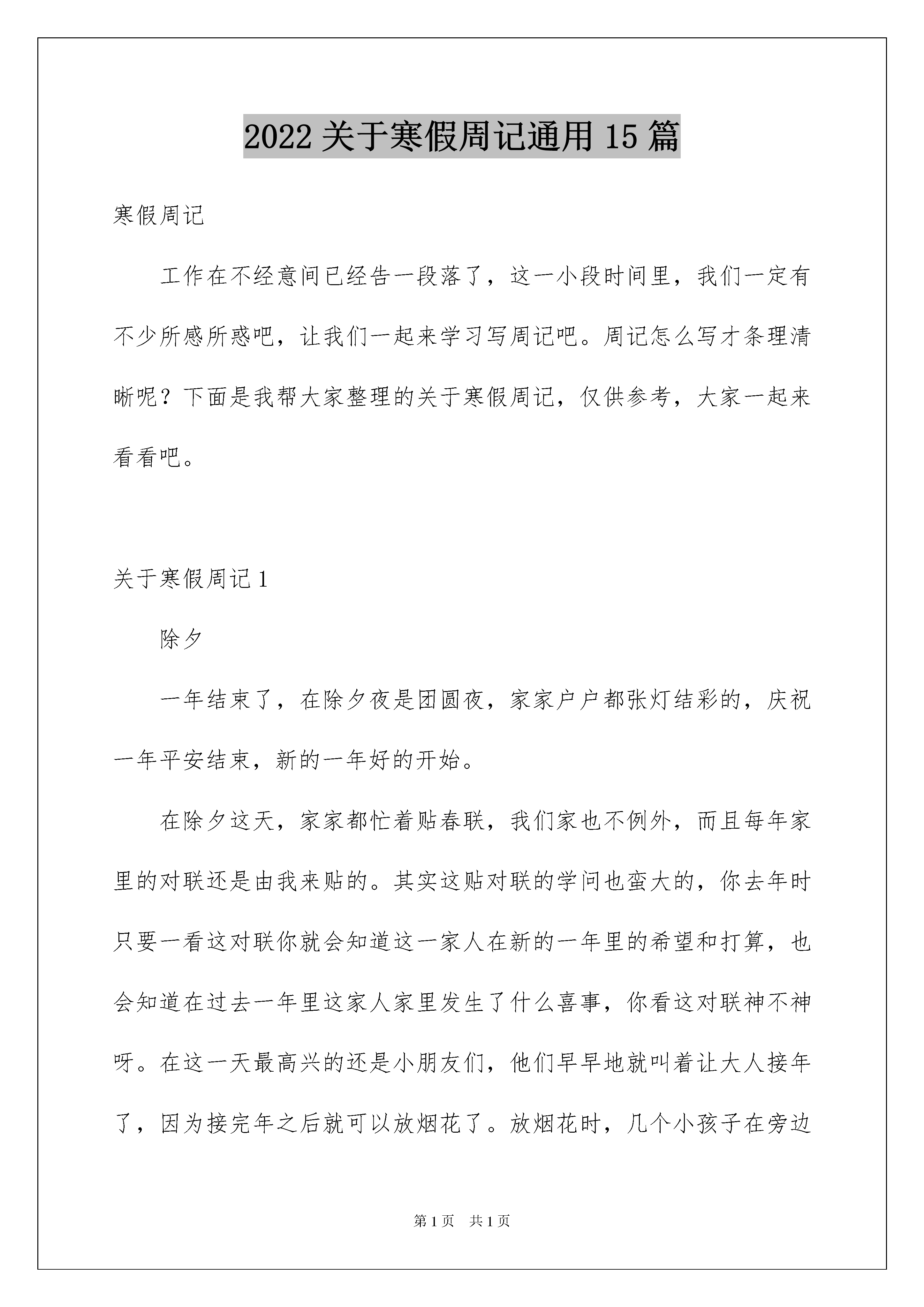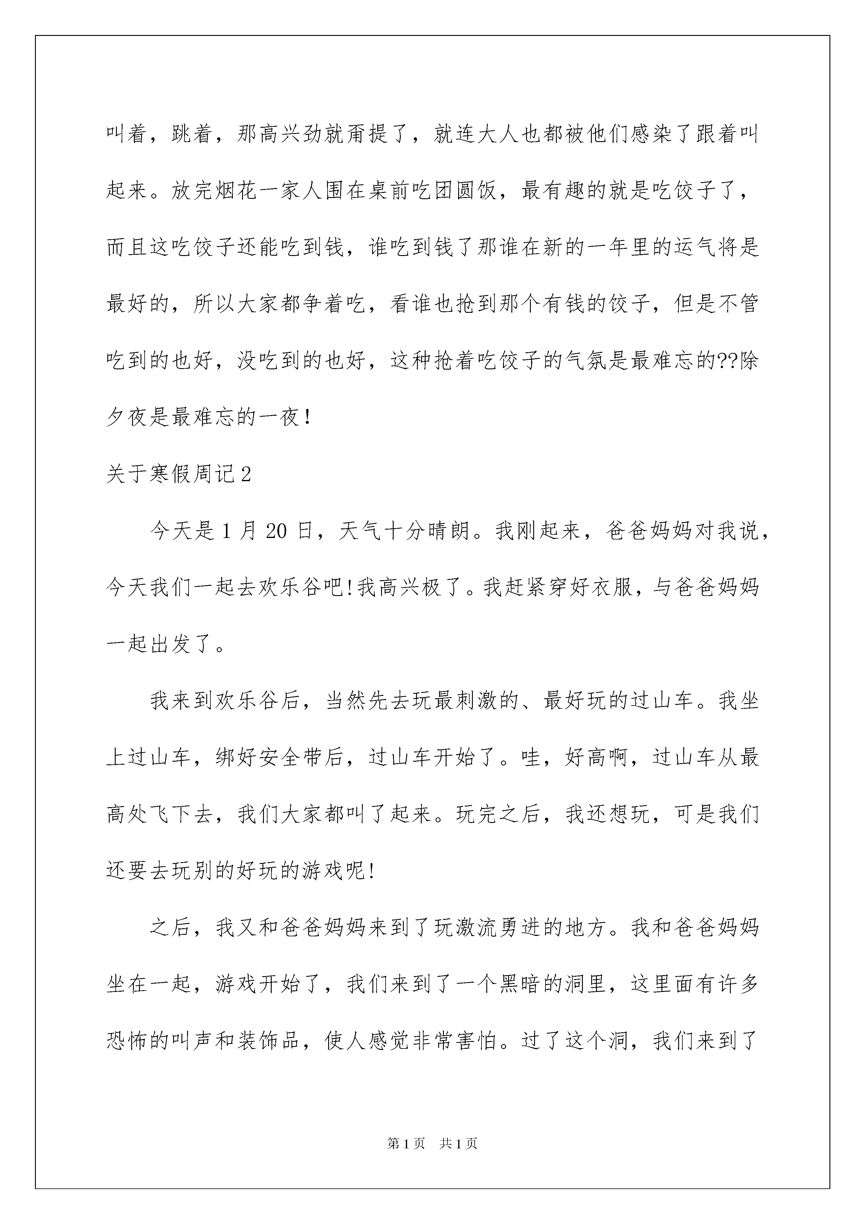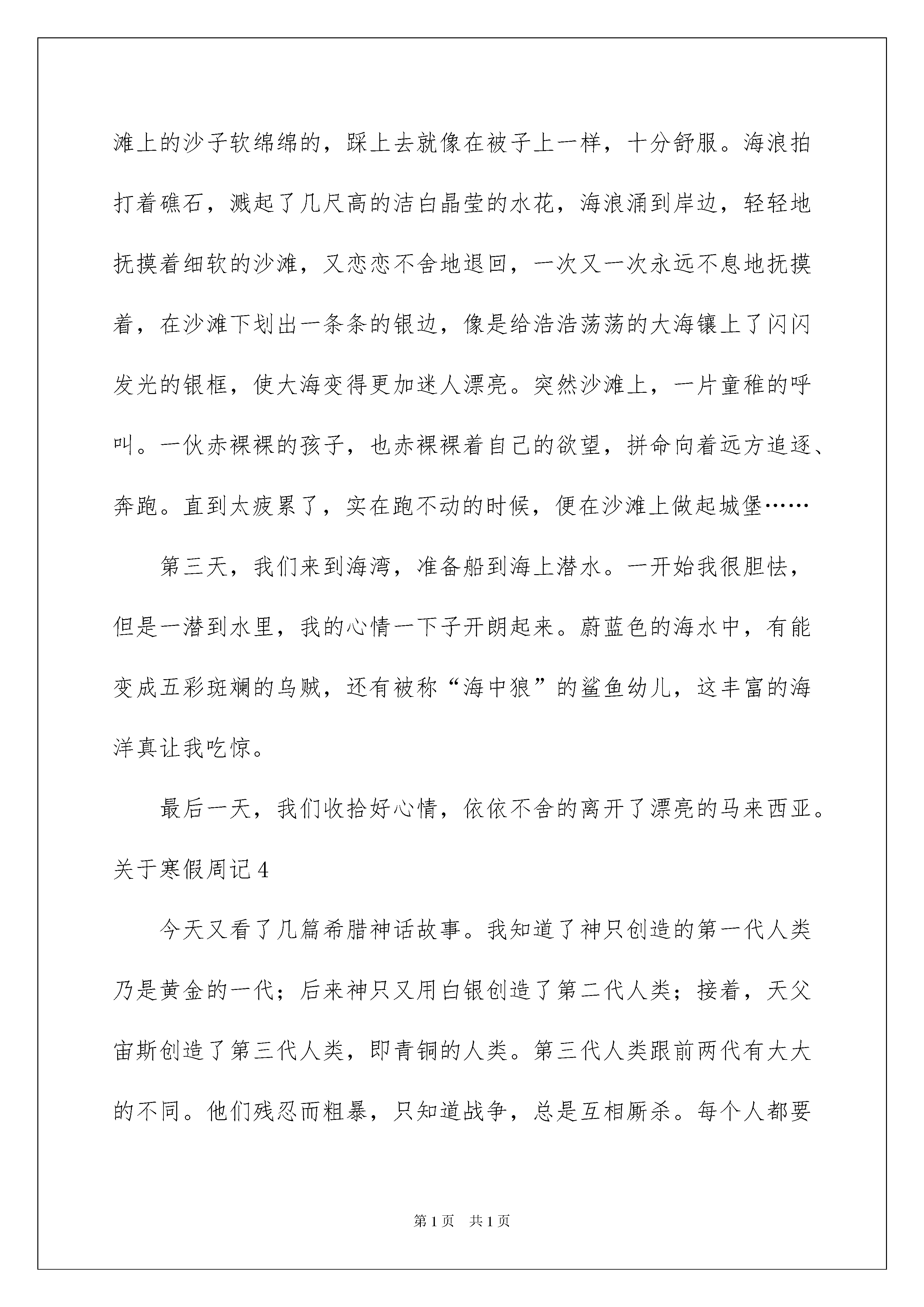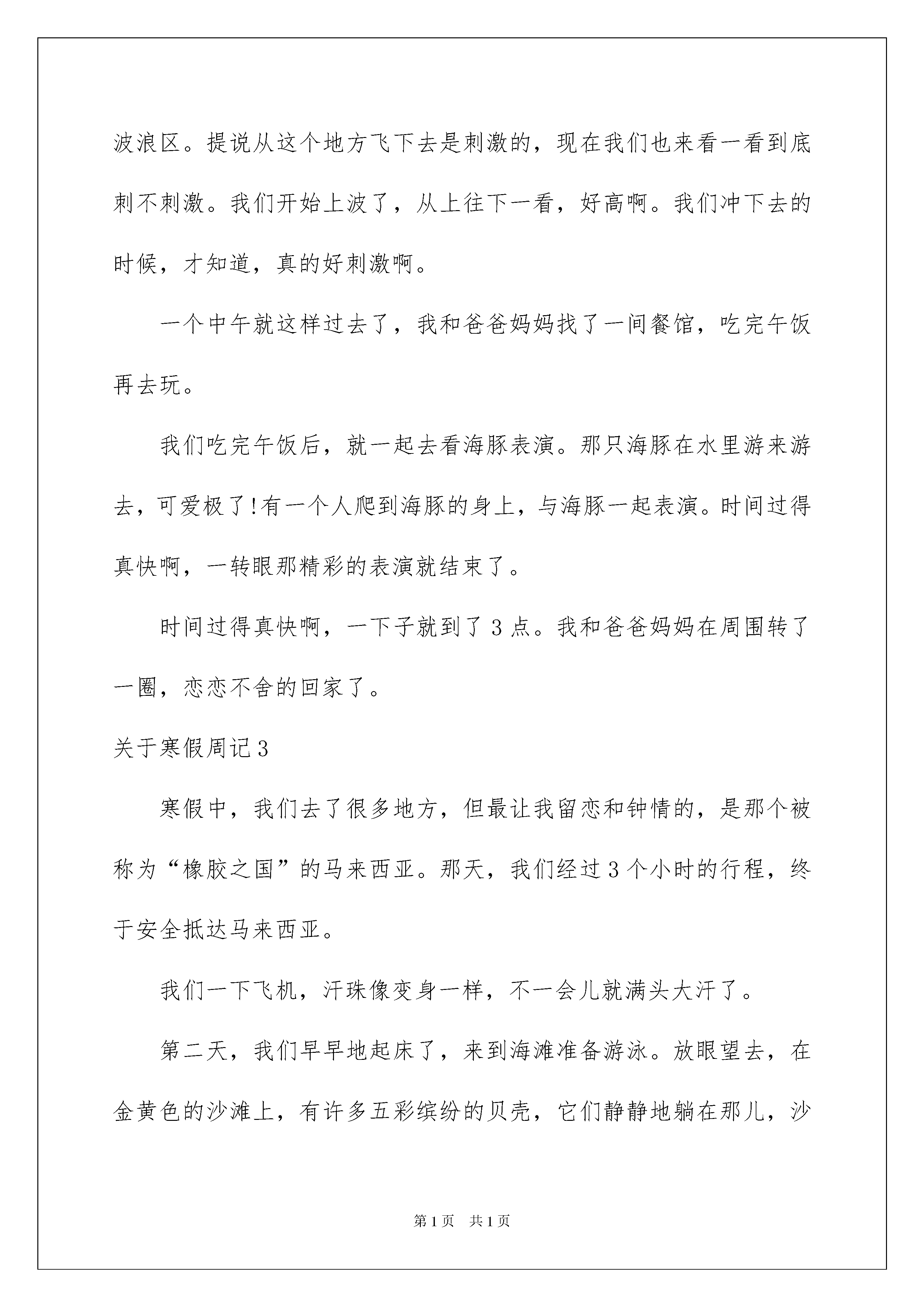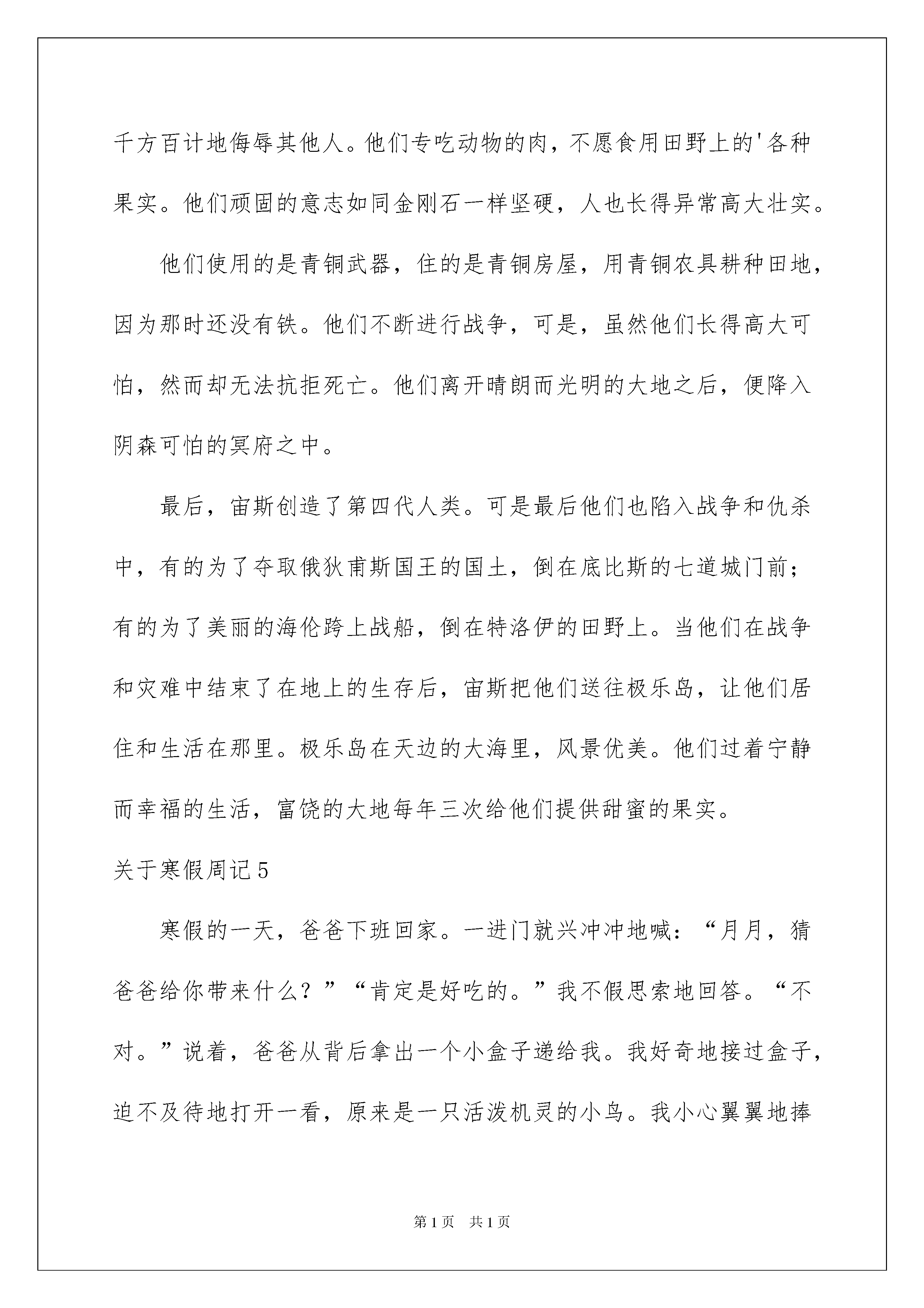 2022关于寒假周记通用15篇寒假周记工作在不经意间已经告一段落了,这一小段时间里,我们一定有不少所感所惑吧,让我们一起来学习写周记吧。周记怎么写才条理清晰呢?下面是我帮大家整理的关于寒假周记,仅供参考,大家一起来看看吧。关于寒假周记1除夕一年结束了,在除夕夜是团圆夜,家家户户都张灯结彩的,庆祝一年平安结束,新的一年好的开始。在除夕这天,家家都忙着贴春联,我们家也不例外,而且每年家里的对联还是由我来贴的。其实这贴对联的学问也蛮大的,你去年时只要一看这对联你就会知道这一家人在新的一年里的希望和打算,也会知道在过去一年里这家人家里发生了什么喜事,你看这对联神不神呀。在这一天最高兴的还是小朋友们,他们早早地就叫着让大人接年了,因为接完年之后就可以放烟花了。放烟花时,几个小孩子在旁边叫着,跳着,那高兴劲就甭提了,就连大人也都被他们感染了跟着叫起来。放完烟花一家人围在桌前吃团圆饭,最有趣的就是吃饺子了,而且这吃饺子还能吃到钱,谁吃到钱了那谁在新的一年里的运气将是最好的,所以大家都争着吃,看谁也抢到那个有钱的饺子,但是不管吃到的也好,没吃到的也好,这种抢着吃饺子的气氛是最难忘的??除夕夜是最难忘的一夜!关于寒假周记2今天是1月20日,天气十分晴朗。我刚起来,爸爸妈妈对我说,今天我们一起去欢乐谷吧!我高兴极了。我赶紧穿好衣服,与爸爸妈妈一起出发了。我来到欢乐谷后,当然先去玩最刺激的、最好玩的过山车。我坐上过山车,绑好安全带后,过山车开始了。哇,好高啊,过山车从最高处飞下去,我们大家都叫了起来。玩完之后,我还想玩,可是我们还要去玩别的好玩的游戏呢!之后,我又和爸爸妈妈来到了玩激流勇进的地方。我和爸爸妈妈坐在一起,游戏开始了,我们来到了一个黑暗的洞里,这里面有许多恐怖的叫声和装饰品,使人感觉非常害怕。过了这个洞,我们来到了波浪区。提说从这个地方飞下去是刺激的,现在我们也来看一看到底刺不刺激。我们开始上波了,从上往下一看,好高啊。我们冲下去的时候,才知道,真的好刺激啊。一个中午就这样过去了,我和爸爸妈妈找了一间餐馆,吃完午饭再去玩。我们吃完午饭后,就一起去看海豚表演。那只海豚在水里游来游去,可爱极了!有一个人爬到海豚的身上,与海豚一起表演。时间过得真快啊,一转眼那精彩的表演就结束了。时间过得真快啊,一下子就到了3点。我和爸爸妈妈在周围转了一圈,恋恋不舍的回家了。关于寒假周记3寒假中,我们去了很多地方,但最让我留恋和钟情的,是那个被称为“橡胶之国”的马来西亚。那天,我们经过3个小时的行程,终于安全抵达马来西亚。我们一下飞机,汗珠像变身一样,不一会儿就满头大汗了。第二天,我们早早地起床了,来到海滩准备游泳。放眼望去,在金黄色的沙滩上,有许多五彩缤纷的贝壳,它们静静地躺在那儿,沙滩上的沙子软绵绵的,踩上去就像在被子上一样,十分舒服。海浪拍打着礁石,溅起了几尺高的洁白晶莹的水花,海浪涌到岸边,轻轻地抚摸着细软的沙滩,又恋恋不舍地退回,一次又一次永远不息地抚摸着,在沙滩下划出一条条的银边,像是给浩浩荡荡的大海镶上了闪闪发光的银框,使大海变得更加迷人漂亮。突然沙滩上,一片童稚的呼叫。一伙赤裸裸的孩子,也赤裸裸着自己的欲望,拼命向着远方追逐、奔跑。直到太疲累了,实在跑不动的时候,便在沙滩上做起城堡……第三天,我们来到海湾,准备船到海上潜水。一开始我很胆怯,但是一潜到水里,我的心情一下子开朗起来。蔚蓝色的海水中,有能变成五彩斑斓的乌贼,还有被称“海中狼”的鲨鱼幼儿,这丰富的海洋真让我吃惊。最后一天,我们收拾好心情,依依不舍的离开了漂亮的马来西亚。关于寒假周记4今天又看了几篇希腊神话故事。我知道了神只创造的第一代人类乃是黄金的一代;后来神只又用白银创造了第二代人类;接着,天父宙斯创造了第三代人类,即青铜的人类。第三代人类跟前两代有大大的不同。他们残忍而粗暴,只知道战争,总是互相厮杀。每个人都要千方百计地侮辱其他人。他们专吃动物的肉,不愿食用田野上的'各种果实。他们顽固的意志如同金刚石一样坚硬,人也长得异常高大壮实。他们使用的是青铜武器,住的是青铜房屋,用青铜农具耕种田地,因为那时还没有铁。他们不断进行战争,可是,虽然他们长得高大可怕,然而却无法抗拒死亡。他们离开晴朗而光明的大地之后,便降入阴森可怕的冥府之中。最后,宙斯创造了第四代人类。可是最后他们也陷入战争和仇杀中,有的为了夺取俄狄甫斯国王的国土,倒在底比斯的七道城门前;有的为了美丽的海伦跨上战船,倒在特洛伊的田野上。当他们在战争和灾难中结束了在地上的生存后,宙斯把他们送往极乐岛,让他们居住和生活在那里。极乐岛在天边的大海里,风景优美。他们过着宁静而幸福的生