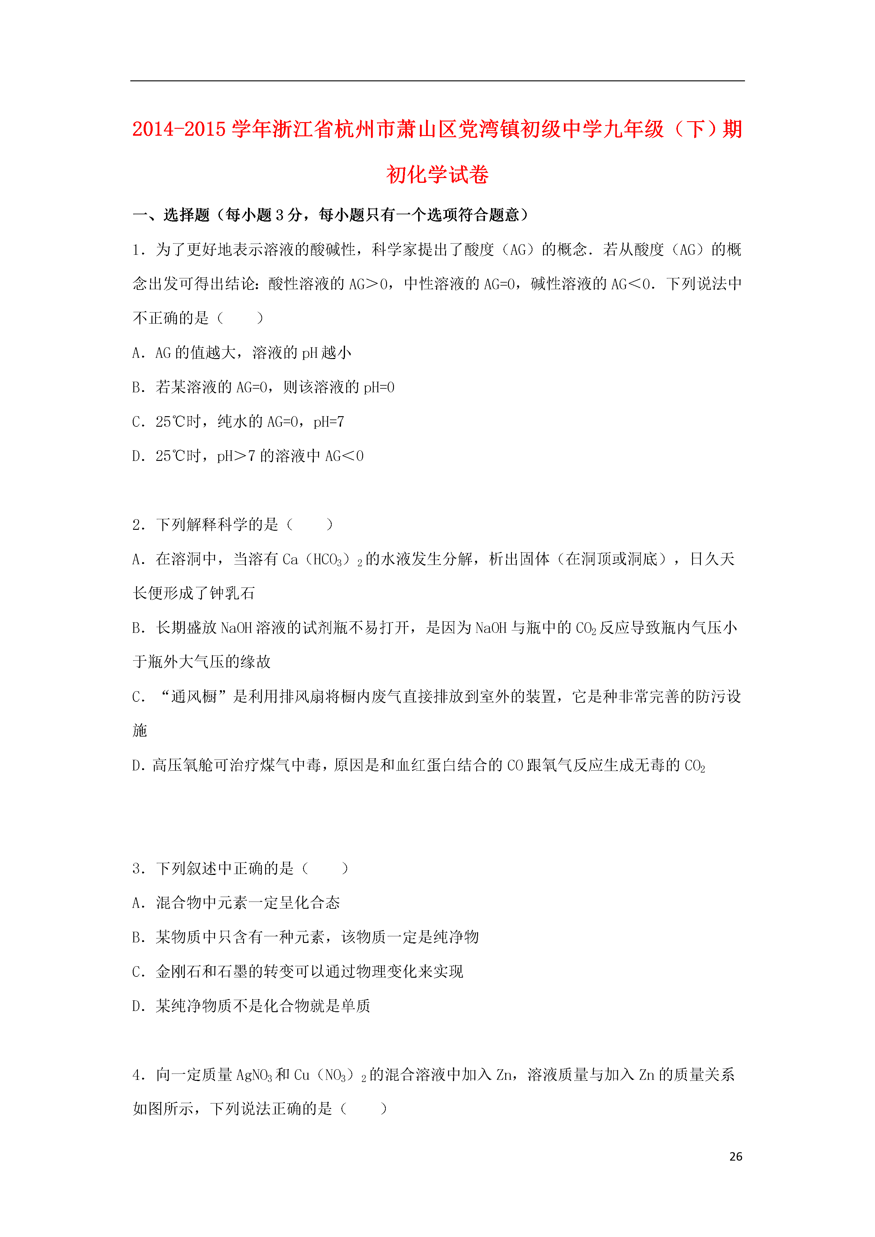 试题-浙江-2016_浙江省杭州市萧山区党湾镇初级中学2014-2015学年九年级化学下学期期初试题(含解析) 新人教版.doc