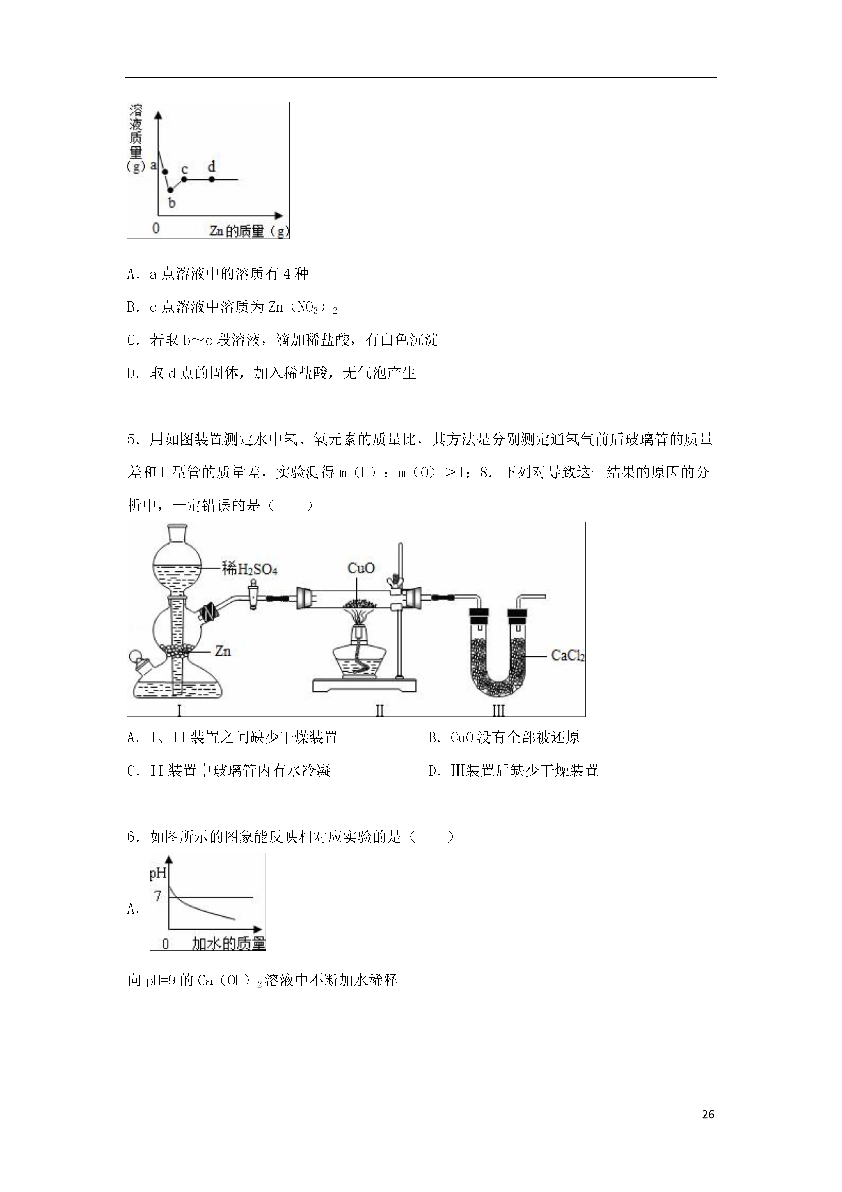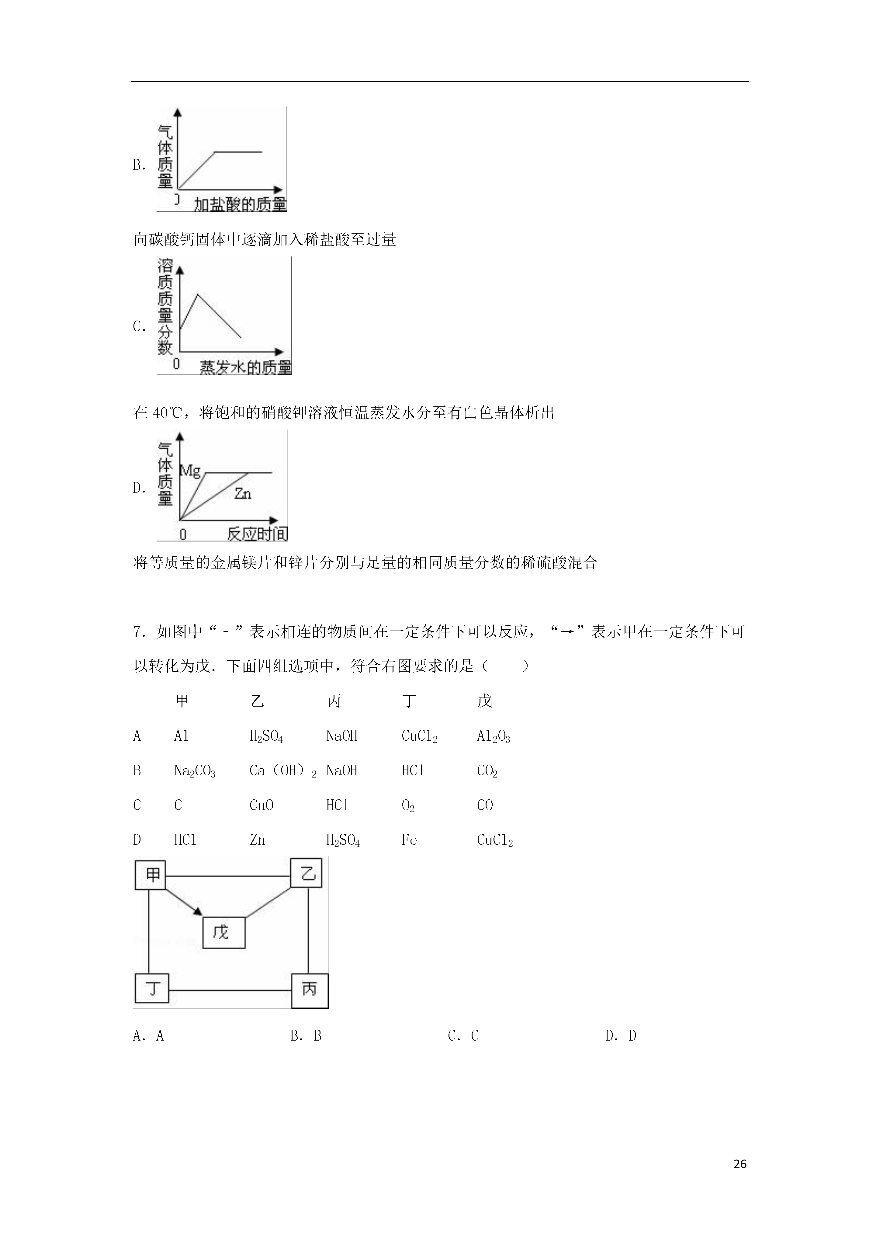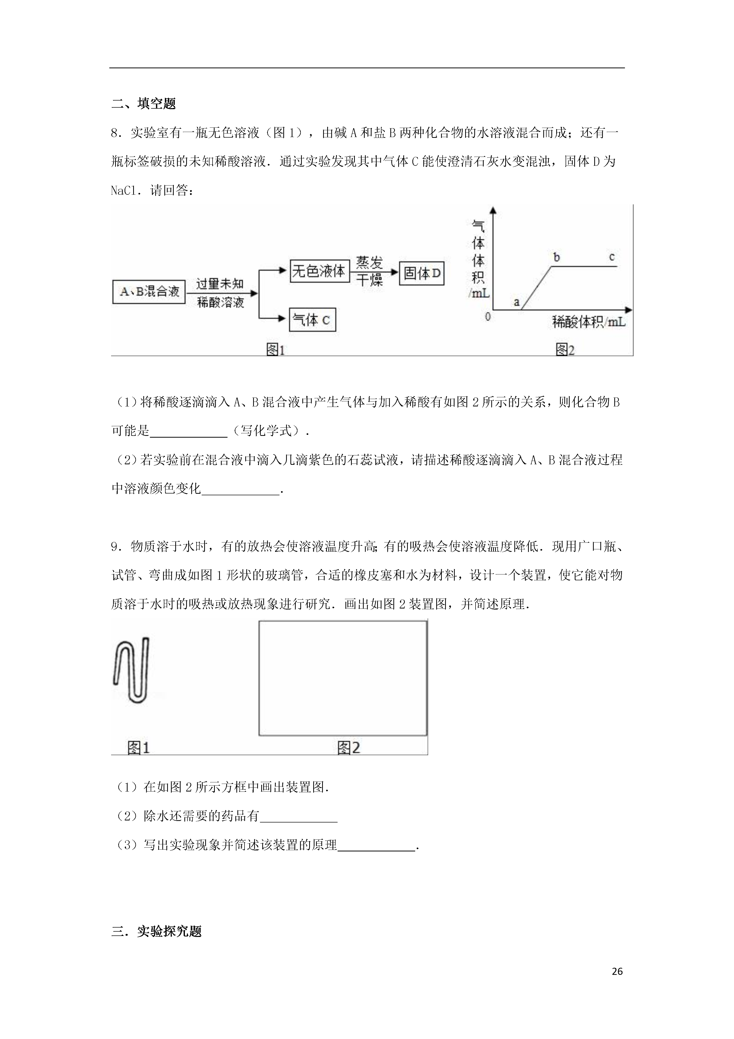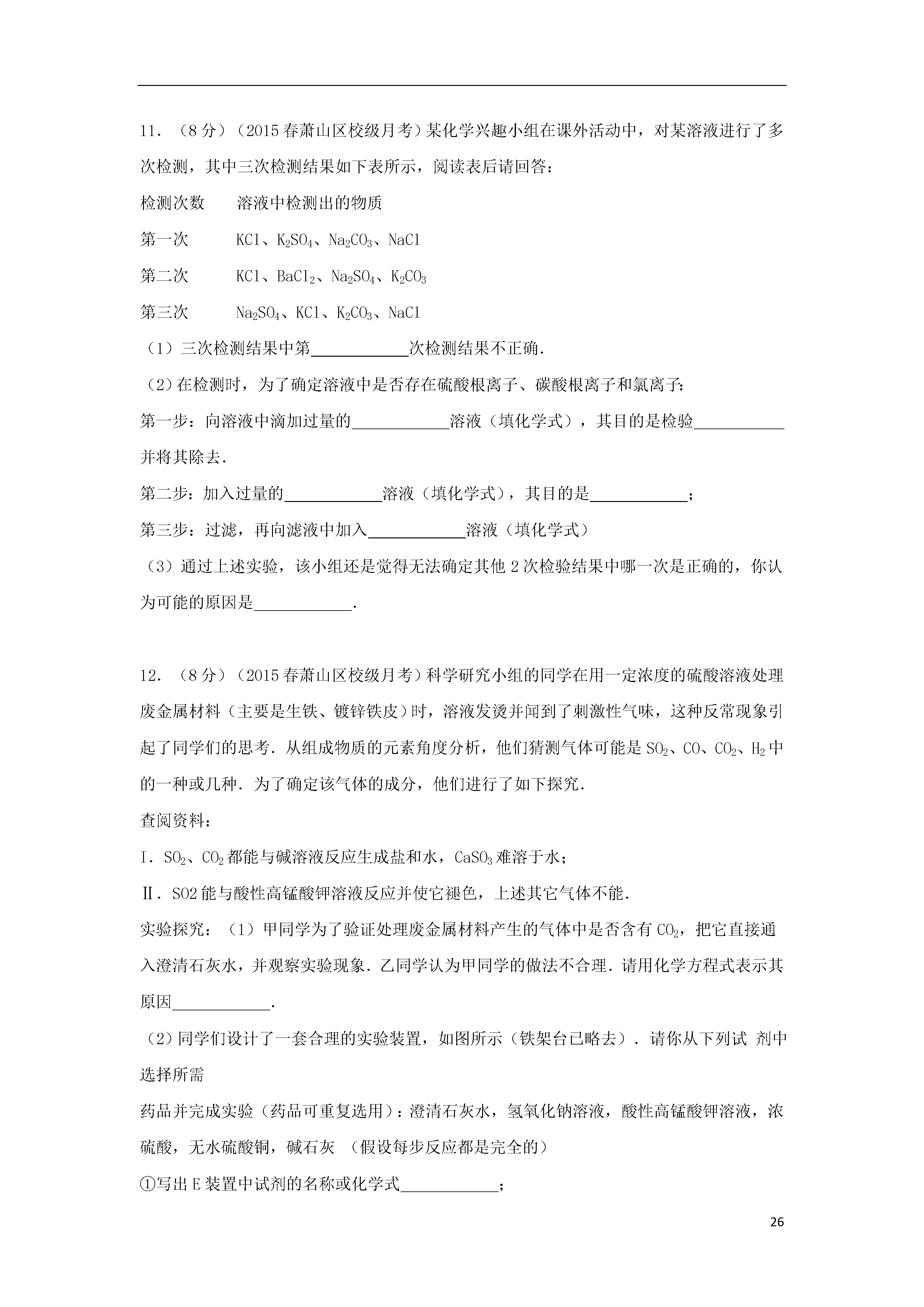 262014-2015学年浙江省杭州市萧山区党湾镇初级中学九年级(下)期初化学试卷一、选择题(每小题3分,每小题只有一个选项符合题意)1.为了更好地表示溶液的酸碱性,科学家提出了酸度(AG)的概念.若从酸度(AG)的概念出发可得出结论:酸性溶液的AG>0,中性溶液的AG=0,碱性溶液的AG<0.下列说法中不正确的是()A.AG的值越大,溶液的pH越小B.若某溶液的AG=0,则该溶液的pH=0C.25℃时,纯水的AG=0,pH=7D.25℃时,pH>7的溶液中AG<02.下列解释科学的是()A.在溶洞中,当溶有Ca(HCO3)2的水液发生分解,析出固体(在洞顶或洞底),日久天长便形成了钟乳石B.长期盛放NaOH溶液的试剂瓶不易打开,是因为NaOH与瓶中的CO2反应导致瓶内气压小于瓶外大气压的缘故C.“通风橱”是利用排风扇将橱内废气直接排放到室外的装置,它是种非常完善的防污设施D.高压氧舱可治疗煤气中毒,原因是和血红蛋白结合的CO跟氧气反应生成无毒的CO23.下列叙述中正确的是()A.混合物中元素一定呈化合态B.某物质中只含有一种元素,该物质一定是纯净物C.金刚石和石墨的转变可以通过物理变化来实现D.某纯净物质不是化合物就是单质4.向一定质量AgNO3和Cu(NO3)2的混合溶液中加入Zn,溶液质量与加入Zn的质量关系如图所示,下列说法正确的是()A.a点溶液中的溶质有4种B.c点溶液中溶质为Zn(NO3)2C.若取b~c段溶液,滴加稀盐酸,有白色沉淀D.取d点的固体,加入稀盐酸,无气泡产生5.用如图装置测定水中氢、氧元素的质量比,其方法是分别测定通氢气前后玻璃管的质量差和U型管的质量差,实验测得m(H):m(O)>1:8.下列对导致这一结果的原因的分析中,一定错误的是()A.I、II装置之间缺少干燥装置B.CuO没有全部被还原C.II装置中玻璃管内有水冷凝D.Ⅲ装置后缺少干燥装置6.如图所示的图象能反映相对应实验的是()A.向pH=9的Ca(OH)2溶液中不断加水稀释B.向碳酸钙固体中逐滴加入稀盐酸至过量C.在40℃,将饱和的硝酸钾溶液恒温蒸发水分至有白色晶体析出D.将等质量的金属镁片和锌片分别与足量的相同质量分数的稀硫酸混合7.如图中“﹣”表示相连的物质间在一定条件下可以反应,“→”表示甲在一定条件下可以转化为戊.下面四组选项中,符合右图要求的是()甲乙丙丁戊AAlH2SO4NaOHCuCl2Al2O3BNa2CO3Ca(OH)2NaOHHClCO2CCCuOHClO2CODHClZnH2SO4FeCuCl2A.AB.BC.CD.D二、填空题8.实验室有一瓶无色溶液(图1),由碱A和盐B两种化合物的水溶液混合而成;还有一瓶标签破损的未知稀酸溶液.通过实验发现其中气体C能使澄清石灰水变混浊,固体D为NaCl.请回答:(1)将稀酸逐滴滴入A、B混合液中产生气体与加入稀酸有如图2所示的关系,则化合物B可能是(写化学式).(2)若实验前在混合液中滴入几滴紫色的石蕊试液,请描述稀酸逐滴滴入A、B混合液过程中溶液颜色变化.9.物质溶于水时,有的放热会使溶液温度升高;有的吸热会使溶液温度降低.现用广口瓶、试管、弯曲成如图1形状的玻璃管,合适的橡皮塞和水为材料,设计一个装置,使它能对物质溶于水时的吸热或放热现象进行研究.画出如图2装置图,并简述原理.(1)在如图2所示方框中画出装置图.(2)除水还需要的药品有(3)写出实验现象并简述该装置的原理.三.实验探究题11.(8分)(2015春萧山区校级月考)某化学兴趣小组在课外活动中,对某溶液进行了多次检测,其中三次检测结果如下表所示,阅读表后请回答:检测次数溶液中检测出的物质第一次KCl、K2SO4、Na2CO3、NaCl第二次KCl、BaCl2、Na2SO4、K2CO3第三次Na2SO4、KCl、K2CO3、NaCl(1)三次检测结果中第次检测结果不正确.(2)在检测时,为了确定溶液中是否存在硫酸根离子、碳酸根离子和氯离子:第一步:向溶液中滴加过量的溶液(填化学式),其目的是检验并将其除去.第二步:加入过量的溶液(填化学式),其目的是;第三步:过滤,再向滤液中加入溶液(填化学式)(3)通过上述实验,该小组还是觉得无法确定其他2次检验结果中哪一次是正确的,你认为可能的原因是.12.(8分)(2015春萧山区校级月考)科学研究小组的同学在用一定浓度的硫酸溶液处理废金属材料(主要是生铁、镀锌铁皮)时,溶液发烫并闻到了刺激性气味,这种反常现象引起了同学们的思考.从组成物质的元素角度分析,他们猜测气体可能是SO2、CO、CO2、H2中的