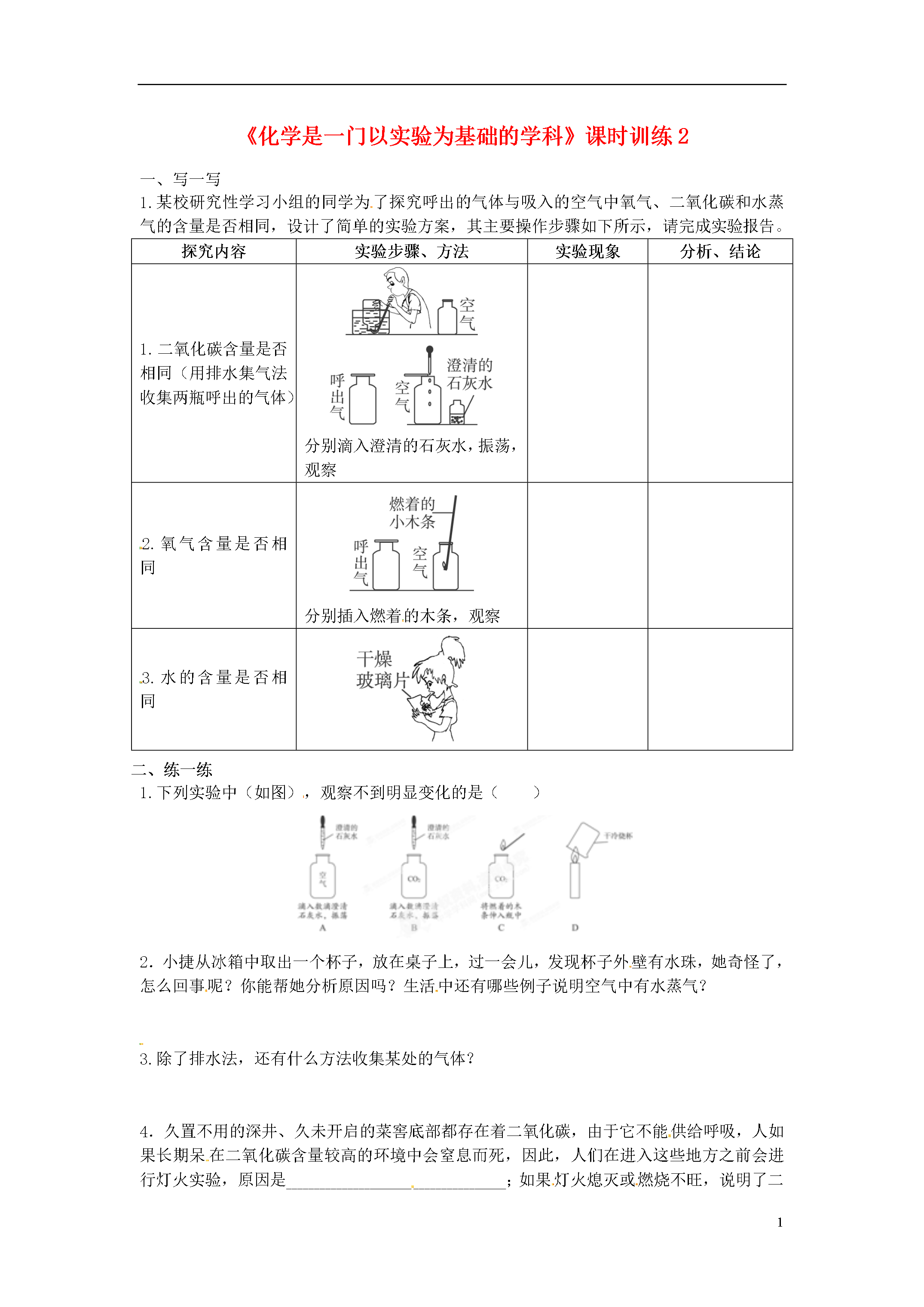 2《化学是一门以实验为基础的学科》课时训练2一、写一写1.某校研究性学习小组的同学为了探究呼出的气体与吸入的空气中氧气、二氧化碳和水蒸气的含量是否相同,设计了简单的实验方案,其主要操作步骤如下所示,请完成实验报告。探究内容实验步骤、方法实验现象分析、结论1.二氧化碳含量是否相同(用排水集气法收集两瓶呼出的气体)分别滴入澄清的石灰水,振荡,观察2.氧气含量是否相同分别插入燃着的木条,观察3.水的含量是否相同二、练一练1.下列实验中(如图),观察不到明显变化的是()2.小捷从冰箱中取出一个杯子,放在桌子上,过一会儿,发现杯子外壁有水珠,她奇怪了,怎么回事呢?你能帮她分析原因吗?生活中还有哪些例子说明空气中有水蒸气?3.除了排水法,还有什么方法收集某处的气体?4.久置不用的深井、久未开启的菜窖底部都存在着二氧化碳,由于它不能供给呼吸,人如果长期呆在二氧化碳含量较高的环境中会窒息而死,因此,人们在进入这些地方之前会进行灯火实验,原因是________________________________________;如果灯火熄灭或燃烧不旺,说明了二氧化碳含量_________