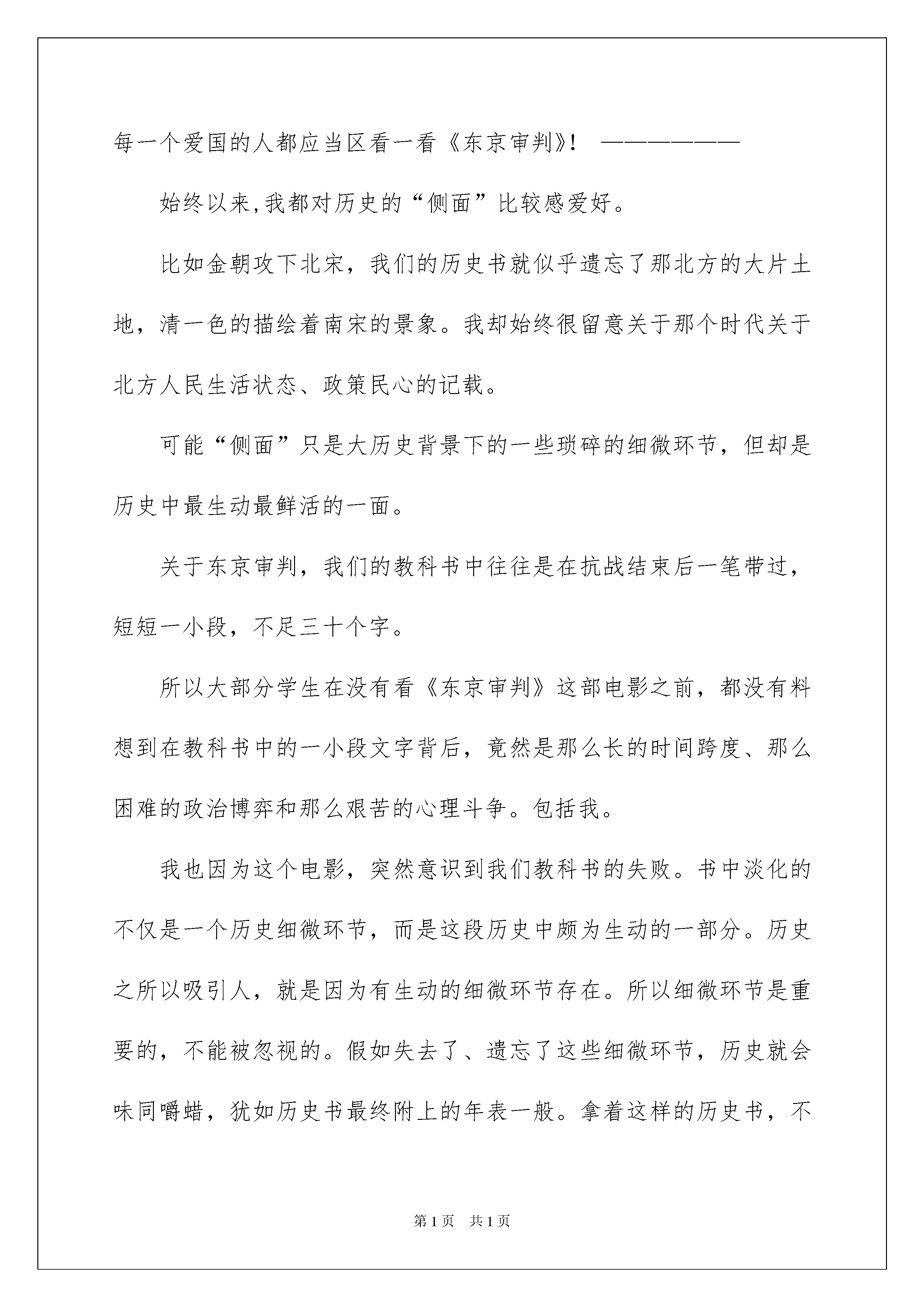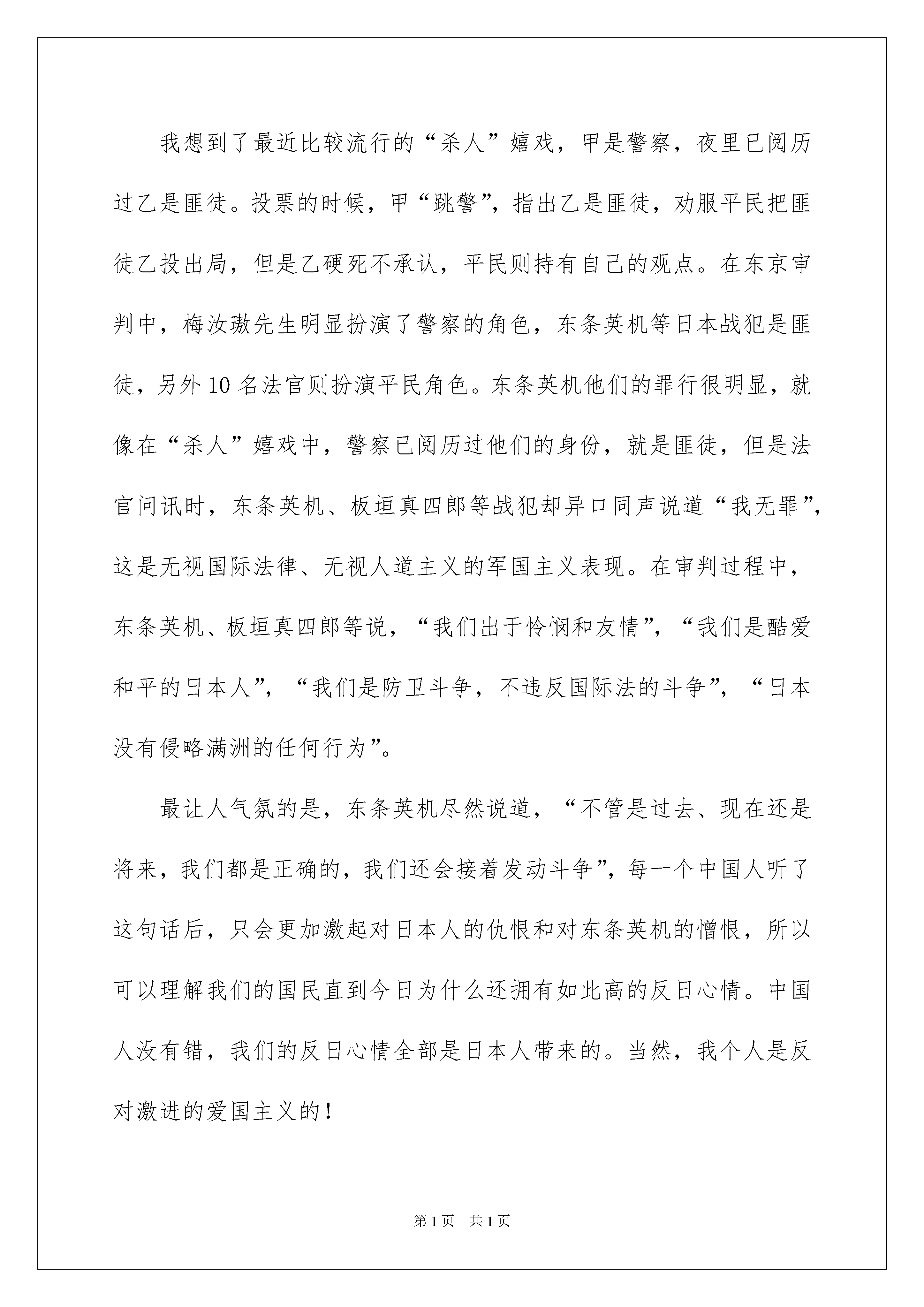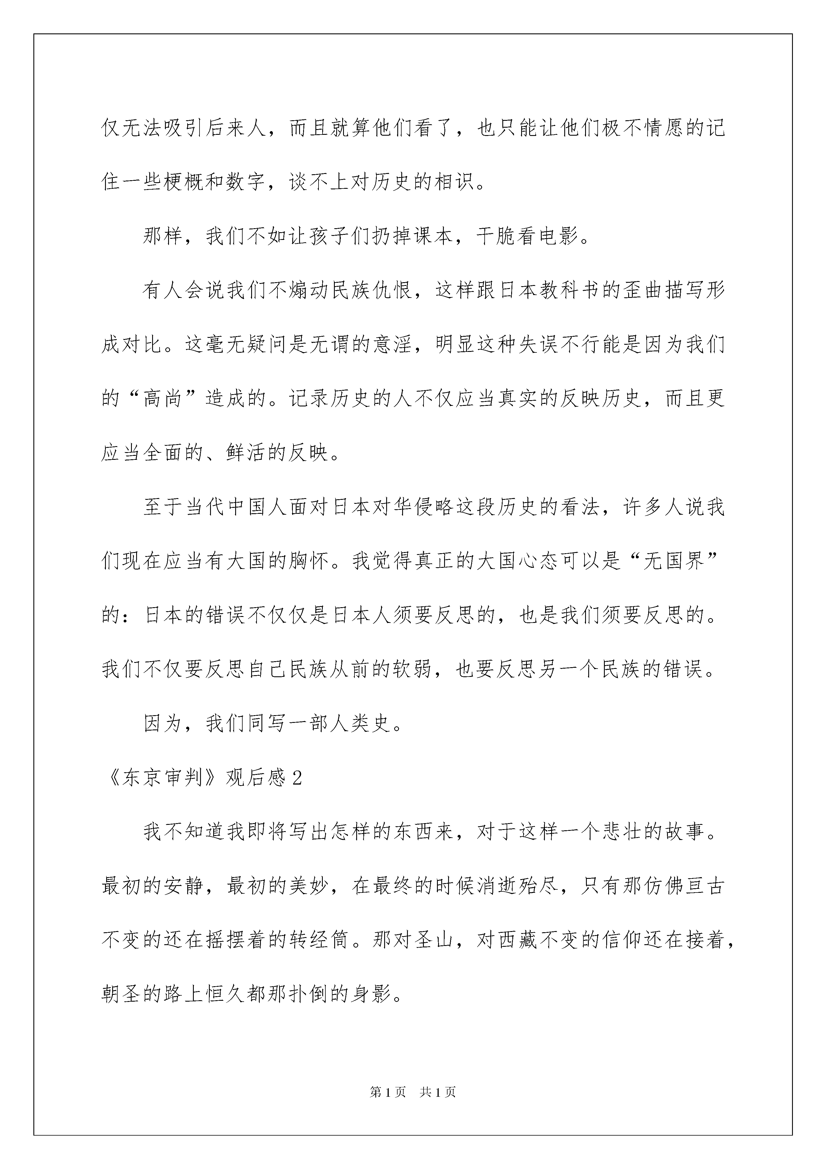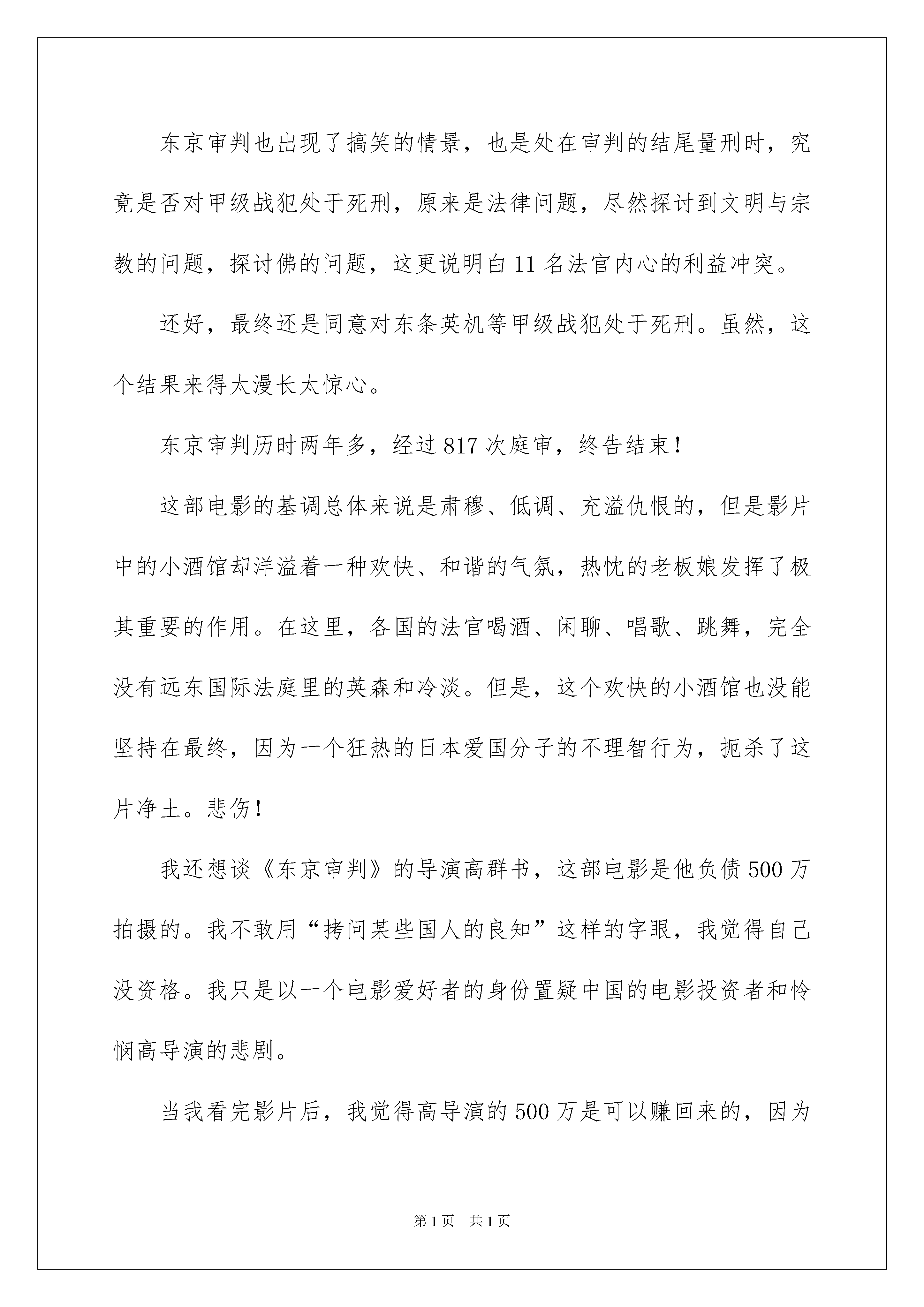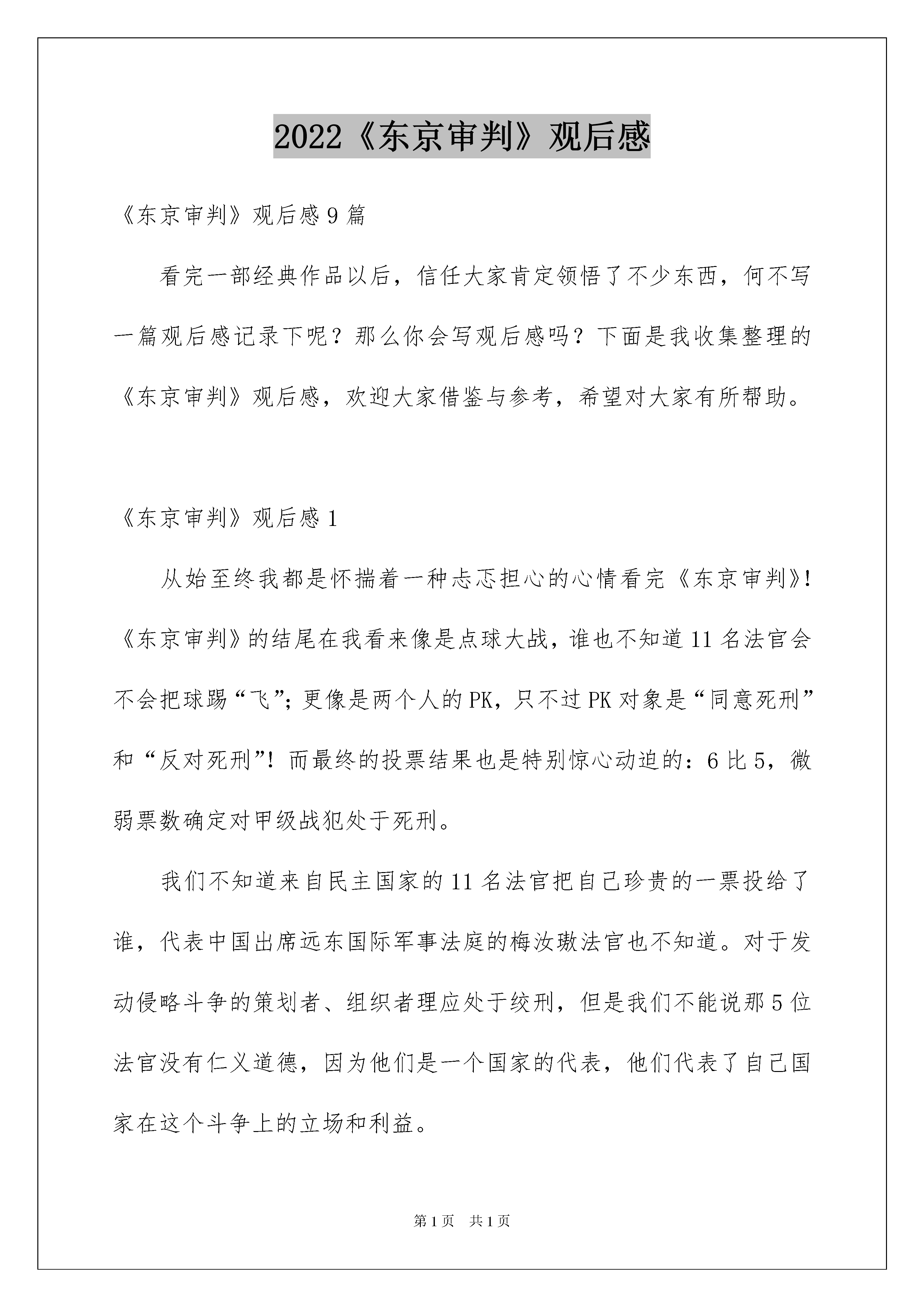 2022《东京审判》观后感《东京审判》观后感9篇看完一部经典作品以后,信任大家肯定领悟了不少东西,何不写一篇观后感记录下呢?那么你会写观后感吗?下面是我收集整理的《东京审判》观后感,欢迎大家借鉴与参考,希望对大家有所帮助。《东京审判》观后感1从始至终我都是怀揣着一种忐忑担心的心情看完《东京审判》!《东京审判》的结尾在我看来像是点球大战,谁也不知道11名法官会不会把球踢“飞”;更像是两个人的PK,只不过PK对象是“同意死刑”和“反对死刑”!而最终的投票结果也是特别惊心动迫的:6比5,微弱票数确定对甲级战犯处于死刑。我们不知道来自民主国家的11名法官把自己珍贵的一票投给了谁,代表中国出席远东国际军事法庭的梅汝璈法官也不知道。对于发动侵略斗争的策划者、组织者理应处于绞刑,但是我们不能说那5位法官没有仁义道德,因为他们是一个国家的代表,他们代表了自己国家在这个斗争上的立场和利益。我想到了最近比较流行的“杀人”嬉戏,甲是警察,夜里已阅历过乙是匪徒。投票的时候,甲“跳警”,指出乙是匪徒,劝服平民把匪徒乙投出局,但是乙硬死不承认,平民则持有自己的观点。在东京审判中,梅汝璈先生明显扮演了警察的角色,东条英机等日本战犯是匪徒,另外10名法官则扮演平民角色。东条英机他们的罪行很明显,就像在“杀人”嬉戏中,警察已阅历过他们的身份,就是匪徒,但是法官问讯时,东条英机、板垣真四郎等战犯却异口同声说道“我无罪”,这是无视国际法律、无视人道主义的军国主义表现。在审判过程中,东条英机、板垣真四郎等说,“我们出于怜悯和友情”,“我们是酷爱和平的日本人”,“我们是防卫斗争,不违反国际法的斗争”,“日本没有侵略满洲的任何行为”。最让人气氛的是,东条英机尽然说道,“不管是过去、现在还是将来,我们都是正确的,我们还会接着发动斗争”,每一个中国人听了这句话后,只会更加激起对日本人的仇恨和对东条英机的憎恨,所以可以理解我们的国民直到今日为什么还拥有如此高的反日心情。中国人没有错,我们的反日心情全部是日本人带来的。当然,我个人是反对激进的爱国主义的!东京审判也出现了搞笑的情景,也是处在审判的结尾量刑时,究竟是否对甲级战犯处于死刑,原来是法律问题,尽然探讨到文明与宗教的问题,探讨佛的问题,这更说明白11名法官内心的利益冲突。还好,最终还是同意对东条英机等甲级战犯处于死刑。虽然,这个结果来得太漫长太惊心。东京审判历时两年多,经过817次庭审,终告结束!这部电影的基调总体来说是肃穆、低调、充溢仇恨的,但是影片中的小酒馆却洋溢着一种欢快、和谐的气氛,热忱的老板娘发挥了极其重要的作用。在这里,各国的法官喝酒、闲聊、唱歌、跳舞,完全没有远东国际法庭里的英森和冷淡。但是,这个欢快的小酒馆也没能坚持在最终,因为一个狂热的日本爱国分子的不理智行为,扼杀了这片净土。悲伤!我还想谈《东京审判》的导演高群书,这部电影是他负债500万拍摄的。我不敢用“拷问某些国人的良知”这样的字眼,我觉得自己没资格。我只是以一个电影爱好者的身份置疑中国的电影投资者和怜悯高导演的悲剧。当我看完影片后,我觉得高导演的500万是可以赚回来的,因为每一个爱国的人都应当区看一看《东京审判》!——————始终以来,我都对历史的“侧面”比较感爱好。比如金朝攻下北宋,我们的历史书就似乎遗忘了那北方的大片土地,清一色的描绘着南宋的景象。我却始终很留意关于那个时代关于北方人民生活状态、政策民心的记载。可能“侧面”只是大历史背景下的一些琐碎的细微环节,但却是历史中最生动最鲜活的一面。关于东京审判,我们的教科书中往往是在抗战结束后一笔带过,短短一小段,不足三十个字。所以大部分学生在没有看《东京审判》这部电影之前,都没有料想到在教科书中的一小段文字背后,竟然是那么长的时间跨度、那么困难的政治博弈和那么艰苦的心理斗争。包括我。我也因为这个电影,突然意识到我们教科书的失败。书中淡化的不仅是一个历史细微环节,而是这段历史中颇为生动的一部分。历史之所以吸引人,就是因为有生动的细微环节存在。所以细微环节是重要的,不能被忽视的。假如失去了、遗忘了这些细微环节,历史就会味同嚼蜡,犹如历史书最终附上的年表一般。拿着这样的历史书,不仅无法吸引后来人,而且就算他们看了,也只能让他们极不情愿的记住一些梗概和数字,谈不上对历史的相识。那样,我们不如让孩子们扔掉课本,干脆看电影。有人会说我们不煽动民族仇恨,这样跟日本教科书的歪曲描写形成对比。这毫无疑问是无谓的意淫,明显这种失误不行能是因为我们的“高尚”造成的。记录历史的人不仅应当真实的反映历史,而且更应当全面的、鲜活的反映。至于当代中国人面对日本对华侵略这段历