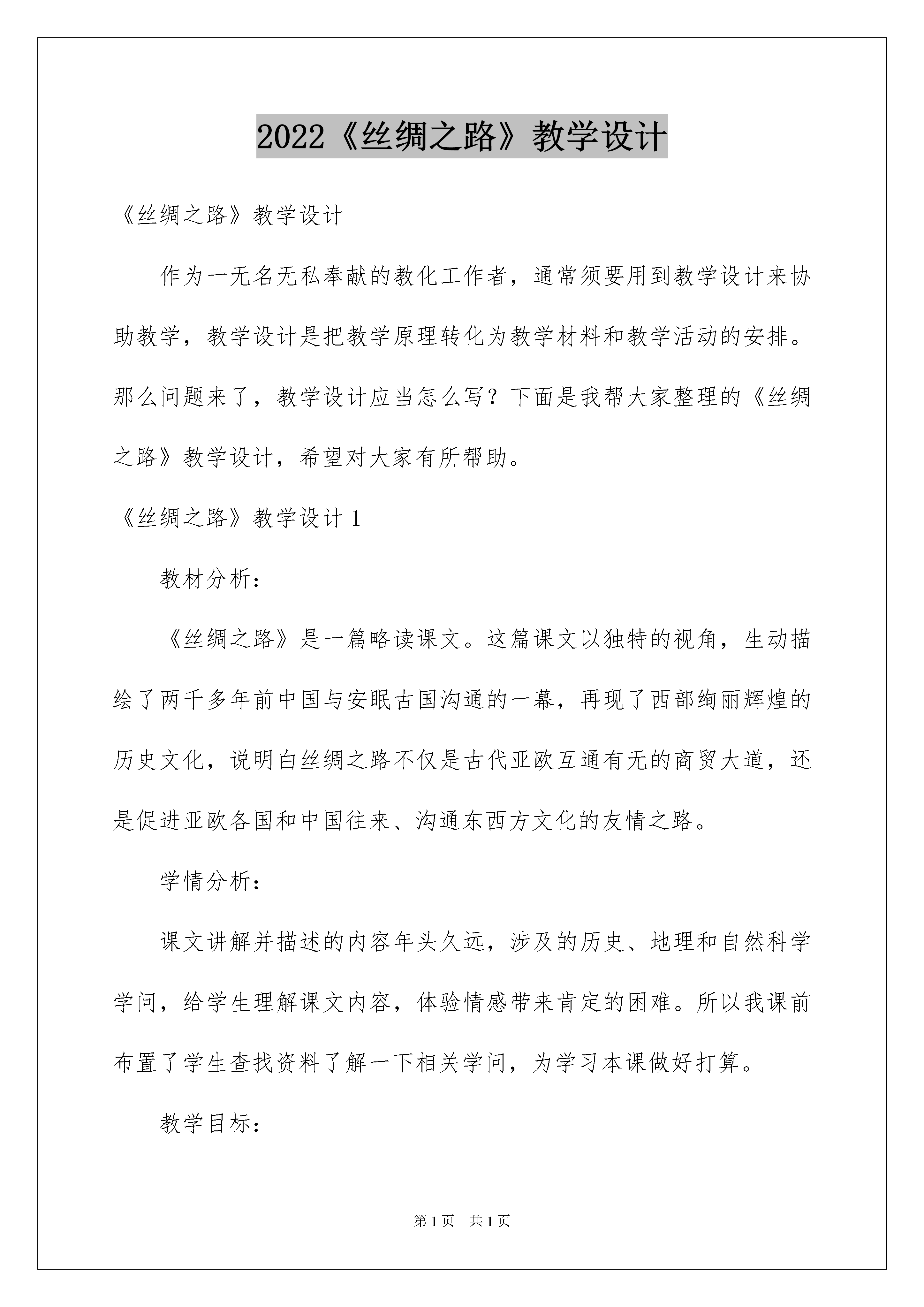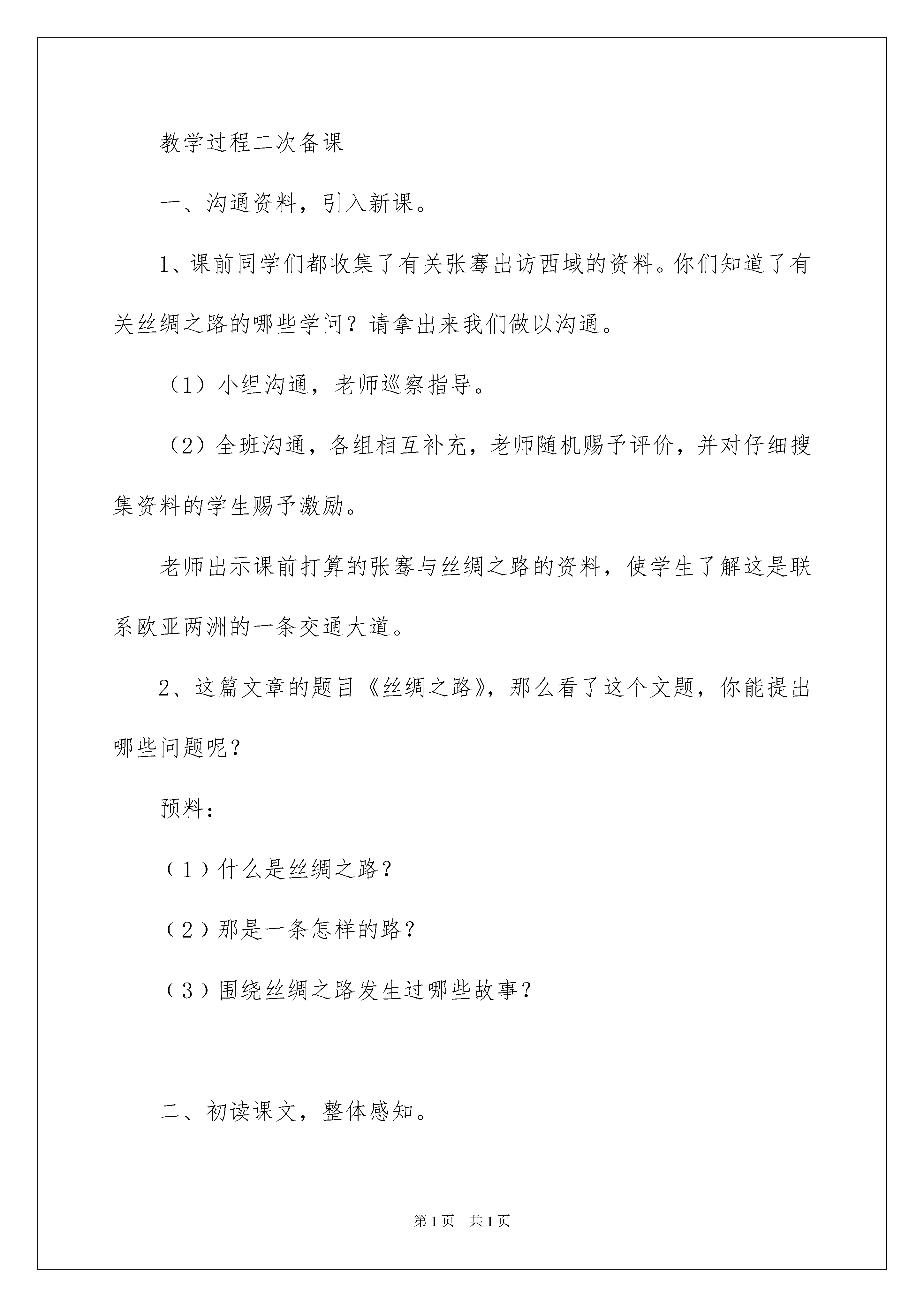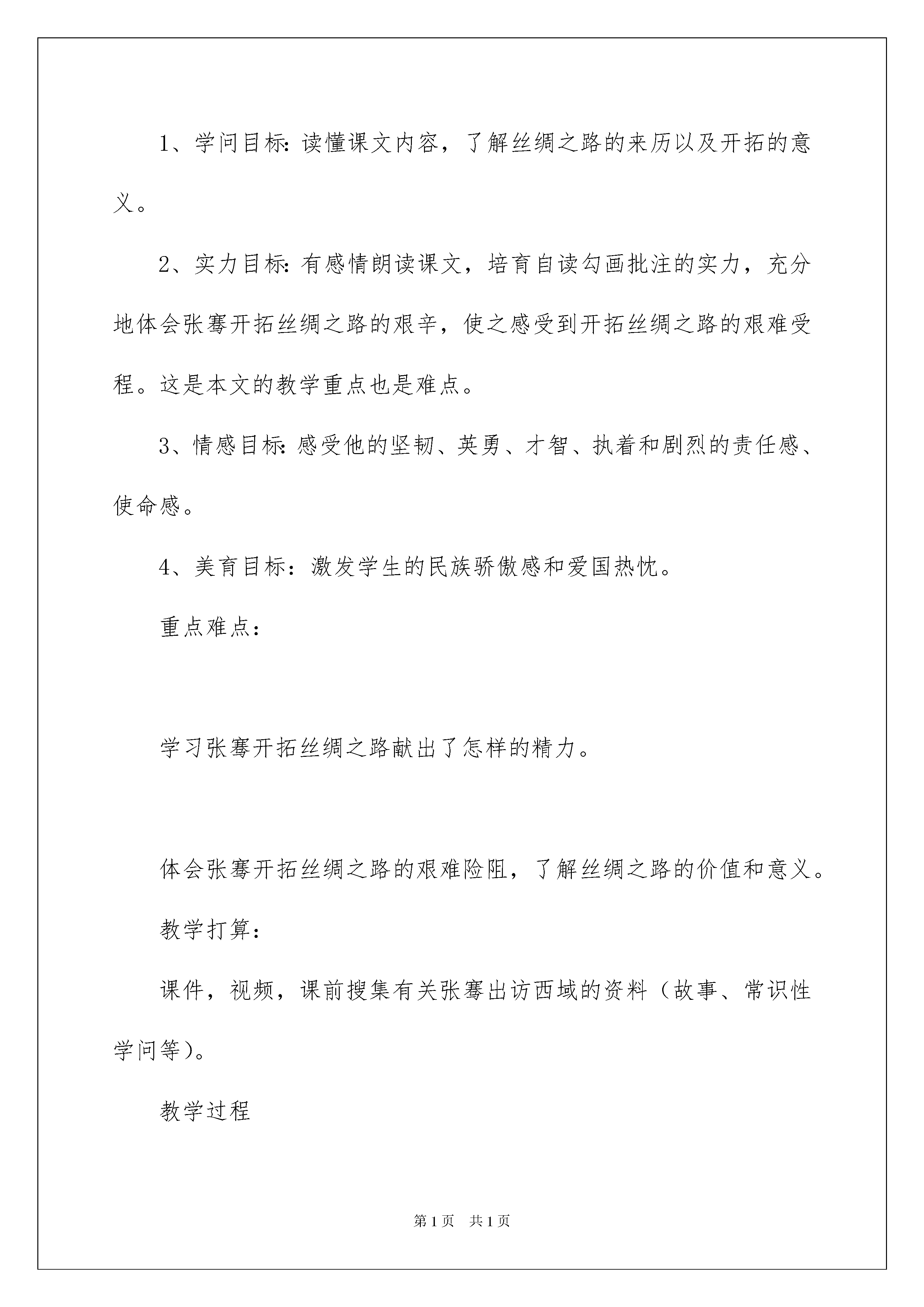 2022《丝绸之路》教学设计《丝绸之路》教学设计作为一无名无私奉献的教化工作者,通常须要用到教学设计来协助教学,教学设计是把教学原理转化为教学材料和教学活动的安排。那么问题来了,教学设计应当怎么写?下面是我帮大家整理的《丝绸之路》教学设计,希望对大家有所帮助。《丝绸之路》教学设计1教材分析:《丝绸之路》是一篇略读课文。这篇课文以独特的视角,生动描绘了两千多年前中国与安眠古国沟通的一幕,再现了西部绚丽辉煌的历史文化,说明白丝绸之路不仅是古代亚欧互通有无的商贸大道,还是促进亚欧各国和中国往来、沟通东西方文化的友情之路。学情分析:课文讲解并描述的内容年头久远,涉及的历史、地理和自然科学学问,给学生理解课文内容,体验情感带来肯定的困难。所以我课前布置了学生查找资料了解一下相关学问,为学习本课做好打算。教学目标:1、学问目标:读懂课文内容,了解丝绸之路的来历以及开拓的意义。2、实力目标:有感情朗读课文,培育自读勾画批注的实力,充分地体会张骞开拓丝绸之路的艰辛,使之感受到开拓丝绸之路的艰难受程。这是本文的教学重点也是难点。3、情感目标:感受他的坚韧、英勇、才智、执着和剧烈的责任感、使命感。4、美育目标:激发学生的民族骄傲感和爱国热忱。重点难点:学习张骞开拓丝绸之路献出了怎样的精力。体会张骞开拓丝绸之路的艰难险阻,了解丝绸之路的价值和意义。教学打算:课件,视频,课前搜集有关张骞出访西域的资料(故事、常识性学问等)。教学过程教学过程二次备课一、沟通资料,引入新课。1、课前同学们都收集了有关张骞出访西域的资料。你们知道了有关丝绸之路的哪些学问?请拿出来我们做以沟通。(1)小组沟通,老师巡察指导。(2)全班沟通,各组相互补充,老师随机赐予评价,并对仔细搜集资料的学生赐予激励。老师出示课前打算的张骞与丝绸之路的资料,使学生了解这是联系欧亚两洲的一条交通大道。2、这篇文章的题目《丝绸之路》,那么看了这个文题,你能提出哪些问题呢?预料:﹙1﹚什么是丝绸之路?﹙2﹚那是一条怎样的路?﹙3﹚围绕丝绸之路发生过哪些故事?二、初读课文,整体感知。我想,此时同学们肯定迫不及待的想要到丝绸之路上看看,好,现在我们就一同进入课文之中。(老师出示课前打算的张骞与丝绸之路的资料,使学生了解这是联系欧亚两洲的一条交通大道,这为学生理解课文内容,供应感性的相识。引起学生学习的爱好。)1、自读课文。要求:用自己喜爱的方式读课文,读准字音,读通课文。遇到不相识的字,自己用学过的方法解决。2、读后沟通:读了课文,你都知道了些什么?(作者先描写了陕西西安市的巨型浮雕,然后阐明丝绸之路的历史意义,最终遐想不同两国互赠礼品的友好场面)。三、感悟课文,积累语言。学习第1、2自然段:1、学生默读课文第1、2自然段,思索:你从这两个自然段中知道了什么?体会到什么?2、全班沟通。老师指导学生明确以下问题:(1)中国的丝绸在国外有很高的知名度;(2)外国人把中国称之为“丝绸之国”;3)从“目瞪口呆”、“赞叹不已”等人们的神态表情中能体会到中国的丝绸是多么的绚丽夺目,使人惊异、赞美……(使同学们知道我国被外国人称为“丝绸之国”,中国丝绸再外国享有很高的知名度。学习3―7自然段:1、默读课文3―7自然段并思索以下问题:张骞在开拓丝绸之路的过程中遇到了哪些困难?你从哪儿能体会到?2、学生小组内沟通,老师巡察。3、全班沟通。依据学生沟通状况随机指导朗读,并且让学生明确以下内容:(1)从“交通不便,没有马路,没有汽车和飞机……”能看出张骞开拓丝绸之路困难重重;(2)从“日夜兼程”能体会出张骞为开拓丝绸之路不辞辛苦;(3)从“他耐性地、不露声色地等待着、打算着”,“忍受着燥热和干渴的煎熬……”,“历尽千难万险,出访西域十三年”等语句中,体会到张骞开拓丝绸之路的坚决信念以及他的深深的爱国情怀。(4)从“张骞向汉武帝介绍了西域各国的方位、人口、兵力、风俗、物产、相互关系以及对汉朝的看法”中我们能感受到张骞此行虽历尽艰辛,却也收获颇丰。[通过这一部分的教学,要让学生感受到张骞为开拓丝绸之路所付出的艰辛,感受丝绸之路的历史意义]4、指导学生相识过渡段并体会过渡段的作用。(1)自读第四自然段思索:这一自然段的前三句话和哪一自然段的意思联系紧密?(2)全班沟通:和第三自然段意思联系的紧密。第三自然段最终一句话是疑问句“中国丝绸原委是怎样运到欧洲去的呢?”第四自然段前三句话回答并说明了这个问题。(3)设计提问:第四自然段最终一句话讲了什么?和下面几个自然段有什么关系?(4)全班沟通:最终一句话点出张骞为开拓丝绸之路献出了毕生的精力,后面几个自然段则讲了开拓的过程。(