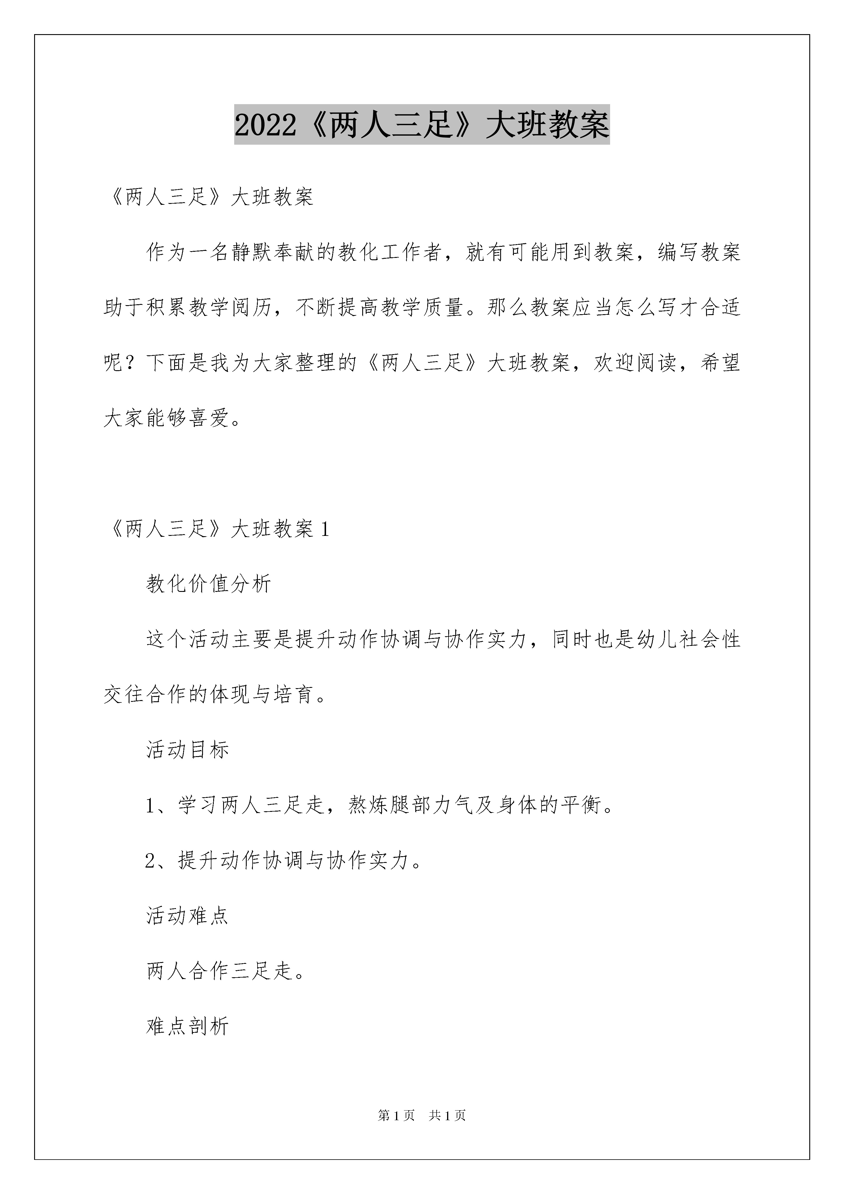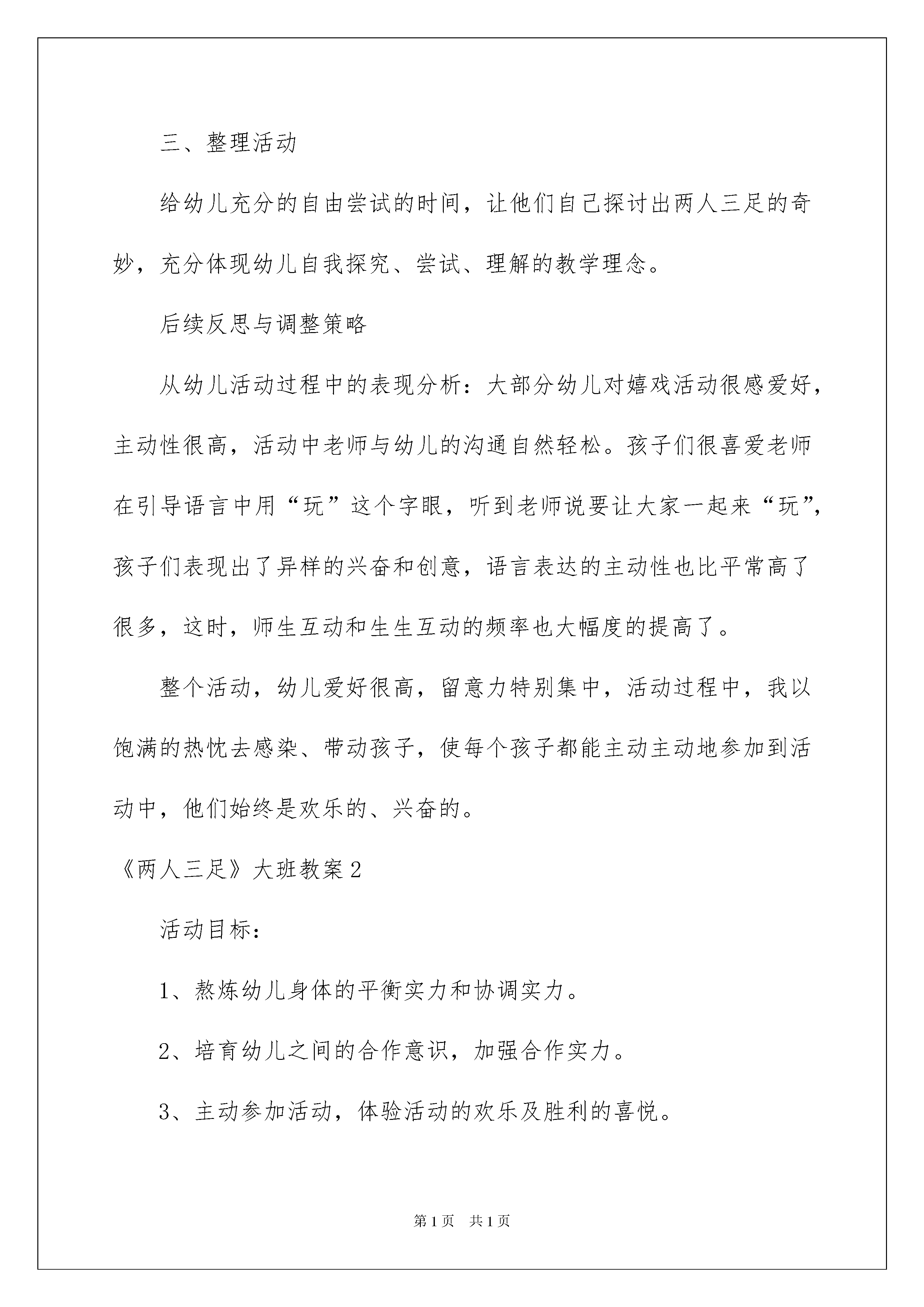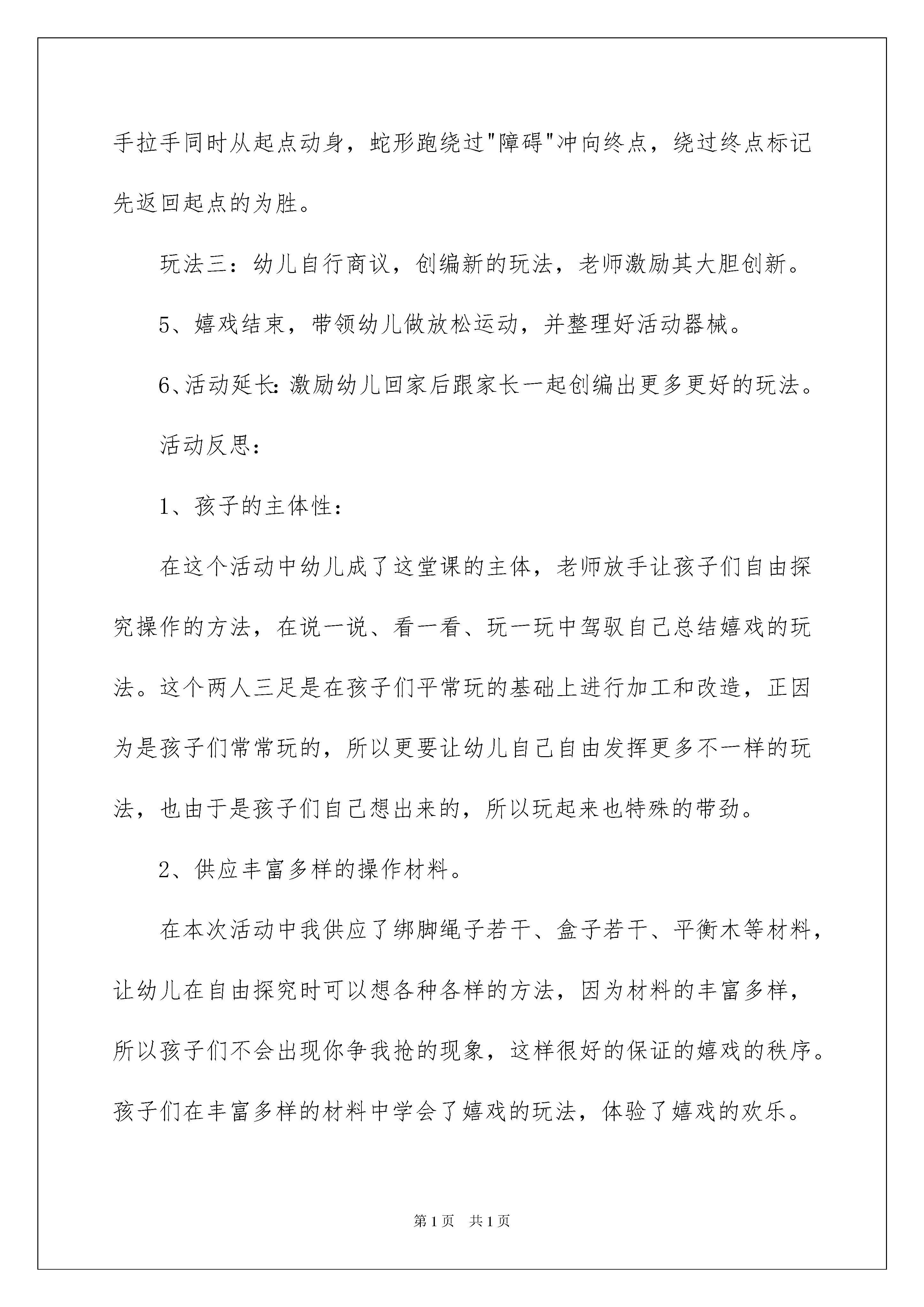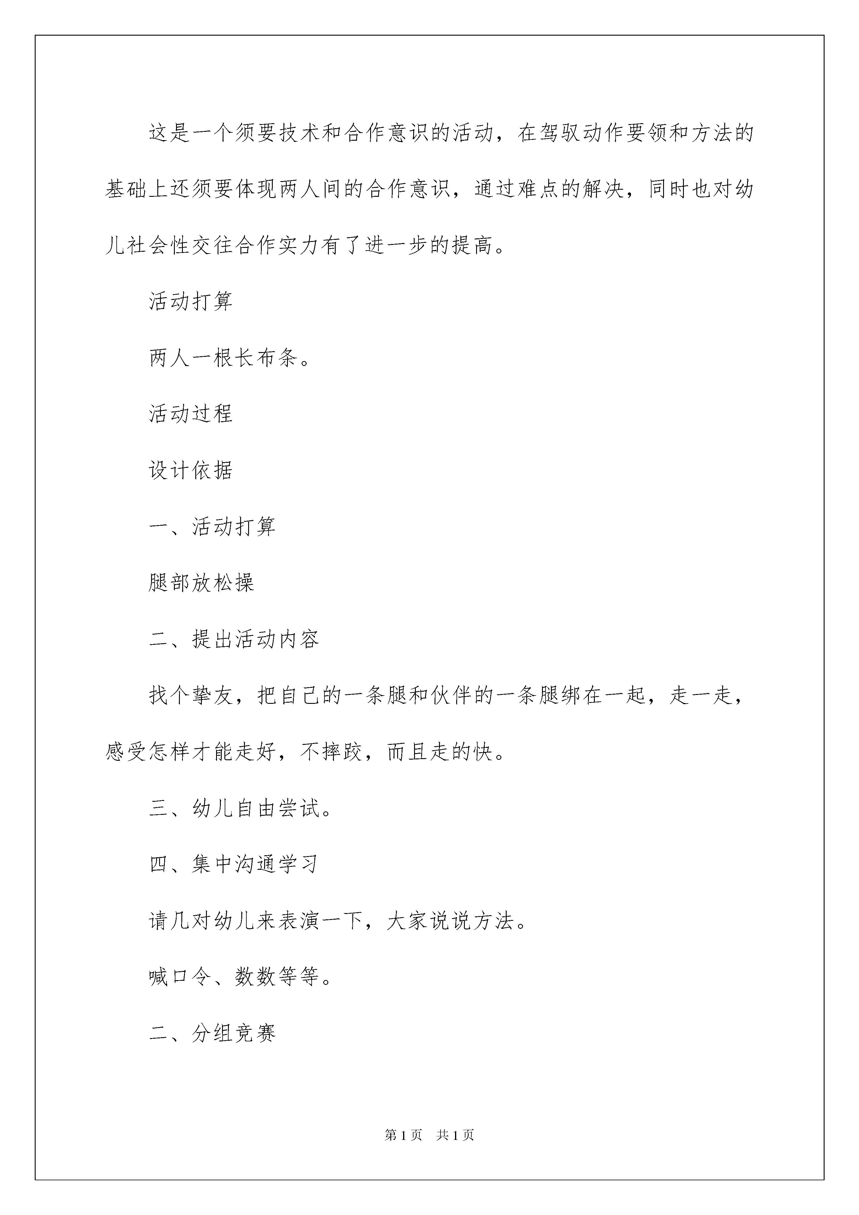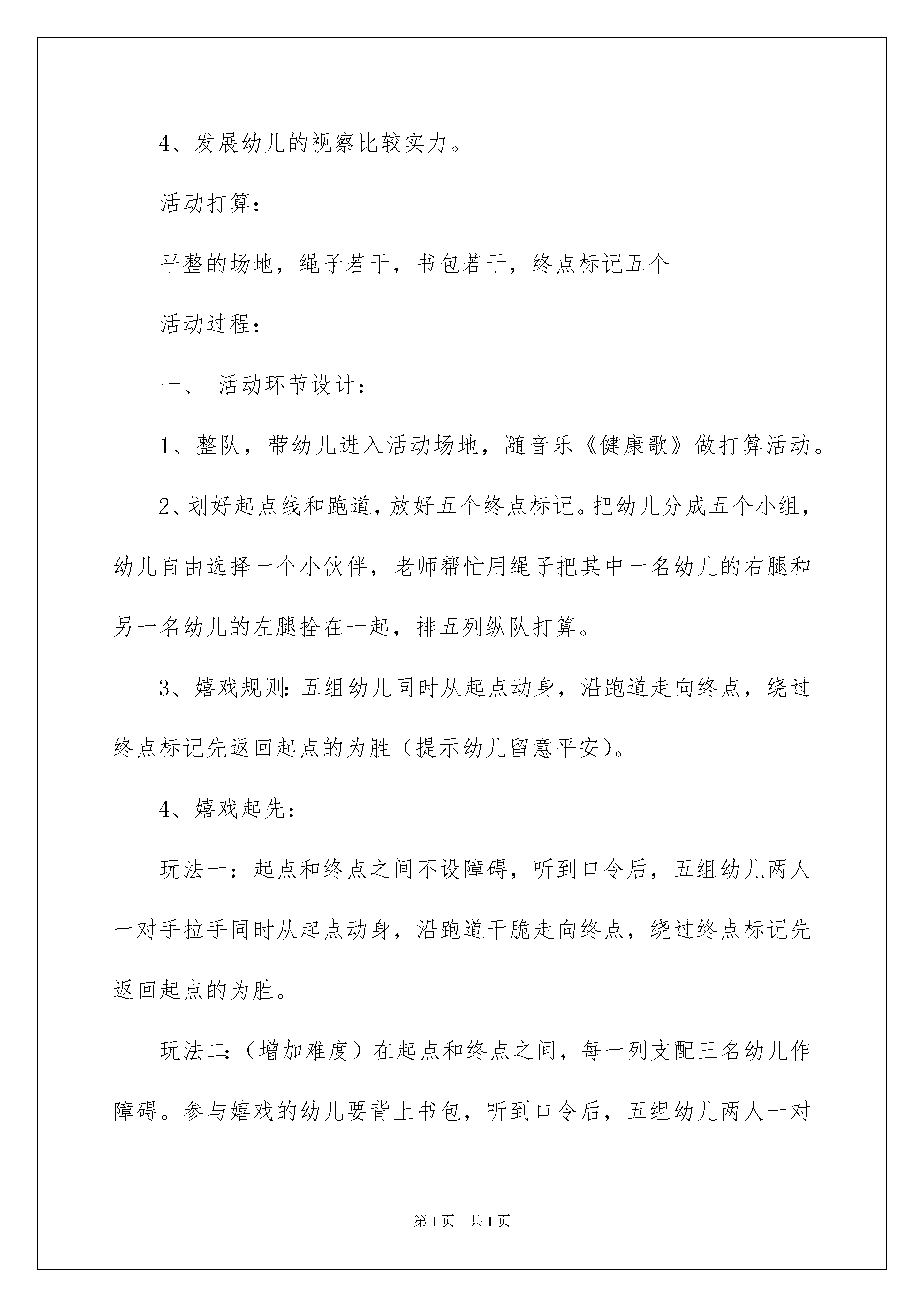 2022《两人三足》大班教案《两人三足》大班教案作为一名静默奉献的教化工作者,就有可能用到教案,编写教案助于积累教学阅历,不断提高教学质量。那么教案应当怎么写才合适呢?下面是我为大家整理的《两人三足》大班教案,欢迎阅读,希望大家能够喜爱。《两人三足》大班教案1教化价值分析这个活动主要是提升动作协调与协作实力,同时也是幼儿社会性交往合作的体现与培育。活动目标1、学习两人三足走,熬炼腿部力气及身体的平衡。2、提升动作协调与协作实力。活动难点两人合作三足走。难点剖析这是一个须要技术和合作意识的活动,在驾驭动作要领和方法的基础上还须要体现两人间的合作意识,通过难点的解决,同时也对幼儿社会性交往合作实力有了进一步的提高。活动打算两人一根长布条。活动过程设计依据一、活动打算腿部放松操二、提出活动内容找个挚友,把自己的一条腿和伙伴的一条腿绑在一起,走一走,感受怎样才能走好,不摔跤,而且走的快。三、幼儿自由尝试。四、集中沟通学习请几对幼儿来表演一下,大家说说方法。喊口令、数数等等。二、分组竞赛三、整理活动给幼儿充分的自由尝试的时间,让他们自己探讨出两人三足的奇妙,充分体现幼儿自我探究、尝试、理解的教学理念。后续反思与调整策略从幼儿活动过程中的表现分析:大部分幼儿对嬉戏活动很感爱好,主动性很高,活动中老师与幼儿的沟通自然轻松。孩子们很喜爱老师在引导语言中用“玩”这个字眼,听到老师说要让大家一起来“玩”,孩子们表现出了异样的兴奋和创意,语言表达的主动性也比平常高了很多,这时,师生互动和生生互动的频率也大幅度的提高了。整个活动,幼儿爱好很高,留意力特别集中,活动过程中,我以饱满的热忱去感染、带动孩子,使每个孩子都能主动主动地参加到活动中,他们始终是欢乐的、兴奋的。《两人三足》大班教案2活动目标:1、熬炼幼儿身体的平衡实力和协调实力。2、培育幼儿之间的合作意识,加强合作实力。3、主动参加活动,体验活动的欢乐及胜利的喜悦。4、发展幼儿的视察比较实力。活动打算:平整的场地,绳子若干,书包若干,终点标记五个活动过程:一、活动环节设计:1、整队,带幼儿进入活动场地,随音乐《健康歌》做打算活动。2、划好起点线和跑道,放好五个终点标记。把幼儿分成五个小组,幼儿自由选择一个小伙伴,老师帮忙用绳子把其中一名幼儿的右腿和另一名幼儿的左腿拴在一起,排五列纵队打算。3、嬉戏规则:五组幼儿同时从起点动身,沿跑道走向终点,绕过终点标记先返回起点的为胜(提示幼儿留意平安)。4、嬉戏起先:玩法一:起点和终点之间不设障碍,听到口令后,五组幼儿两人一对手拉手同时从起点动身,沿跑道干脆走向终点,绕过终点标记先返回起点的为胜。玩法二:(增加难度)在起点和终点之间,每一列支配三名幼儿作障碍。参与嬉戏的幼儿要背上书包,听到口令后,五组幼儿两人一对手拉手同时从起点动身,蛇形跑绕过"障碍"冲向终点,绕过终点标记先返回起点的为胜。玩法三:幼儿自行商议,创编新的玩法,老师激励其大胆创新。5、嬉戏结束,带领幼儿做放松运动,并整理好活动器械。6、活动延长:激励幼儿回家后跟家长一起创编出更多更好的玩法。活动反思:1、孩子的主体性:在这个活动中幼儿成了这堂课的主体,老师放手让孩子们自由探究操作的方法,在说一说、看一看、玩一玩中驾驭自己总结嬉戏的玩法。这个两人三足是在孩子们平常玩的基础上进行加工和改造,正因为是孩子们常常玩的,所以更要让幼儿自己自由发挥更多不一样的玩法,也由于是孩子们自己想出来的,所以玩起来也特殊的带劲。2、供应丰富多样的操作材料。在本次活动中我供应了绑脚绳子若干、盒子若干、平衡木等材料,让幼儿在自由探究时可以想各种各样的方法,因为材料的丰富多样,所以孩子们不会出现你争我抢的现象,这样很好的保证的嬉戏的秩序。孩子们在丰富多样的材料中学会了嬉戏的玩法,体验了嬉戏的欢乐。3、创设情境,吸引爱好。在整个活动中我创设了一个帮小学里的哥哥姐姐运皮球,从而让孩子们进行两人合作进行练习,并让幼儿知道在去这条路上有许多的困难,我们要把困难克服了才能够把皮球运过去,所以在运皮球之前要把本事学好。从而让幼儿进行自由探究本事,而后学会本事。最终以把本事学会,去帮哥哥姐姐运皮球为结尾。让整个情景都参加其中,让孩子们特别的感爱好。《两人三足》大班教案3活动目标1、熬炼下肢力气,发展身体的协调性和平衡性。2、学会合作、协商。活动打算皮筋、平衡凳、轮胎、音乐(热身、放松)活动过程一、音乐热身跟音乐互动身体关节,重点活动下肢关节二、出示皮筋,引出嬉戏名称。1、幼儿自由俩俩结合,用皮筋绑在一起,试着走一走。在走的过程中,留意走得好的。2、老师小结,引导幼儿为什么有的小伙伴