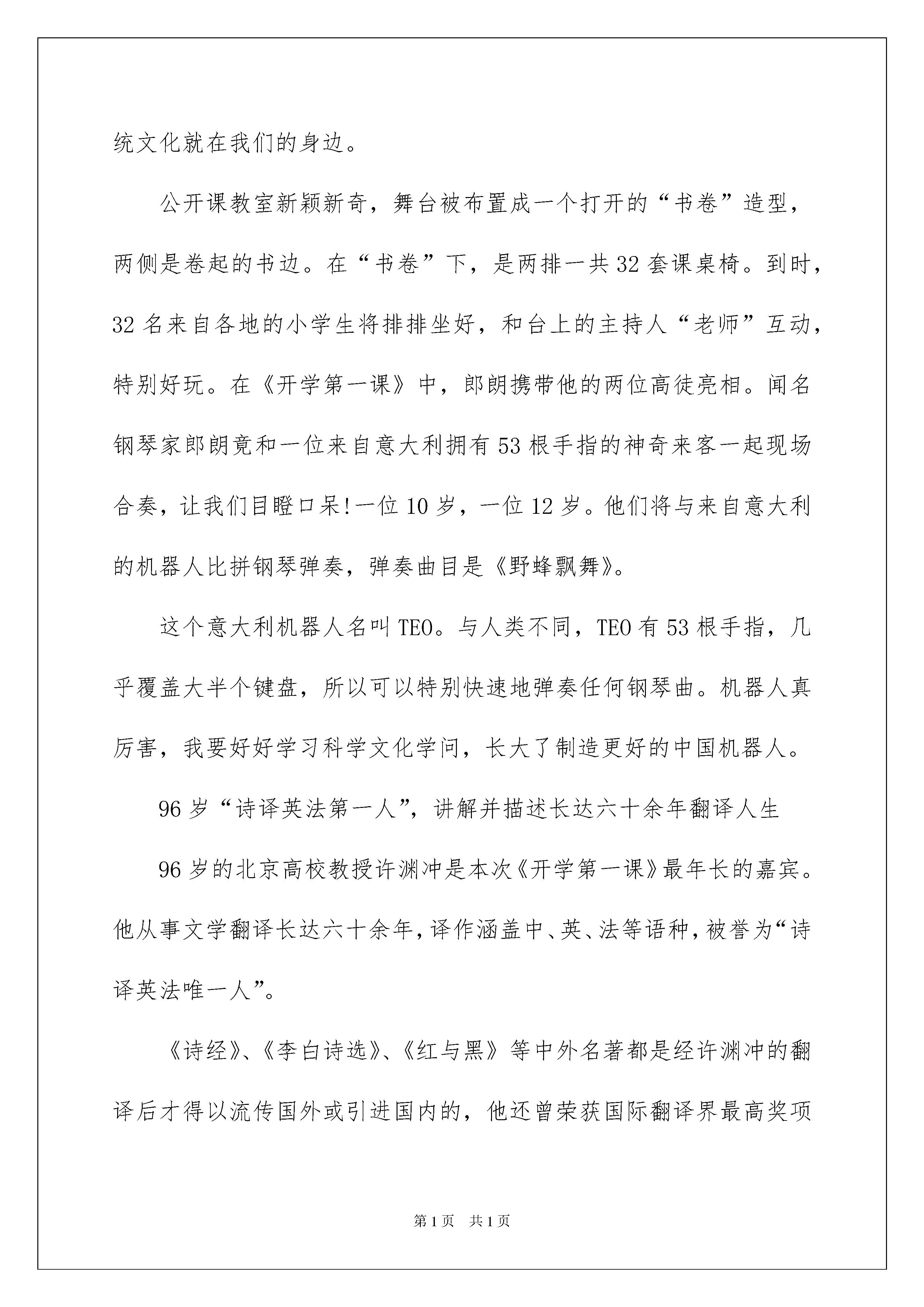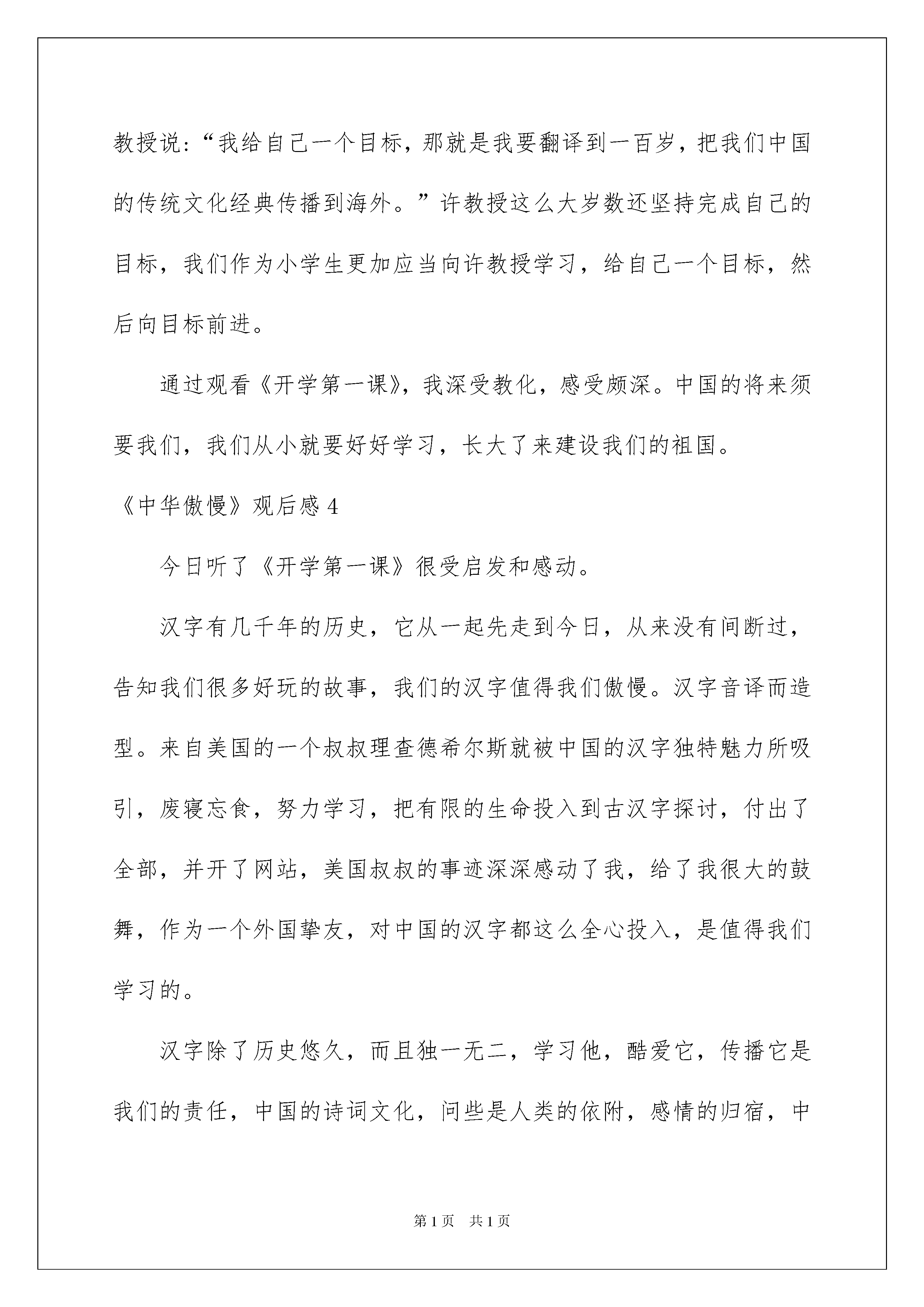 2022《中华骄傲》观后感《中华傲慢》观后感15篇看完某一作品后,信任你会有不少感想吧,为此就要仔细思索观后感如何写了。那么你真的会写观后感吗?以下是我细心整理的《中华傲慢》观后感,仅供参考,欢迎大家阅读。《中华傲慢》观后感19月1日,开学第一课上映。2022这一期,主题是“中华的傲慢。”什么是中华的傲慢?中华上下五千年,最值得傲慢的,莫过于中国渊博的文化。中国是四大文明古国之一,闻名遐迩,有人说过:“一辈子中国人可以学会其各国的语言,而外国人一辈子都学不完中华文化。”事实亦是如此,至今没有人可以,甚至是敢说,自己完全学会了中华文化。而却又不少人说自己完全学会了英语。由此便可以看出中华文化的博大精深。外国老人理查德,已经白发苍苍,却对中国文化爱得至深。他22岁来到中国,如今已经不是那个朝气蓬勃的小伙子了。然而,当时他一心钻研中文,到现在,照旧没有放弃。他用完了财产,差不多33万多美金;用完了时间,这漫漫几十年……他44岁得了心脏病,多次动手术……他的挚友,严迪新,脊柱上长了肿瘤,有时候痛的说不出话来,却照旧不放弃中文。理查德说:“有一天,我突然不能在中国待下去了。因为我的签证有问题。我当时就很难受,我说我不要离开中国。当时多亏了迪新,把我的故事编制成故事,好多人来助我一臂之力,才得以留在中国。”电视前的我,清清晰楚望见,理查德得双眼潮湿了……他花费了多数心血,一个外国人,掏心掏肺,为中国文化做奉献。他把各本字典的字词,一一搬到自己创建的网站上。这一举,花了足足八年!!一个外国人,都被中国文化的魅力感染到这个程度,身为中国学子,我们有什么理由不好好学习?中国文化,渊博,好玩,震撼人心。这是身为中国人最大的傲慢啊!《中华傲慢》观后感29.1晚上,我和爸爸妈妈一起观看了中心电视台综合频道(CCTV-1)播出的开学第一课,今年央视《开学第一课》的主题是“我的中华傲慢”。内容主要是讲我们中国的传统文化,精彩的节目让我感受到了传统文化就在我们的身边。公开课教室新颖新奇,舞台被布置成一个打开的“书卷”造型,两侧是卷起的书边。在“书卷”下,是两排一共32套课桌椅。到时,32名来自各地的小学生将排排坐好,和台上的主持人“老师”互动,特别好玩。在《开学第一课》中,郎朗携带他的两位高徒亮相。闻名钢琴家郎朗竟和一位来自意大利拥有53根手指的神奇来客一起现场合奏,让我们目瞪口呆!一位10岁,一位12岁。他们将与来自意大利的机器人比拼钢琴弹奏,弹奏曲目是《野蜂飘舞》。这个意大利机器人名叫TEO。与人类不同,TEO有53根手指,几乎覆盖大半个键盘,所以可以特别快速地弹奏任何钢琴曲。机器人真厉害,我要好好学习科学文化学问,长大了制造更好的中国机器人。96岁“诗译英法第一人”,讲解并描述长达六十余年翻译人生96岁的北京高校教授许渊冲是本次《开学第一课》最年长的嘉宾。他从事文学翻译长达六十余年,译作涵盖中、英、法等语种,被誉为“诗译英法唯一人”。《诗经》、《李白诗选》、《红与黑》等中外名著都是经许渊冲的翻译后才得以流传国外或引进国内的,他还曾荣获国际翻译界最高奖项之一的“北极光”杰出文学翻译奖。看了节目,我的心情久久不能安静,中华历史悠久,中国传统文化博大精深,这是我们每个中国人的傲慢。《中华傲慢》观后感3一年一度的《开学第一课》最终在9月1日播出啦!这一次的主题是“中华傲慢”。关于中华傲慢历史书上写了许多许多,如四大独创,但我觉得汉字更有代表性。正如节目中王宁教授说的,汉字和汉字文化能绵延不绝,生命就在民间。汉字书法是一门独特的艺术,能写得和画家一样,行书流畅,快而灵敏。汉字是一种外国文字无法比拟的文字,中华汉字的对联、诗歌都是汉字独创的。每个汉字都经验了一段不行揣测的道路,才能流传到现在,它是中华民族的才智结晶,是中华民族的光辉荣誉。让我印象最深刻的是96岁高龄的北京高校教授许渊冲。他曾荣获国际翻译界最高奖项之一的“北极光”杰出文学翻译奖。许教授告知我们他自己每天都要翻译一两页纸,经常工作到凌晨三四点,有时也会半夜坐起,打起手电筒写下自己想到的内容,生怕其次天遗忘。许教授说:“我给自己一个目标,那就是我要翻译到一百岁,把我们中国的传统文化经典传播到海外。”许教授这么大岁数还坚持完成自己的目标,我们作为小学生更加应当向许教授学习,给自己一个目标,然后向目标前进。通过观看《开学第一课》,我深受教化,感受颇深。中国的将来须要我们,我们从小就要好好学习,长大了来建设我们的祖国。《中华傲慢》观后感4今日听了《开学第一课》很受启发和感动。汉字有几千年的历史,它从一起先走到今日,从来没有间断过,告知我们很多好玩的故事