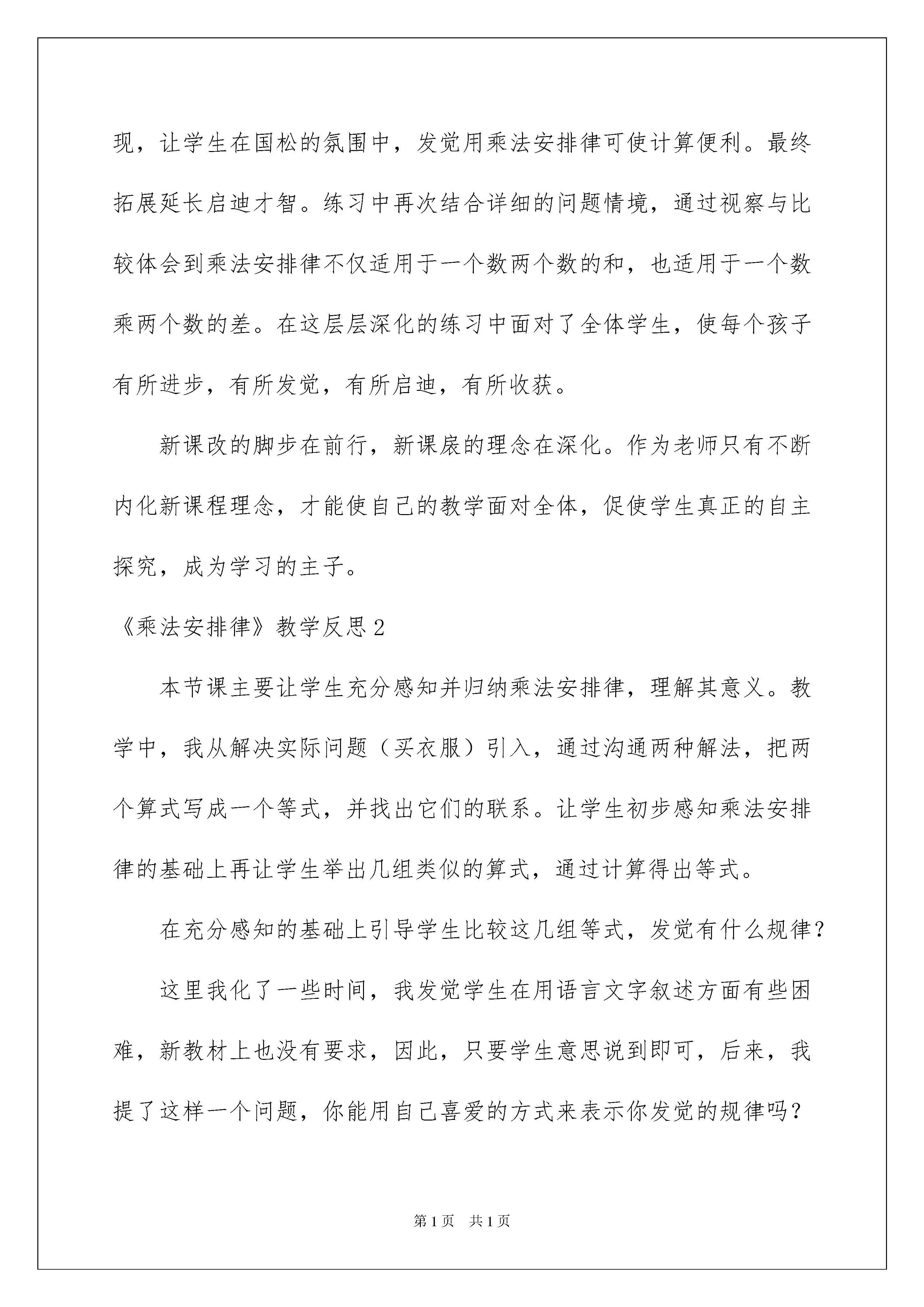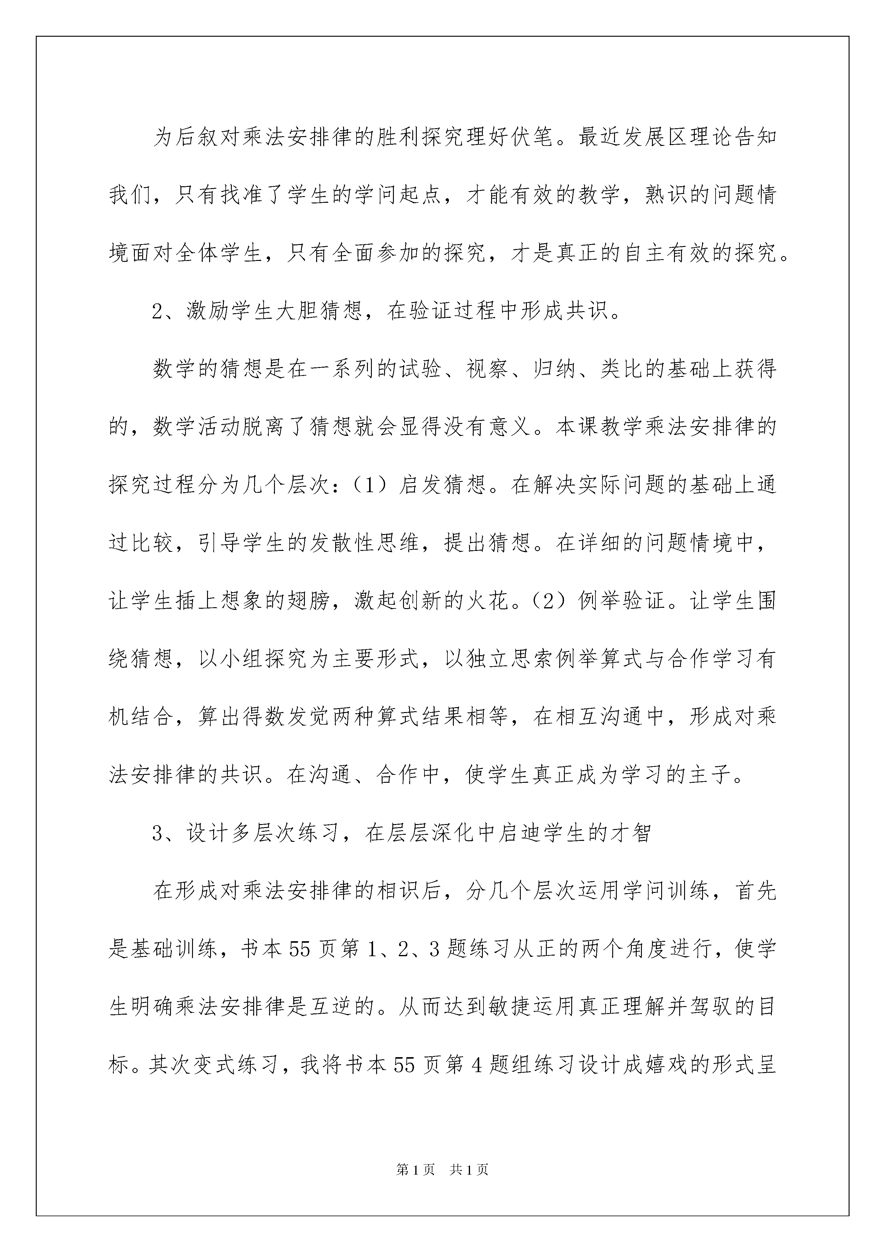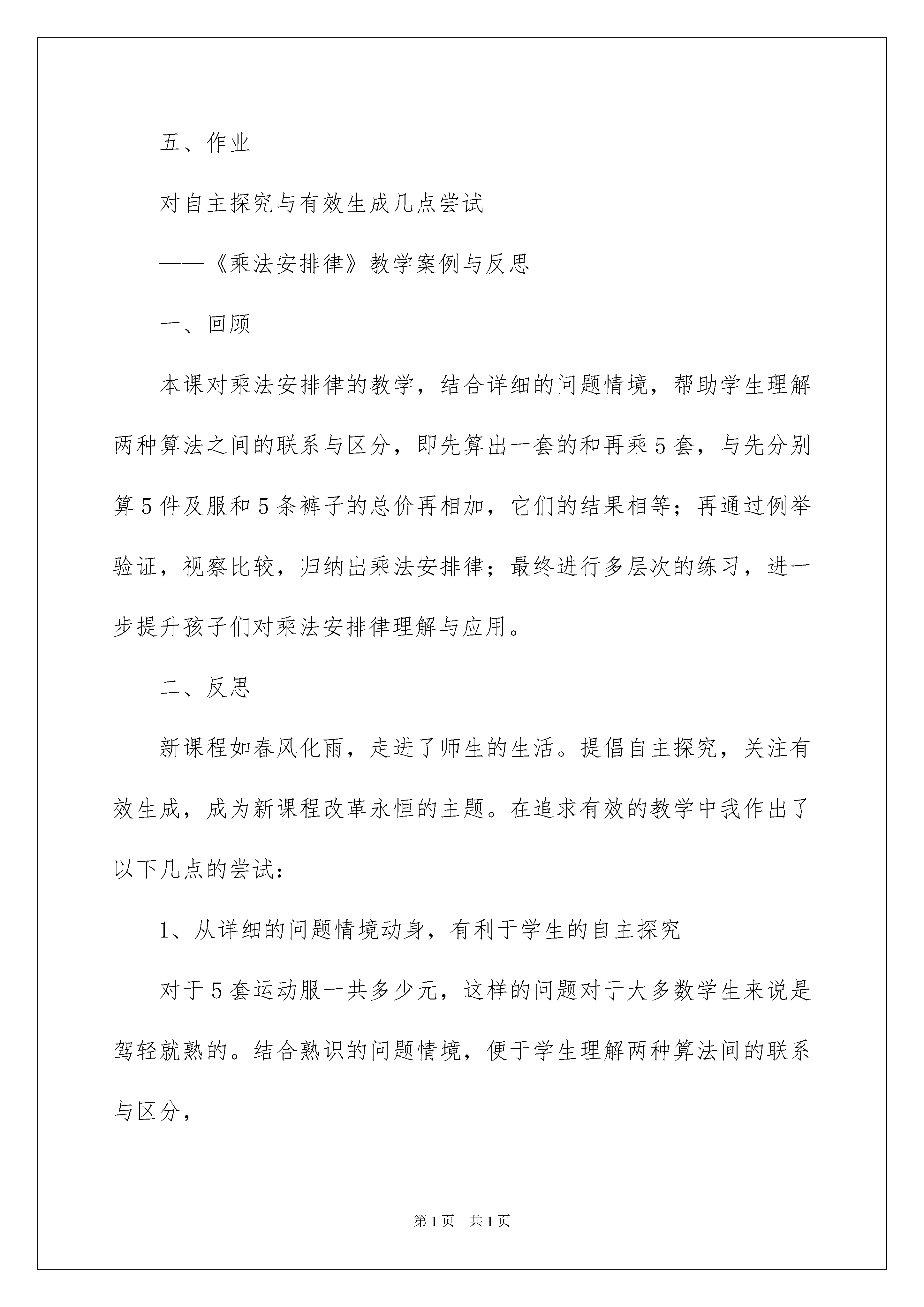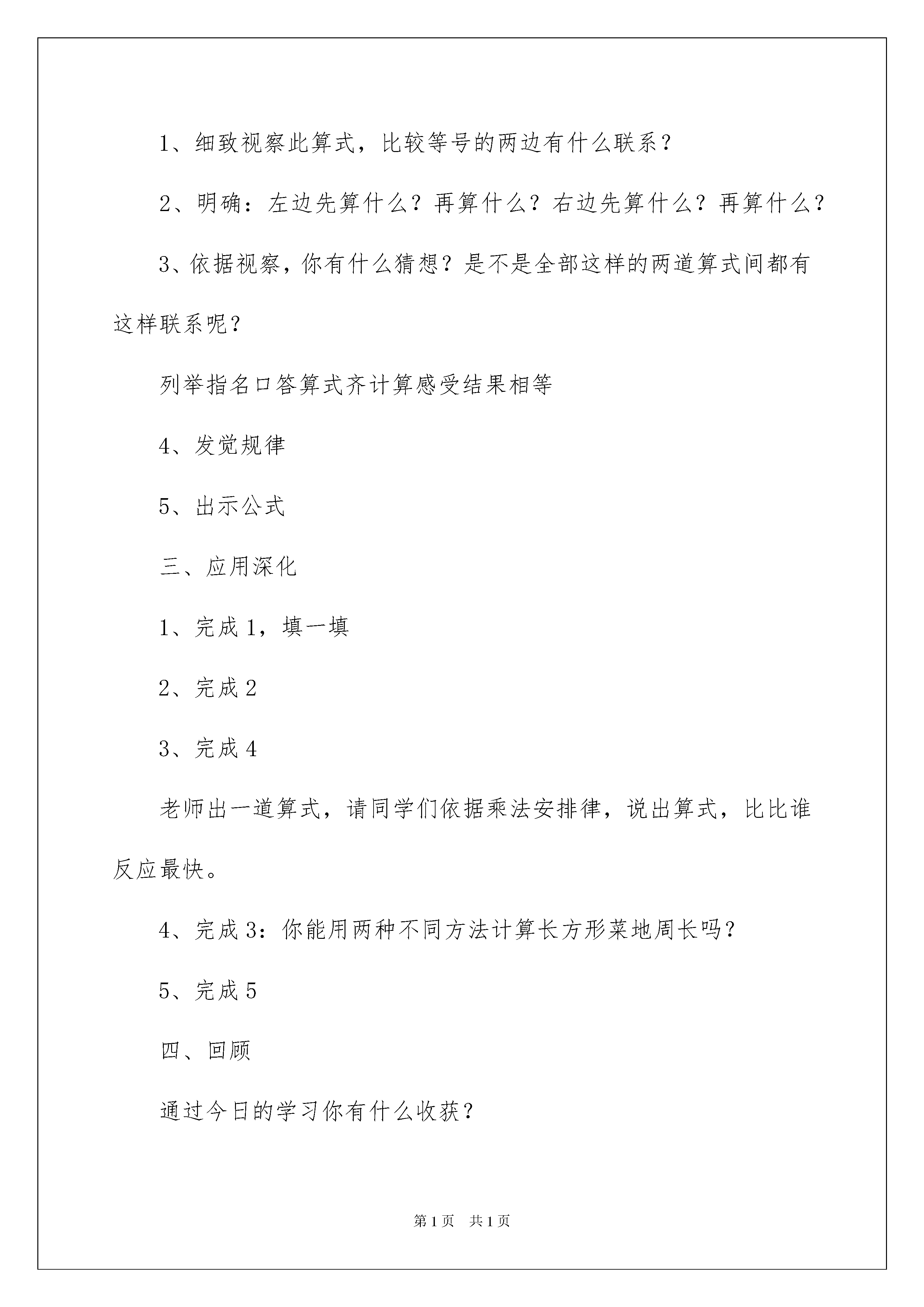 2022《乘法分配律》教学反思《乘法安排律》教学反思身为一名人民老师,我们的任务之一就是教学,借助教学反思可以快速提升我们的教学实力,我们该怎么去写教学反思呢?下面是我为大家整理的《乘法安排律》教学反思,欢迎大家共享。《乘法安排律》教学反思1教学过程:一、创境1、干脆出示:师口述:张阿姨买5件夹克和5条裤子,一共要付多少元?你们能用两种方法解答吗?(独立)指名板演2、组织沟通:你是怎么想的?(先求什么,再求什么)比较:最终结果,你发觉什么?说明:这样的两个算式可写成一个等式3、出示课题运算律今日,我们就来细致探讨这两个算式,找出其中隐藏的隐私。二、探究:1、细致视察此算式,比较等号的两边有什么联系?2、明确:左边先算什么?再算什么?右边先算什么?再算什么?3、依据视察,你有什么猜想?是不是全部这样的两道算式间都有这样联系呢?列举指名口答算式齐计算感受结果相等4、发觉规律5、出示公式三、应用深化1、完成1,填一填2、完成23、完成4老师出一道算式,请同学们依据乘法安排律,说出算式,比比谁反应最快。4、完成3:你能用两种不同方法计算长方形菜地周长吗?5、完成5四、回顾通过今日的学习你有什么收获?五、作业对自主探究与有效生成几点尝试——《乘法安排律》教学案例与反思一、回顾本课对乘法安排律的教学,结合详细的问题情境,帮助学生理解两种算法之间的联系与区分,即先算出一套的和再乘5套,与先分别算5件及服和5条裤子的总价再相加,它们的结果相等;再通过例举验证,视察比较,归纳出乘法安排律;最终进行多层次的练习,进一步提升孩子们对乘法安排律理解与应用。二、反思新课程如春风化雨,走进了师生的生活。提倡自主探究,关注有效生成,成为新课程改革永恒的主题。在追求有效的教学中我作出了以下几点的尝试:1、从详细的问题情境动身,有利于学生的自主探究对于5套运动服一共多少元,这样的问题对于大多数学生来说是驾轻就熟的。结合熟识的问题情境,便于学生理解两种算法间的联系与区分,为后叙对乘法安排律的胜利探究理好伏笔。最近发展区理论告知我们,只有找准了学生的学问起点,才能有效的教学,熟识的问题情境面对全体学生,只有全面参加的探究,才是真正的自主有效的探究。2、激励学生大胆猜想,在验证过程中形成共识。数学的猜想是在一系列的试验、视察、归纳、类比的基础上获得的,数学活动脱离了猜想就会显得没有意义。本课教学乘法安排律的探究过程分为几个层次:(1)启发猜想。在解决实际问题的基础上通过比较,引导学生的发散性思维,提出猜想。在详细的问题情境中,让学生插上想象的翅膀,激起创新的火花。(2)例举验证。让学生围绕猜想,以小组探究为主要形式,以独立思索例举算式与合作学习有机结合,算出得数发觉两种算式结果相等,在相互沟通中,形成对乘法安排律的共识。在沟通、合作中,使学生真正成为学习的主子。3、设计多层次练习,在层层深化中启迪学生的才智在形成对乘法安排律的相识后,分几个层次运用学问训练,首先是基础训练,书本55页第1、2、3题练习从正的两个角度进行,使学生明确乘法安排律是互逆的。从而达到敏捷运用真正理解并驾驭的目标。其次变式练习,我将书本55页第4题组练习设计成嬉戏的形式呈现,让学生在国松的氛围中,发觉用乘法安排律可使计算便利。最终拓展延长启迪才智。练习中再次结合详细的问题情境,通过视察与比较体会到乘法安排律不仅适用于一个数两个数的和,也适用于一个数乘两个数的差。在这层层深化的练习中面对了全体学生,使每个孩子有所进步,有所发觉,有所启迪,有所收获。新课改的脚步在前行,新课扆的理念在深化。作为老师只有不断内化新课程理念,才能使自己的教学面对全体,促使学生真正的自主探究,成为学习的主子。《乘法安排律》教学反思2本节课主要让学生充分感知并归纳乘法安排律,理解其意义。教学中,我从解决实际问题(买衣服)引入,通过沟通两种解法,把两个算式写成一个等式,并找出它们的联系。让学生初步感知乘法安排律的基础上再让学生举出几组类似的算式,通过计算得出等式。在充分感知的基础上引导学生比较这几组等式,发觉有什么规律?这里我化了一些时间,我发觉学生在用语言文字叙述方面有些困难,新教材上也没有要求,因此,只要学生意思说到即可,后来,我提了这样一个问题,你能用自己喜爱的方式来表示你发觉的规律吗?学生马上活跃起来,纷纷用自己喜爱的方式来阐明自己发觉的规律:有用字母的,有用符号的,大部分学生会说,没问题。对于应用这一乘法安排律进行后面的练习还可以。如:书上的第5题,学生都想到用简便方法去列式计算。整节课,学生还是学的比较轻松的。《乘法安排律》教学反思3乘法安排律是四年
