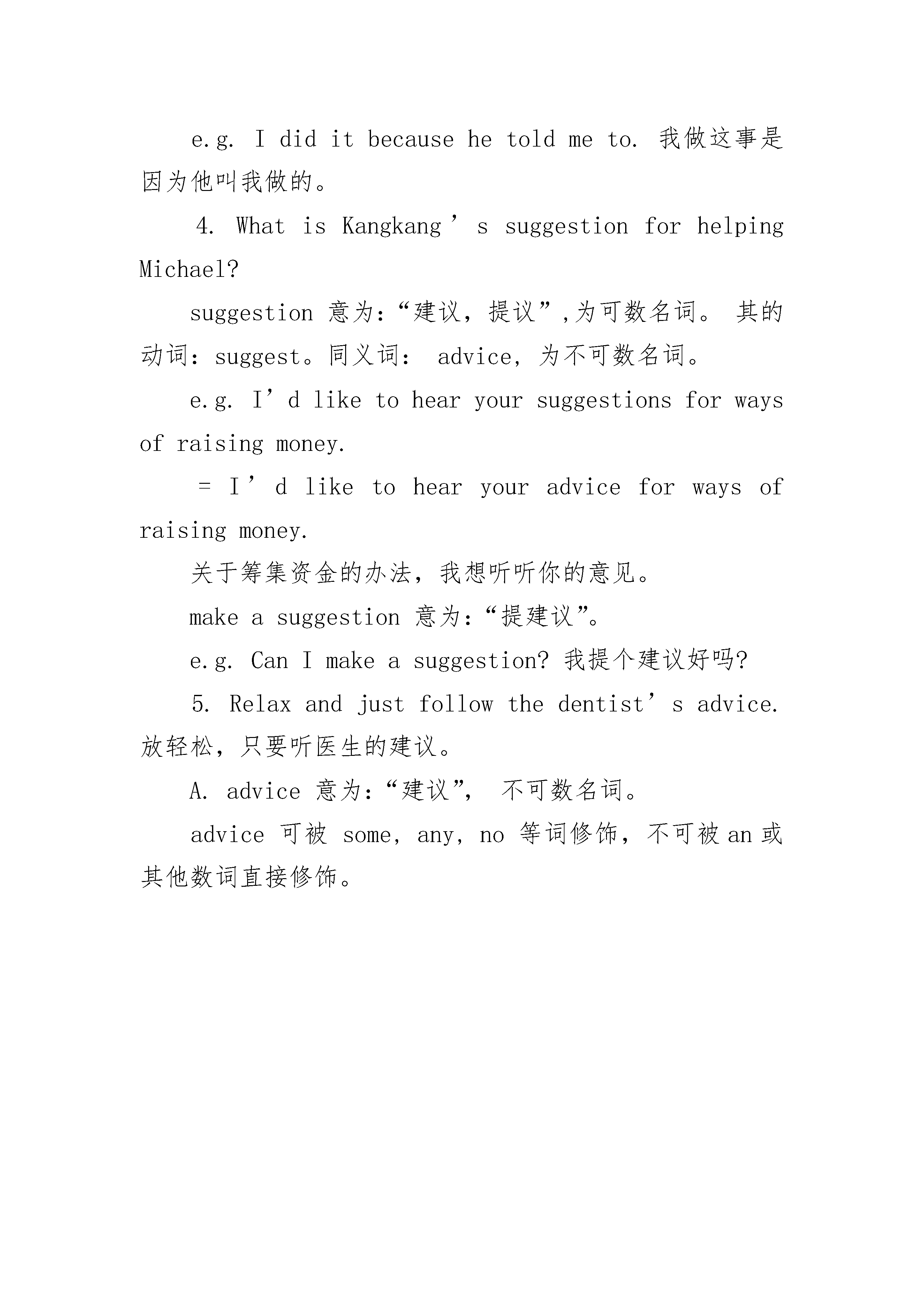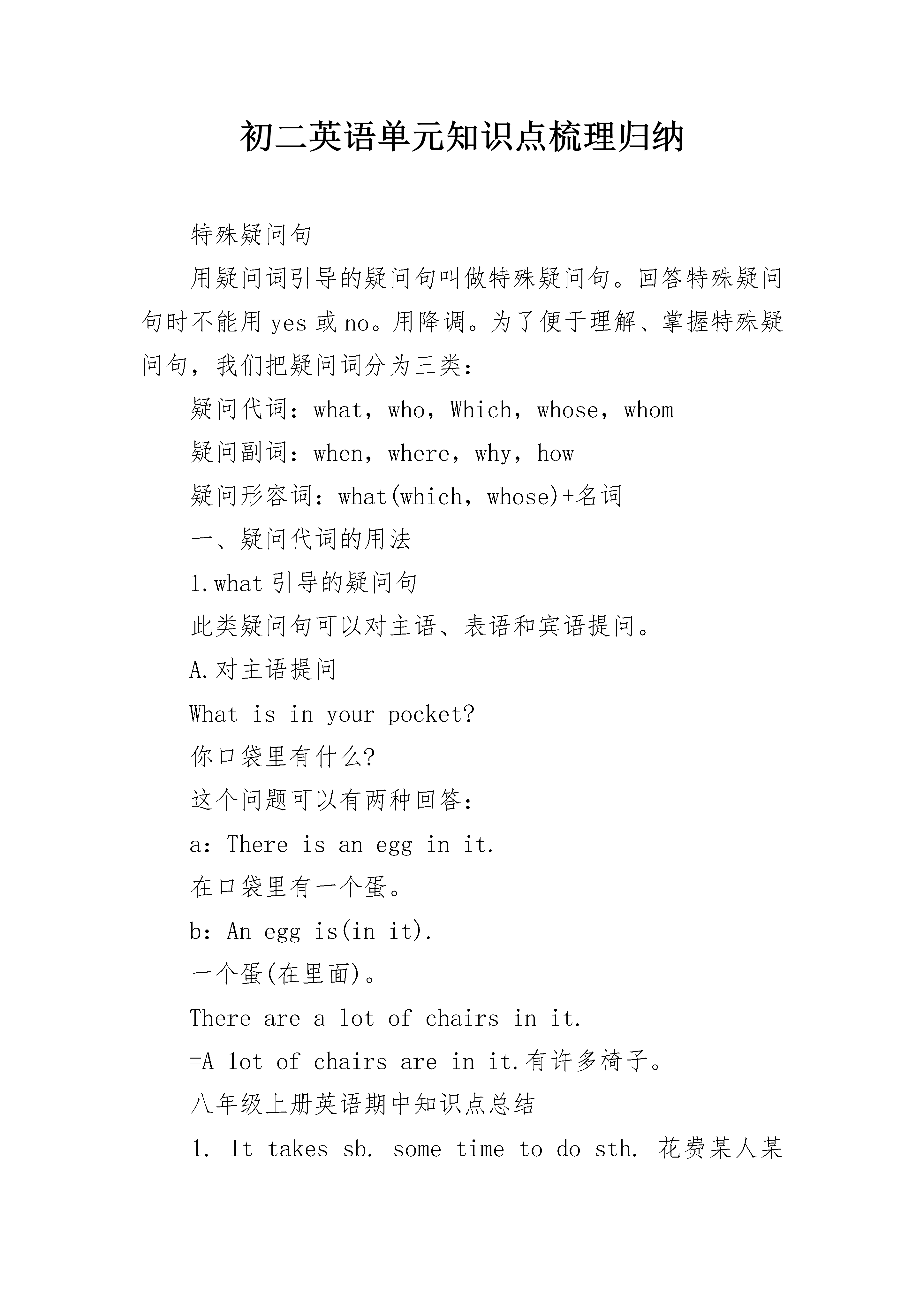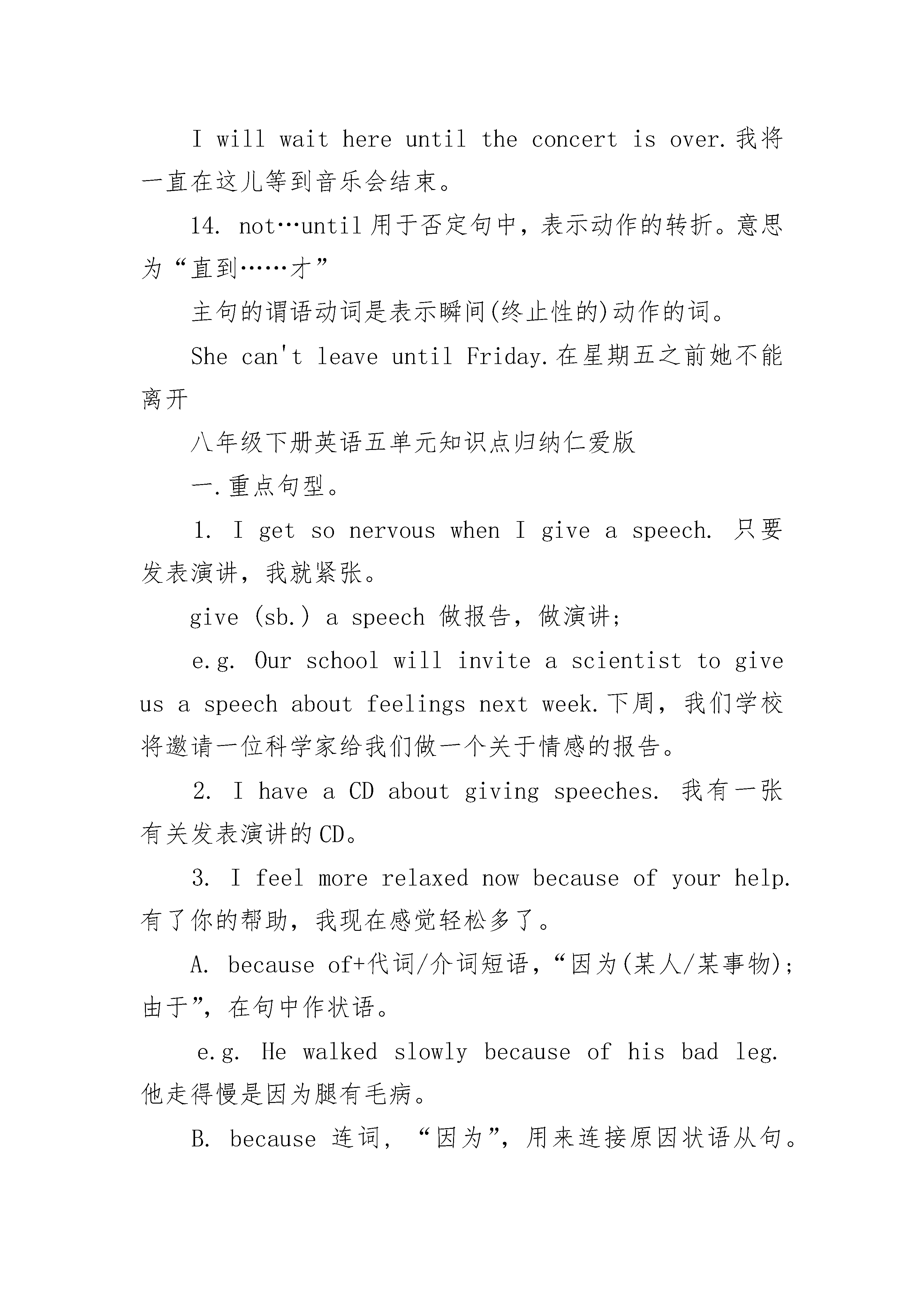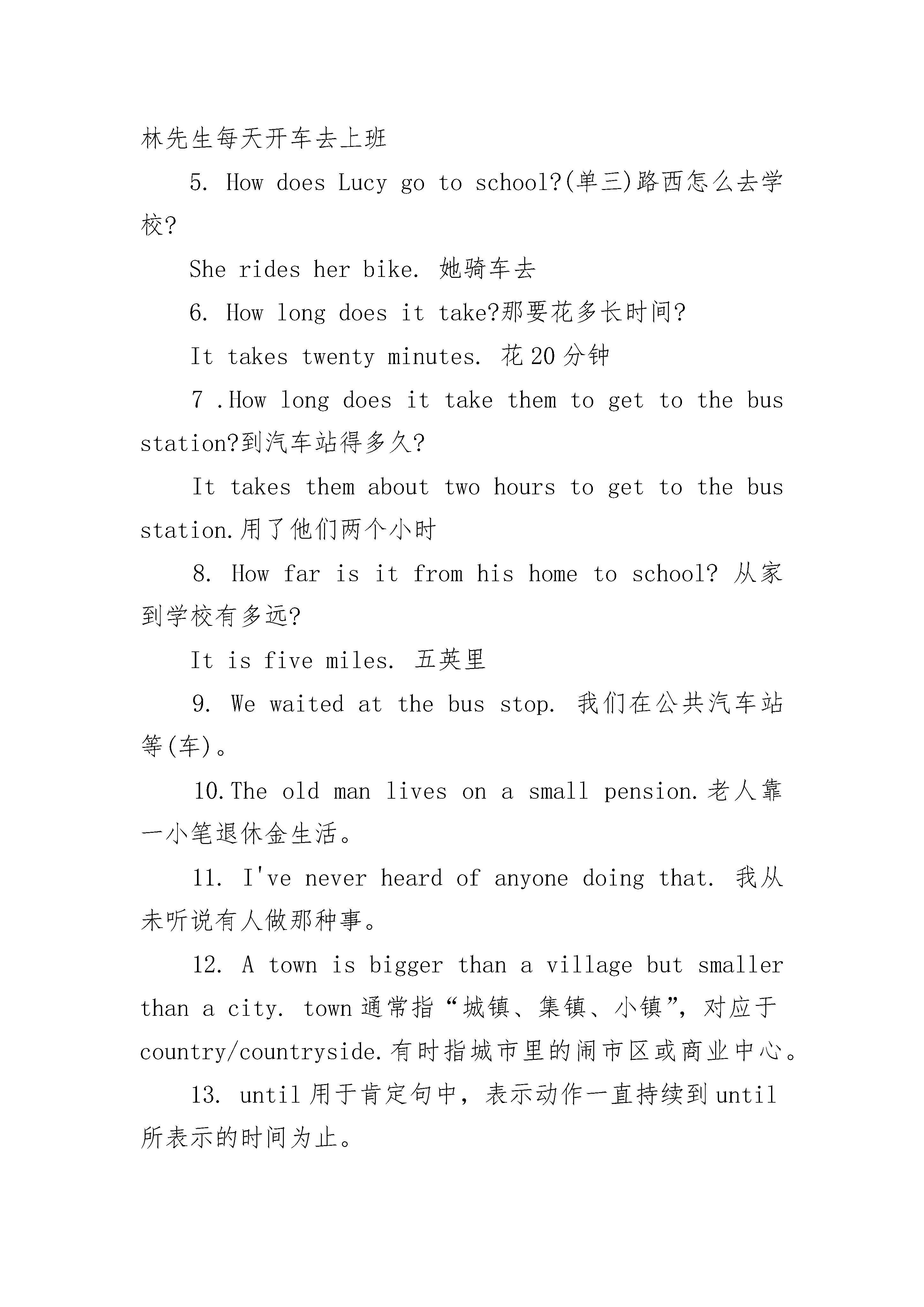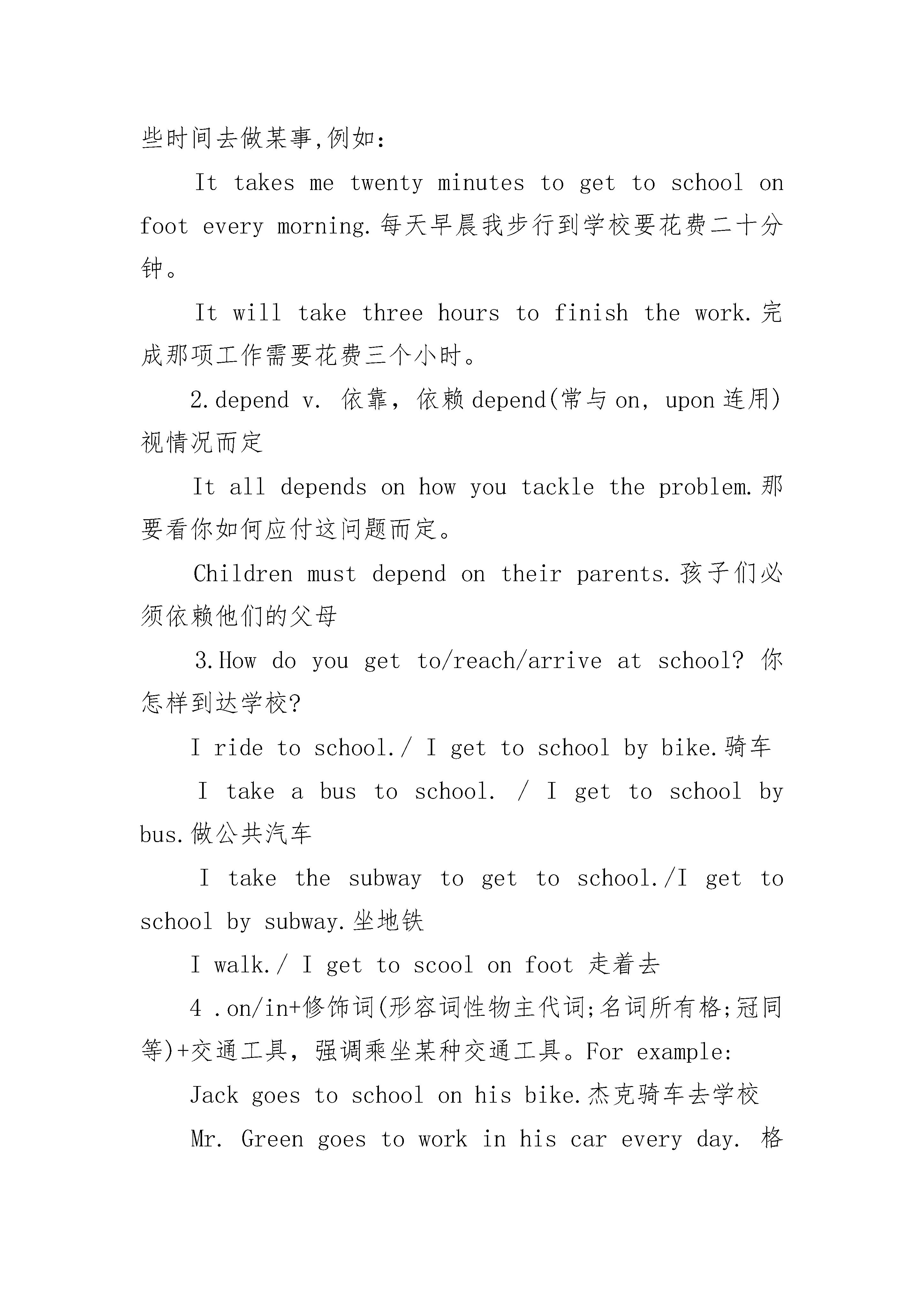 初二英语单元知识点梳理归纳特殊疑问句用疑问词引导的疑问句叫做特殊疑问句。回答特殊疑问句时不能用yes或no。用降调。为了便于理解、掌握特殊疑问句,我们把疑问词分为三类:疑问代词:what,who,Which,whose,whom疑问副词:when,where,why,how疑问形容词:what(which,whose)+名词一、疑问代词的用法1.what引导的疑问句此类疑问句可以对主语、表语和宾语提问。A.对主语提问Whatisinyourpocket?你口袋里有什么?这个问题可以有两种回答:a:Thereisanegginit.在口袋里有一个蛋。b:Aneggis(init).一个蛋(在里面)。Therearealotofchairsinit.=A1otofchairsareinit.有许多椅子。八年级上册英语期中知识点总结1.Ittakessb.sometimetodosth.花费某人某些时间去做某事,例如:Ittakesmetwentyminutestogettoschoolonfooteverymorning.每天早晨我步行到学校要花费二十分钟。Itwilltakethreehourstofinishthework.完成那项工作需要花费三个小时。2.dependv.依靠,依赖depend(常与on,upon连用)视情况而定Italldependsonhowyoutackletheproblem.那要看你如何应付这问题而定。Childrenmustdependontheirparents.孩子们必须依赖他们的父母3.Howdoyougetto/reach/arriveatschool?你怎样到达学校?Iridetoschool./Igettoschoolbybike.骑车Itakeabustoschool./Igettoschoolbybus.做公共汽车Itakethesubwaytogettoschool./Igettoschoolbysubway.坐地铁Iwalk./Igettoscoolonfoot走着去4.on/in+修饰词(形容词性物主代词;名词所有格;冠同等)+交通工具,强调乘坐某种交通工具。Forexample:Jackgoestoschoolonhisbike.杰克骑车去学校Mr.Greengoestoworkinhiscareveryday.格林先生每天开车去上班5.HowdoesLucygotoschool?(单三)路西怎么去学校?Sheridesherbike.她骑车去6.Howlongdoesittake?那要花多长时间?Ittakestwentyminutes.花20分钟7.Howlongdoesittakethemtogettothebusstation?到汽车站得多久?Ittakesthemabouttwohourstogettothebusstation.用了他们两个小时8.Howfarisitfromhishometoschool?从家到学校有多远?Itisfivemiles.五英里9.Wewaitedatthebusstop.我们在公共汽车站等(车)。10.Theoldmanlivesonasmallpension.老人靠一小笔退休金生活。11.I'veneverheardofanyonedoingthat.我从未听说有人做那种事。12.Atownisbiggerthanavillagebutsmallerthanacity.town通常指“城镇、集镇、小镇”,对应于country/countryside.有时指城市里的闹市区或商业中心。13.until用于肯定句中,表示动作一直持续到until所表示的时间为止。Iwillwaithereuntiltheconcertisover.我将一直在这儿等到音乐会结束。14.not…until用于否定句中,表示动作的转折。意思为“直到……才”主句的谓语动词是表示瞬间(终止性的)动作的词。Shecan'tleaveuntilFriday.在星期五之前她不能离开八年级下册英语五单元知识点归纳仁爱版一.重点句型。1.IgetsonervouswhenIgiveaspeech.只要发表演讲,我就紧张。give(sb.)aspeech做报告,做演讲;e.g.Ourschoolwillinviteascientisttogiveusaspeechaboutfeelingsnextweek.下周,我们学校将邀请一位科学家给我们做一个关于情感的报告。2.IhaveaCDaboutgivingspeeches.我有一张有关发表演讲的CD。3.Ifeelmorerelaxednowbecauseofyourhelp.有了你的帮助,我现在感觉轻松多了。A.bec