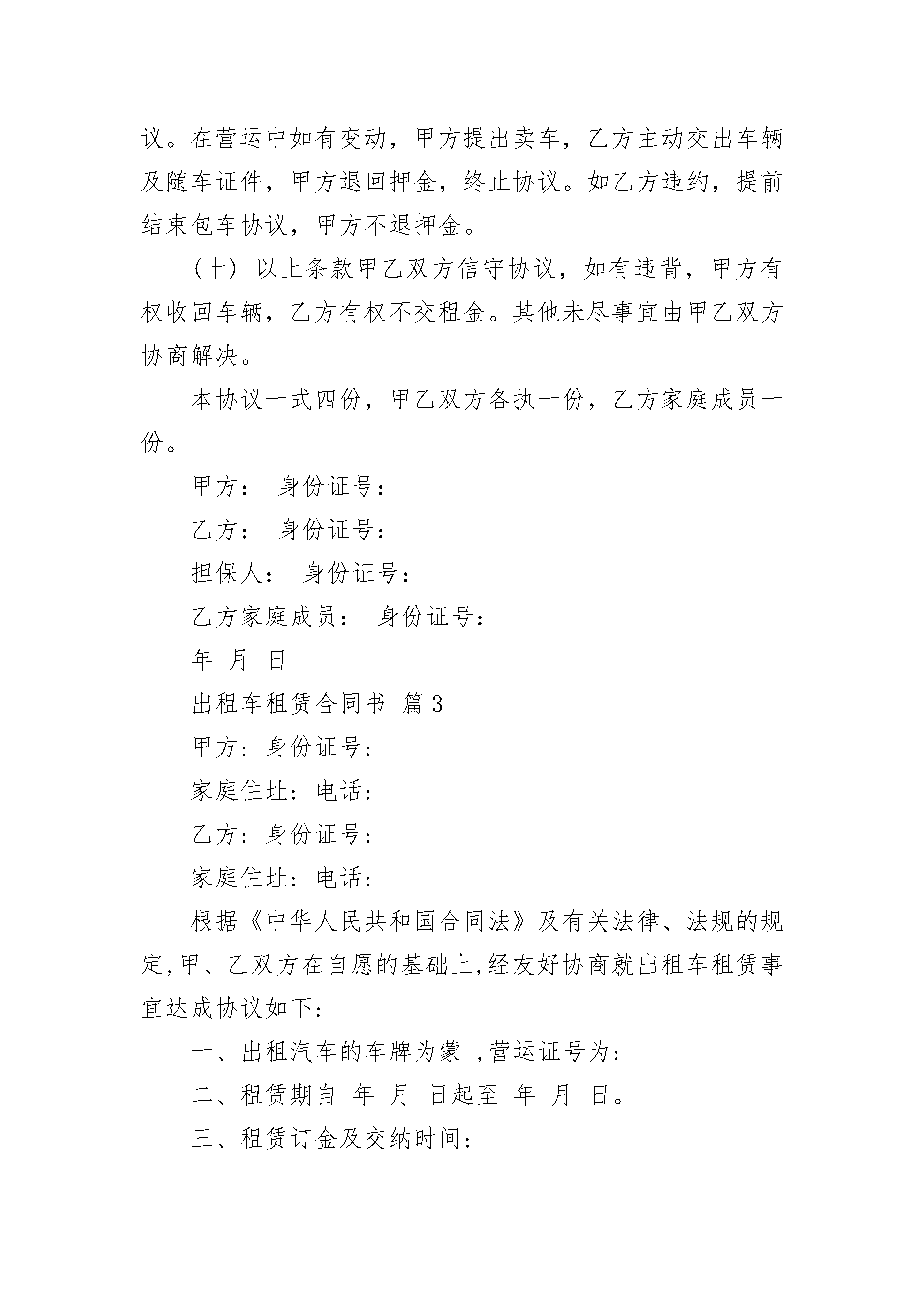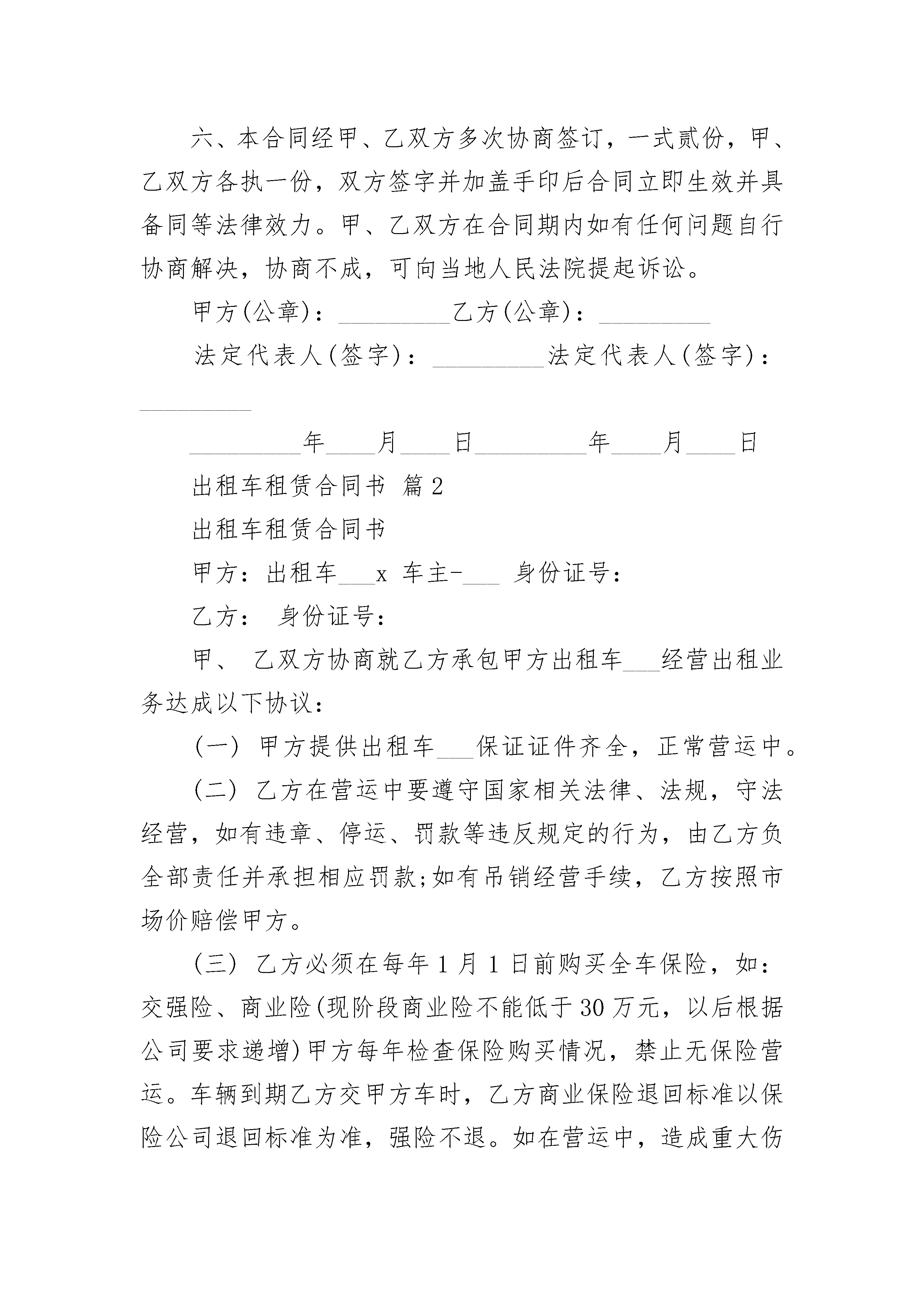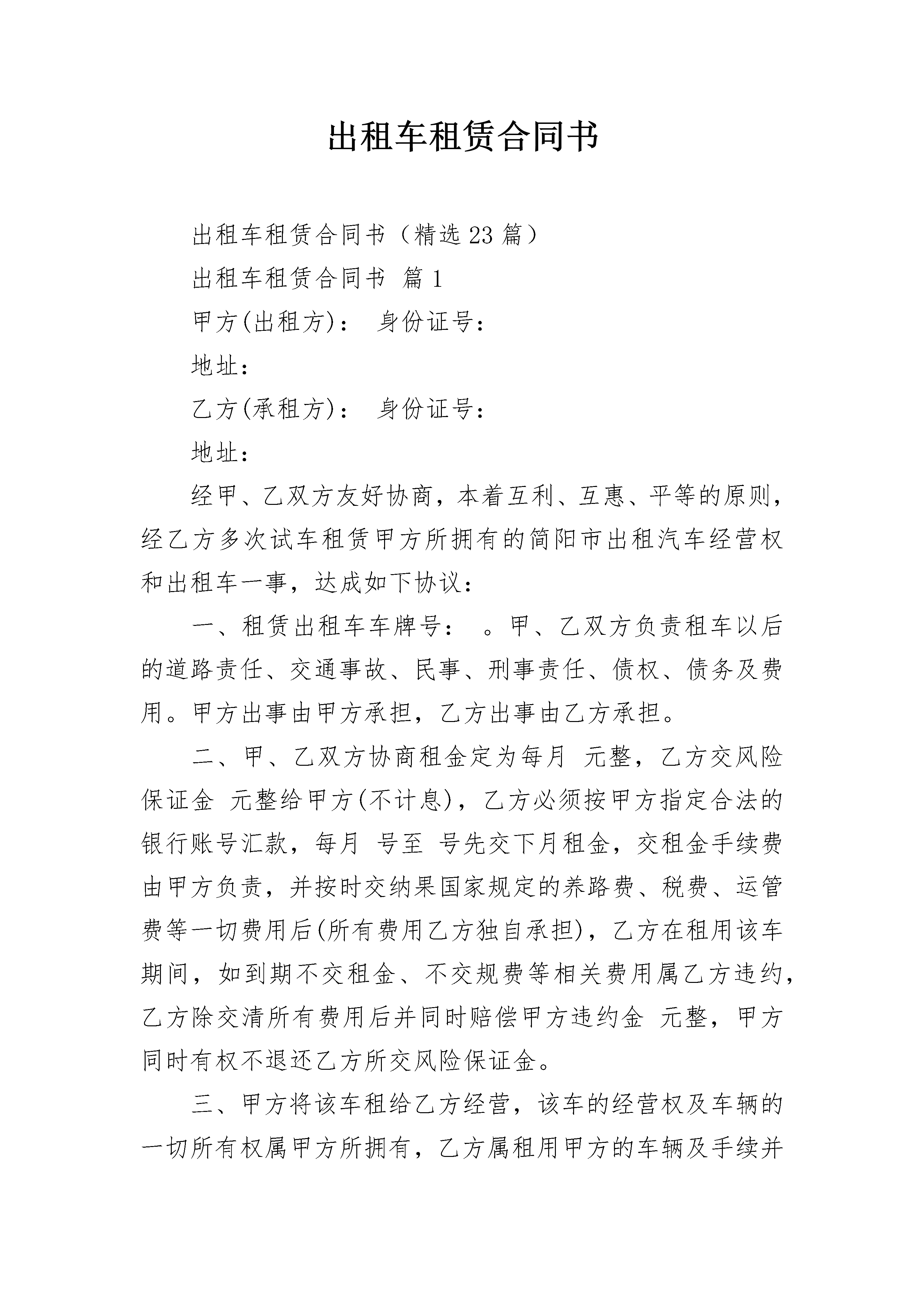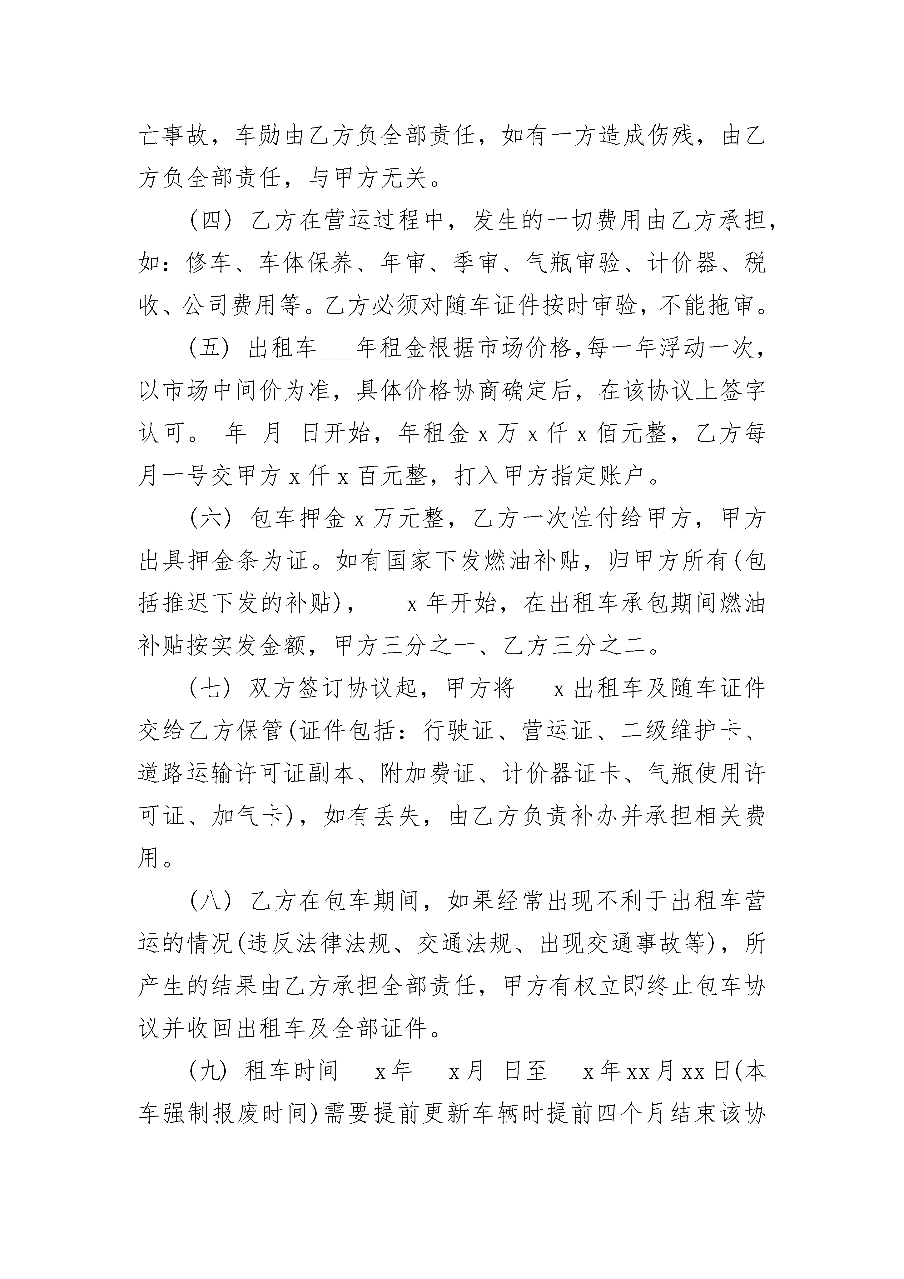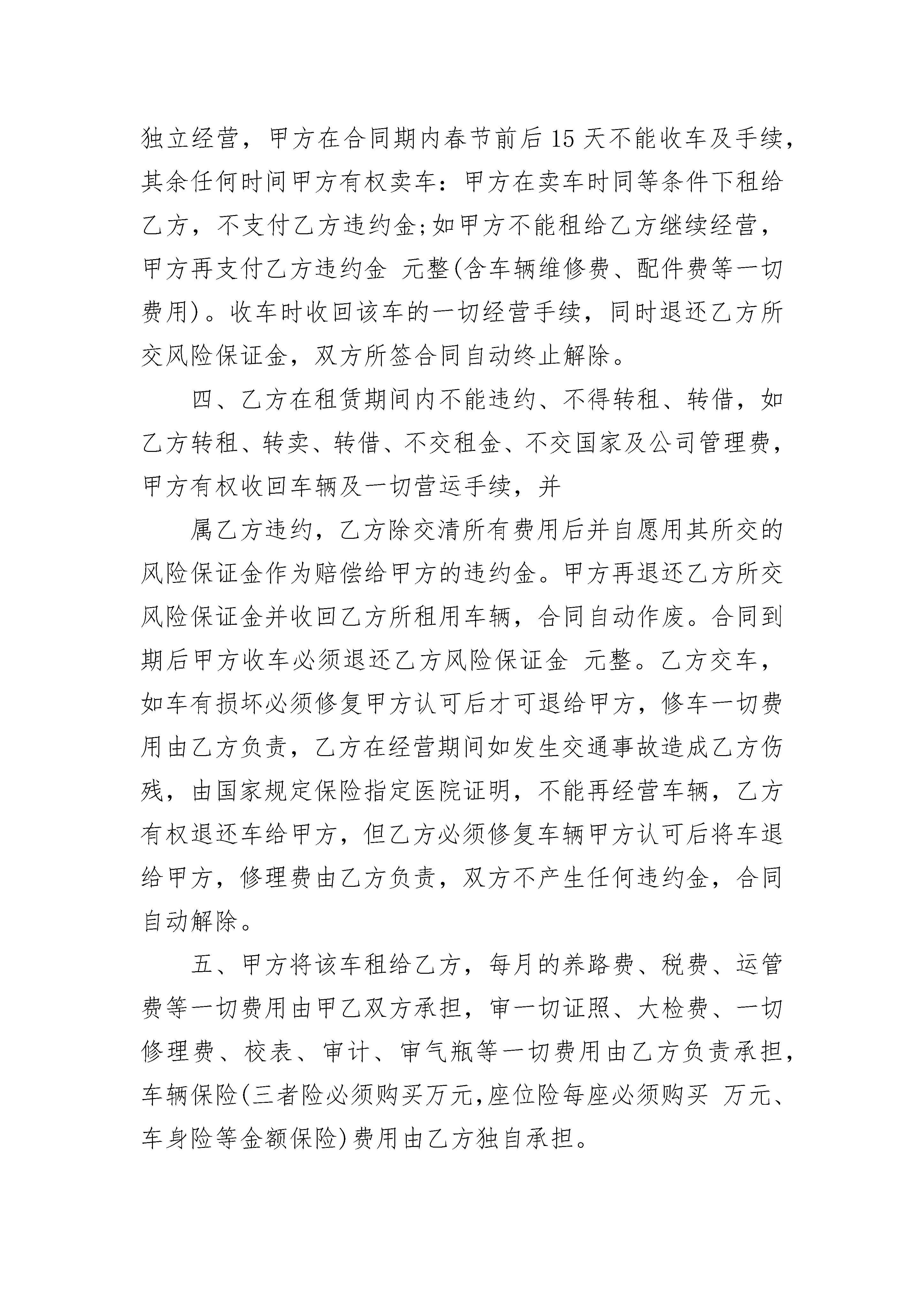 出租车租赁合同书出租车租赁合同书(精选23篇)出租车租赁合同书篇1甲方(出租方):身份证号:地址:乙方(承租方):身份证号:地址:经甲、乙双方友好协商,本着互利、互惠、平等的原则,经乙方多次试车租赁甲方所拥有的简阳市出租汽车经营权和出租车一事,达成如下协议:一、租赁出租车车牌号:。甲、乙双方负责租车以后的道路责任、交通事故、民事、刑事责任、债权、债务及费用。甲方出事由甲方承担,乙方出事由乙方承担。二、甲、乙双方协商租金定为每月元整,乙方交风险保证金元整给甲方(不计息),乙方必须按甲方指定合法的银行账号汇款,每月号至号先交下月租金,交租金手续费由甲方负责,并按时交纳果国家规定的养路费、税费、运管费等一切费用后(所有费用乙方独自承担),乙方在租用该车期间,如到期不交租金、不交规费等相关费用属乙方违约,乙方除交清所有费用后并同时赔偿甲方违约金元整,甲方同时有权不退还乙方所交风险保证金。三、甲方将该车租给乙方经营,该车的经营权及车辆的一切所有权属甲方所拥有,乙方属租用甲方的车辆及手续并独立经营,甲方在合同期内春节前后15天不能收车及手续,其余任何时间甲方有权卖车:甲方在卖车时同等条件下租给乙方,不支付乙方违约金;如甲方不能租给乙方继续经营,甲方再支付乙方违约金元整(含车辆维修费、配件费等一切费用)。收车时收回该车的一切经营手续,同时退还乙方所交风险保证金,双方所签合同自动终止解除。四、乙方在租赁期间内不能违约、不得转租、转借,如乙方转租、转卖、转借、不交租金、不交国家及公司管理费,甲方有权收回车辆及一切营运手续,并属乙方违约,乙方除交清所有费用后并自愿用其所交的风险保证金作为赔偿给甲方的违约金。甲方再退还乙方所交风险保证金并收回乙方所租用车辆,合同自动作废。合同到期后甲方收车必须退还乙方风险保证金元整。乙方交车,如车有损坏必须修复甲方认可后才可退给甲方,修车一切费用由乙方负责,乙方在经营期间如发生交通事故造成乙方伤残,由国家规定保险指定医院证明,不能再经营车辆,乙方有权退还车给甲方,但乙方必须修复车辆甲方认可后将车退给甲方,修理费由乙方负责,双方不产生任何违约金,合同自动解除。五、甲方将该车租给乙方,每月的养路费、税费、运管费等一切费用由甲乙双方承担,审一切证照、大检费、一切修理费、校表、审计、审气瓶等一切费用由乙方负责承担,车辆保险(三者险必须购买万元,座位险每座必须购买万元、车身险等金额保险)费用由乙方独自承担。六、本合同经甲、乙双方多次协商签订,一式贰份,甲、乙双方各执一份,双方签字并加盖手印后合同立即生效并具备同等法律效力。甲、乙双方在合同期内如有任何问题自行协商解决,协商不成,可向当地人民法院提起诉讼。甲方(公章):_________乙方(公章):_________法定代表人(签字):_________法定代表人(签字):__________________年____月____日_________年____月____日出租车租赁合同书篇2出租车租赁合同书甲方:出租车___x车主-___身份证号:乙方:身份证号:甲、乙双方协商就乙方承包甲方出租车___经营出租业务达成以下协议:(一)甲方提供出租车___保证证件齐全,正常营运中。(二)乙方在营运中要遵守国家相关法律、法规,守法经营,如有违章、停运、罚款等违反规定的行为,由乙方负全部责任并承担相应罚款;如有吊销经营手续,乙方按照市场价赔偿甲方。(三)乙方必须在每年1月1日前购买全车保险,如:交强险、商业险(现阶段商业险不能低于30万元,以后根据公司要求递增)甲方每年检查保险购买情况,禁止无保险营运。车辆到期乙方交甲方车时,乙方商业保险退回标准以保险公司退回标准为准,强险不退。如在营运中,造成重大伤亡事故,车勋由乙方负全部责任,如有一方造成伤残,由乙方负全部责任,与甲方无关。(四)乙方在营运过程中,发生的一切费用由乙方承担,如:修车、车体保养、年审、季审、气瓶审验、计价器、税收、公司费用等。乙方必须对随车证件按时审验,不能拖审。(五)出租车___年租金根据市场价格,每一年浮动一次,以市场中间价为准,具体价格协商确定后,在该协议上签字认可。年月日开始,年租金x万x仟x佰元整,乙方每月一号交甲方x仟x百元整,打入甲方指定账户。(六)包车押金x万元整,乙方一次性付给甲方,甲方出具押金条为证。如有国家下发燃油补贴,归甲方所有(包括推迟下发的补贴),___x年开始,在出租车承包期间燃油补贴按实发金额,甲方三分之一、乙方三分之二。(七)双方签订协议起,甲方将___x出租车及随车证件交给乙方保管(证件包括:行驶证、营运证、二级维护卡、道路运输许可证副本、附加费证、计价器证卡、气瓶使用许可证、加气卡),如有丢失,由乙方负责补办并承担相关费用。(八)乙方在包车期间,如果经常出现不利于出租车营运的