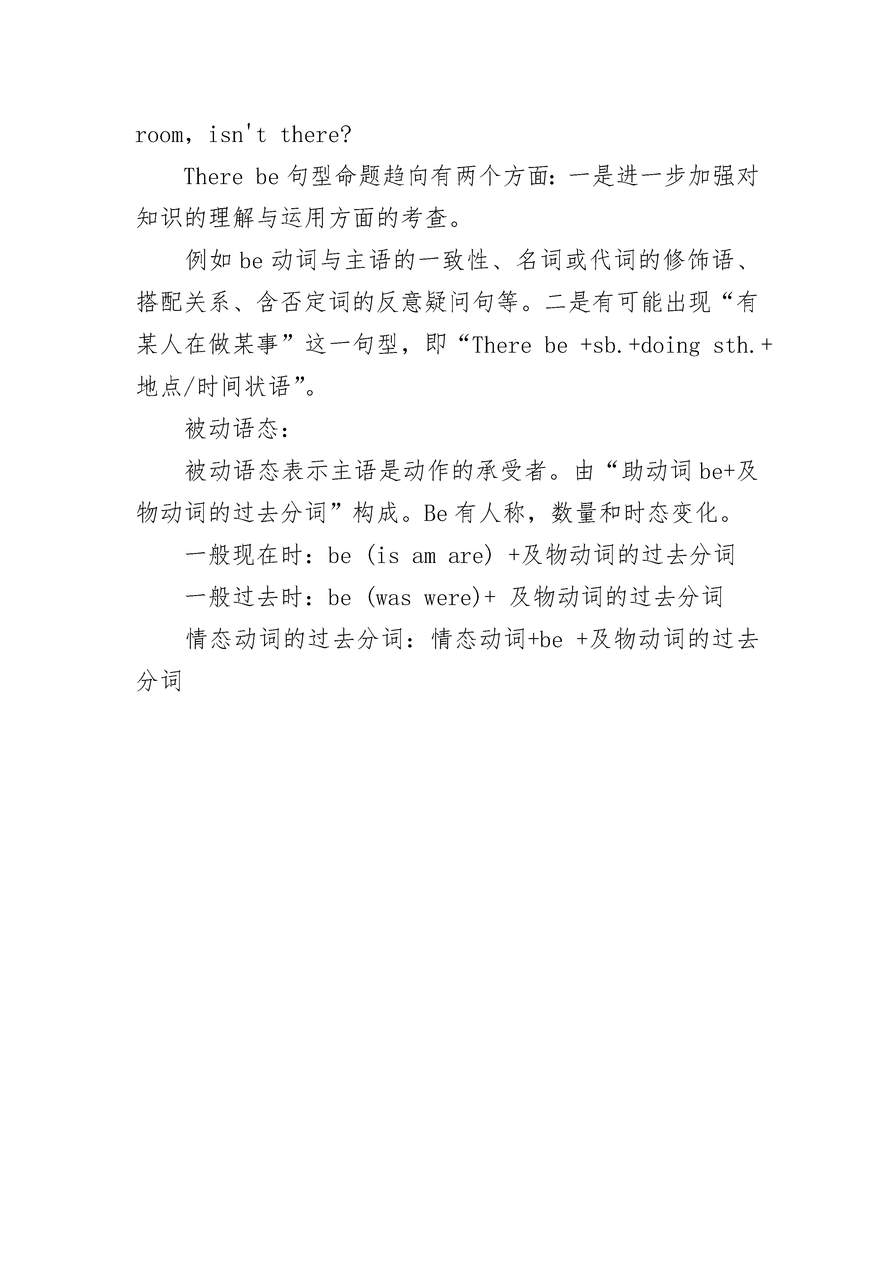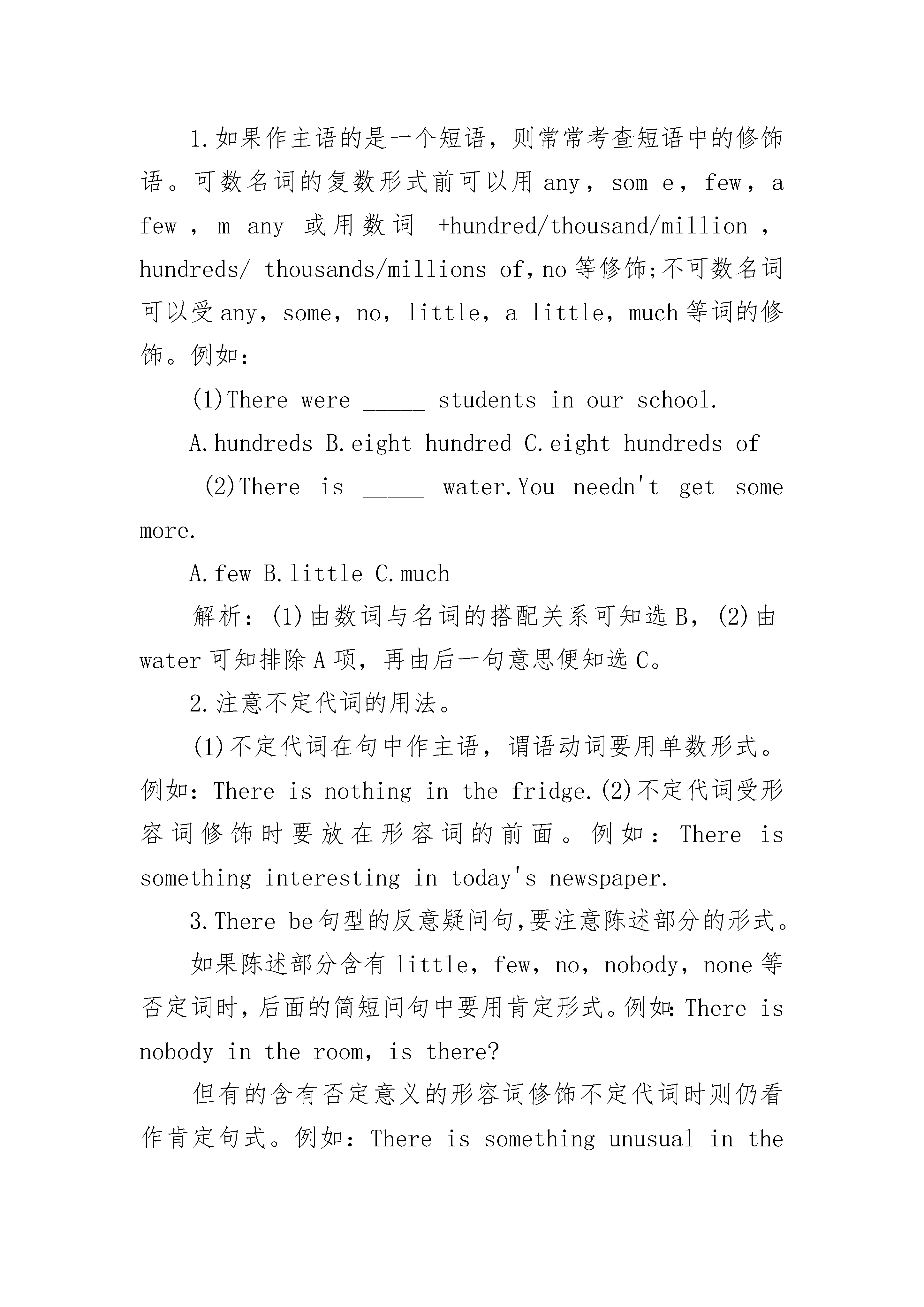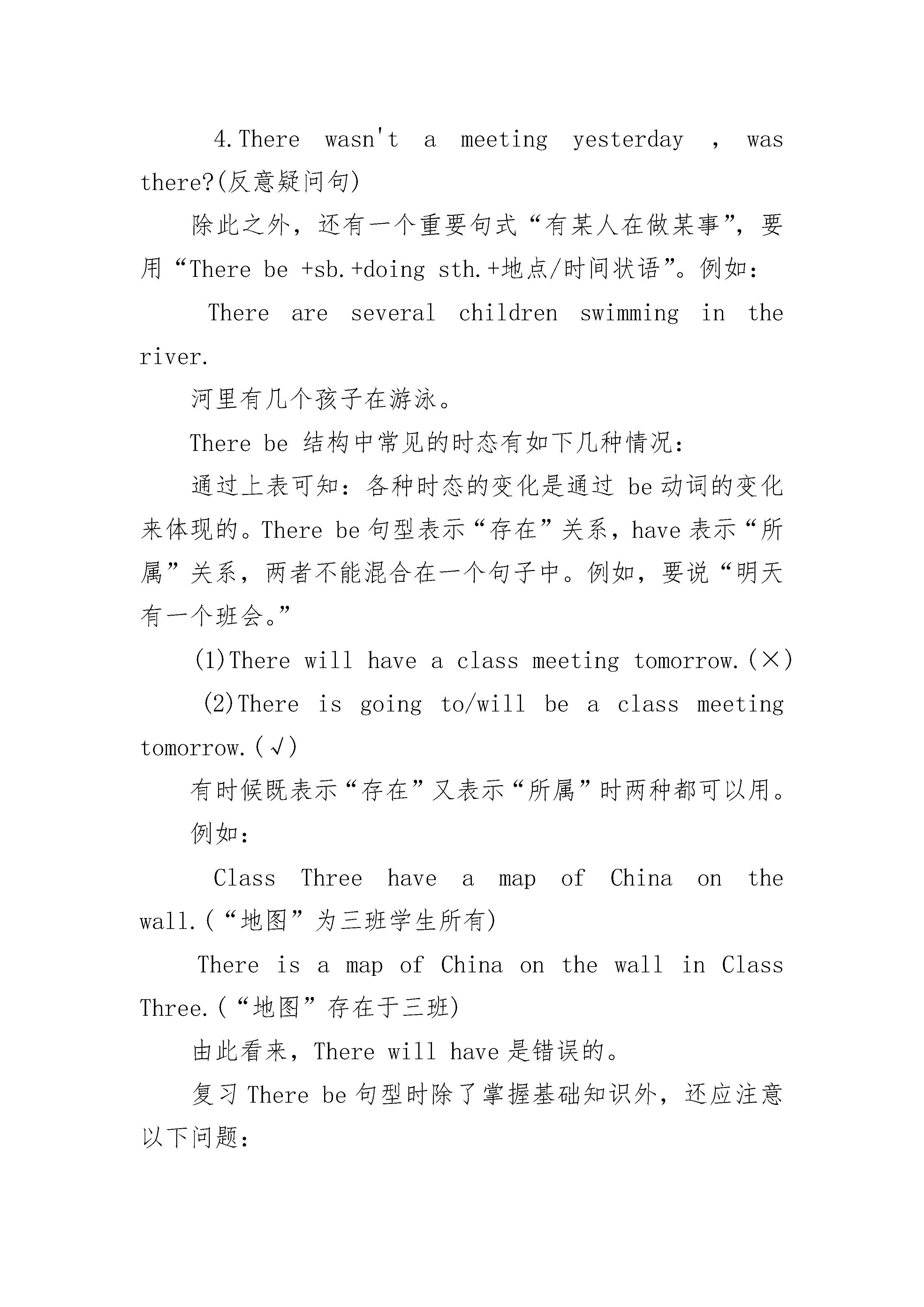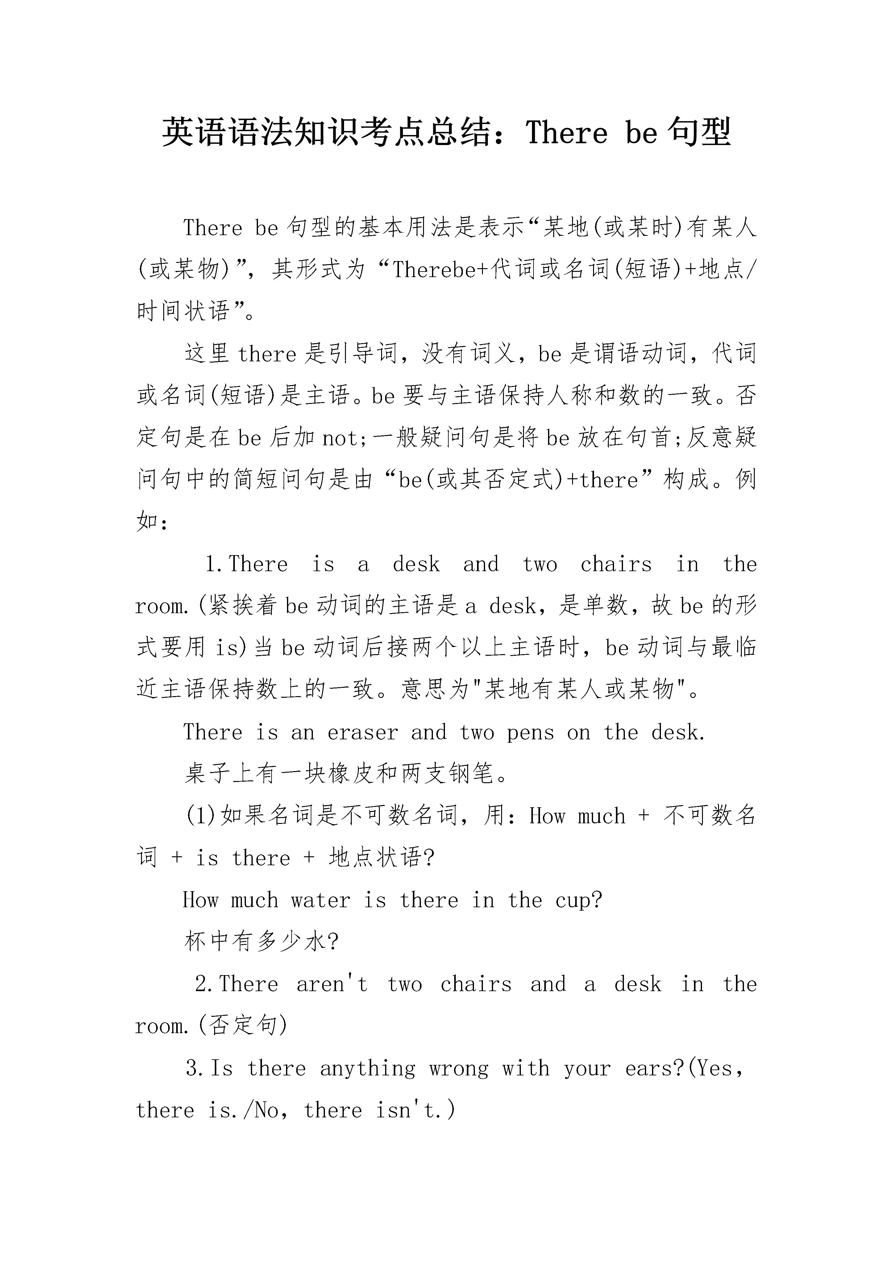 英语语法知识考点总结:Therebe句型Therebe句型的基本用法是表示“某地(或某时)有某人(或某物)”,其形式为“Therebe+代词或名词(短语)+地点/时间状语”。这里there是引导词,没有词义,be是谓语动词,代词或名词(短语)是主语。be要与主语保持人称和数的一致。否定句是在be后加not;一般疑问句是将be放在句首;反意疑问句中的简短问句是由“be(或其否定式)+there”构成。例如:1.Thereisadeskandtwochairsintheroom.(紧挨着be动词的主语是adesk,是单数,故be的形式要用is)当be动词后接两个以上主语时,be动词与最临近主语保持数上的一致。意思为"某地有某人或某物"。Thereisaneraserandtwopensonthedesk.桌子上有一块橡皮和两支钢笔。(1)如果名词是不可数名词,用:Howmuch+不可数名词+isthere+地点状语?Howmuchwateristhereinthecup?杯中有多少水?2.Therearen'ttwochairsandadeskintheroom.(否定句)3.Isthereanythingwrongwithyourears?(Yes,thereis./No,thereisn't.)4.Therewasn'tameetingyesterday,wasthere?(反意疑问句)除此之外,还有一个重要句式“有某人在做某事”,要用“Therebe+sb.+doingsth.+地点/时间状语”。例如:Thereareseveralchildrenswimmingintheriver.河里有几个孩子在游泳。Therebe结构中常见的时态有如下几种情况:通过上表可知:各种时态的变化是通过be动词的变化来体现的。Therebe句型表示“存在”关系,have表示“所属”关系,两者不能混合在一个句子中。例如,要说“明天有一个班会。”(1)Therewillhaveaclassmeetingtomorrow.(×)(2)Thereisgoingto/willbeaclassmeetingtomorrow.(√)有时候既表示“存在”又表示“所属”时两种都可以用。例如:ClassThreehaveamapofChinaonthewall.(“地图”为三班学生所有)ThereisamapofChinaonthewallinClassThree.(“地图”存在于三班)由此看来,Therewillhave是错误的。复习Therebe句型时除了掌握基础知识外,还应注意以下问题:1.如果作主语的是一个短语,则常常考查短语中的修饰语。可数名词的复数形式前可以用any,some,few,afew,many或用数词+hundred/thousand/million,hundreds/thousands/millionsof,no等修饰;不可数名词可以受any,some,no,little,alittle,much等词的修饰。例如:(1)Therewere_____studentsinourschool.A.hundredsB.eighthundredC.eighthundredsof(2)Thereis_____water.Youneedn'tgetsomemore.A.fewB.littleC.much解析:(1)由数词与名词的搭配关系可知选B,(2)由water可知排除A项,再由后一句意思便知选C。2.注意不定代词的用法。(1)不定代词在句中作主语,谓语动词要用单数形式。例如:Thereisnothinginthefridge.(2)不定代词受形容词修饰时要放在形容词的前面。例如:Thereissomethinginterestingintoday'snewspaper.3.Therebe句型的反意疑问句,要注意陈述部分的形式。如果陈述部分含有little,few,no,nobody,none等否定词时,后面的简短问句中要用肯定形式。例如:Thereisnobodyintheroom,isthere?但有的含有否定意义的形容词修饰不定代词时则仍看作肯定句式。例如:Thereissomethingunusualintheroom,isn'tthere?Therebe句型命题趋向有两个方面:一是进一步加强对知识的理解与运用方面的考查。例如be动词与主语的一致性、名词或代词的修饰语、搭配关系、含否定词的反意疑问句等。二是有可能出现“有某人在做某事”这一句型,即“Therebe+sb.+doingsth.+地点/时间状语”。被动语态:被动语态表示主语是动作的承受者。由“助动词be+及物动词的过去分词”构成。Be有人称,数量和时态变化。一般现在时:be(i