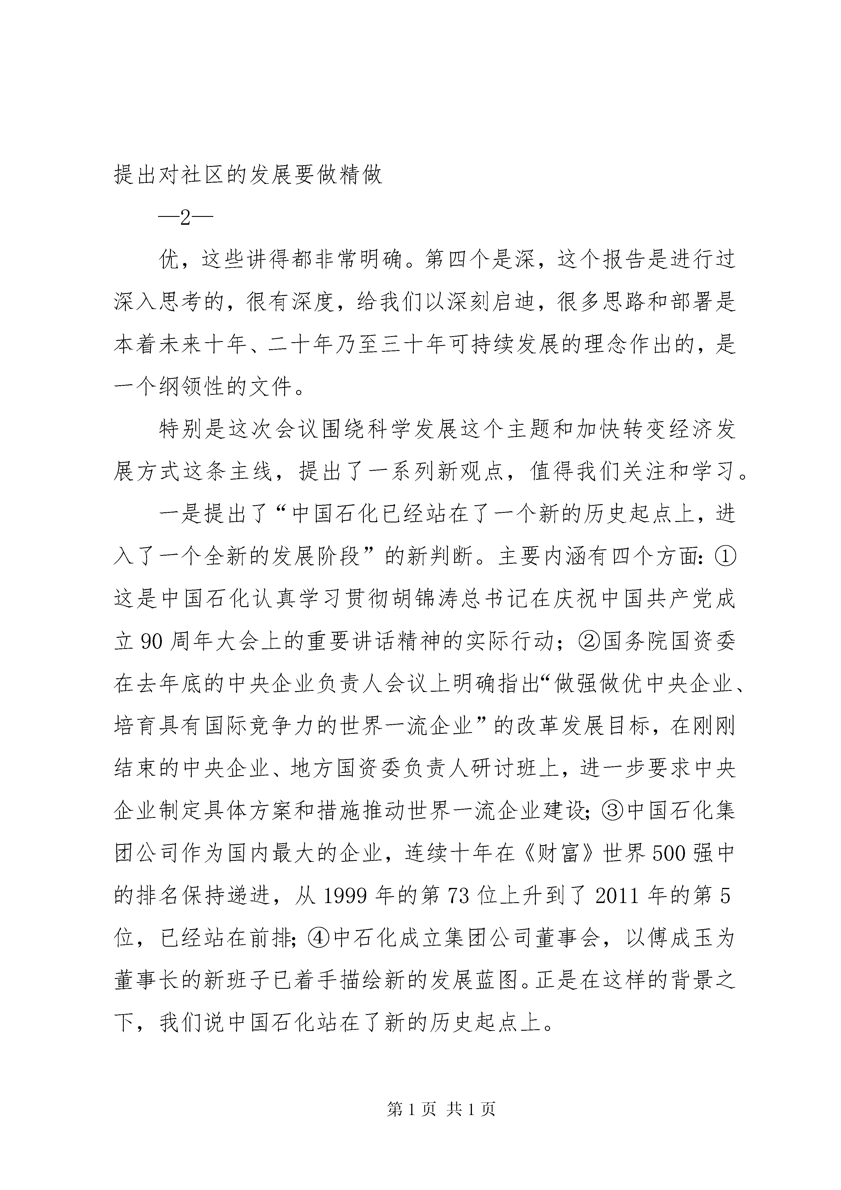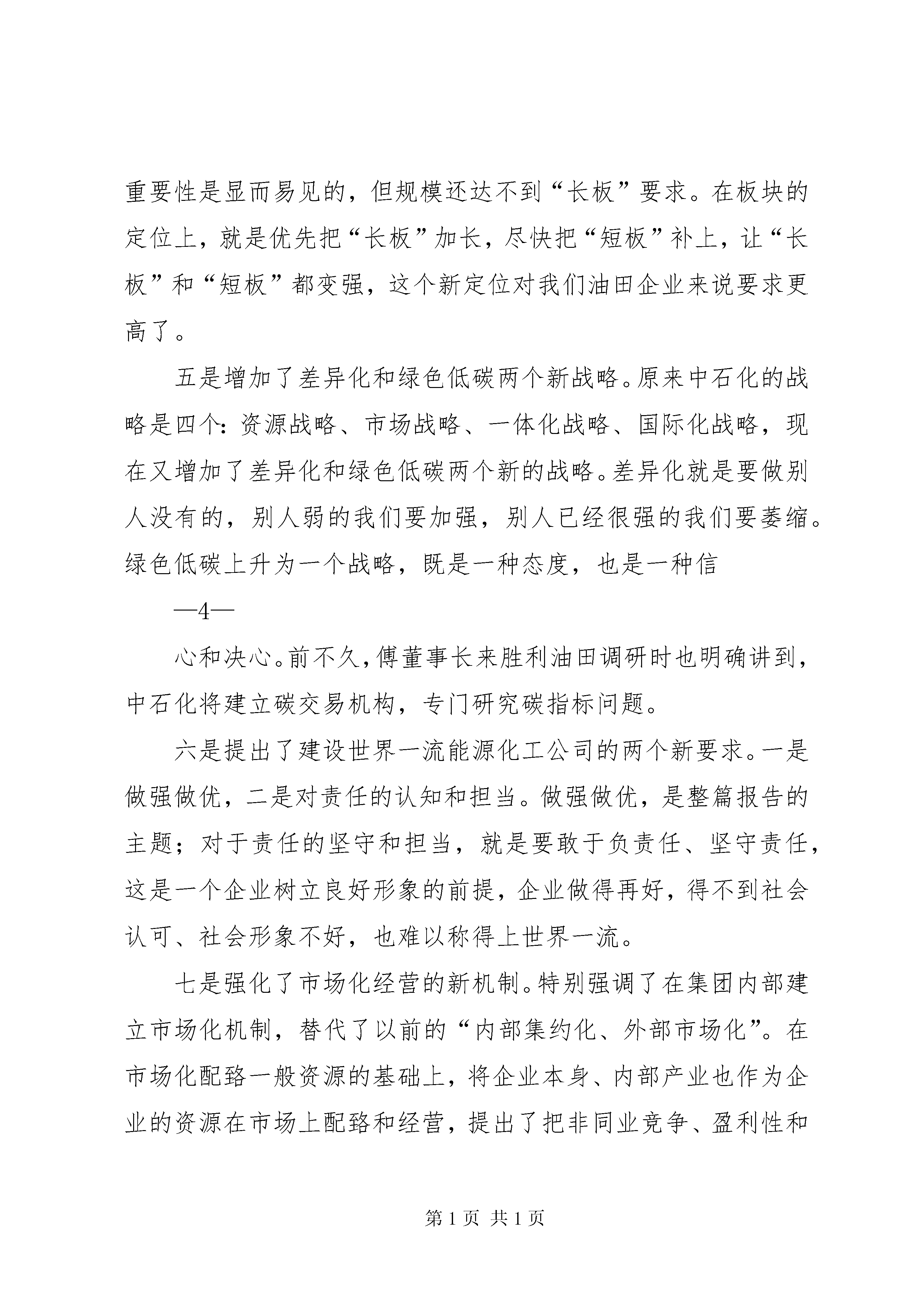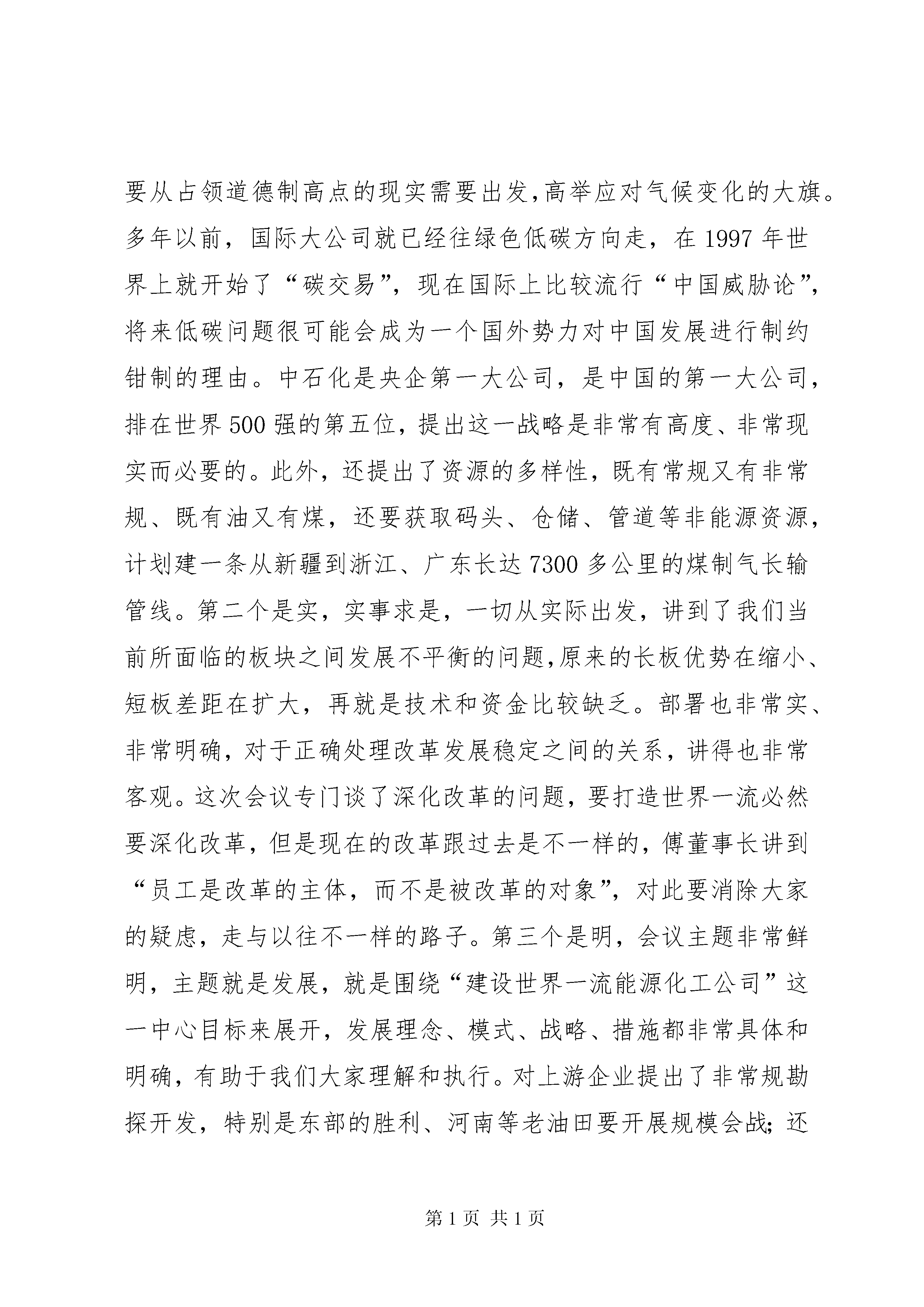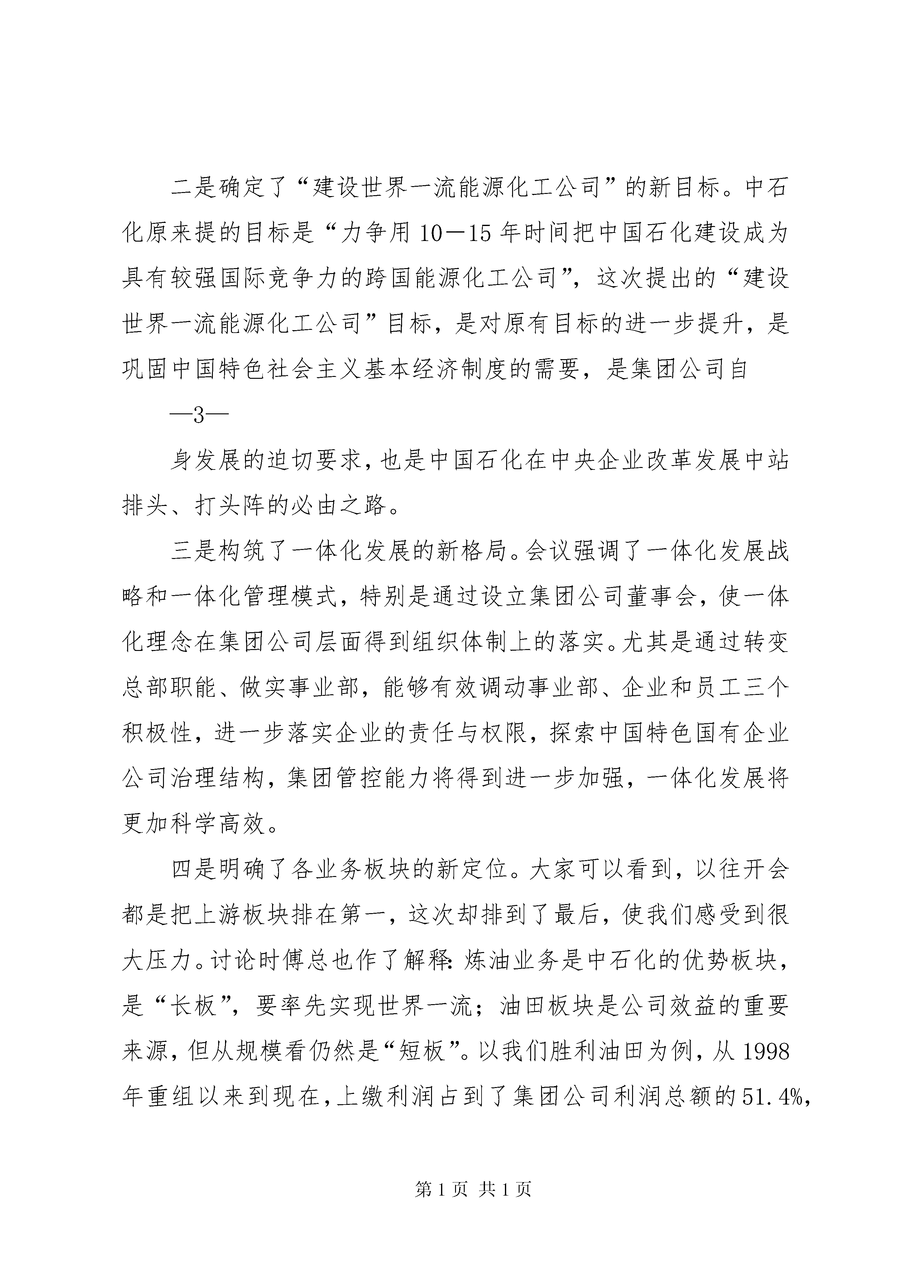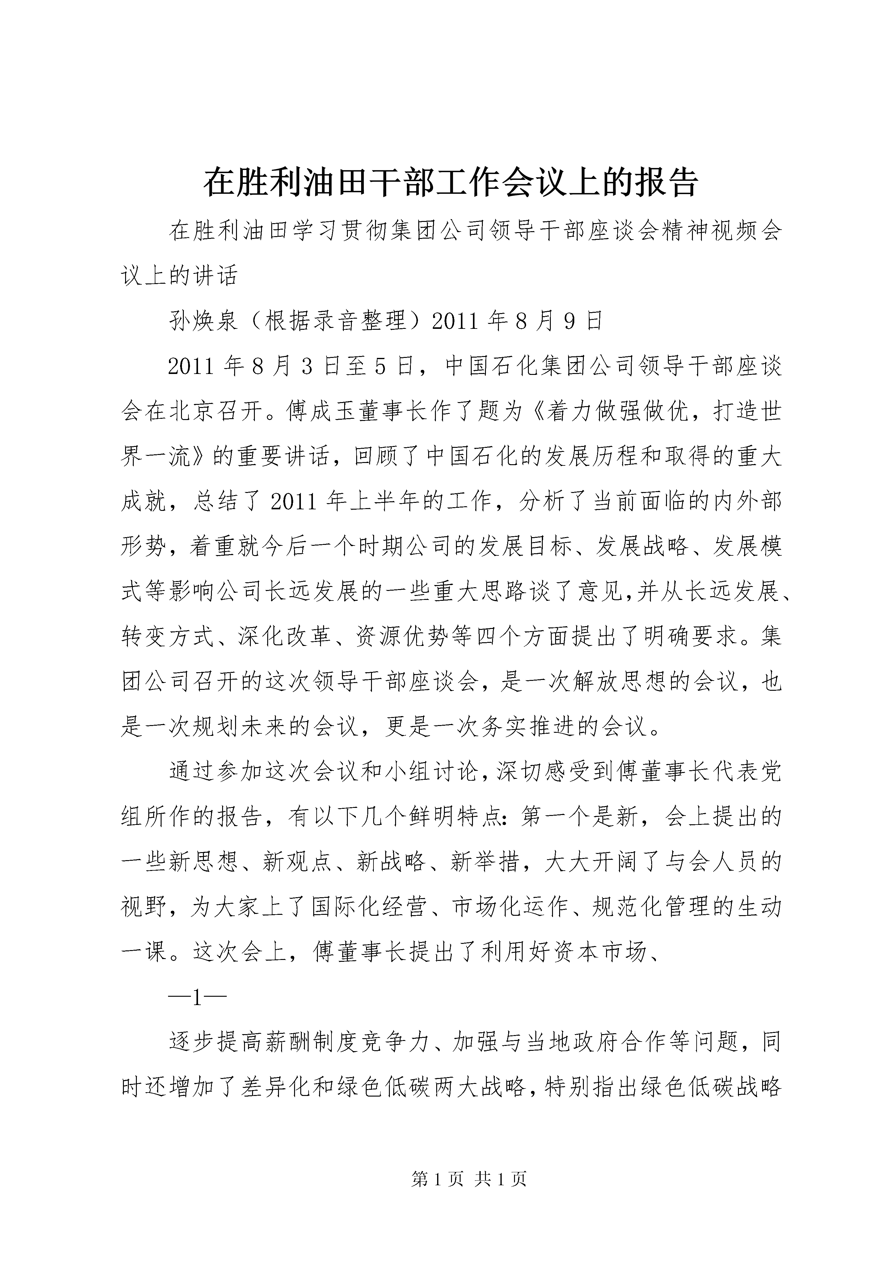 在胜利油田干部工作会议上的报告在胜利油田学习贯彻集团公司领导干部座谈会精神视频会议上的讲话孙焕泉(根据录音整理)2011年8月9日2011年8月3日至5日,中国石化集团公司领导干部座谈会在北京召开。傅成玉董事长作了题为《着力做强做优,打造世界一流》的重要讲话,回顾了中国石化的发展历程和取得的重大成就,总结了2011年上半年的工作,分析了当前面临的内外部形势,着重就今后一个时期公司的发展目标、发展战略、发展模式等影响公司长远发展的一些重大思路谈了意见,并从长远发展、转变方式、深化改革、资源优势等四个方面提出了明确要求。集团公司召开的这次领导干部座谈会,是一次解放思想的会议,也是一次规划未来的会议,更是一次务实推进的会议。通过参加这次会议和小组讨论,深切感受到傅董事长代表党组所作的报告,有以下几个鲜明特点:第一个是新,会上提出的一些新思想、新观点、新战略、新举措,大大开阔了与会人员的视野,为大家上了国际化经营、市场化运作、规范化管理的生动一课。这次会上,傅董事长提出了利用好资本市场、—1—逐步提高薪酬制度竞争力、加强与当地政府合作等问题,同时还增加了差异化和绿色低碳两大战略,特别指出绿色低碳战略要从占领道德制高点的现实需要出发,高举应对气候变化的大旗。多年以前,国际大公司就已经往绿色低碳方向走,在1997年世界上就开始了“碳交易”,现在国际上比较流行“中国威胁论”,将来低碳问题很可能会成为一个国外势力对中国发展进行制约钳制的理由。中石化是央企第一大公司,是中国的第一大公司,排在世界500强的第五位,提出这一战略是非常有高度、非常现实而必要的。此外,还提出了资源的多样性,既有常规又有非常规、既有油又有煤,还要获取码头、仓储、管道等非能源资源,计划建一条从新疆到浙江、广东长达7300多公里的煤制气长输管线。第二个是实,实事求是,一切从实际出发,讲到了我们当前所面临的板块之间发展不平衡的问题,原来的长板优势在缩小、短板差距在扩大,再就是技术和资金比较缺乏。部署也非常实、非常明确,对于正确处理改革发展稳定之间的关系,讲得也非常客观。这次会议专门谈了深化改革的问题,要打造世界一流必然要深化改革,但是现在的改革跟过去是不一样的,傅董事长讲到“员工是改革的主体,而不是被改革的对象”,对此要消除大家的疑虑,走与以往不一样的路子。第三个是明,会议主题非常鲜明,主题就是发展,就是围绕“建设世界一流能源化工公司”这一中心目标来展开,发展理念、模式、战略、措施都非常具体和明确,有助于我们大家理解和执行。对上游企业提出了非常规勘探开发,特别是东部的胜利、河南等老油田要开展规模会战;还提出对社区的发展要做精做—2—优,这些讲得都非常明确。第四个是深,这个报告是进行过深入思考的,很有深度,给我们以深刻启迪,很多思路和部署是本着未来十年、二十年乃至三十年可持续发展的理念作出的,是一个纲领性的文件。特别是这次会议围绕科学发展这个主题和加快转变经济发展方式这条主线,提出了一系列新观点,值得我们关注和学习。一是提出了“中国石化已经站在了一个新的历史起点上,进入了一个全新的发展阶段”的新判断。主要内涵有四个方面:①这是中国石化认真学习贯彻胡锦涛总书记在庆祝中国共产党成立90周年大会上的重要讲话精神的实际行动;②国务院国资委在去年底的中央企业负责人会议上明确指出“做强做优中央企业、培育具有国际竞争力的世界一流企业”的改革发展目标,在刚刚结束的中央企业、地方国资委负责人研讨班上,进一步要求中央企业制定具体方案和措施推动世界一流企业建设;③中国石化集团公司作为国内最大的企业,连续十年在《财富》世界500强中的排名保持递进,从1999年的第73位上升到了2011年的第5位,已经站在前排;④中石化成立集团公司董事会,以傅成玉为董事长的新班子已着手描绘新的发展蓝图。正是在这样的背景之下,我们说中国石化站在了新的历史起点上。二是确定了“建设世界一流能源化工公司”的新目标。中石化原来提的目标是“力争用10-15年时间把中国石化建设成为具有较强国际竞争力的跨国能源化工公司”,这次提出的“建设世界一流能源化工公司”目标,是对原有目标的进一步提升,是巩固中国特色社会主义基本经济制度的需要,是集团公司自—3—身发展的迫切要求,也是中国石化在中央企业改革发展中站排头、打头阵的必由之路。三是构筑了一体化发展的新格局。会议强调了一体化发展战略和一体化管理模式,特别是通过设立集团公司董事会,使一体化理念在集团公司层面得到组织体制上的落实。尤其是通过转变总部职能、做实事业部,能够有效调动事业部、企业和员工三个积极性,进一步落实企业的责任与权限,探索中国特色国有企业公司治理结构,集团管控能力将得到进一步加强,一体化发展将更加科学高效。四是明确了各业务板块的新定位。大家可以看到,以