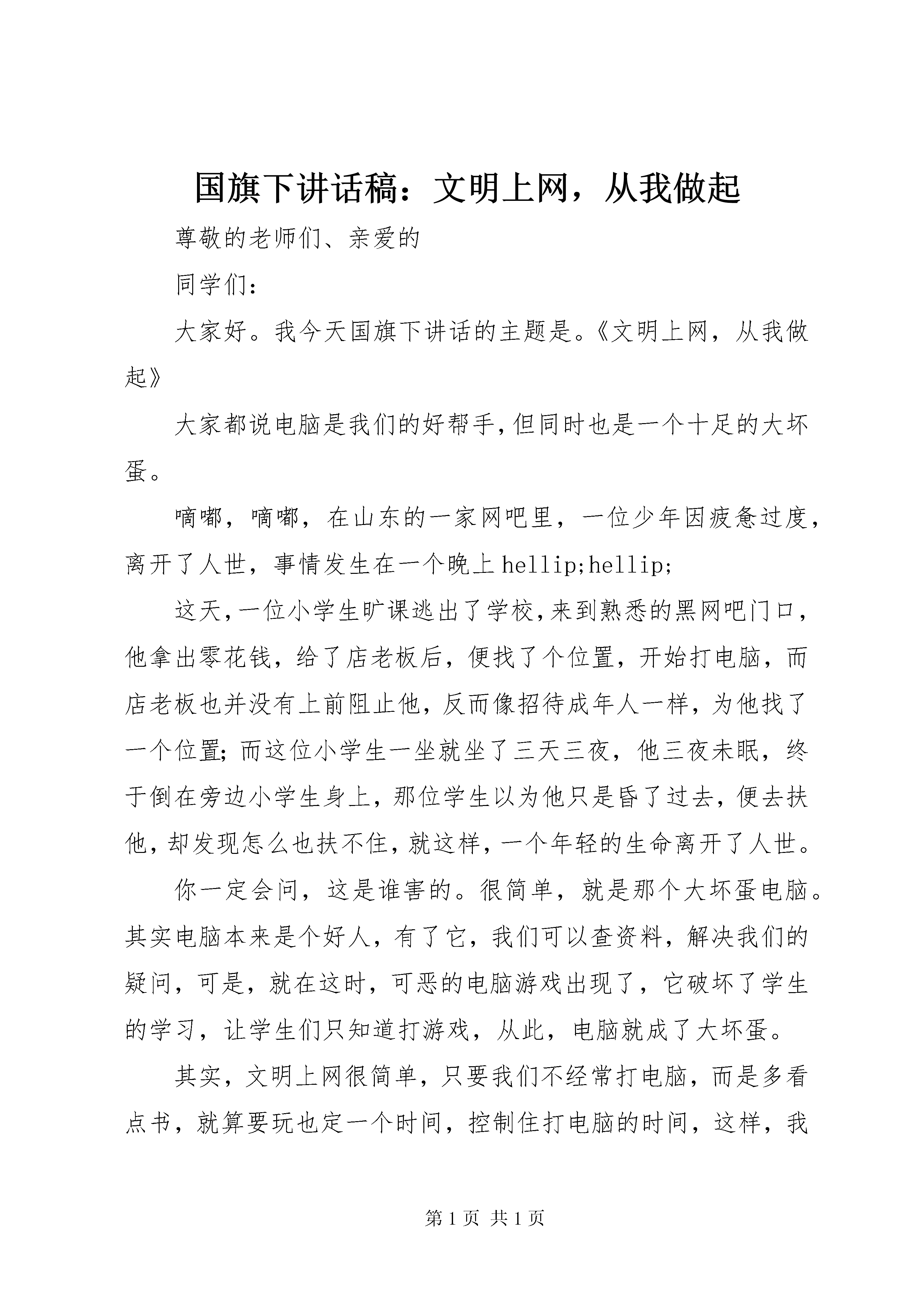国旗下讲话稿:文明上网,从我做起尊敬的老师们、亲爱的同学们:大家好。我今天国旗下讲话的主题是。《文明上网,从我做起》大家都说电脑是我们的好帮手,但同时也是一个十足的大坏蛋。嘀嘟,嘀嘟,在山东的一家网吧里,一位少年因疲惫过度,离开了人世,事情发生在一个晚上hellip;hellip;这天,一位小学生旷课逃出了学校,来到熟悉的黑网吧门口,他拿出零花钱,给了店老板后,便找了个位置,开始打电脑,而店老板也并没有上前阻止他,反而像招待成年人一样,为他找了一个位置;而这位小学生一坐就坐了三天三夜,他三夜未眠,终于倒在旁边小学生身上,那位学生以为他只是昏了过去,便去扶他,却发现怎么也扶不住,就这样,一个年轻的生命离开了人世。你一定会问,这是谁害的。很简单,就是那个大坏蛋电脑。其实电脑本来是个好人,有了它,我们可以查资料,解决我们的疑问,可是,就在这时,可恶的电脑游戏出现了,它破坏了学生的学习,让学生们只知道打游戏,从此,电脑就成了大坏蛋。其实,文明上网很简单,只要我们不经常打电脑,而是多看点书,就算要玩也定一个时间,控制住打电脑的时间,这样,我们就可以做一个好学生,对了,最好定一个时间表,这样就不会因为电脑而影响到学习了,更不会犯像前面这个小学生一样的错误了。记住,不要迷恋长时间打电脑哟。