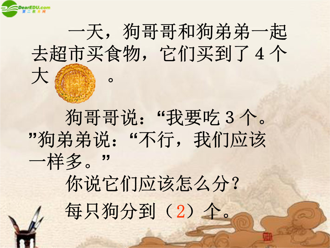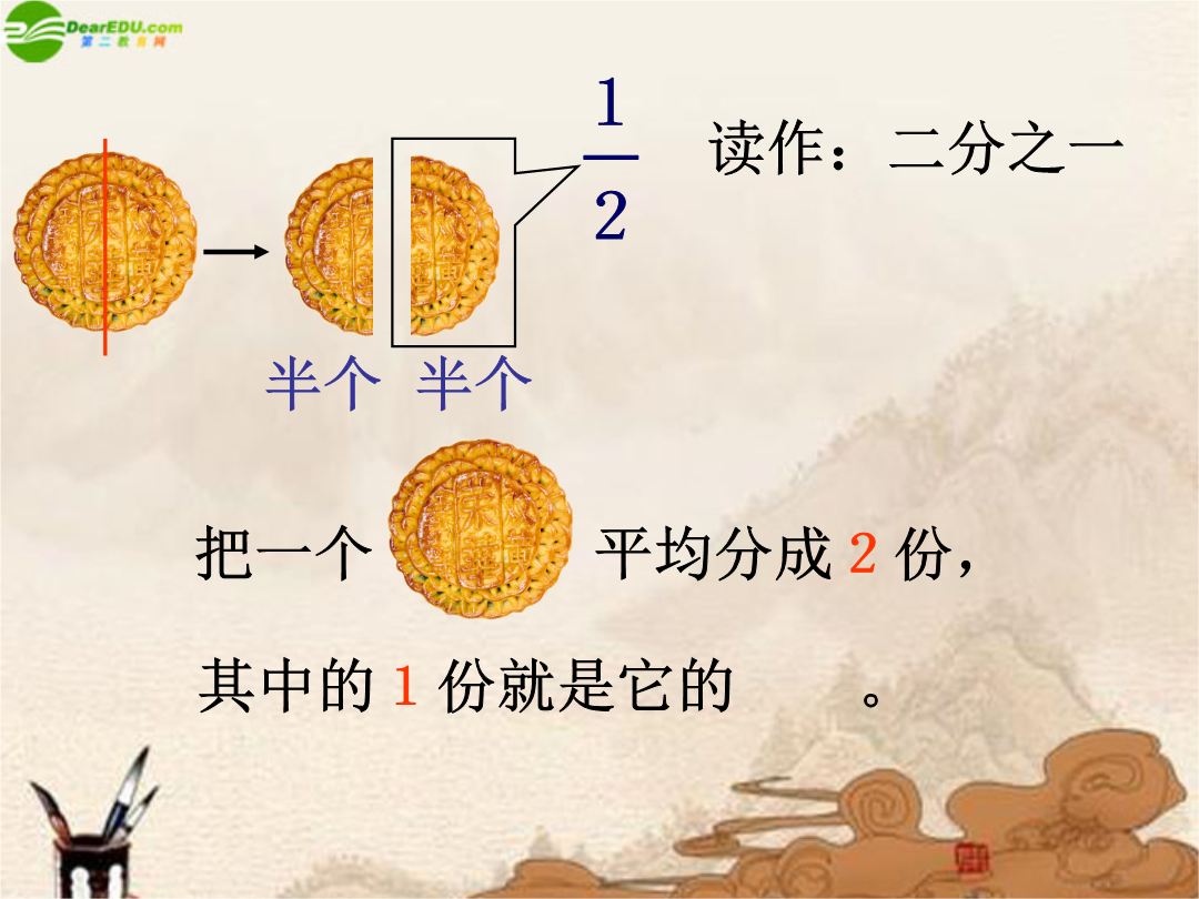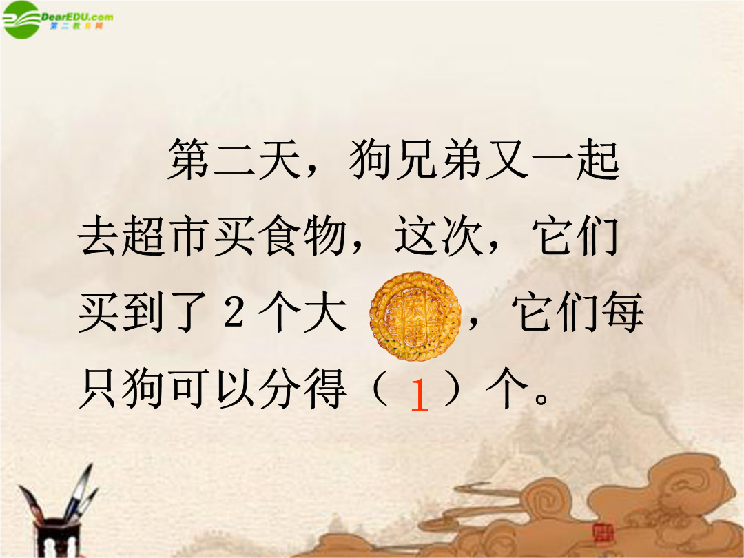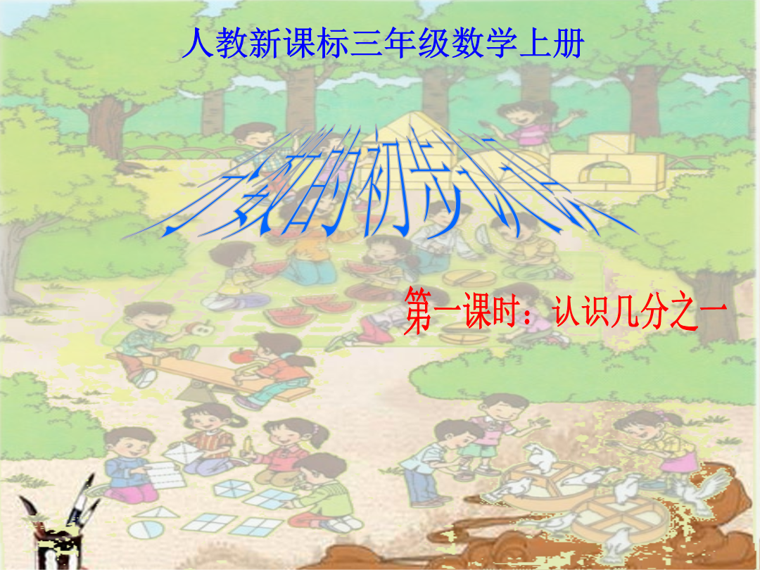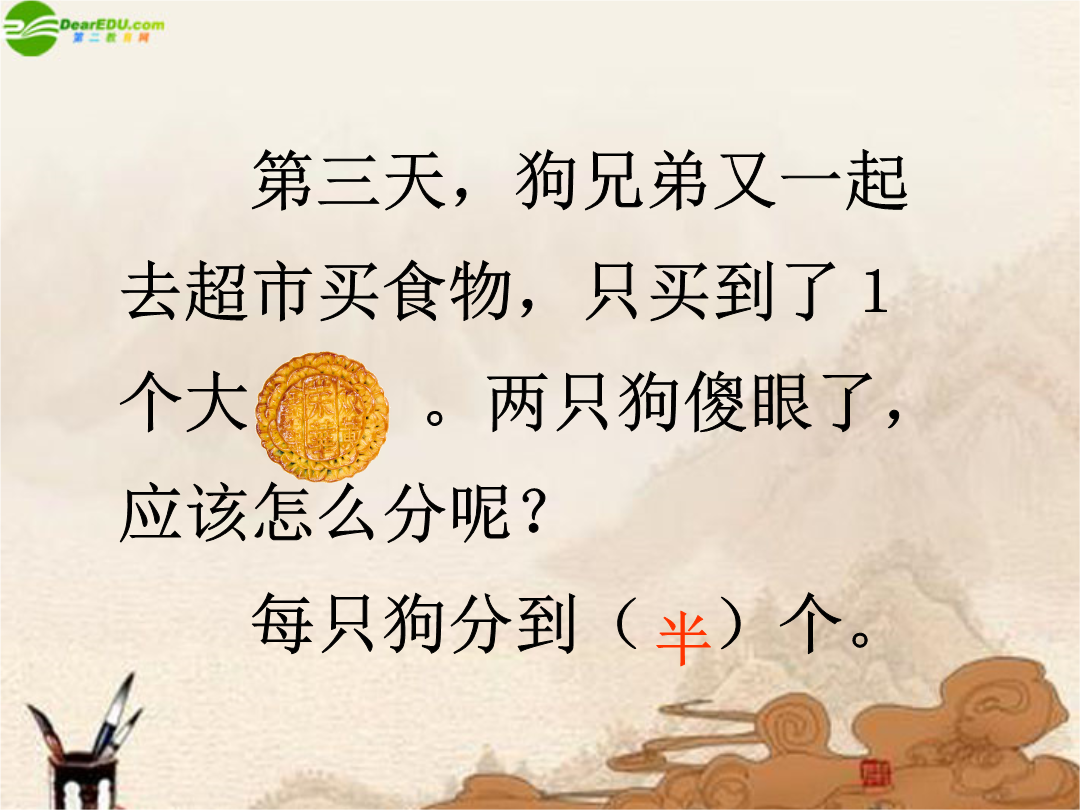 分数的初步认识一天,狗哥哥和狗弟弟一起去超市买食物,它们买到了4个大。第二天,狗兄弟又一起去超市买食物,这次,它们买到了2个大,它们每只狗可以分得()个。第三天,狗兄弟又一起去超市买食物,只买到了1个大。两只狗傻眼了,应该怎么分呢?每只狗分到()个。1-2练习写作折一折,画一画,写一写。一、下面哪个图里的涂色部分能用分数表示,请写出来。小猴子和小猪在一次吃西瓜的时候,也想用我们今天学习的分数,它们都想吃的多。小猴子想:“我要吃这个西瓜的。”小猪想:“我肚皮大,吃的多,要吃这个西瓜的。”它们俩谁吃的多?为什么?1-21-2课堂小结再见