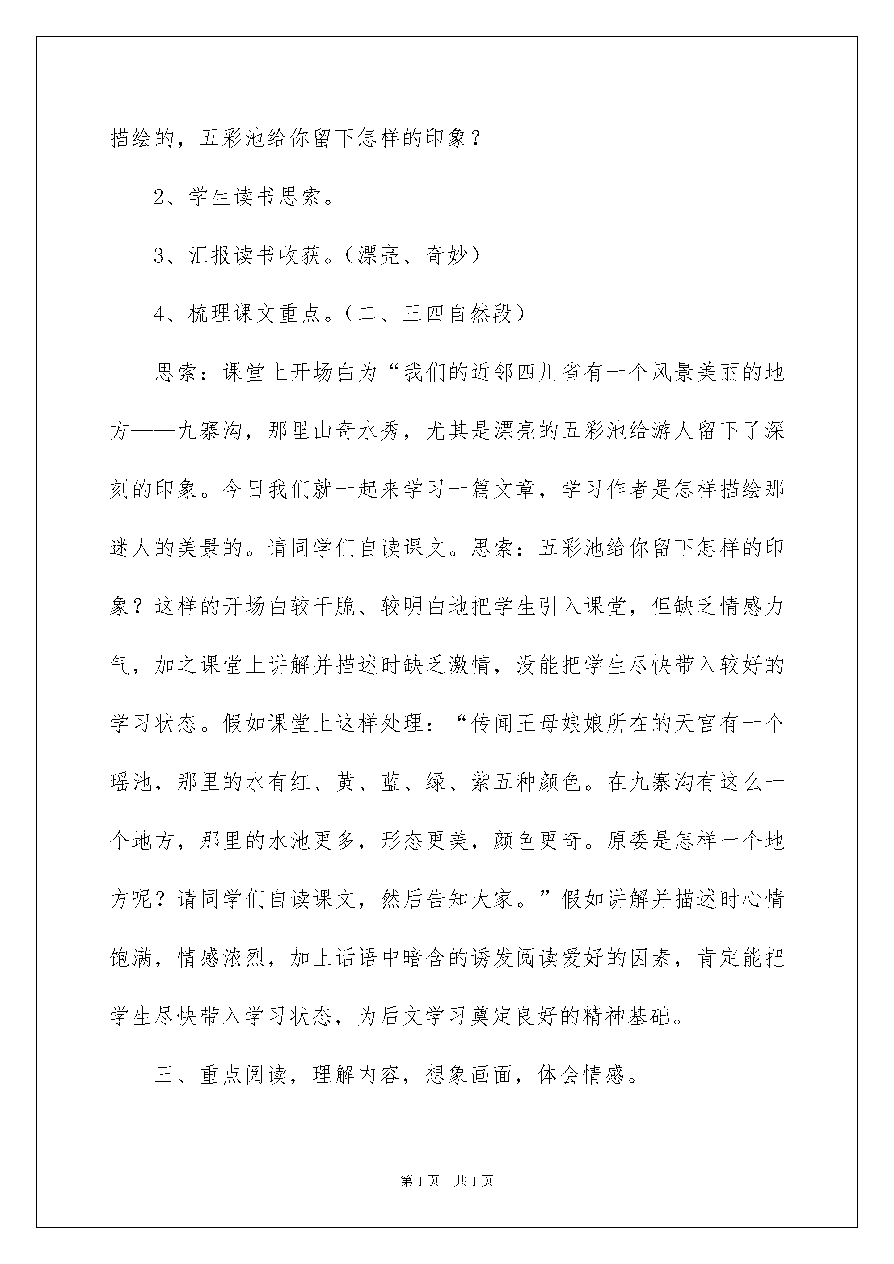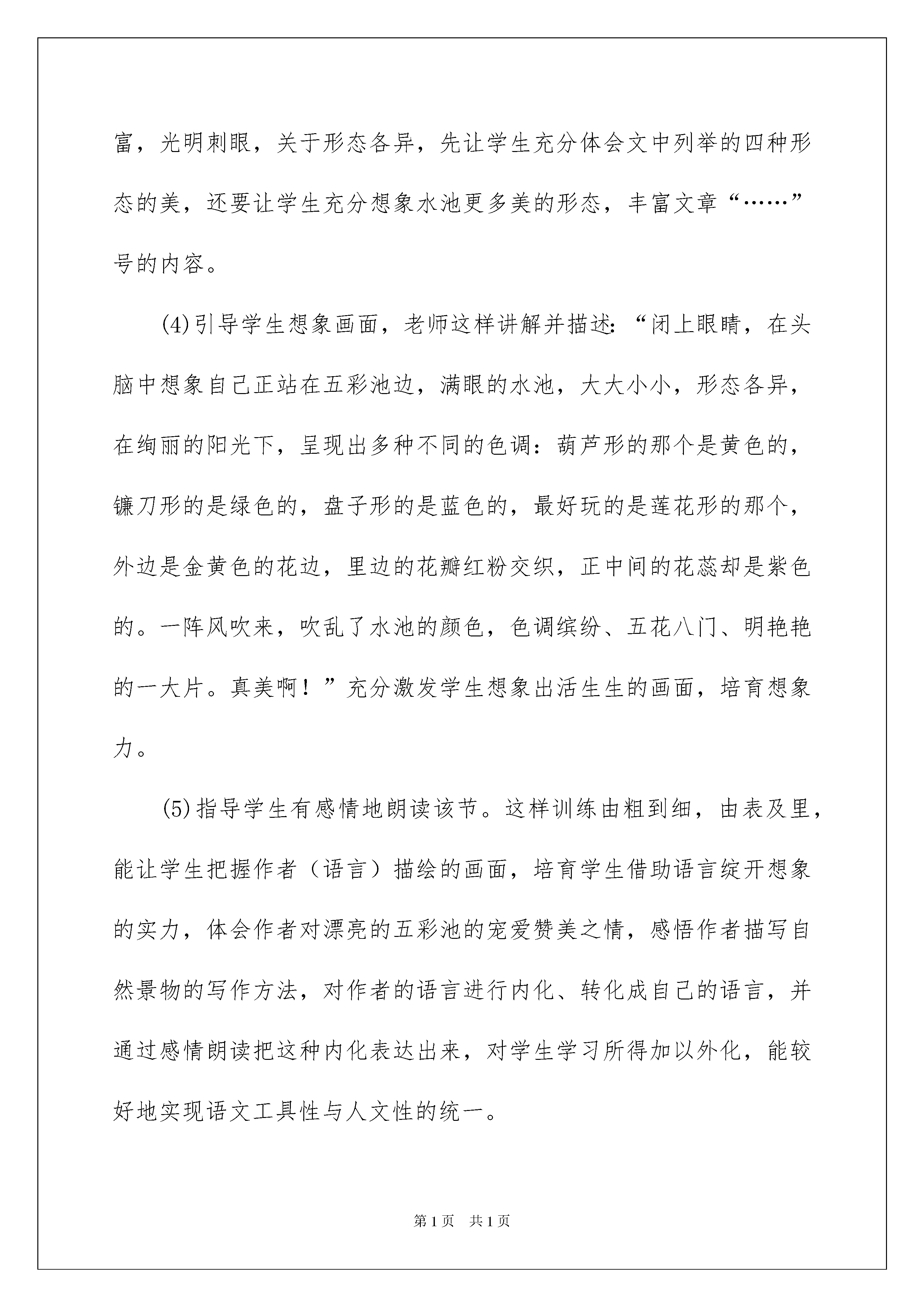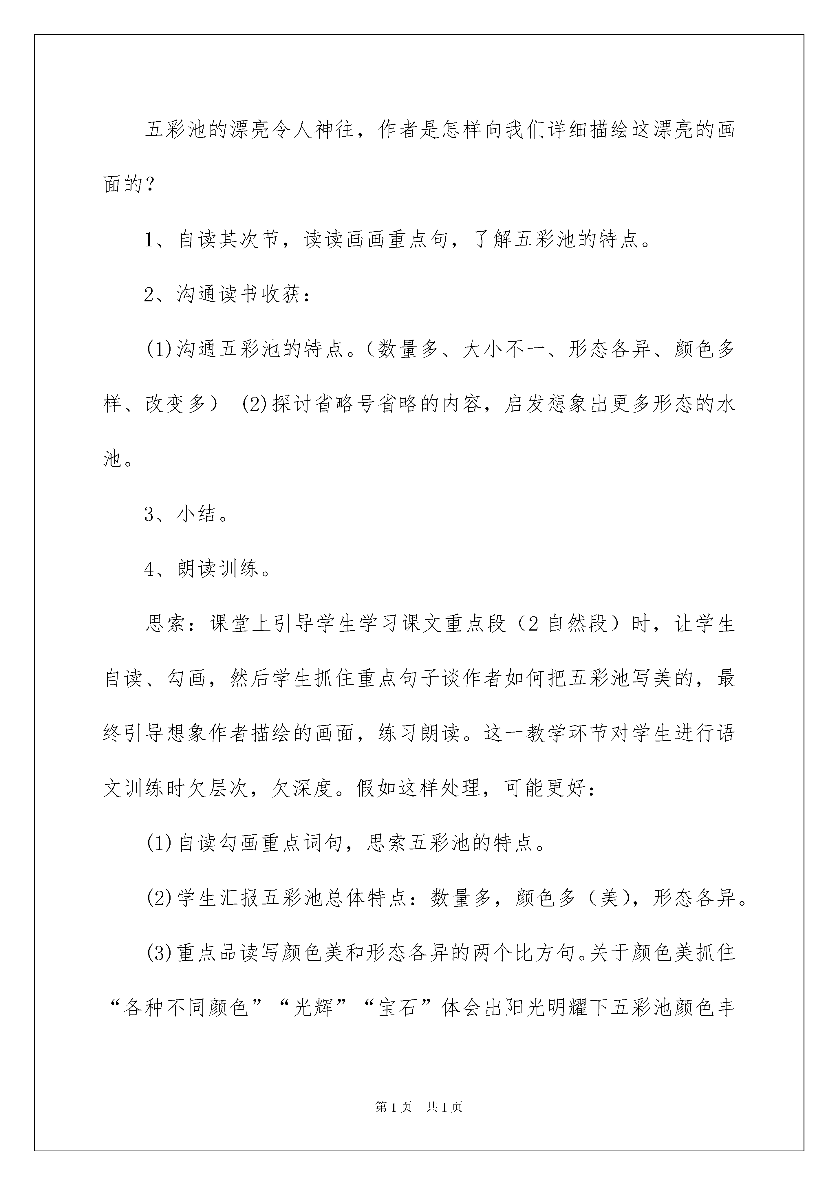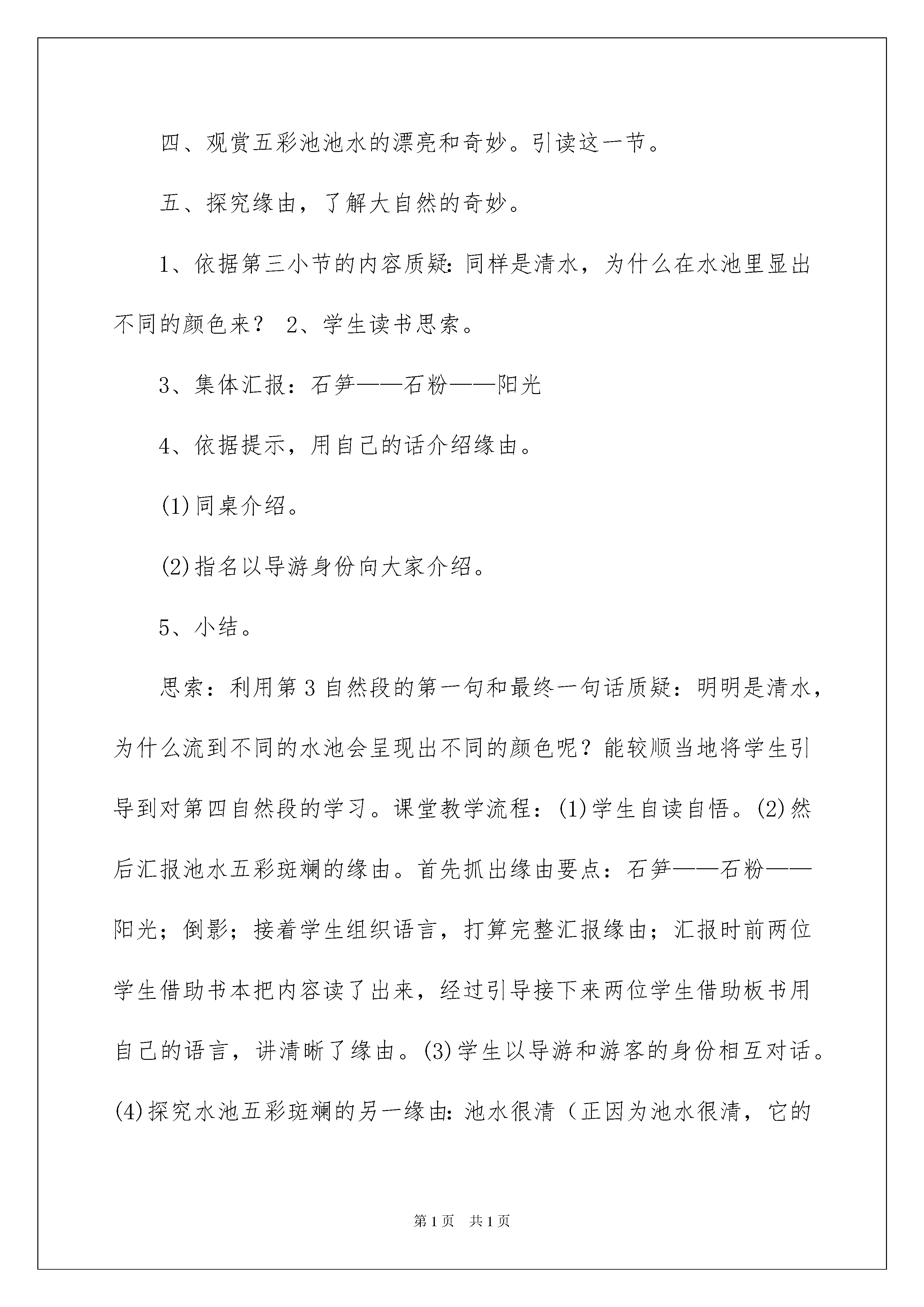 2022《五彩池》教学设计《五彩池》教学设计15篇作为一名为他人授业解惑的教化工作者,通常须要打算好一份教学设计,借助教学设计可以更好地组织教学活动。教学设计要怎么写呢?下面是我为大家收集的《五彩池》教学设计,欢迎阅读与保藏。《五彩池》教学设计1教学目标:1、学习本课生字新词。2、有感情地朗读课文,背诵其次、三自然段。3、理清课文的叙述依次。了解五彩池的特点及其成因,感受大自然的漂亮,培育酷爱祖国河山的思想感情。教学重点:五彩池的特点以及池水显出不同颜色的缘由。教学过程:一、引入。二、初读课文,感知大意。1、五彩池特别漂亮,请同学们自读课文,思索作者在文中是如何描绘的,五彩池给你留下怎样的印象?2、学生读书思索。3、汇报读书收获。(漂亮、奇妙)4、梳理课文重点。(二、三四自然段)思索:课堂上开场白为“我们的近邻四川省有一个风景美丽的地方——九寨沟,那里山奇水秀,尤其是漂亮的五彩池给游人留下了深刻的印象。今日我们就一起来学习一篇文章,学习作者是怎样描绘那迷人的美景的。请同学们自读课文。思索:五彩池给你留下怎样的印象?这样的开场白较干脆、较明白地把学生引入课堂,但缺乏情感力气,加之课堂上讲解并描述时缺乏激情,没能把学生尽快带入较好的学习状态。假如课堂上这样处理:“传闻王母娘娘所在的天宫有一个瑶池,那里的水有红、黄、蓝、绿、紫五种颜色。在九寨沟有这么一个地方,那里的水池更多,形态更美,颜色更奇。原委是怎样一个地方呢?请同学们自读课文,然后告知大家。”假如讲解并描述时心情饱满,情感浓烈,加上话语中暗含的诱发阅读爱好的因素,肯定能把学生尽快带入学习状态,为后文学习奠定良好的精神基础。三、重点阅读,理解内容,想象画面,体会情感。五彩池的漂亮令人神往,作者是怎样向我们详细描绘这漂亮的画面的?1、自读其次节,读读画画重点句,了解五彩池的特点。2、沟通读书收获:(1)沟通五彩池的特点。(数量多、大小不一、形态各异、颜色多样、改变多)(2)探讨省略号省略的内容,启发想象出更多形态的水池。3、小结。4、朗读训练。思索:课堂上引导学生学习课文重点段(2自然段)时,让学生自读、勾画,然后学生抓住重点句子谈作者如何把五彩池写美的,最终引导想象作者描绘的画面,练习朗读。这一教学环节对学生进行语文训练时欠层次,欠深度。假如这样处理,可能更好:(1)自读勾画重点词句,思索五彩池的特点。(2)学生汇报五彩池总体特点:数量多,颜色多(美),形态各异。(3)重点品读写颜色美和形态各异的两个比方句。关于颜色美抓住“各种不同颜色”“光辉”“宝石”体会出阳光明耀下五彩池颜色丰富,光明刺眼,关于形态各异,先让学生充分体会文中列举的四种形态的美,还要让学生充分想象水池更多美的形态,丰富文章“……”号的内容。(4)引导学生想象画面,老师这样讲解并描述:“闭上眼睛,在头脑中想象自己正站在五彩池边,满眼的水池,大大小小,形态各异,在绚丽的阳光下,呈现出多种不同的色调:葫芦形的那个是黄色的,镰刀形的是绿色的,盘子形的是蓝色的,最好玩的是莲花形的那个,外边是金黄色的花边,里边的花瓣红粉交织,正中间的花蕊却是紫色的。一阵风吹来,吹乱了水池的颜色,色调缤纷、五花八门、明艳艳的一大片。真美啊!”充分激发学生想象出活生生的画面,培育想象力。(5)指导学生有感情地朗读该节。这样训练由粗到细,由表及里,能让学生把握作者(语言)描绘的画面,培育学生借助语言绽开想象的实力,体会作者对漂亮的五彩池的宠爱赞美之情,感悟作者描写自然景物的写作方法,对作者的语言进行内化、转化成自己的语言,并通过感情朗读把这种内化表达出来,对学生学习所得加以外化,能较好地实现语文工具性与人文性的统一。四、观赏五彩池池水的漂亮和奇妙。引读这一节。五、探究缘由,了解大自然的奇妙。1、依据第三小节的内容质疑:同样是清水,为什么在水池里显出不同的颜色来?2、学生读书思索。3、集体汇报:石笋——石粉——阳光4、依据提示,用自己的话介绍缘由。(1)同桌介绍。(2)指名以导游身份向大家介绍。5、小结。思索:利用第3自然段的第一句和最终一句话质疑:明明是清水,为什么流到不同的水池会呈现出不同的颜色呢?能较顺当地将学生引导到对第四自然段的学习。课堂教学流程:(1)学生自读自悟。(2)然后汇报池水五彩斑斓的缘由。首先抓出缘由要点:石笋——石粉——阳光;倒影;接着学生组织语言,打算完整汇报缘由;汇报时前两位学生借助书本把内容读了出来,经过引导接下来两位学生借助板书用自己的语言,讲清晰了缘由。(3)学生以导游和游客的身份相互对话。(4)探究水池五彩斑斓的另一缘由:池水很清(正因为池水很清,它的透