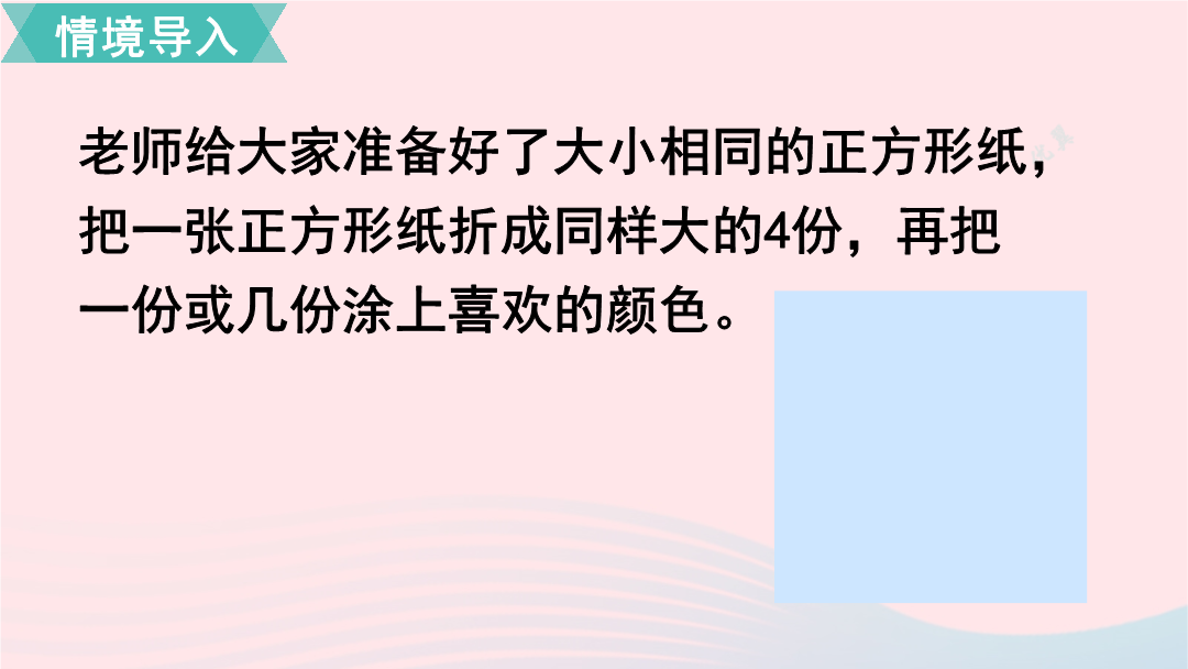 第3课时几分之几老师给大家准备好了大小相同的正方形纸,把一张正方形纸折成同样大的4份,再把一份或几份涂上喜欢的颜色。把一张正方形纸折成同样大的4份,再把一份或几份涂上颜色。你能把涂色部分用分数表示出来吗?把1分米长的一条彩带平均分成10份。把1分米长的一条彩带平均分成10份。1、看图写出分数。2、写出涂色部分所表示的分数,再比较每组分数的大小。3、看图写出分数,再比较每组分数的大小。认识几分之几:比较分母相同的分数的大小方法:(1)一个苹果平均分成4块,小明吃了2块,小明吃了这个苹果的()。2、用分数表示下面各图中的阴影部分。3、在○里填上“>”“<”或“=”。4、数一数,填一填。