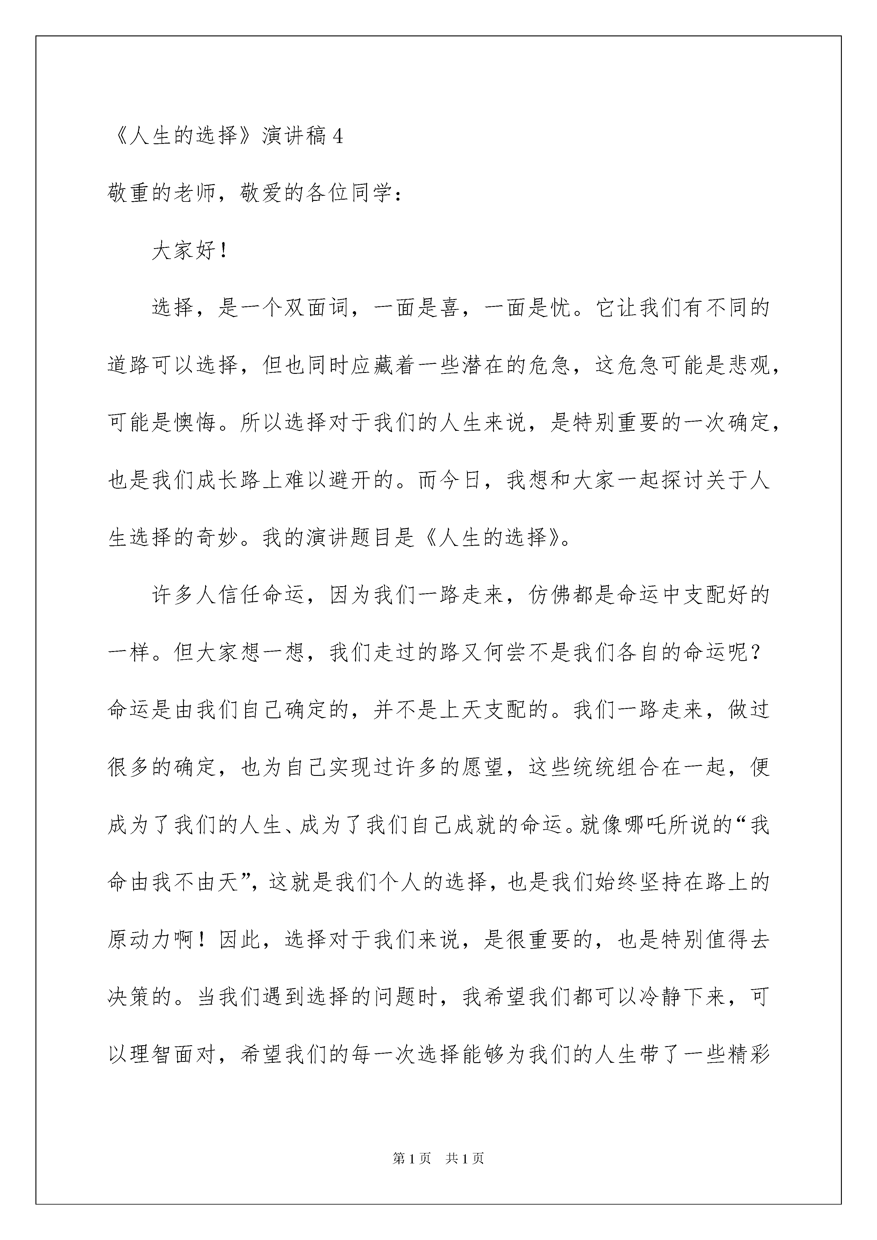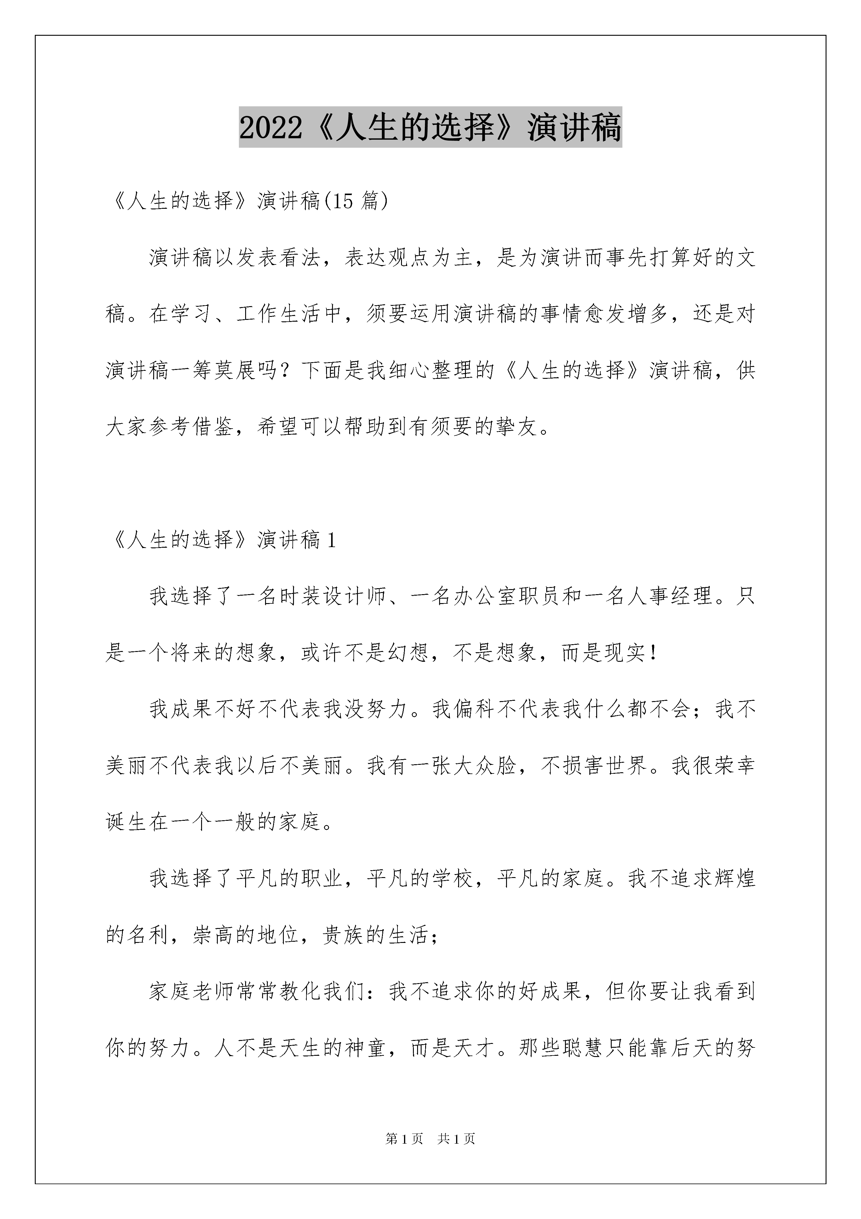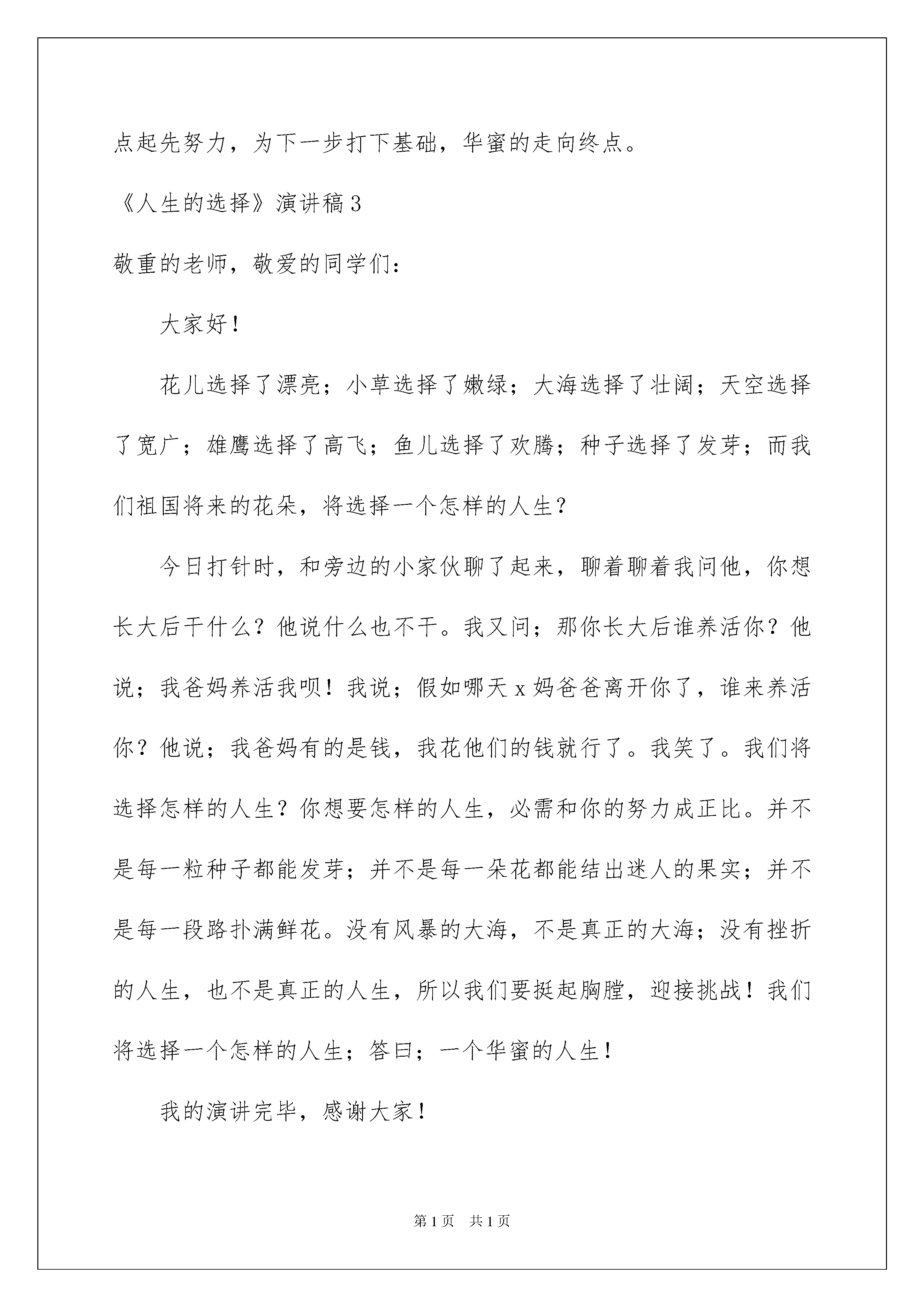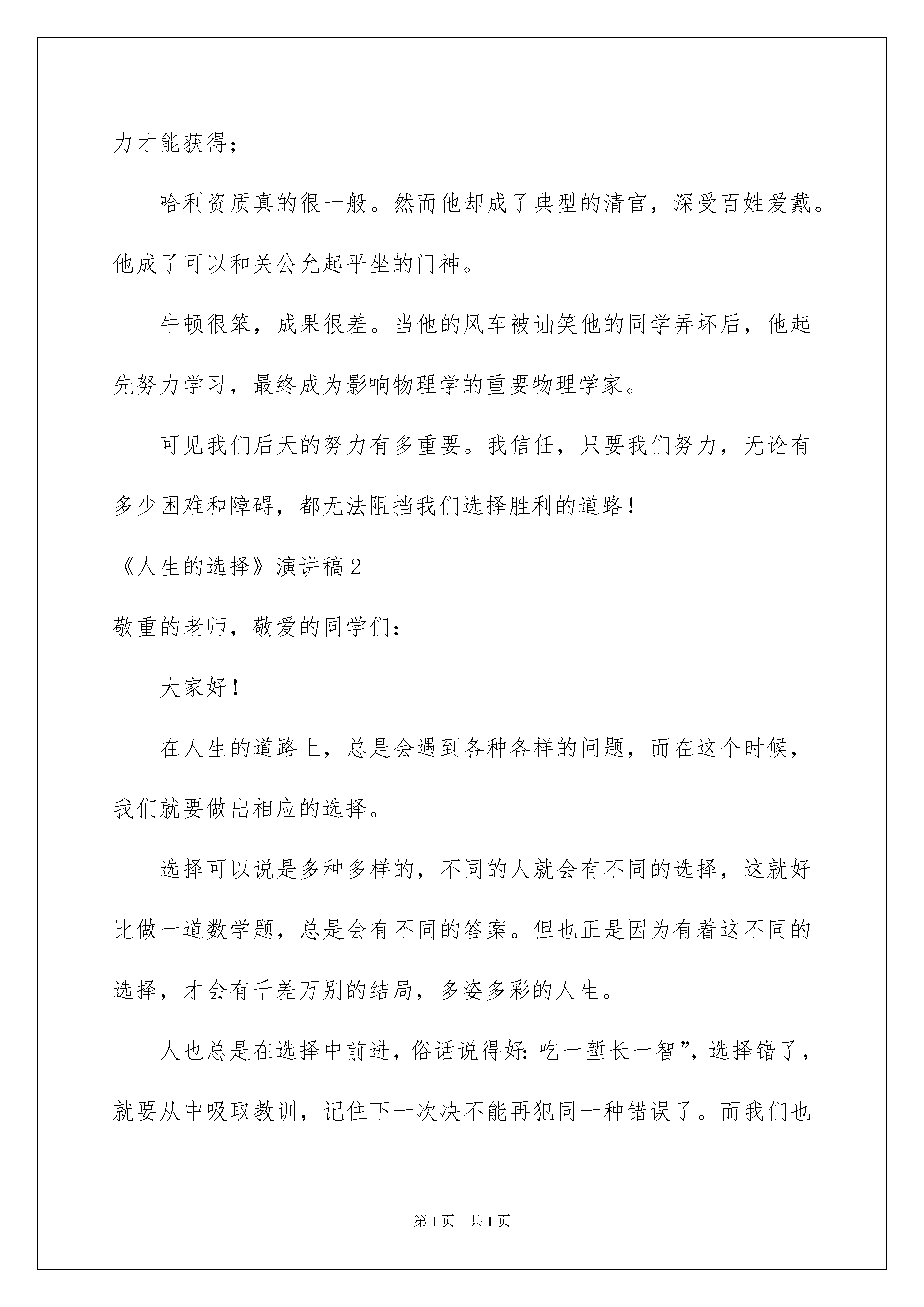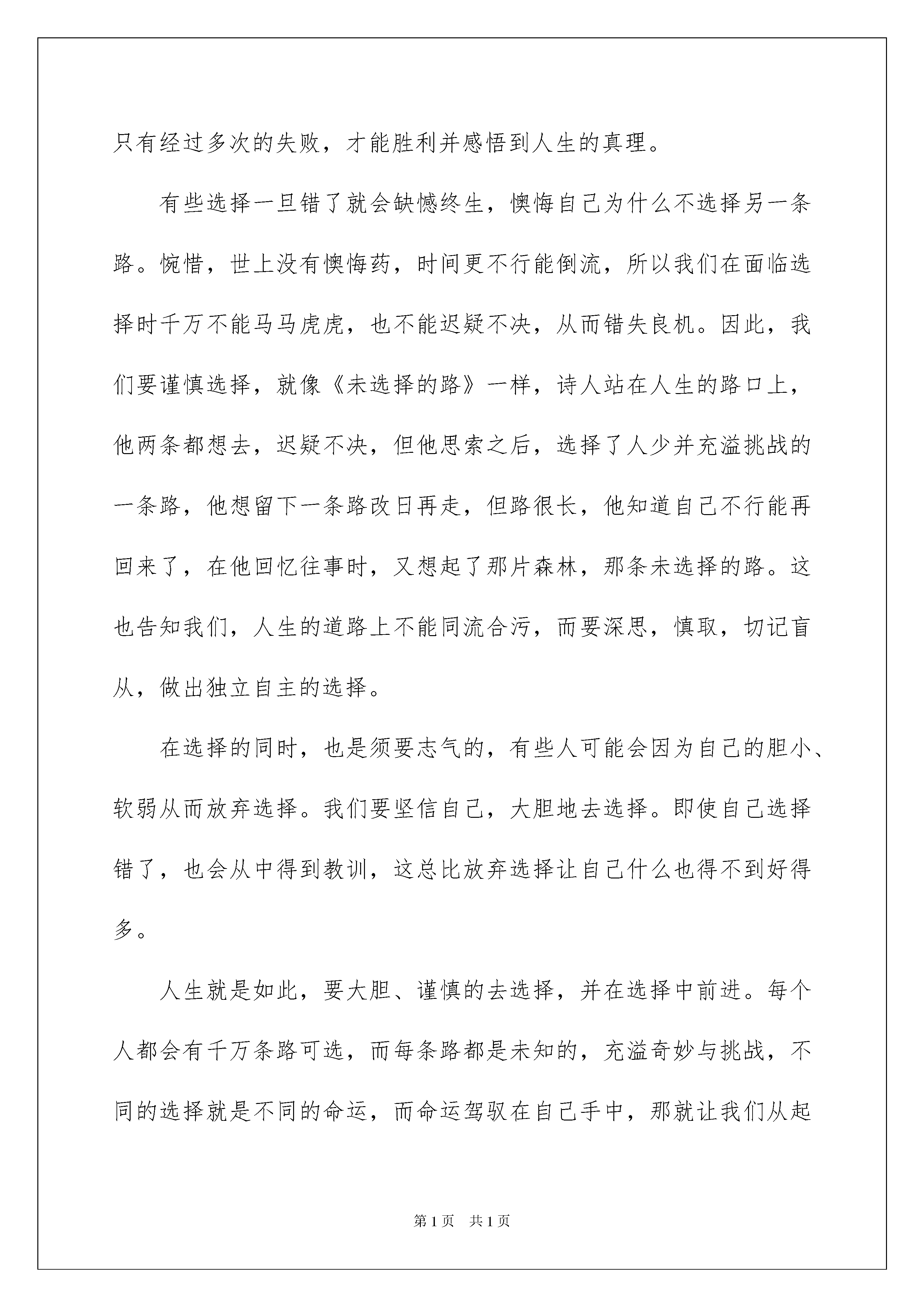 2022《人生的选择》演讲稿《人生的选择》演讲稿(15篇)演讲稿以发表看法,表达观点为主,是为演讲而事先打算好的文稿。在学习、工作生活中,须要运用演讲稿的事情愈发增多,还是对演讲稿一筹莫展吗?下面是我细心整理的《人生的选择》演讲稿,供大家参考借鉴,希望可以帮助到有须要的挚友。《人生的选择》演讲稿1我选择了一名时装设计师、一名办公室职员和一名人事经理。只是一个将来的想象,或许不是幻想,不是想象,而是现实!我成果不好不代表我没努力。我偏科不代表我什么都不会;我不美丽不代表我以后不美丽。我有一张大众脸,不损害世界。我很荣幸诞生在一个一般的家庭。我选择了平凡的职业,平凡的学校,平凡的家庭。我不追求辉煌的名利,崇高的地位,贵族的生活;家庭老师常常教化我们:我不追求你的好成果,但你要让我看到你的努力。人不是天生的神童,而是天才。那些聪慧只能靠后天的努力才能获得;哈利资质真的很一般。然而他却成了典型的清官,深受百姓爱戴。他成了可以和关公允起平坐的门神。牛顿很笨,成果很差。当他的风车被讪笑他的同学弄坏后,他起先努力学习,最终成为影响物理学的重要物理学家。可见我们后天的努力有多重要。我信任,只要我们努力,无论有多少困难和障碍,都无法阻挡我们选择胜利的道路!《人生的选择》演讲稿2敬重的老师,敬爱的同学们:大家好!在人生的道路上,总是会遇到各种各样的问题,而在这个时候,我们就要做出相应的选择。选择可以说是多种多样的,不同的人就会有不同的选择,这就好比做一道数学题,总是会有不同的答案。但也正是因为有着这不同的选择,才会有千差万别的结局,多姿多彩的人生。人也总是在选择中前进,俗话说得好:吃一堑长一智”,选择错了,就要从中吸取教训,记住下一次决不能再犯同一种错误了。而我们也只有经过多次的失败,才能胜利并感悟到人生的真理。有些选择一旦错了就会缺憾终生,懊悔自己为什么不选择另一条路。惋惜,世上没有懊悔药,时间更不行能倒流,所以我们在面临选择时千万不能马马虎虎,也不能迟疑不决,从而错失良机。因此,我们要谨慎选择,就像《未选择的路》一样,诗人站在人生的路口上,他两条都想去,迟疑不决,但他思索之后,选择了人少并充溢挑战的一条路,他想留下一条路改日再走,但路很长,他知道自己不行能再回来了,在他回忆往事时,又想起了那片森林,那条未选择的路。这也告知我们,人生的道路上不能同流合污,而要深思,慎取,切记盲从,做出独立自主的选择。在选择的同时,也是须要志气的,有些人可能会因为自己的胆小、软弱从而放弃选择。我们要坚信自己,大胆地去选择。即使自己选择错了,也会从中得到教训,这总比放弃选择让自己什么也得不到好得多。人生就是如此,要大胆、谨慎的去选择,并在选择中前进。每个人都会有千万条路可选,而每条路都是未知的,充溢奇妙与挑战,不同的选择就是不同的命运,而命运驾驭在自己手中,那就让我们从起点起先努力,为下一步打下基础,华蜜的走向终点。《人生的选择》演讲稿3敬重的老师,敬爱的同学们:大家好!花儿选择了漂亮;小草选择了嫩绿;大海选择了壮阔;天空选择了宽广;雄鹰选择了高飞;鱼儿选择了欢腾;种子选择了发芽;而我们祖国将来的花朵,将选择一个怎样的人生?今日打针时,和旁边的小家伙聊了起来,聊着聊着我问他,你想长大后干什么?他说什么也不干。我又问;那你长大后谁养活你?他说;我爸妈养活我呗!我说;假如哪天x妈爸爸离开你了,谁来养活你?他说;我爸妈有的是钱,我花他们的钱就行了。我笑了。我们将选择怎样的人生?你想要怎样的人生,必需和你的努力成正比。并不是每一粒种子都能发芽;并不是每一朵花都能结出迷人的果实;并不是每一段路扑满鲜花。没有风暴的大海,不是真正的大海;没有挫折的人生,也不是真正的人生,所以我们要挺起胸膛,迎接挑战!我们将选择一个怎样的人生;答曰;一个华蜜的人生!我的演讲完毕,感谢大家!《人生的选择》演讲稿4敬重的老师,敬爱的各位同学:大家好!选择,是一个双面词,一面是喜,一面是忧。它让我们有不同的道路可以选择,但也同时应藏着一些潜在的危急,这危急可能是悲观,可能是懊悔。所以选择对于我们的人生来说,是特别重要的一次确定,也是我们成长路上难以避开的。而今日,我想和大家一起探讨关于人生选择的奇妙。我的演讲题目是《人生的选择》。许多人信任命运,因为我们一路走来,仿佛都是命运中支配好的一样。但大家想一想,我们走过的路又何尝不是我们各自的命运呢?命运是由我们自己确定的,并不是上天支配的。我们一路走来,做过很多的确定,也为自己实现过许多的愿望,这些统统组合在一起,便成为了我们的人生、成为了我们自己成就的命运。就像哪吒所说的“我命由我不由天”,这就是我