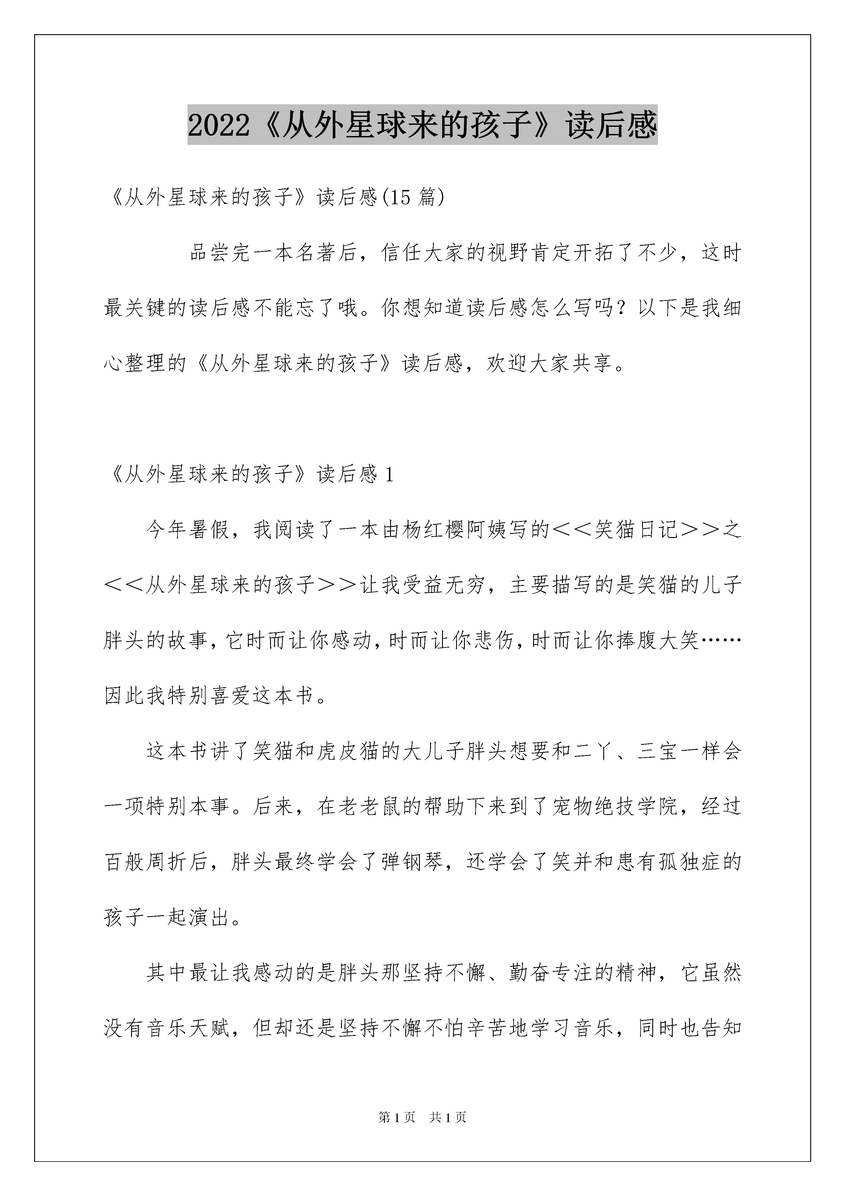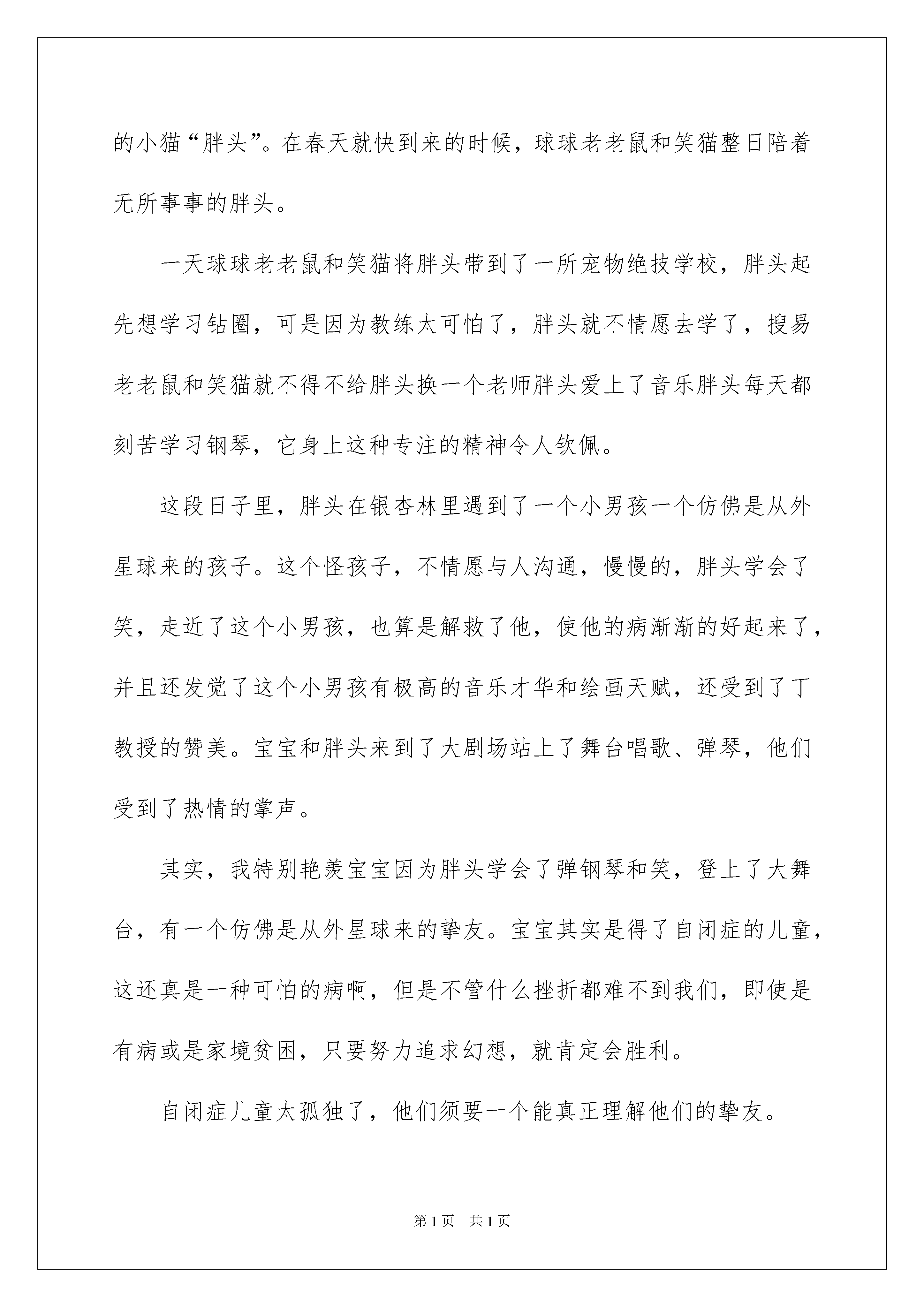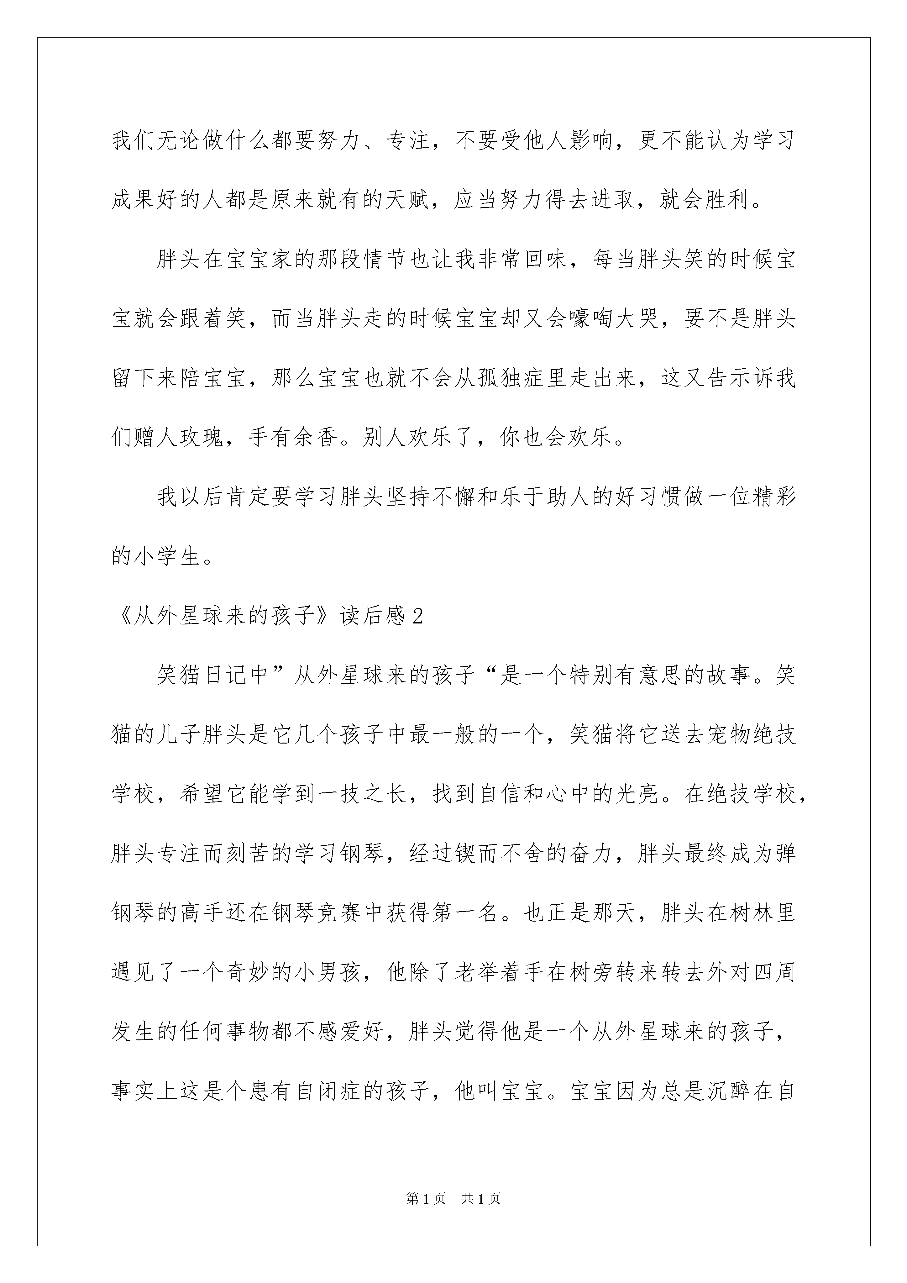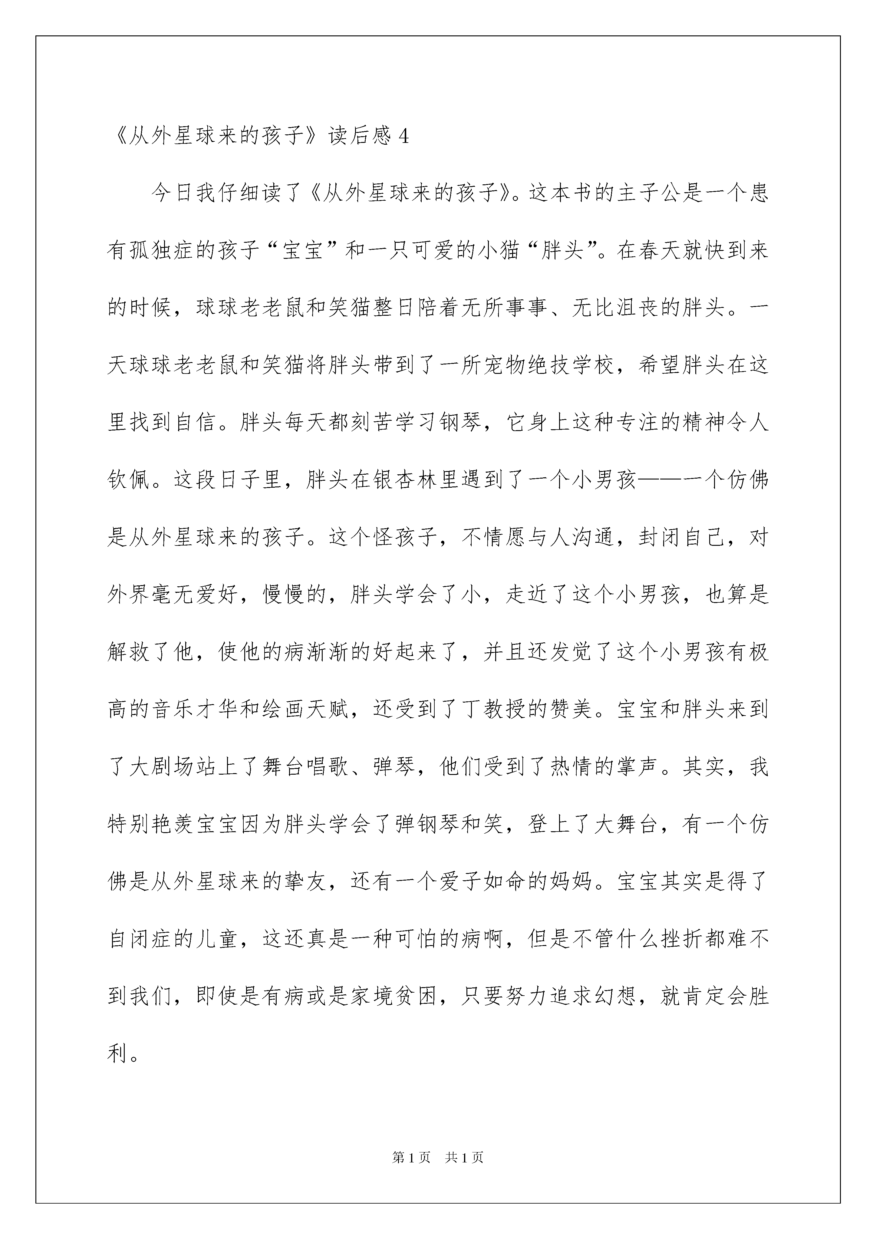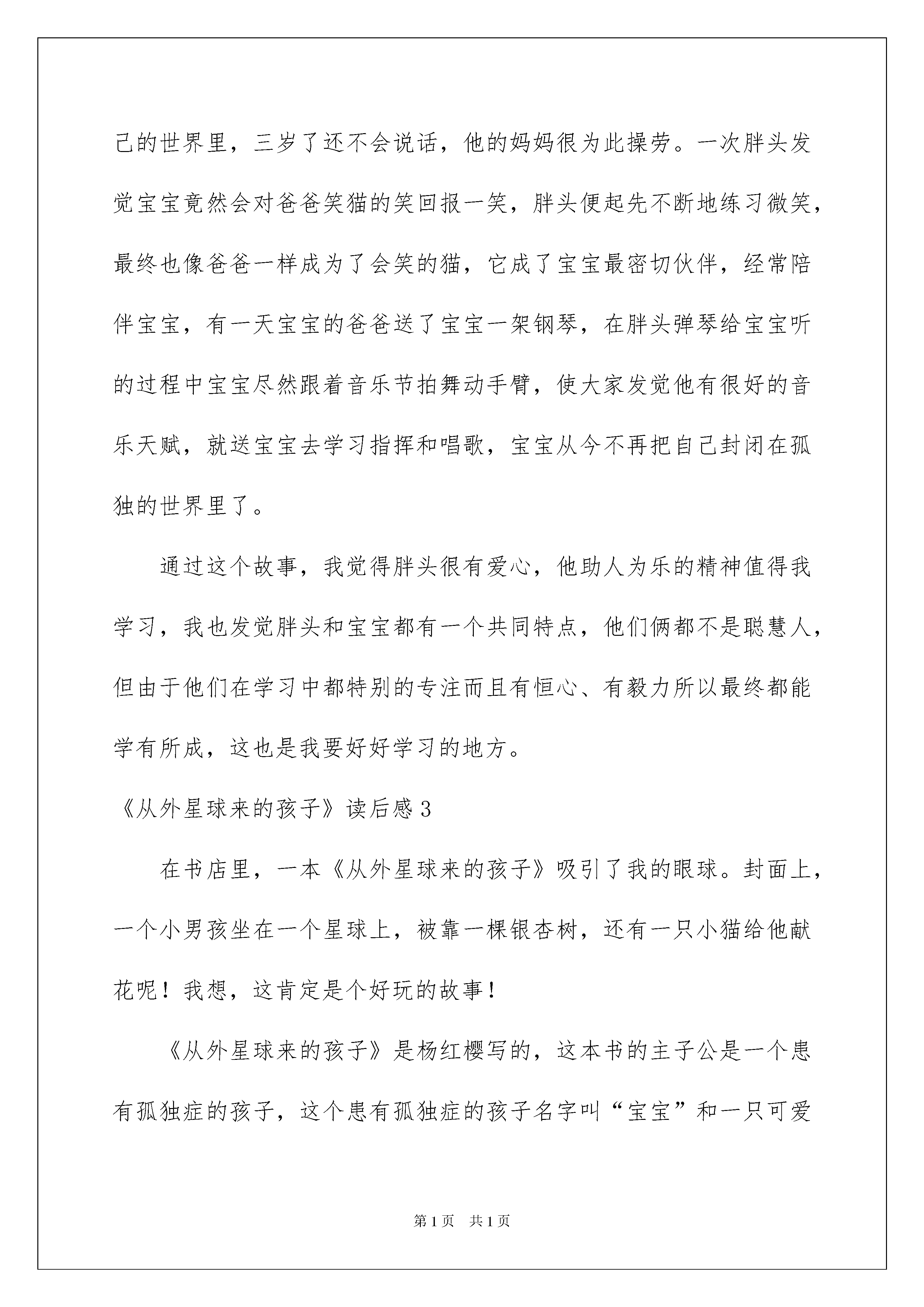 2022《从外星球来的孩子》读后感《从外星球来的孩子》读后感(15篇)品尝完一本名著后,信任大家的视野肯定开拓了不少,这时最关键的读后感不能忘了哦。你想知道读后感怎么写吗?以下是我细心整理的《从外星球来的孩子》读后感,欢迎大家共享。《从外星球来的孩子》读后感1今年暑假,我阅读了一本由杨红樱阿姨写的<<笑猫日记>>之<<从外星球来的孩子>>让我受益无穷,主要描写的是笑猫的儿子胖头的故事,它时而让你感动,时而让你悲伤,时而让你捧腹大笑……因此我特别喜爱这本书。这本书讲了笑猫和虎皮猫的大儿子胖头想要和二丫、三宝一样会一项特别本事。后来,在老老鼠的帮助下来到了宠物绝技学院,经过百般周折后,胖头最终学会了弹钢琴,还学会了笑并和患有孤独症的孩子一起演出。其中最让我感动的是胖头那坚持不懈、勤奋专注的精神,它虽然没有音乐天赋,但却还是坚持不懈不怕辛苦地学习音乐,同时也告知我们无论做什么都要努力、专注,不要受他人影响,更不能认为学习成果好的人都是原来就有的天赋,应当努力得去进取,就会胜利。胖头在宝宝家的那段情节也让我非常回味,每当胖头笑的时候宝宝就会跟着笑,而当胖头走的时候宝宝却又会嚎啕大哭,要不是胖头留下来陪宝宝,那么宝宝也就不会从孤独症里走出来,这又告示诉我们赠人玫瑰,手有余香。别人欢乐了,你也会欢乐。我以后肯定要学习胖头坚持不懈和乐于助人的好习惯做一位精彩的小学生。《从外星球来的孩子》读后感2笑猫日记中”从外星球来的孩子“是一个特别有意思的故事。笑猫的儿子胖头是它几个孩子中最一般的一个,笑猫将它送去宠物绝技学校,希望它能学到一技之长,找到自信和心中的光亮。在绝技学校,胖头专注而刻苦的学习钢琴,经过锲而不舍的奋力,胖头最终成为弹钢琴的高手还在钢琴竞赛中获得第一名。也正是那天,胖头在树林里遇见了一个奇妙的小男孩,他除了老举着手在树旁转来转去外对四周发生的任何事物都不感爱好,胖头觉得他是一个从外星球来的孩子,事实上这是个患有自闭症的孩子,他叫宝宝。宝宝因为总是沉醉在自己的世界里,三岁了还不会说话,他的妈妈很为此操劳。一次胖头发觉宝宝竟然会对爸爸笑猫的笑回报一笑,胖头便起先不断地练习微笑,最终也像爸爸一样成为了会笑的猫,它成了宝宝最密切伙伴,经常陪伴宝宝,有一天宝宝的爸爸送了宝宝一架钢琴,在胖头弹琴给宝宝听的过程中宝宝尽然跟着音乐节拍舞动手臂,使大家发觉他有很好的音乐天赋,就送宝宝去学习指挥和唱歌,宝宝从今不再把自己封闭在孤独的世界里了。通过这个故事,我觉得胖头很有爱心,他助人为乐的精神值得我学习,我也发觉胖头和宝宝都有一个共同特点,他们俩都不是聪慧人,但由于他们在学习中都特别的专注而且有恒心、有毅力所以最终都能学有所成,这也是我要好好学习的地方。《从外星球来的孩子》读后感3在书店里,一本《从外星球来的孩子》吸引了我的眼球。封面上,一个小男孩坐在一个星球上,被靠一棵银杏树,还有一只小猫给他献花呢!我想,这肯定是个好玩的故事!《从外星球来的孩子》是杨红樱写的,这本书的主子公是一个患有孤独症的孩子,这个患有孤独症的孩子名字叫“宝宝”和一只可爱的小猫“胖头”。在春天就快到来的时候,球球老老鼠和笑猫整日陪着无所事事的胖头。一天球球老老鼠和笑猫将胖头带到了一所宠物绝技学校,胖头起先想学习钻圈,可是因为教练太可怕了,胖头就不情愿去学了,搜易老老鼠和笑猫就不得不给胖头换一个老师胖头爱上了音乐胖头每天都刻苦学习钢琴,它身上这种专注的精神令人钦佩。这段日子里,胖头在银杏林里遇到了一个小男孩一个仿佛是从外星球来的孩子。这个怪孩子,不情愿与人沟通,慢慢的,胖头学会了笑,走近了这个小男孩,也算是解救了他,使他的病渐渐的好起来了,并且还发觉了这个小男孩有极高的音乐才华和绘画天赋,还受到了丁教授的赞美。宝宝和胖头来到了大剧场站上了舞台唱歌、弹琴,他们受到了热情的掌声。其实,我特别艳羡宝宝因为胖头学会了弹钢琴和笑,登上了大舞台,有一个仿佛是从外星球来的挚友。宝宝其实是得了自闭症的儿童,这还真是一种可怕的病啊,但是不管什么挫折都难不到我们,即使是有病或是家境贫困,只要努力追求幻想,就肯定会胜利。自闭症儿童太孤独了,他们须要一个能真正理解他们的挚友。《从外星球来的孩子》读后感4今日我仔细读了《从外星球来的孩子》。这本书的主子公是一个患有孤独症的孩子“宝宝”和一只可爱的小猫“胖头”。在春天就快到来的时候,球球老老鼠和笑猫整日陪着无所事事、无比沮丧的胖头。一天球球老老鼠和笑猫将胖头带到了一所宠物绝技学校,希望胖头在这里找到自信。胖头每天都刻苦学习钢琴,它身上这种专注的精神令人钦佩。这段日子里,胖头在银杏林里遇到了一个小男孩——一
