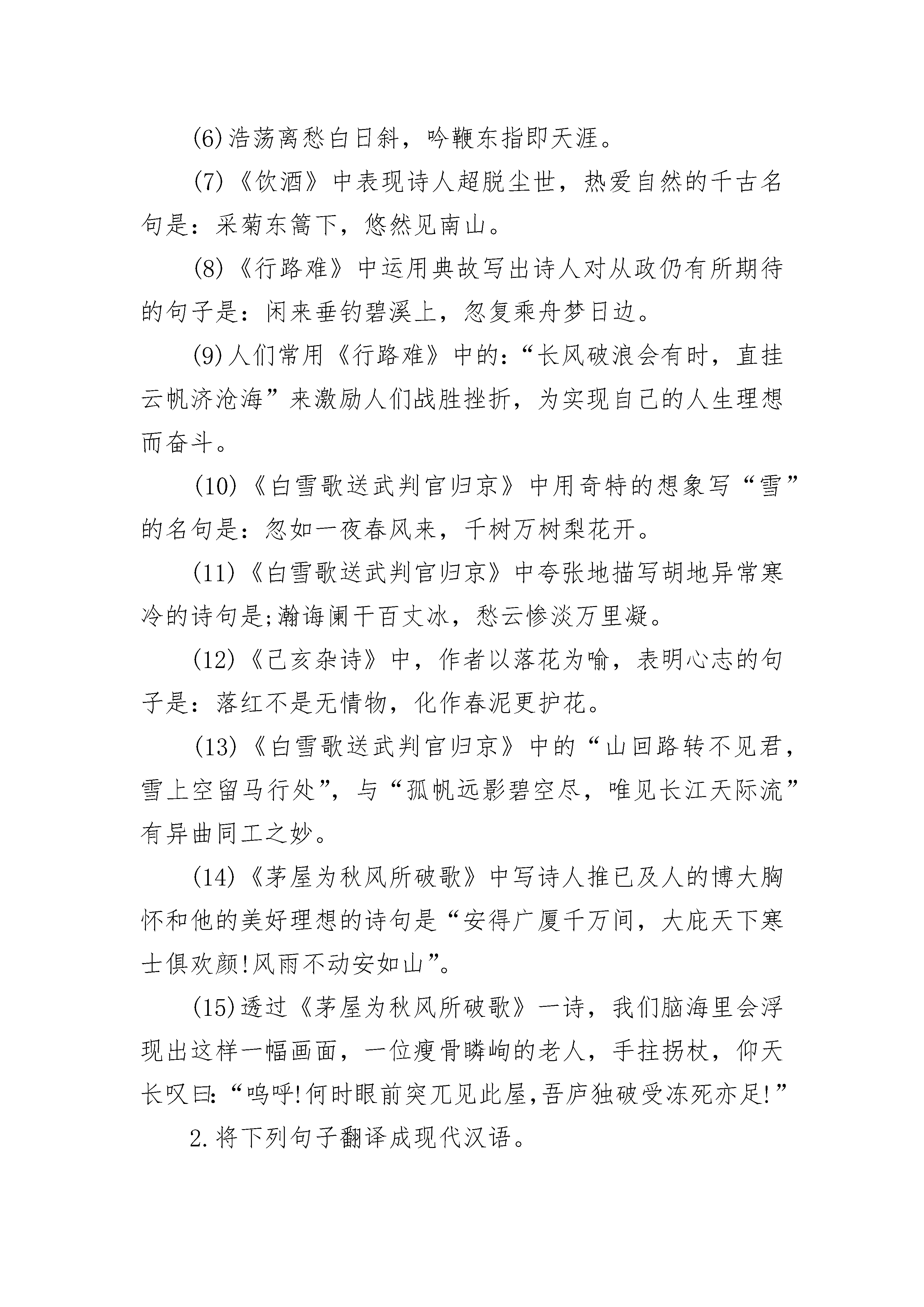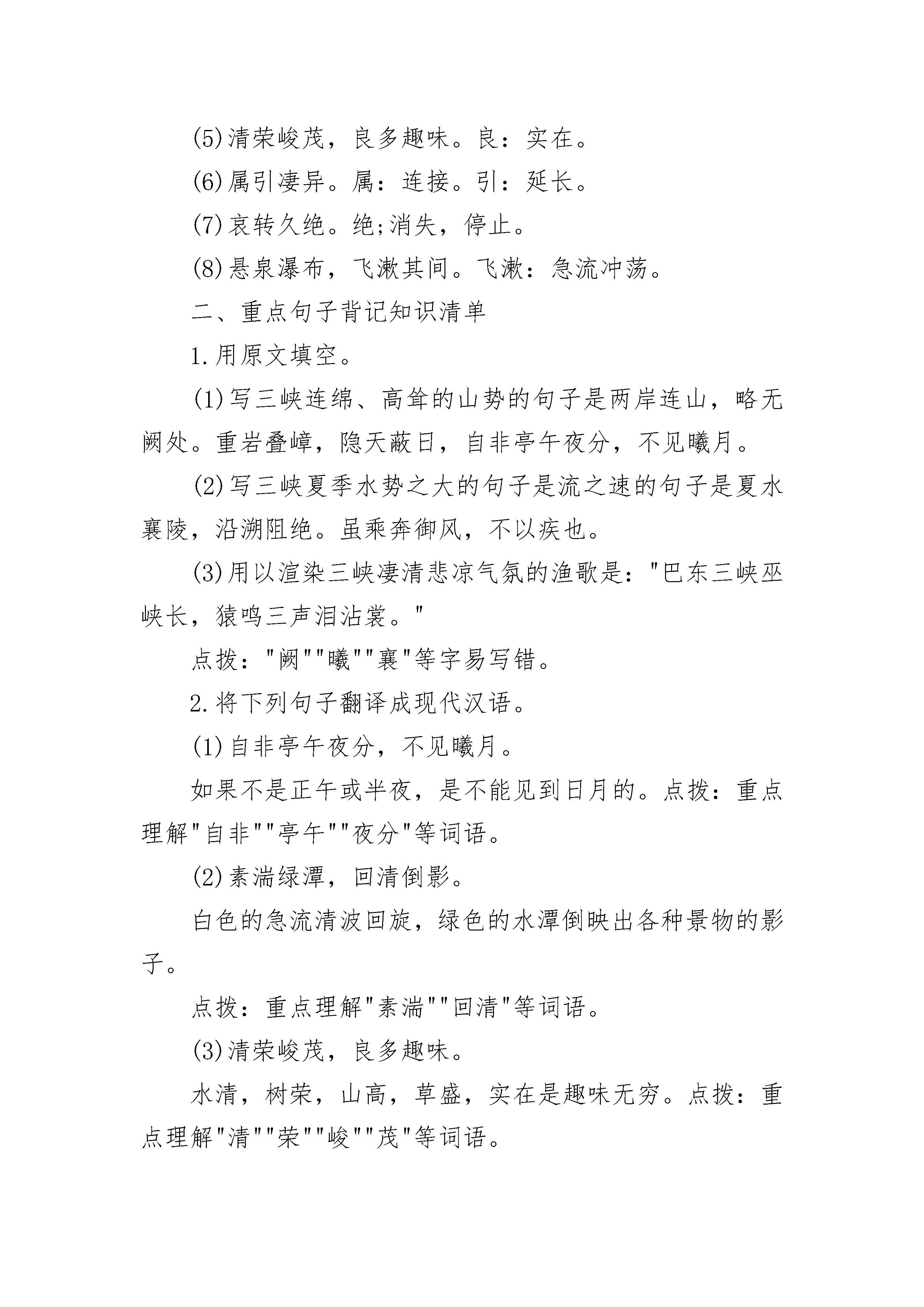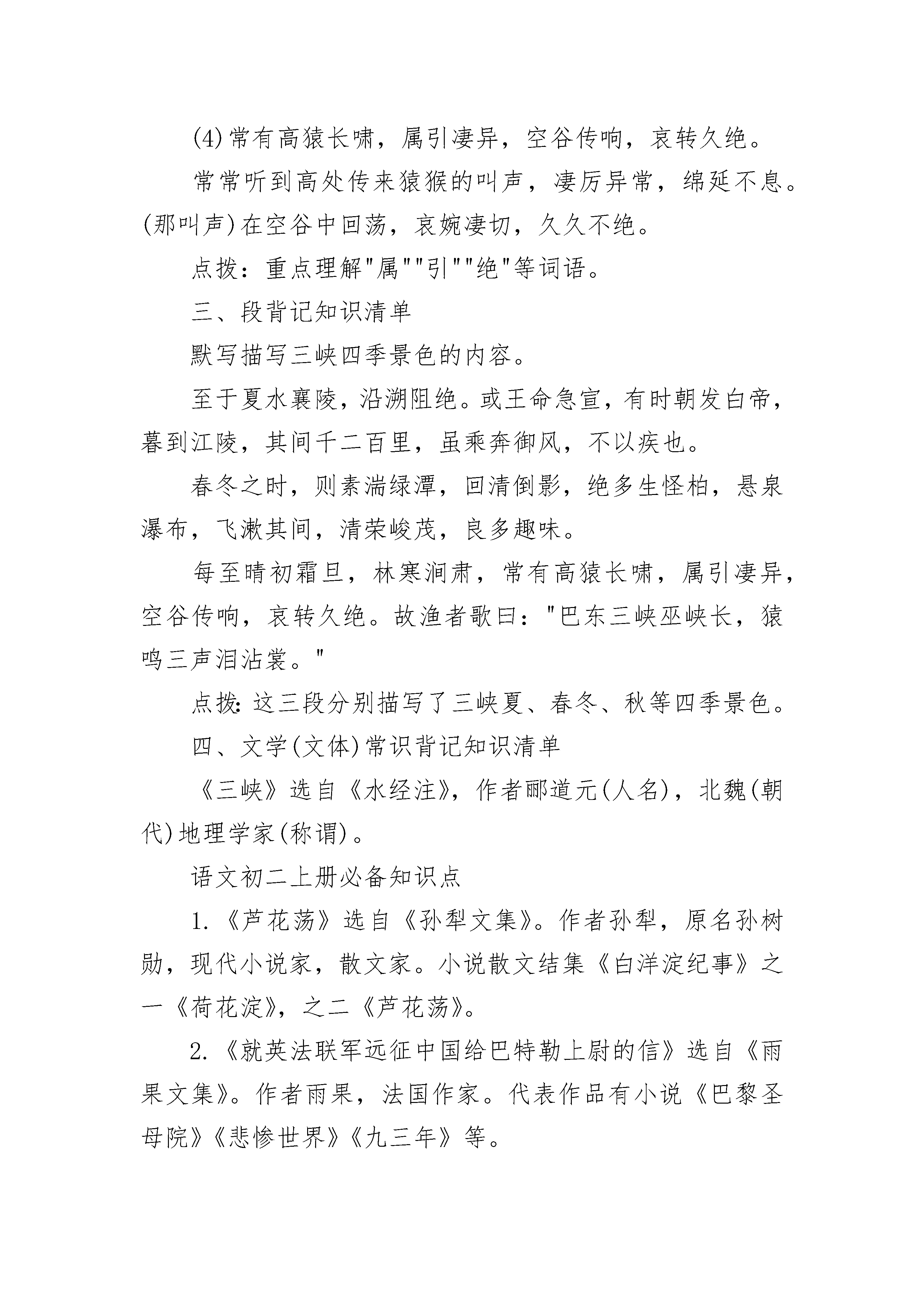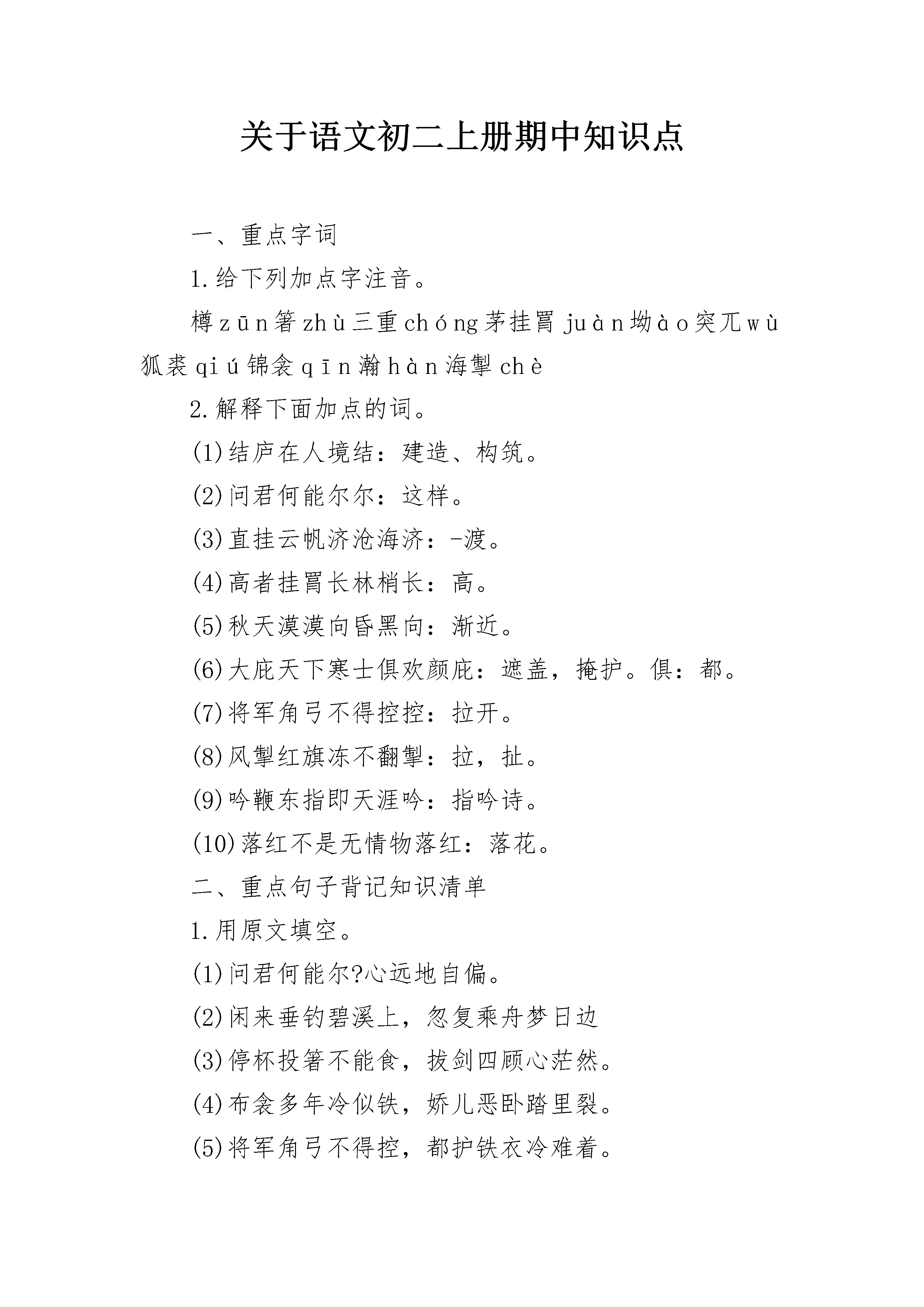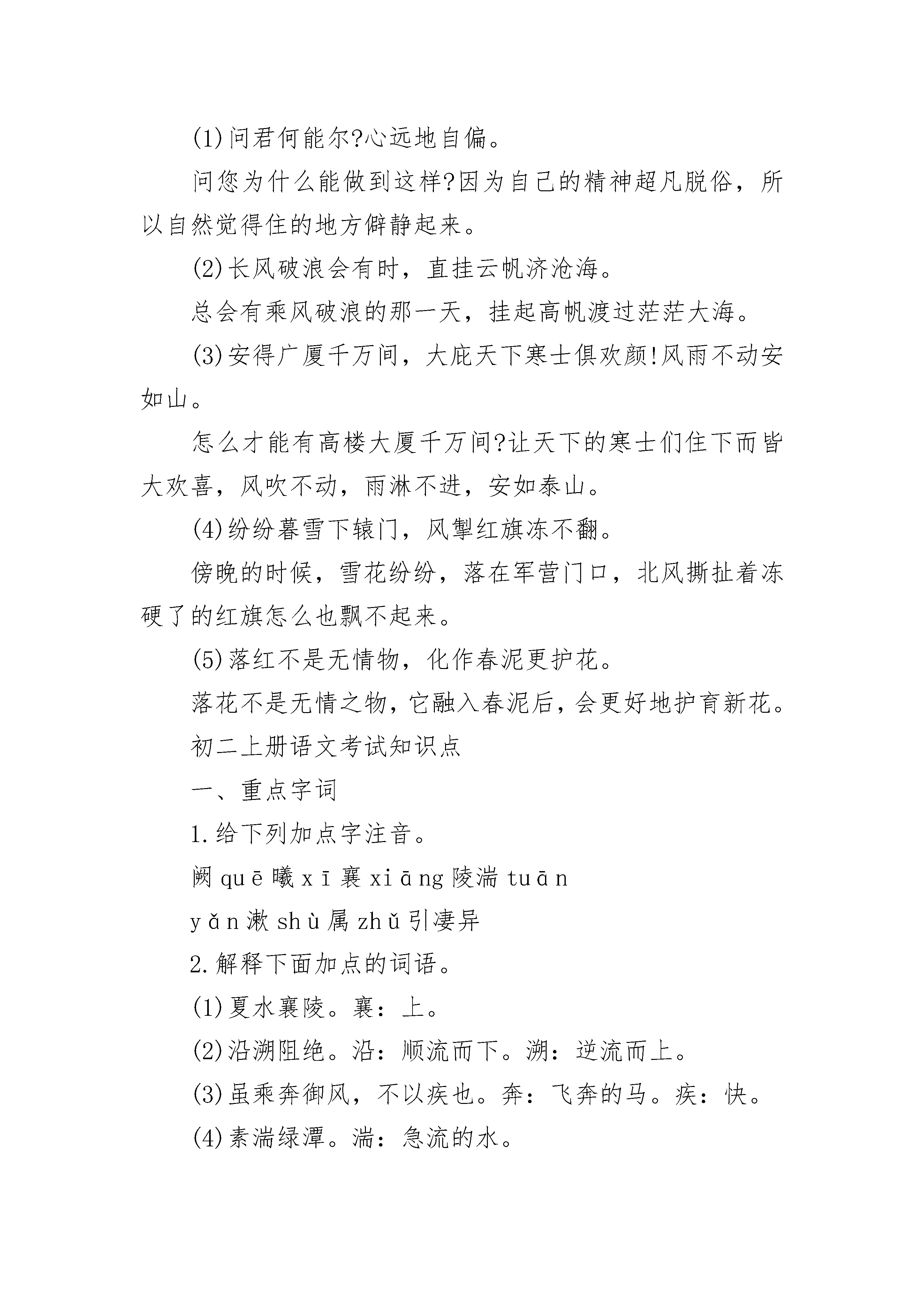 关于语文初二上册期中知识点一、重点字词1.给下列加点字注音。樽zūn箸zhù三重chóng茅挂罥juàn坳ào突兀wù狐裘qiú锦衾qīn瀚hàn海掣chè2.解释下面加点的词。(1)结庐在人境结:建造、构筑。(2)问君何能尔尔:这样。(3)直挂云帆济沧海济:-渡。(4)高者挂罥长林梢长:高。(5)秋天漠漠向昏黑向:渐近。(6)大庇天下寒士俱欢颜庇:遮盖,掩护。俱:都。(7)将军角弓不得控控:拉开。(8)风掣红旗冻不翻掣:拉,扯。(9)吟鞭东指即天涯吟:指吟诗。(10)落红不是无情物落红:落花。二、重点句子背记知识清单1.用原文填空。(1)问君何能尔?心远地自偏。(2)闲来垂钓碧溪上,忽复乘舟梦日边(3)停杯投箸不能食,拔剑四顾心茫然。(4)布衾多年冷似铁,娇儿恶卧踏里裂。(5)将军角弓不得控,都护铁衣冷难着。(6)浩荡离愁白日斜,吟鞭东指即天涯。(7)《饮酒》中表现诗人超脱尘世,热爱自然的千古名句是:采菊东篙下,悠然见南山。(8)《行路难》中运用典故写出诗人对从政仍有所期待的句子是:闲来垂钓碧溪上,忽复乘舟梦日边。(9)人们常用《行路难》中的:“长风破浪会有时,直挂云帆济沧海”来激励人们战胜挫折,为实现自己的人生理想而奋斗。(10)《白雪歌送武判官归京》中用奇特的想象写“雪”的名句是:忽如一夜春风来,千树万树梨花开。(11)《白雪歌送武判官归京》中夸张地描写胡地异常寒冷的诗句是;瀚诲阑干百丈冰,愁云惨淡万里凝。(12)《己亥杂诗》中,作者以落花为喻,表明心志的句子是:落红不是无情物,化作春泥更护花。(13)《白雪歌送武判官归京》中的“山回路转不见君,雪上空留马行处”,与“孤帆远影碧空尽,唯见长江天际流”有异曲同工之妙。(14)《茅屋为秋风所破歌》中写诗人推已及人的博大胸怀和他的美好理想的诗句是“安得广厦千万间,大庇天下寒士俱欢颜!风雨不动安如山”。(15)透过《茅屋为秋风所破歌》一诗,我们脑海里会浮现出这样一幅画面,一位瘦骨瞵峋的老人,手拄拐杖,仰天长叹曰:“呜呼!何时眼前突兀见此屋,吾庐独破受冻死亦足!”2.将下列句子翻译成现代汉语。(1)问君何能尔?心远地自偏。问您为什么能做到这样?因为自己的精神超凡脱俗,所以自然觉得住的地方僻静起来。(2)长风破浪会有时,直挂云帆济沧海。总会有乘风破浪的那一天,挂起高帆渡过茫茫大海。(3)安得广厦千万间,大庇天下寒士俱欢颜!风雨不动安如山。怎么才能有高楼大厦千万间?让天下的寒士们住下而皆大欢喜,风吹不动,雨淋不进,安如泰山。(4)纷纷暮雪下辕门,风掣红旗冻不翻。傍晚的时候,雪花纷纷,落在军营门口,北风撕扯着冻硬了的红旗怎么也飘不起来。(5)落红不是无情物,化作春泥更护花。落花不是无情之物,它融入春泥后,会更好地护育新花。初二上册语文考试知识点一、重点字词1.给下列加点字注音。阙quē曦xī襄xiāng陵湍tuānyǎn漱shù属zhǔ引凄异2.解释下面加点的词语。(1)夏水襄陵。襄:上。(2)沿溯阻绝。沿:顺流而下。溯:逆流而上。(3)虽乘奔御风,不以疾也。奔:飞奔的马。疾:快。(4)素湍绿潭。湍:急流的水。(5)清荣峻茂,良多趣味。良:实在。(6)属引凄异。属:连接。引:延长。(7)哀转久绝。绝;消失,停止。(8)悬泉瀑布,飞漱其间。飞漱:急流冲荡。二、重点句子背记知识清单1.用原文填空。(1)写三峡连绵、高耸的山势的句子是两岸连山,略无阙处。重岩叠嶂,隐天蔽日,自非亭午夜分,不见曦月。(2)写三峡夏季水势之大的句子是流之速的句子是夏水襄陵,沿溯阻绝。虽乘奔御风,不以疾也。(3)用以渲染三峡凄清悲凉气氛的渔歌是:"巴东三峡巫峡长,猿鸣三声泪沾裳。"点拨:"阙""曦""襄"等字易写错。2.将下列句子翻译成现代汉语。(1)自非亭午夜分,不见曦月。如果不是正午或半夜,是不能见到日月的。点拨:重点理解"自非""亭午""夜分"等词语。(2)素湍绿潭,回清倒影。白色的急流清波回旋,绿色的水潭倒映出各种景物的影子。点拨:重点理解"素湍""回清"等词语。(3)清荣峻茂,良多趣味。水清,树荣,山高,草盛,实在是趣味无穷。点拨:重点理解"清""荣""峻""茂"等词语。(4)常有高猿长啸,属引凄异,空谷传响,哀转久绝。常常听到高处传来猿猴的叫声,凄厉异常,绵延不息。(那叫声)在空谷中回荡,哀婉凄切,久久不绝。点拨:重点理解"属""引""绝"等词语。三、段背记知识清单默写描写三峡四季景色的内容。至于夏水襄陵,沿溯阻绝。或王命急宣,有时朝发白帝,暮到江陵,其间千二百里,虽乘奔御风,不以疾也。春冬之时,则素湍绿潭,回清倒影,绝多生怪柏,悬泉瀑布,飞漱其间,清荣峻茂,良多趣味。每至晴初霜旦,林寒涧肃,常有高猿长啸,属引凄异,空谷传响,哀转久绝。故渔者歌曰:"巴东三峡巫峡长,猿鸣三声泪沾裳。"点拨:这三段分别描
