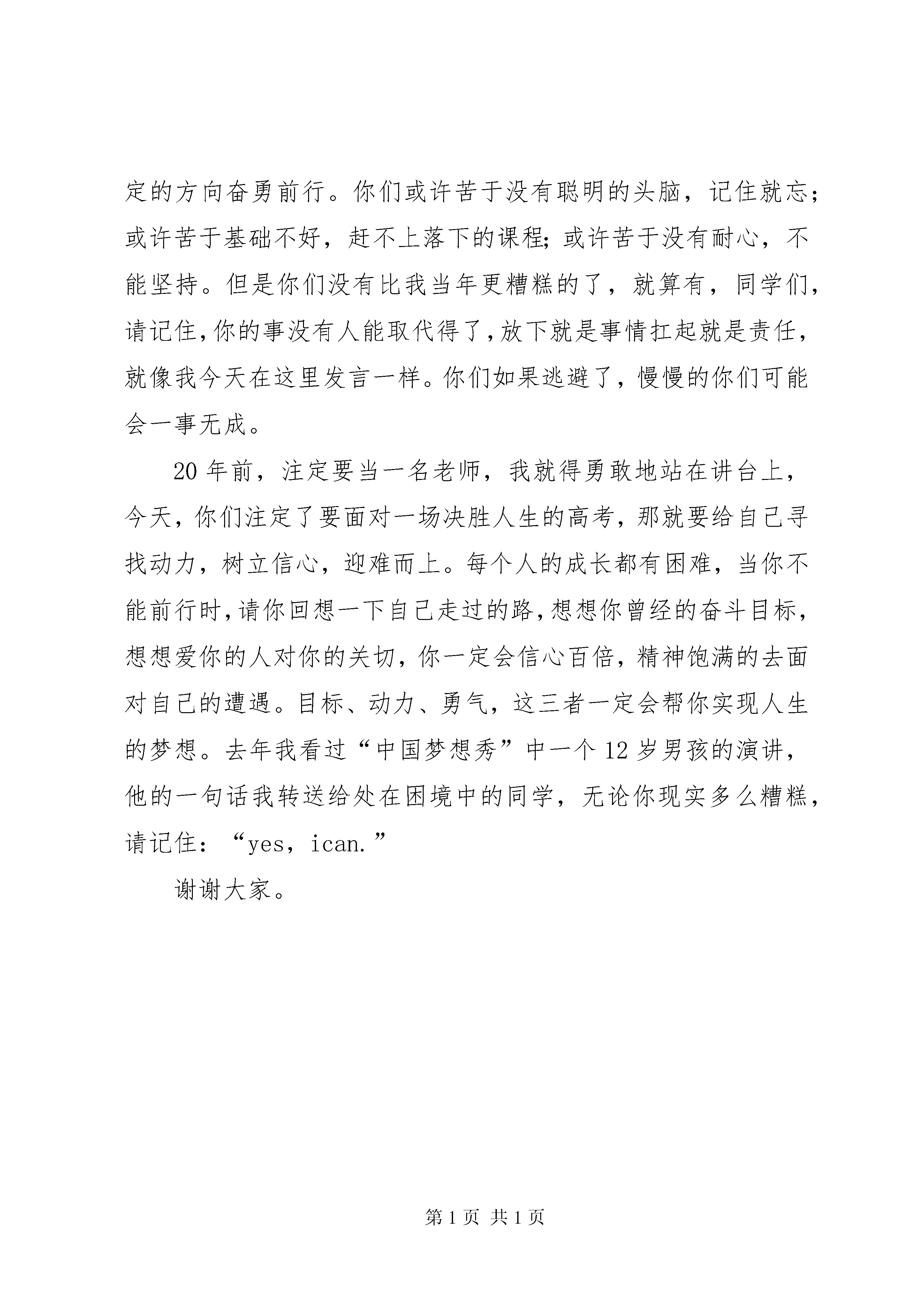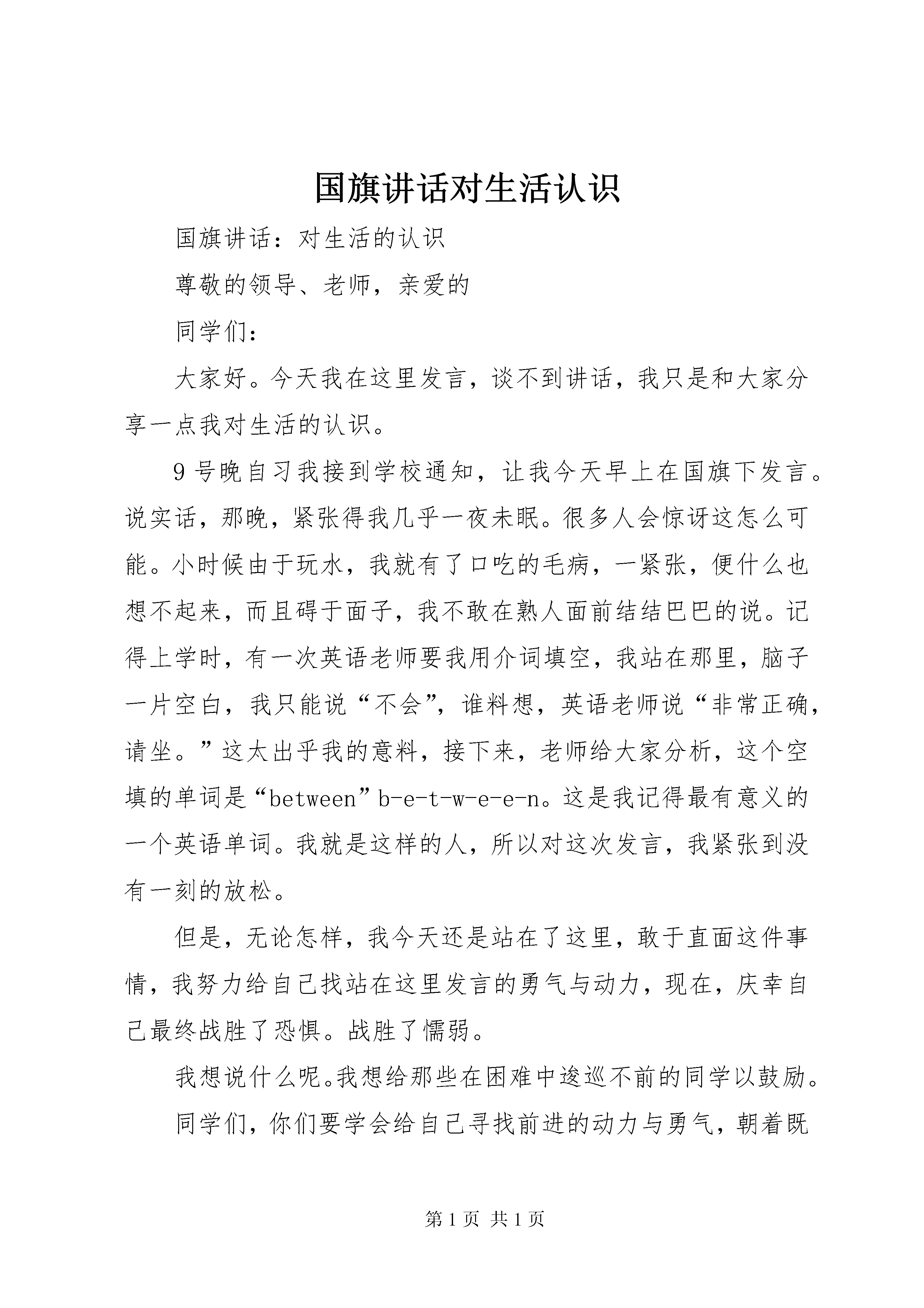 国旗讲话对生活认识国旗讲话:对生活的认识尊敬的领导、老师,亲爱的同学们:大家好。今天我在这里发言,谈不到讲话,我只是和大家分享一点我对生活的认识。9号晚自习我接到学校通知,让我今天早上在国旗下发言。说实话,那晚,紧张得我几乎一夜未眠。很多人会惊讶这怎么可能。小时候由于玩水,我就有了口吃的毛病,一紧张,便什么也想不起来,而且碍于面子,我不敢在熟人面前结结巴巴的说。记得上学时,有一次英语老师要我用介词填空,我站在那里,脑子一片空白,我只能说“不会”,谁料想,英语老师说“非常正确,请坐。”这太出乎我的意料,接下来,老师给大家分析,这个空填的单词是“between”b-e-t-w-e-e-n。这是我记得最有意义的一个英语单词。我就是这样的人,所以对这次发言,我紧张到没有一刻的放松。但是,无论怎样,我今天还是站在了这里,敢于直面这件事情,我努力给自己找站在这里发言的勇气与动力,现在,庆幸自己最终战胜了恐惧。战胜了懦弱。我想说什么呢。我想给那些在困难中逡巡不前的同学以鼓励。同学们,你们要学会给自己寻找前进的动力与勇气,朝着既定的方向奋勇前行。你们或许苦于没有聪明的头脑,记住就忘;或许苦于基础不好,赶不上落下的课程;或许苦于没有耐心,不能坚持。但是你们没有比我当年更糟糕的了,就算有,同学们,请记住,你的事没有人能取代得了,放下就是事情扛起就是责任,就像我今天在这里发言一样。你们如果逃避了,慢慢的你们可能会一事无成。20年前,注定要当一名老师,我就得勇敢地站在讲台上,今天,你们注定了要面对一场决胜人生的高考,那就要给自己寻找动力,树立信心,迎难而上。每个人的成长都有困难,当你不能前行时,请你回想一下自己走过的路,想想你曾经的奋斗目标,想想爱你的人对你的关切,你一定会信心百倍,精神饱满的去面对自己的遭遇。目标、动力、勇气,这三者一定会帮你实现人生的梦想。去年我看过“中国梦想秀”中一个12岁男孩的演讲,他的一句话我转送给处在困境中的同学,无论你现实多么糟糕,请记住:“yes,ican.”谢谢大家。
