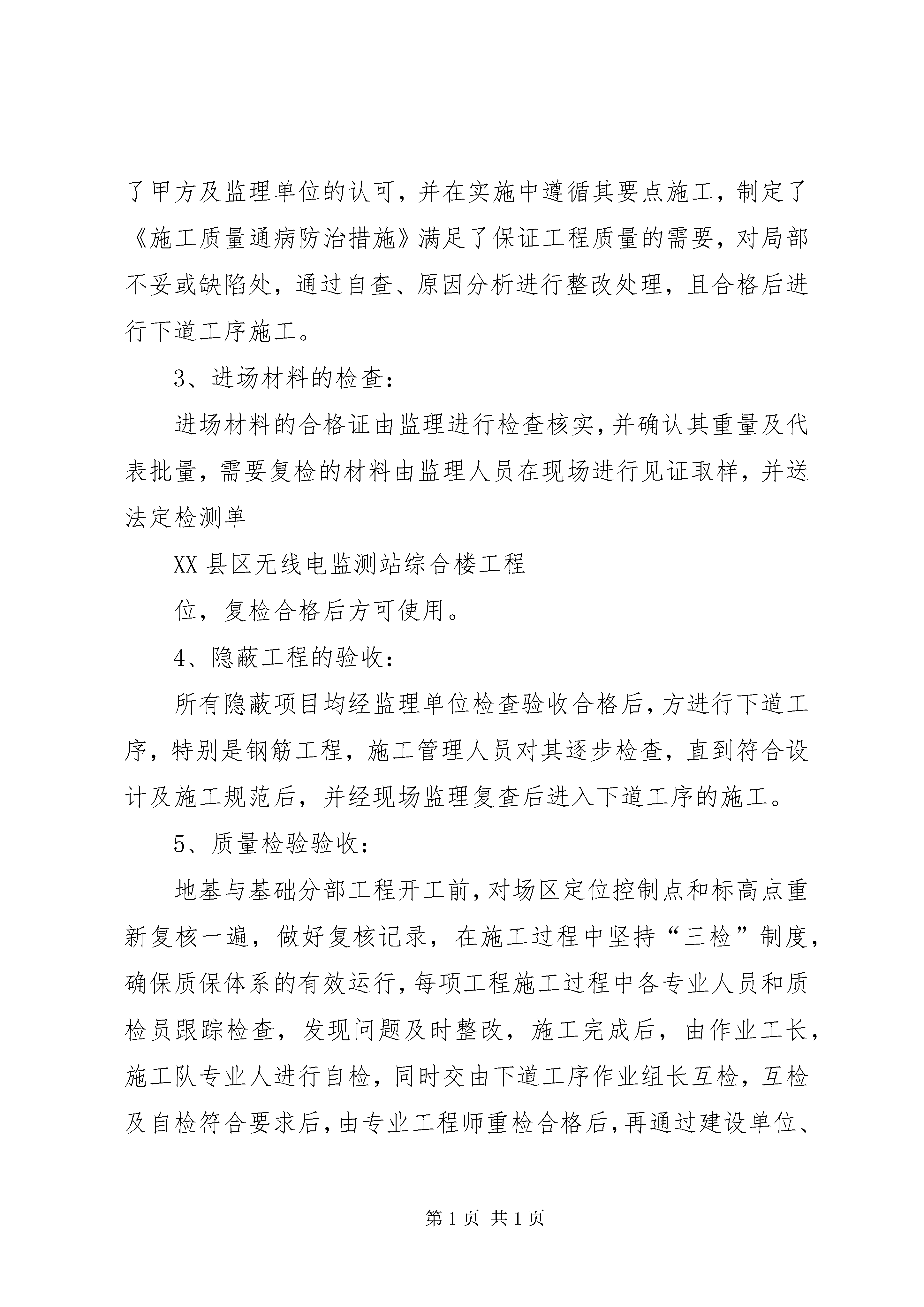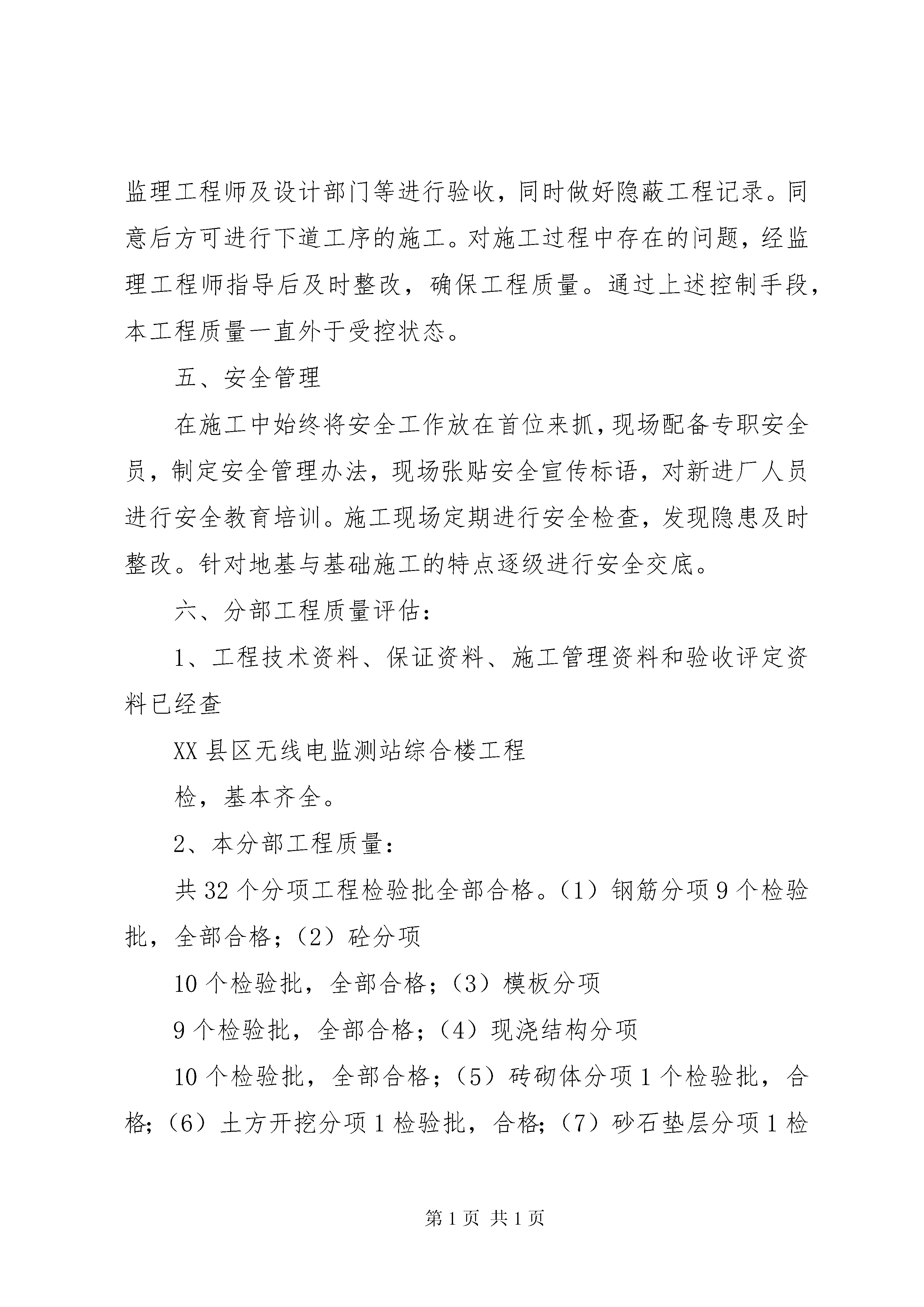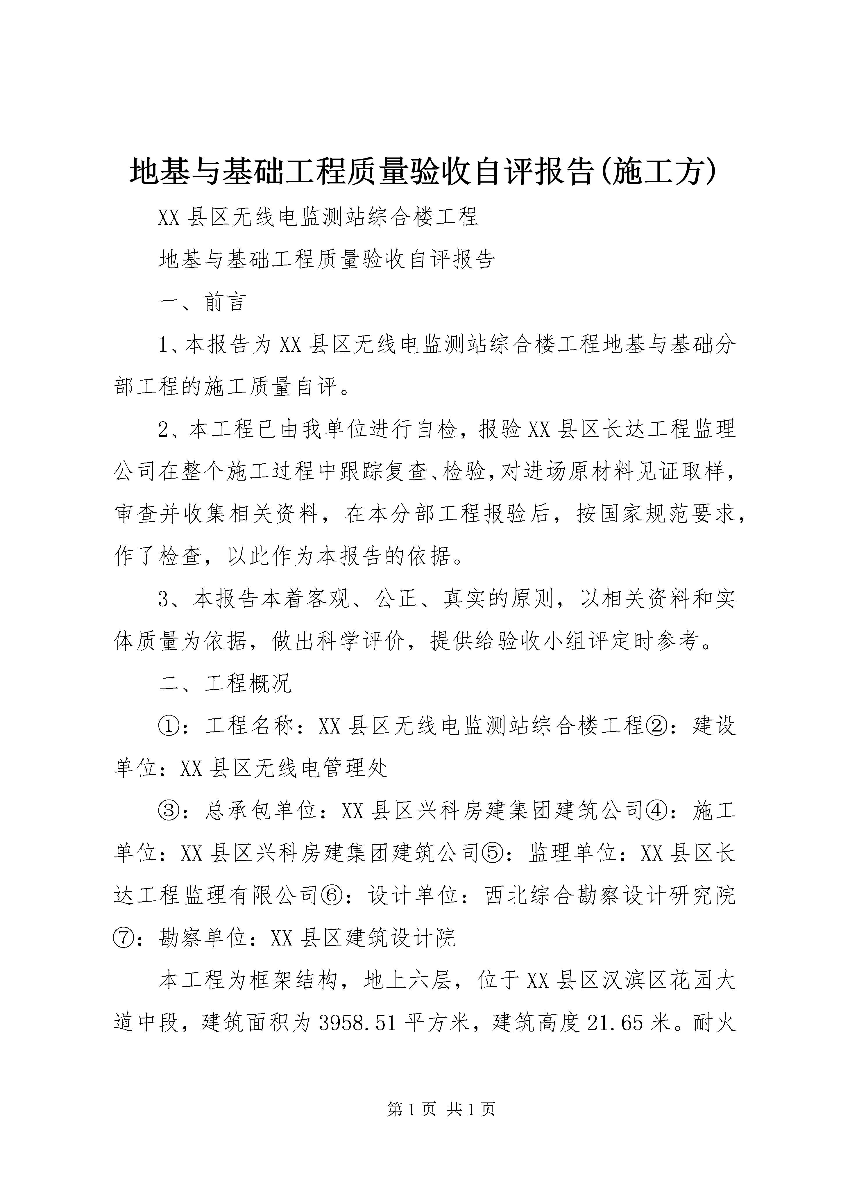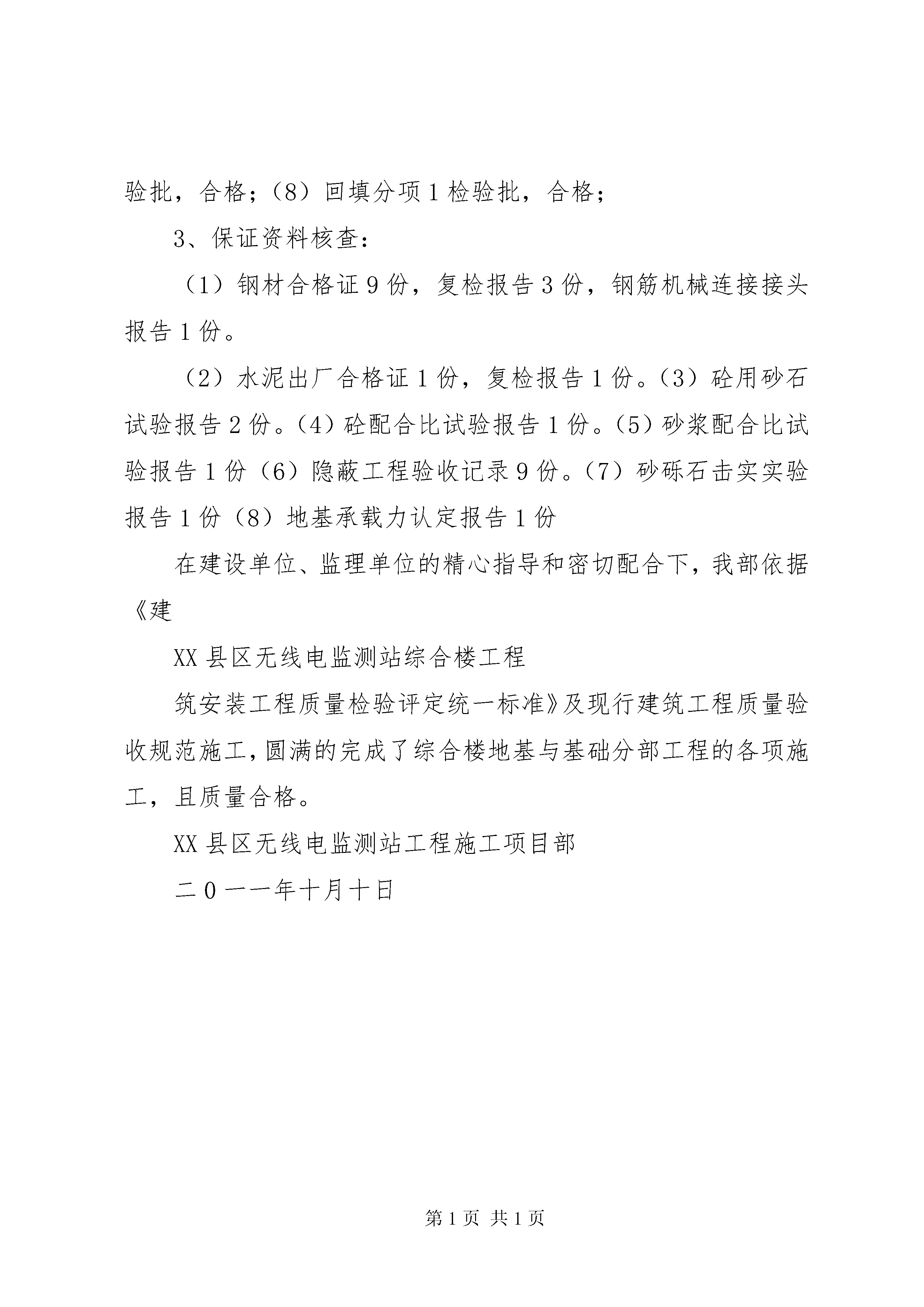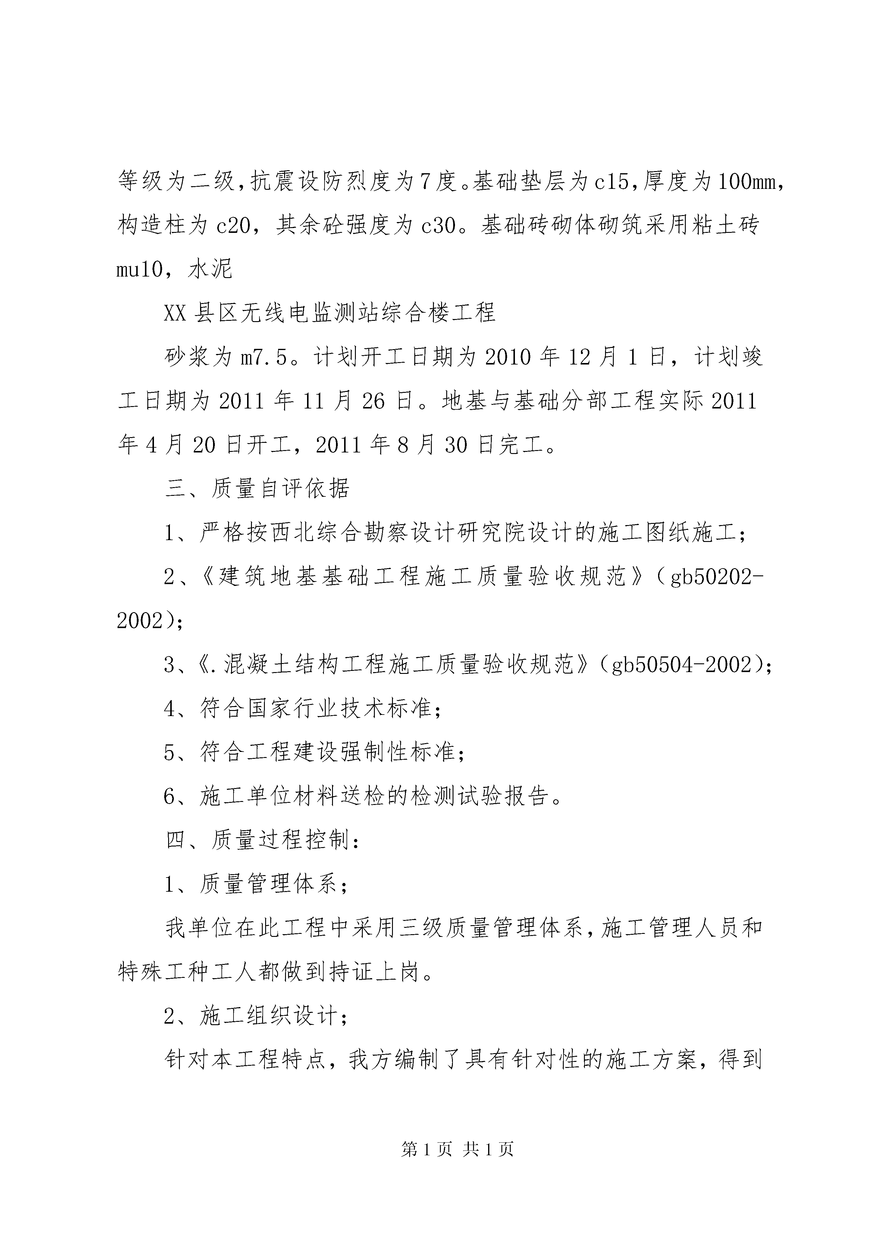 地基与基础工程质量验收自评报告(施工方)XX县区无线电监测站综合楼工程地基与基础工程质量验收自评报告一、前言1、本报告为XX县区无线电监测站综合楼工程地基与基础分部工程的施工质量自评。2、本工程已由我单位进行自检,报验XX县区长达工程监理公司在整个施工过程中跟踪复查、检验,对进场原材料见证取样,审查并收集相关资料,在本分部工程报验后,按国家规范要求,作了检查,以此作为本报告的依据。3、本报告本着客观、公正、真实的原则,以相关资料和实体质量为依据,做出科学评价,提供给验收小组评定时参考。二、工程概况①:工程名称:XX县区无线电监测站综合楼工程②:建设单位:XX县区无线电管理处③:总承包单位:XX县区兴科房建集团建筑公司④:施工单位:XX县区兴科房建集团建筑公司⑤:监理单位:XX县区长达工程监理有限公司⑥:设计单位:西北综合勘察设计研究院⑦:勘察单位:XX县区建筑设计院本工程为框架结构,地上六层,位于XX县区汉滨区花园大道中段,建筑面积为3958.51平方米,建筑高度21.65米。耐火等级为二级,抗震设防烈度为7度。基础垫层为c15,厚度为100mm,构造柱为c20,其余砼强度为c30。基础砖砌体砌筑采用粘土砖mu10,水泥XX县区无线电监测站综合楼工程砂浆为m7.5。计划开工日期为2010年12月1日,计划竣工日期为2011年11月26日。地基与基础分部工程实际2011年4月20日开工,2011年8月30日完工。三、质量自评依据1、严格按西北综合勘察设计研究院设计的施工图纸施工;2、《建筑地基基础工程施工质量验收规范》(gb50202-2002);3、《.混凝土结构工程施工质量验收规范》(gb50504-2002);4、符合国家行业技术标准;5、符合工程建设强制性标准;6、施工单位材料送检的检测试验报告。四、质量过程控制:1、质量管理体系;我单位在此工程中采用三级质量管理体系,施工管理人员和特殊工种工人都做到持证上岗。2、施工组织设计;针对本工程特点,我方编制了具有针对性的施工方案,得到了甲方及监理单位的认可,并在实施中遵循其要点施工,制定了《施工质量通病防治措施》满足了保证工程质量的需要,对局部不妥或缺陷处,通过自查、原因分析进行整改处理,且合格后进行下道工序施工。3、进场材料的检查:进场材料的合格证由监理进行检查核实,并确认其重量及代表批量,需要复检的材料由监理人员在现场进行见证取样,并送法定检测单XX县区无线电监测站综合楼工程位,复检合格后方可使用。4、隐蔽工程的验收:所有隐蔽项目均经监理单位检查验收合格后,方进行下道工序,特别是钢筋工程,施工管理人员对其逐步检查,直到符合设计及施工规范后,并经现场监理复查后进入下道工序的施工。5、质量检验验收:地基与基础分部工程开工前,对场区定位控制点和标高点重新复核一遍,做好复核记录,在施工过程中坚持“三检”制度,确保质保体系的有效运行,每项工程施工过程中各专业人员和质检员跟踪检查,发现问题及时整改,施工完成后,由作业工长,施工队专业人进行自检,同时交由下道工序作业组长互检,互检及自检符合要求后,由专业工程师重检合格后,再通过建设单位、监理工程师及设计部门等进行验收,同时做好隐蔽工程记录。同意后方可进行下道工序的施工。对施工过程中存在的问题,经监理工程师指导后及时整改,确保工程质量。通过上述控制手段,本工程质量一直外于受控状态。五、安全管理在施工中始终将安全工作放在首位来抓,现场配备专职安全员,制定安全管理办法,现场张贴安全宣传标语,对新进厂人员进行安全教育培训。施工现场定期进行安全检查,发现隐患及时整改。针对地基与基础施工的特点逐级进行安全交底。六、分部工程质量评估:1、工程技术资料、保证资料、施工管理资料和验收评定资料已经查XX县区无线电监测站综合楼工程检,基本齐全。2、本分部工程质量:共32个分项工程检验批全部合格。(1)钢筋分项9个检验批,全部合格;(2)砼分项10个检验批,全部合格;(3)模板分项9个检验批,全部合格;(4)现浇结构分项10个检验批,全部合格;(5)砖砌体分项1个检验批,合格;(6)土方开挖分项1检验批,合格;(7)砂石垫层分项1检验批,合格;(8)回填分项1检验批,合格;3、保证资料核查:(1)钢材合格证9份,复检报告3份,钢筋机械连接接头报告1份。(2)水泥出厂合格证1份,复检报告1份。(3)砼用砂石试验报告2份。(4)砼配合比试验报告1份。(5)砂浆配合比试验报告1份(6)隐蔽工程验收记录9份。(7)砂砾石击实实验报告1份(8)地基承载力认定报告1份在建设单位、监理单位的精心指导和密切配合下,我部依据《建XX县区无线电监测站综合楼工程筑安装工程质量检验评定统一标准》及现行建筑工程质量验收规范施工,圆满的完成了综合楼地基与基础分部