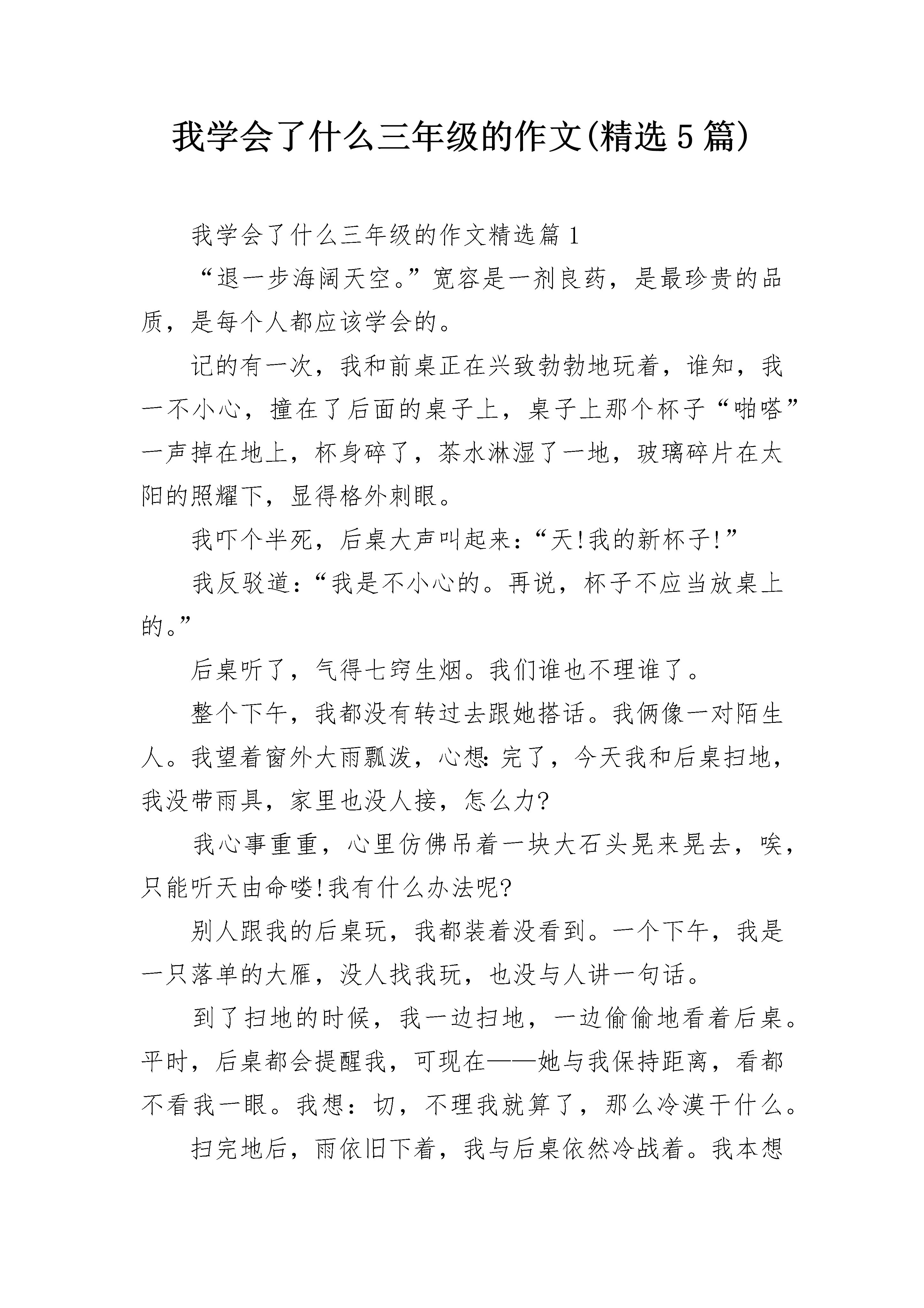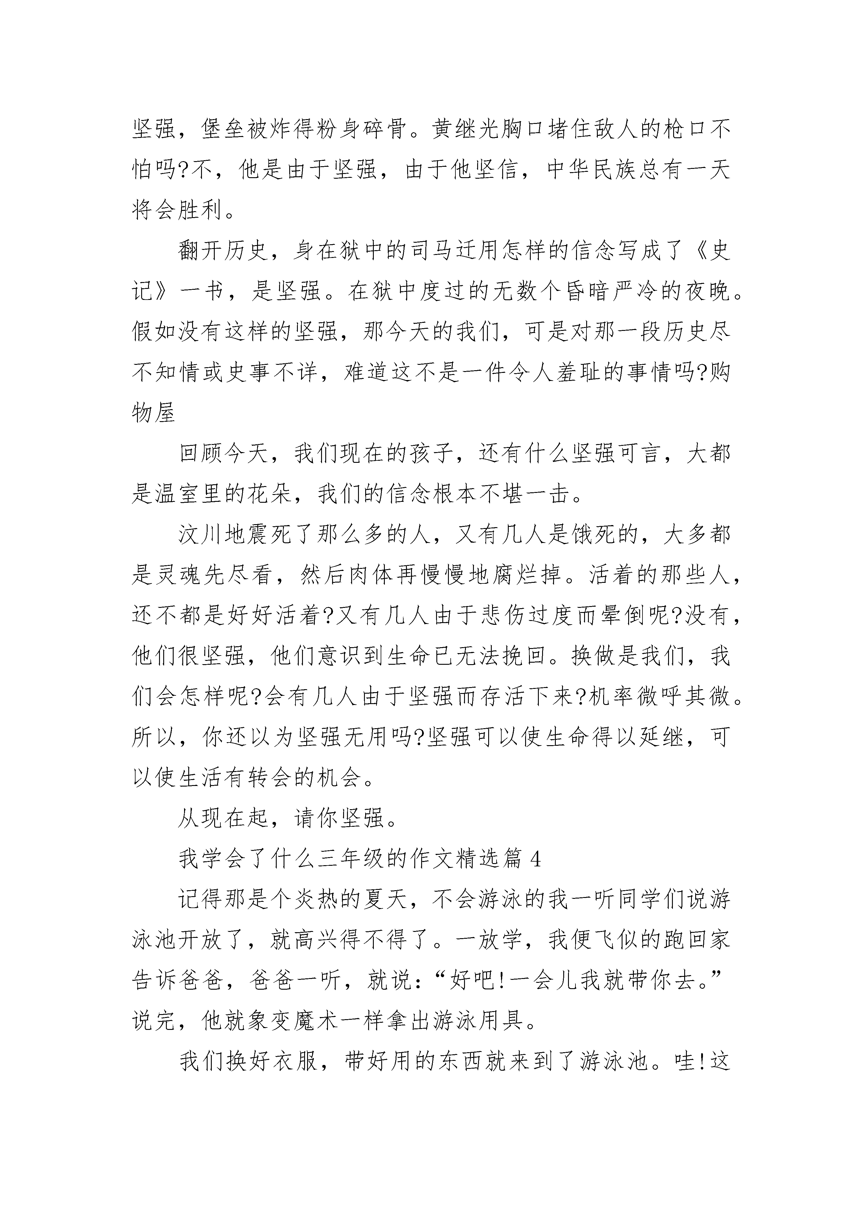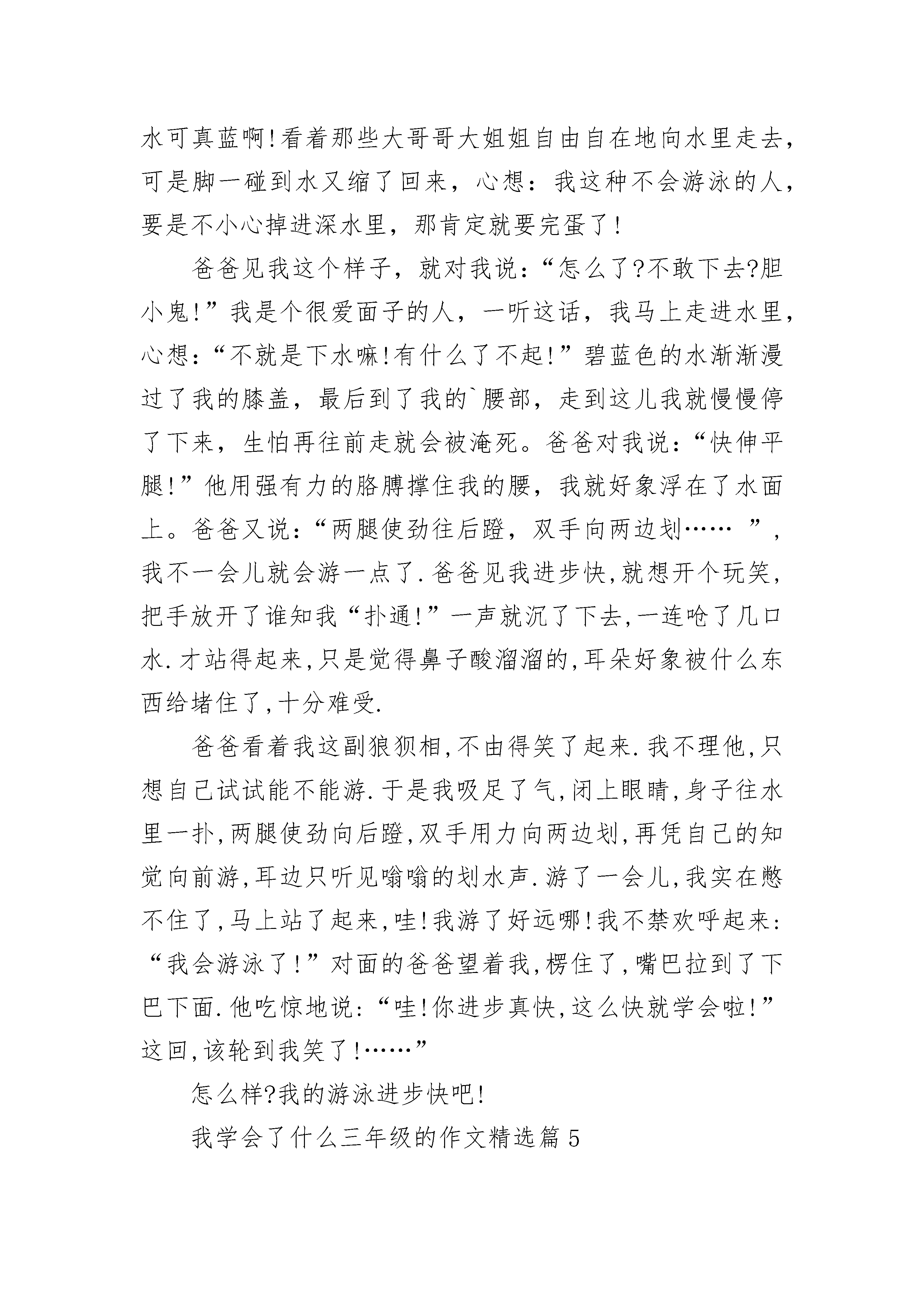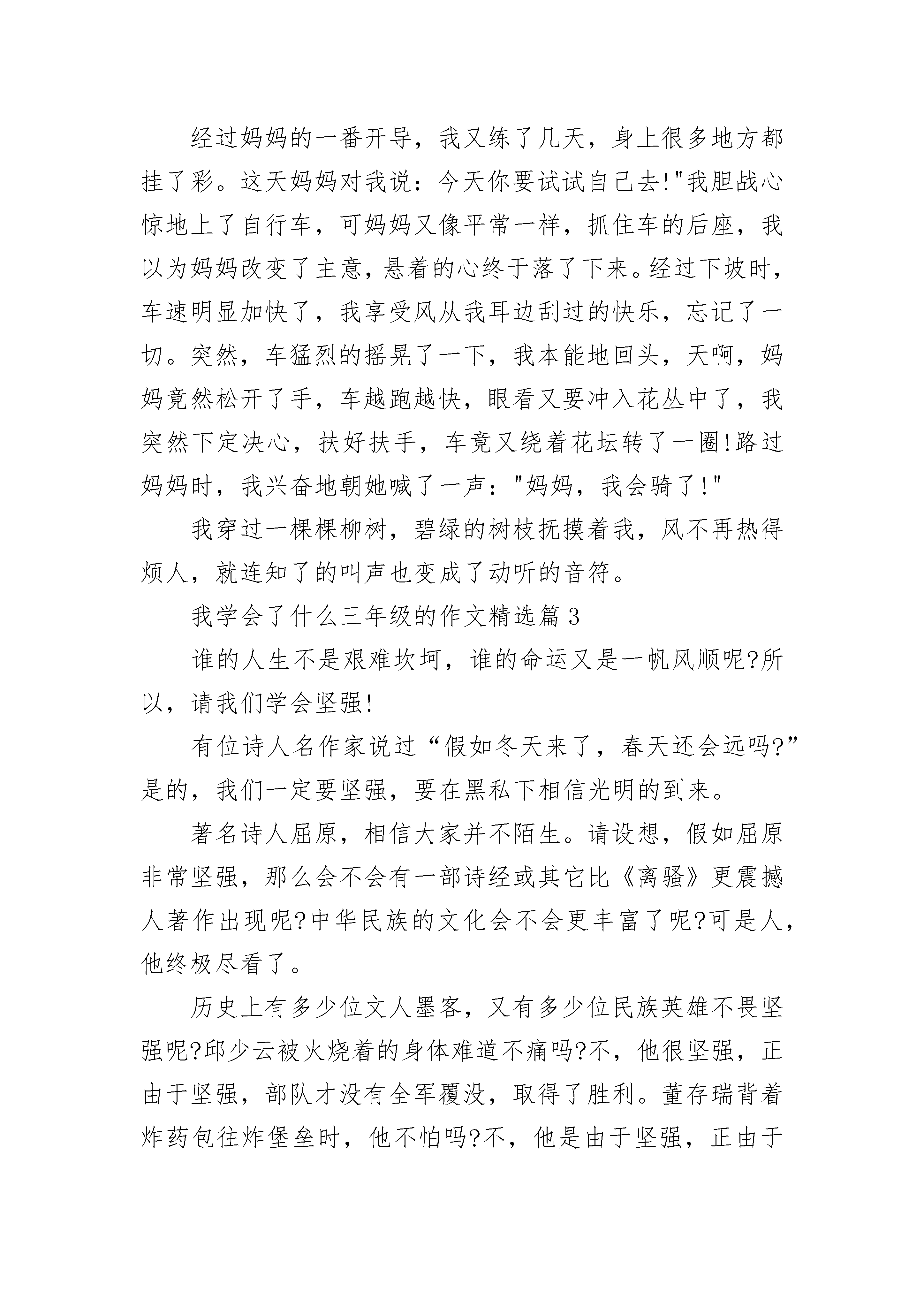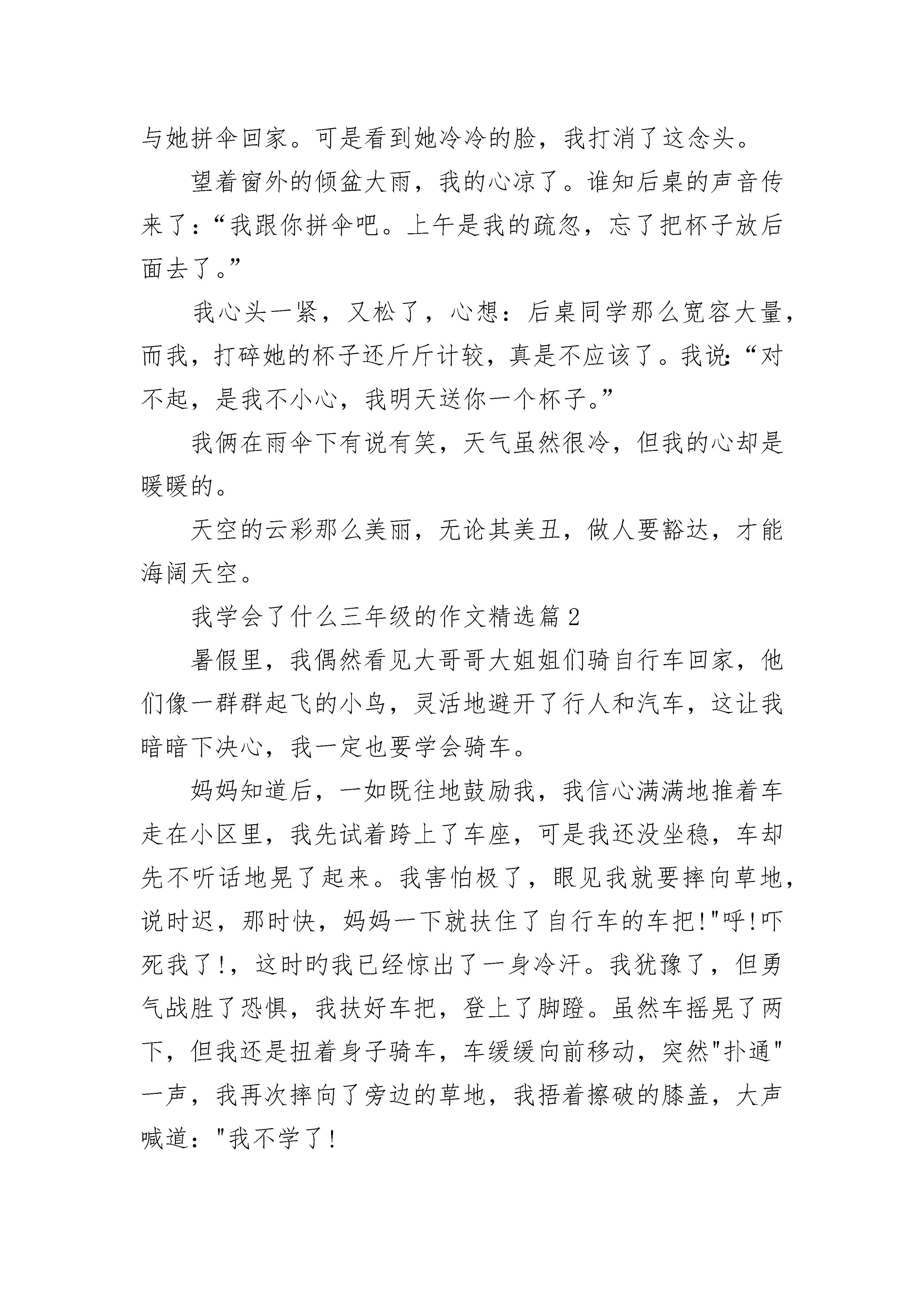 我学会了什么三年级的作文(精选5篇)我学会了什么三年级的作文精选篇1“退一步海阔天空。”宽容是一剂良药,是最珍贵的品质,是每个人都应该学会的。记的有一次,我和前桌正在兴致勃勃地玩着,谁知,我一不小心,撞在了后面的桌子上,桌子上那个杯子“啪嗒”一声掉在地上,杯身碎了,茶水淋湿了一地,玻璃碎片在太阳的照耀下,显得格外刺眼。我吓个半死,后桌大声叫起来:“天!我的新杯子!”我反驳道:“我是不小心的。再说,杯子不应当放桌上的。”后桌听了,气得七窍生烟。我们谁也不理谁了。整个下午,我都没有转过去跟她搭话。我俩像一对陌生人。我望着窗外大雨瓢泼,心想:完了,今天我和后桌扫地,我没带雨具,家里也没人接,怎么力?我心事重重,心里仿佛吊着一块大石头晃来晃去,唉,只能听天由命喽!我有什么办法呢?别人跟我的后桌玩,我都装着没看到。一个下午,我是一只落单的大雁,没人找我玩,也没与人讲一句话。到了扫地的时候,我一边扫地,一边偷偷地看着后桌。平时,后桌都会提醒我,可现在——她与我保持距离,看都不看我一眼。我想:切,不理我就算了,那么冷漠干什么。扫完地后,雨依旧下着,我与后桌依然冷战着。我本想与她拼伞回家。可是看到她冷冷的脸,我打消了这念头。望着窗外的倾盆大雨,我的心凉了。谁知后桌的声音传来了:“我跟你拼伞吧。上午是我的疏忽,忘了把杯子放后面去了。”我心头一紧,又松了,心想:后桌同学那么宽容大量,而我,打碎她的杯子还斤斤计较,真是不应该了。我说:“对不起,是我不小心,我明天送你一个杯子。”我俩在雨伞下有说有笑,天气虽然很冷,但我的心却是暖暖的。天空的云彩那么美丽,无论其美丑,做人要豁达,才能海阔天空。我学会了什么三年级的作文精选篇2暑假里,我偶然看见大哥哥大姐姐们骑自行车回家,他们像一群群起飞的小鸟,灵活地避开了行人和汽车,这让我暗暗下决心,我一定也要学会骑车。妈妈知道后,一如既往地鼓励我,我信心满满地推着车走在小区里,我先试着跨上了车座,可是我还没坐稳,车却先不听话地晃了起来。我害怕极了,眼见我就要摔向草地,说时迟,那时快,妈妈一下就扶住了自行车的车把!"呼!吓死我了!,这时旳我已经惊出了一身冷汗。我犹豫了,但勇气战胜了恐惧,我扶好车把,登上了脚蹬。虽然车摇晃了两下,但我还是扭着身子骑车,车缓缓向前移动,突然"扑通"一声,我再次摔向了旁边的草地,我捂着擦破的膝盖,大声喊道:"我不学了!经过妈妈的一番开导,我又练了几天,身上很多地方都挂了彩。这天妈妈对我说:今天你要试试自己去!"我胆战心惊地上了自行车,可妈妈又像平常一样,抓住车的后座,我以为妈妈改变了主意,悬着的心终于落了下来。经过下坡时,车速明显加快了,我享受风从我耳边刮过的快乐,忘记了一切。突然,车猛烈的摇晃了一下,我本能地回头,天啊,妈妈竟然松开了手,车越跑越快,眼看又要冲入花丛中了,我突然下定决心,扶好扶手,车竟又绕着花坛转了一圈!路过妈妈时,我兴奋地朝她喊了一声:"妈妈,我会骑了!"我穿过一棵棵柳树,碧绿的树枝抚摸着我,风不再热得烦人,就连知了的叫声也变成了动听的音符。我学会了什么三年级的作文精选篇3谁的人生不是艰难坎坷,谁的命运又是一帆风顺呢?所以,请我们学会坚强!有位诗人名作家说过“假如冬天来了,春天还会远吗?”是的,我们一定要坚强,要在黑私下相信光明的到来。著名诗人屈原,相信大家并不陌生。请设想,假如屈原非常坚强,那么会不会有一部诗经或其它比《离骚》更震撼人著作出现呢?中华民族的文化会不会更丰富了呢?可是人,他终极尽看了。历史上有多少位文人墨客,又有多少位民族英雄不畏坚强呢?邱少云被火烧着的身体难道不痛吗?不,他很坚强,正由于坚强,部队才没有全军覆没,取得了胜利。董存瑞背着炸药包往炸堡垒时,他不怕吗?不,他是由于坚强,正由于坚强,堡垒被炸得粉身碎骨。黄继光胸口堵住敌人的枪口不怕吗?不,他是由于坚强,由于他坚信,中华民族总有一天将会胜利。翻开历史,身在狱中的司马迁用怎样的信念写成了《史记》一书,是坚强。在狱中度过的无数个昏暗严冷的夜晚。假如没有这样的坚强,那今天的我们,可是对那一段历史尽不知情或史事不详,难道这不是一件令人羞耻的事情吗?购物屋回顾今天,我们现在的孩子,还有什么坚强可言,大都是温室里的花朵,我们的信念根本不堪一击。汶川地震死了那么多的人,又有几人是饿死的,大多都是灵魂先尽看,然后肉体再慢慢地腐烂掉。活着的那些人,还不都是好好活着?又有几人由于悲伤过度而晕倒呢?没有,他们很坚强,他们意识到生命已无法挽回。换做是我们,我们会怎样呢?会有几人由于坚强而存活下来?机率微呼其微。所以,你还以为坚强无用吗?坚强可以使生命得以延继,可以使生活有转会的机会。从现在起,请你坚强。我学会了什么三年级的作文精选篇4记得那是个炎热的夏天,不会游泳的我一听同学们说游泳池开放了,就高兴得不得了。一放学,我