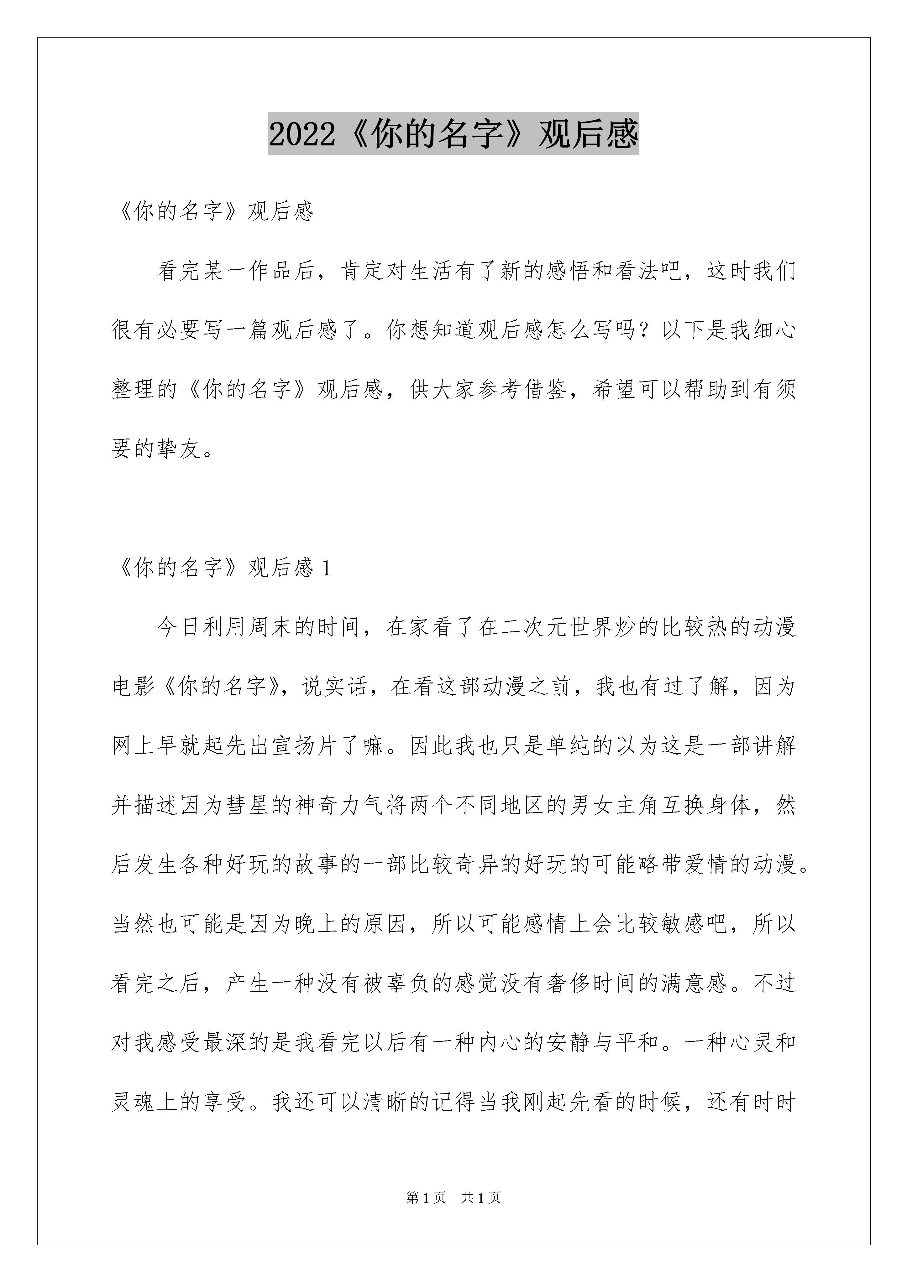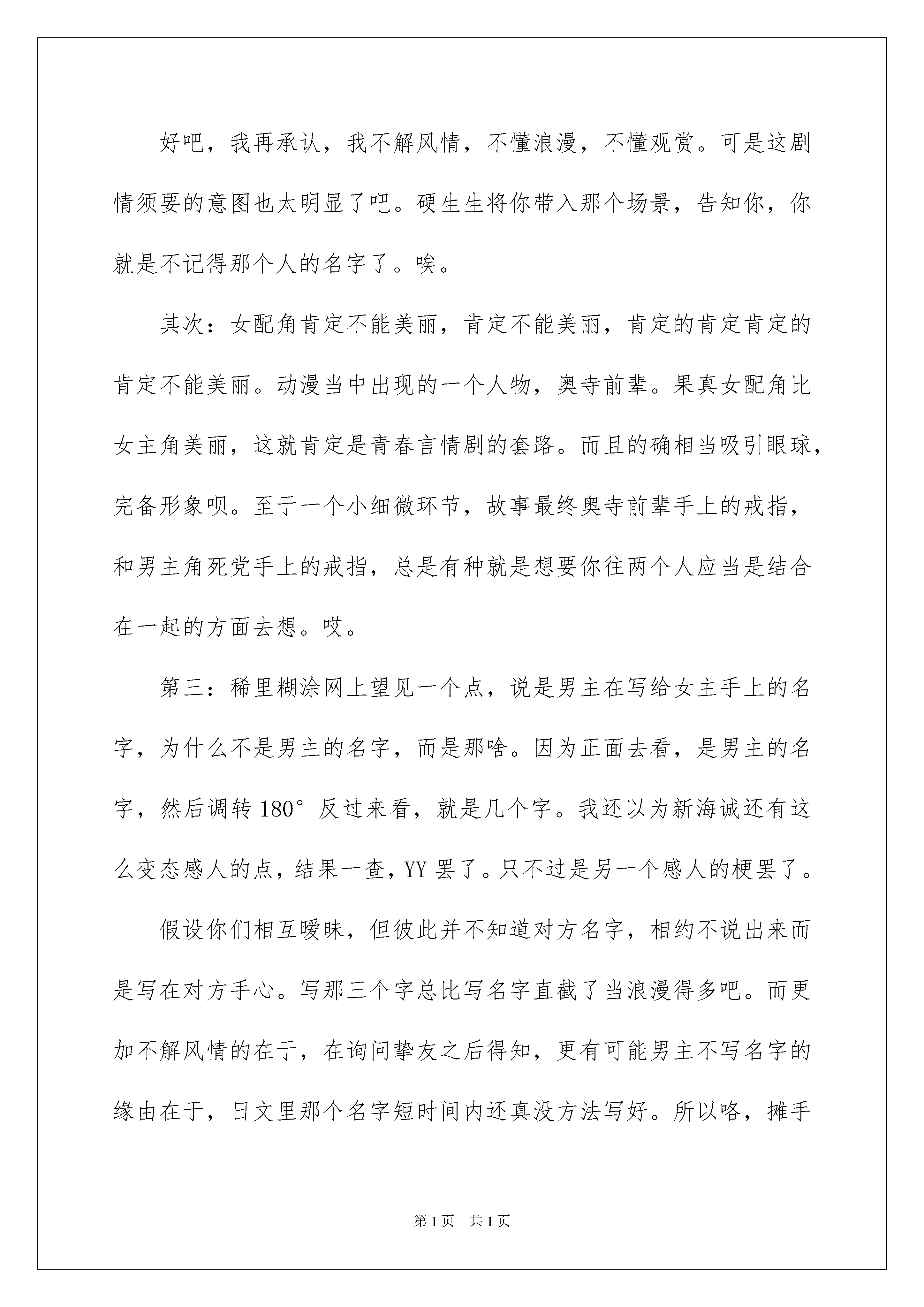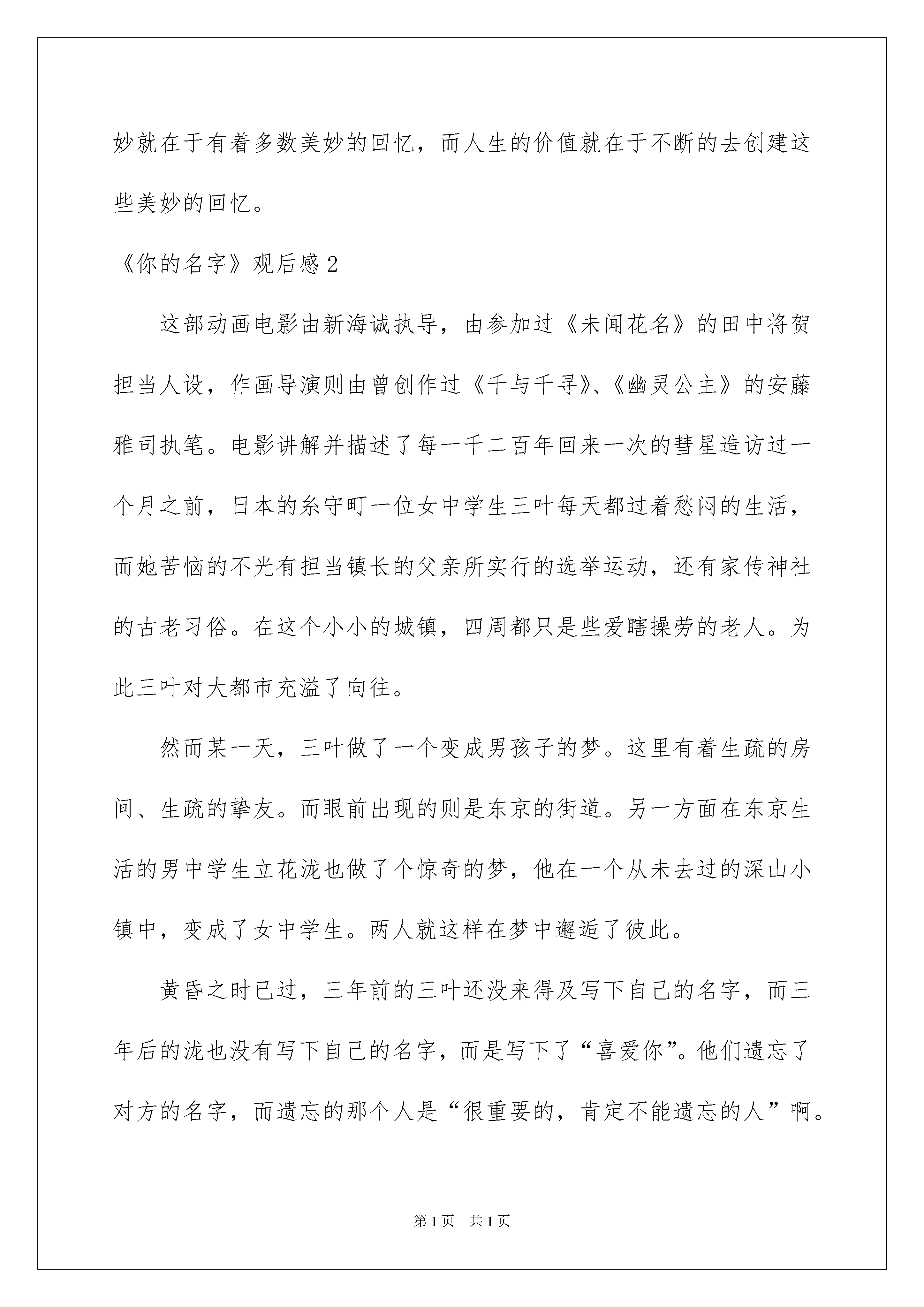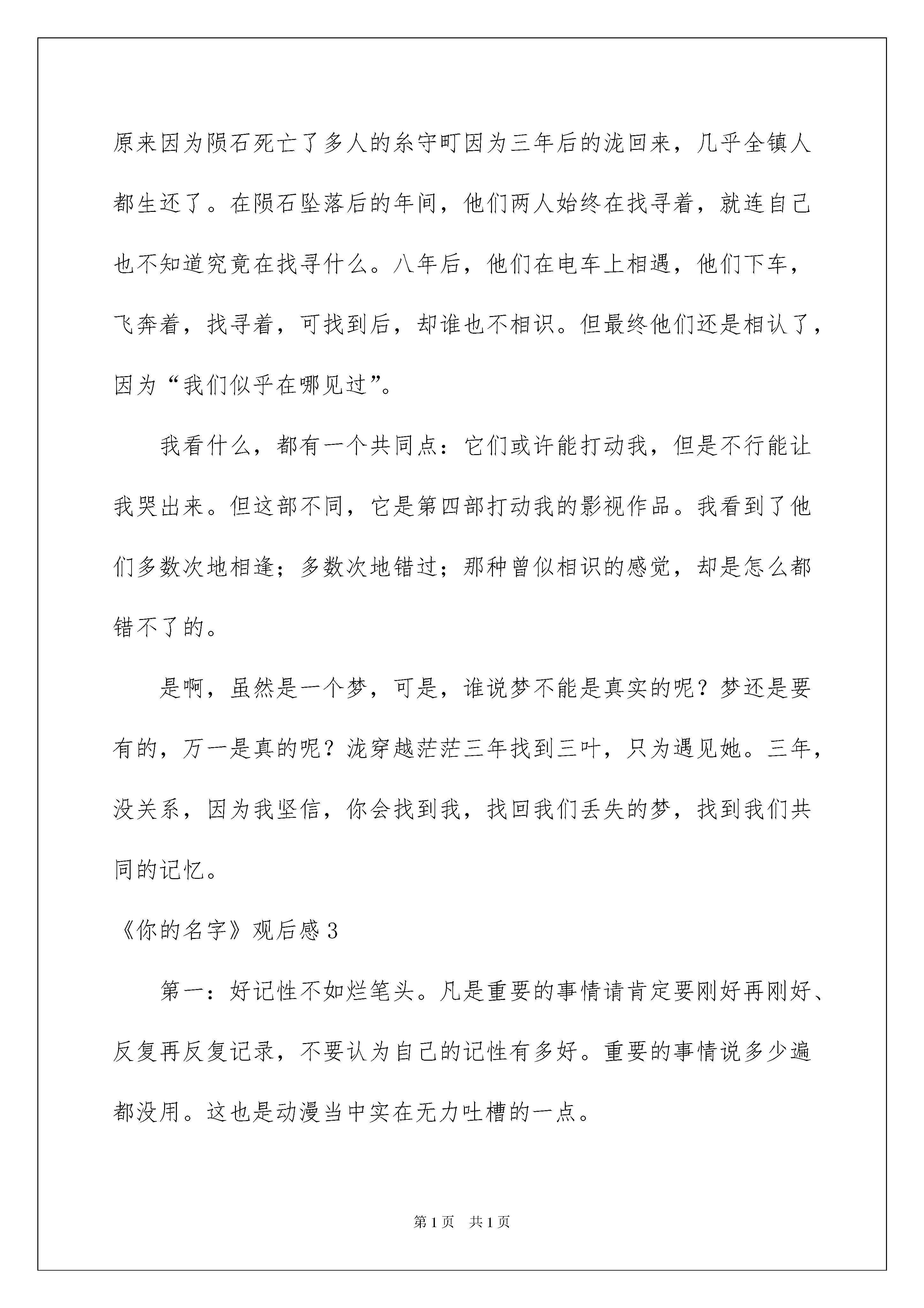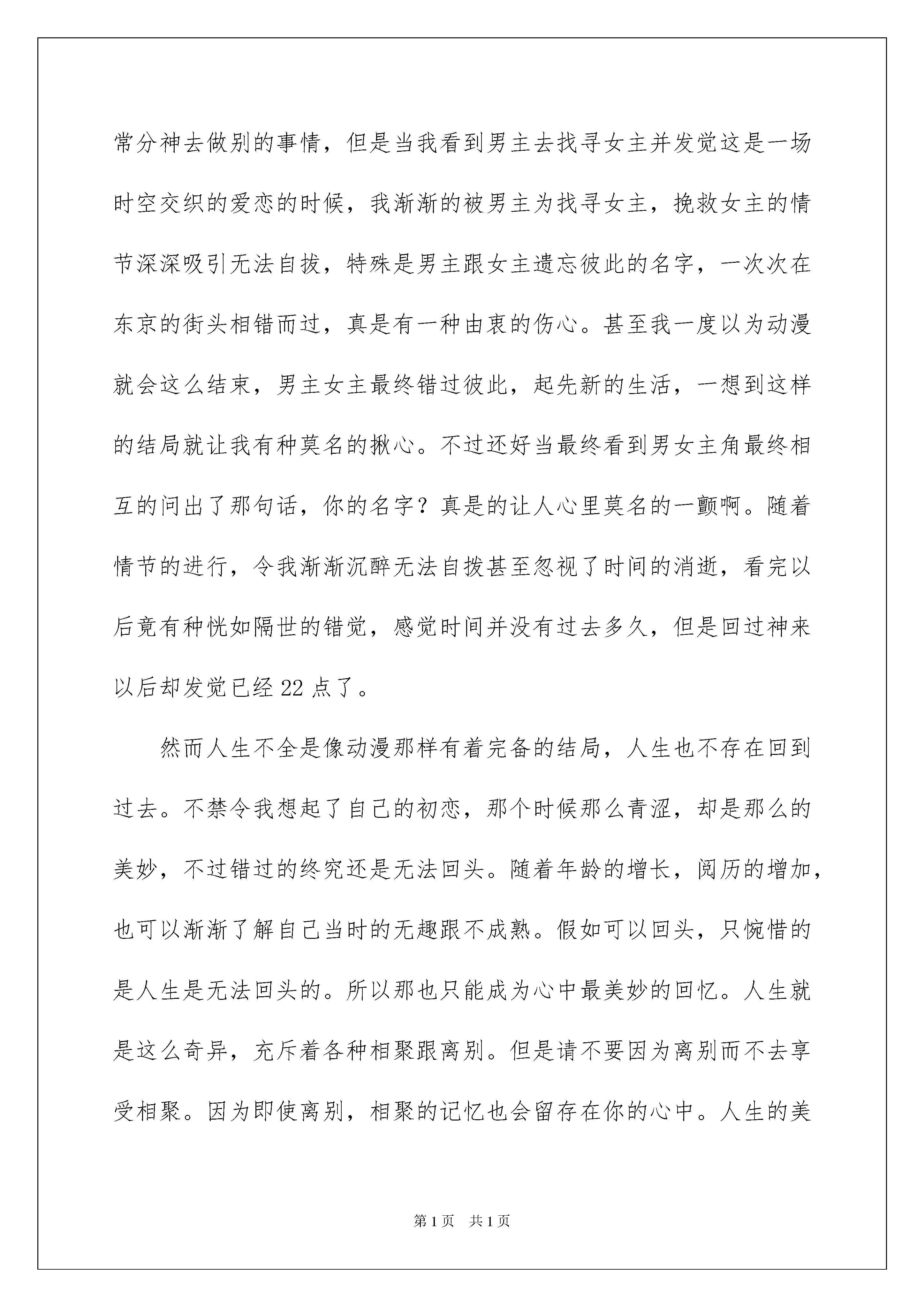 2022《你的名字》观后感《你的名字》观后感看完某一作品后,肯定对生活有了新的感悟和看法吧,这时我们很有必要写一篇观后感了。你想知道观后感怎么写吗?以下是我细心整理的《你的名字》观后感,供大家参考借鉴,希望可以帮助到有须要的挚友。《你的名字》观后感1今日利用周末的时间,在家看了在二次元世界炒的比较热的动漫电影《你的名字》,说实话,在看这部动漫之前,我也有过了解,因为网上早就起先出宣扬片了嘛。因此我也只是单纯的以为这是一部讲解并描述因为彗星的神奇力气将两个不同地区的男女主角互换身体,然后发生各种好玩的故事的一部比较奇异的好玩的可能略带爱情的动漫。当然也可能是因为晚上的原因,所以可能感情上会比较敏感吧,所以看完之后,产生一种没有被辜负的感觉没有奢侈时间的满意感。不过对我感受最深的是我看完以后有一种内心的安静与平和。一种心灵和灵魂上的享受。我还可以清晰的记得当我刚起先看的时候,还有时时常分神去做别的事情,但是当我看到男主去找寻女主并发觉这是一场时空交织的爱恋的时候,我渐渐的被男主为找寻女主,挽救女主的情节深深吸引无法自拔,特殊是男主跟女主遗忘彼此的名字,一次次在东京的街头相错而过,真是有一种由衷的伤心。甚至我一度以为动漫就会这么结束,男主女主最终错过彼此,起先新的生活,一想到这样的结局就让我有种莫名的揪心。不过还好当最终看到男女主角最终相互的问出了那句话,你的名字?真是的让人心里莫名的一颤啊。随着情节的进行,令我渐渐沉醉无法自拨甚至忽视了时间的消逝,看完以后竟有种恍如隔世的错觉,感觉时间并没有过去多久,但是回过神来以后却发觉已经22点了。然而人生不全是像动漫那样有着完备的结局,人生也不存在回到过去。不禁令我想起了自己的初恋,那个时候那么青涩,却是那么的美妙,不过错过的终究还是无法回头。随着年龄的增长,阅历的增加,也可以渐渐了解自己当时的无趣跟不成熟。假如可以回头,只惋惜的是人生是无法回头的。所以那也只能成为心中最美妙的回忆。人生就是这么奇异,充斥着各种相聚跟离别。但是请不要因为离别而不去享受相聚。因为即使离别,相聚的记忆也会留存在你的心中。人生的美妙就在于有着多数美妙的回忆,而人生的价值就在于不断的去创建这些美妙的回忆。《你的名字》观后感2这部动画电影由新海诚执导,由参加过《未闻花名》的田中将贺担当人设,作画导演则由曾创作过《千与千寻》、《幽灵公主》的安藤雅司执笔。电影讲解并描述了每一千二百年回来一次的彗星造访过一个月之前,日本的糸守町一位女中学生三叶每天都过着愁闷的生活,而她苦恼的不光有担当镇长的父亲所实行的选举运动,还有家传神社的古老习俗。在这个小小的城镇,四周都只是些爱瞎操劳的老人。为此三叶对大都市充溢了向往。然而某一天,三叶做了一个变成男孩子的梦。这里有着生疏的房间、生疏的挚友。而眼前出现的则是东京的街道。另一方面在东京生活的男中学生立花泷也做了个惊奇的梦,他在一个从未去过的深山小镇中,变成了女中学生。两人就这样在梦中邂逅了彼此。黄昏之时已过,三年前的三叶还没来得及写下自己的名字,而三年后的泷也没有写下自己的名字,而是写下了“喜爱你”。他们遗忘了对方的名字,而遗忘的那个人是“很重要的,肯定不能遗忘的人”啊。原来因为陨石死亡了多人的糸守町因为三年后的泷回来,几乎全镇人都生还了。在陨石坠落后的年间,他们两人始终在找寻着,就连自己也不知道究竟在找寻什么。八年后,他们在电车上相遇,他们下车,飞奔着,找寻着,可找到后,却谁也不相识。但最终他们还是相认了,因为“我们似乎在哪见过”。我看什么,都有一个共同点:它们或许能打动我,但是不行能让我哭出来。但这部不同,它是第四部打动我的影视作品。我看到了他们多数次地相逢;多数次地错过;那种曾似相识的感觉,却是怎么都错不了的。是啊,虽然是一个梦,可是,谁说梦不能是真实的呢?梦还是要有的,万一是真的呢?泷穿越茫茫三年找到三叶,只为遇见她。三年,没关系,因为我坚信,你会找到我,找回我们丢失的梦,找到我们共同的记忆。《你的名字》观后感3第一:好记性不如烂笔头。凡是重要的事情请肯定要刚好再刚好、反复再反复记录,不要认为自己的记性有多好。重要的事情说多少遍都没用。这也是动漫当中实在无力吐槽的一点。好吧,我再承认,我不解风情,不懂浪漫,不懂观赏。可是这剧情须要的意图也太明显了吧。硬生生将你带入那个场景,告知你,你就是不记得那个人的名字了。唉。其次:女配角肯定不能美丽,肯定不能美丽,肯定的肯定肯定的肯定不能美丽。动漫当中出现的一个人物,奥寺前辈。果真女配角比女主角美丽,这就肯定是青春言情剧的套路。而且的确相当吸引眼球,完备形象呗。至于一个小细微环节,故事最终