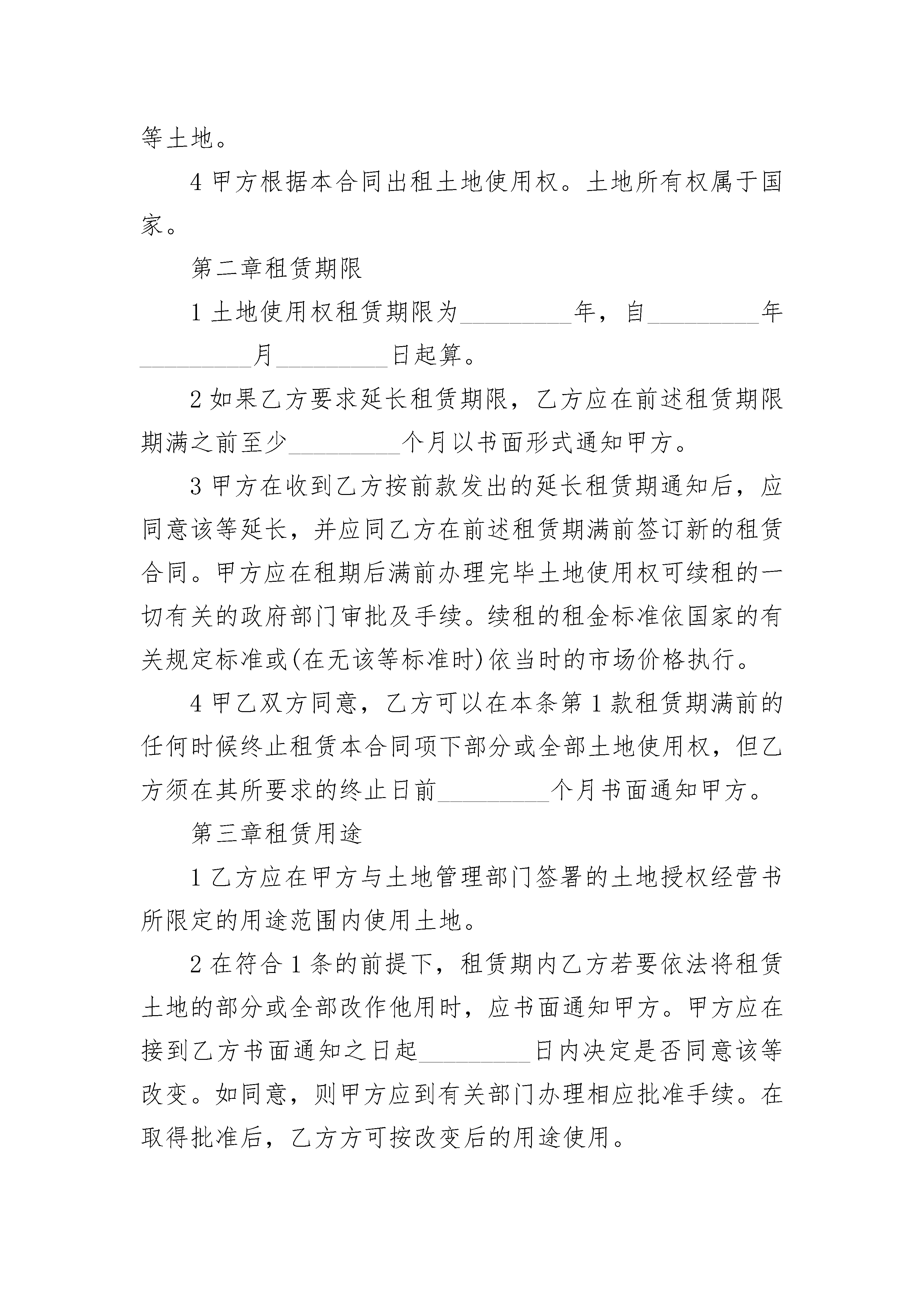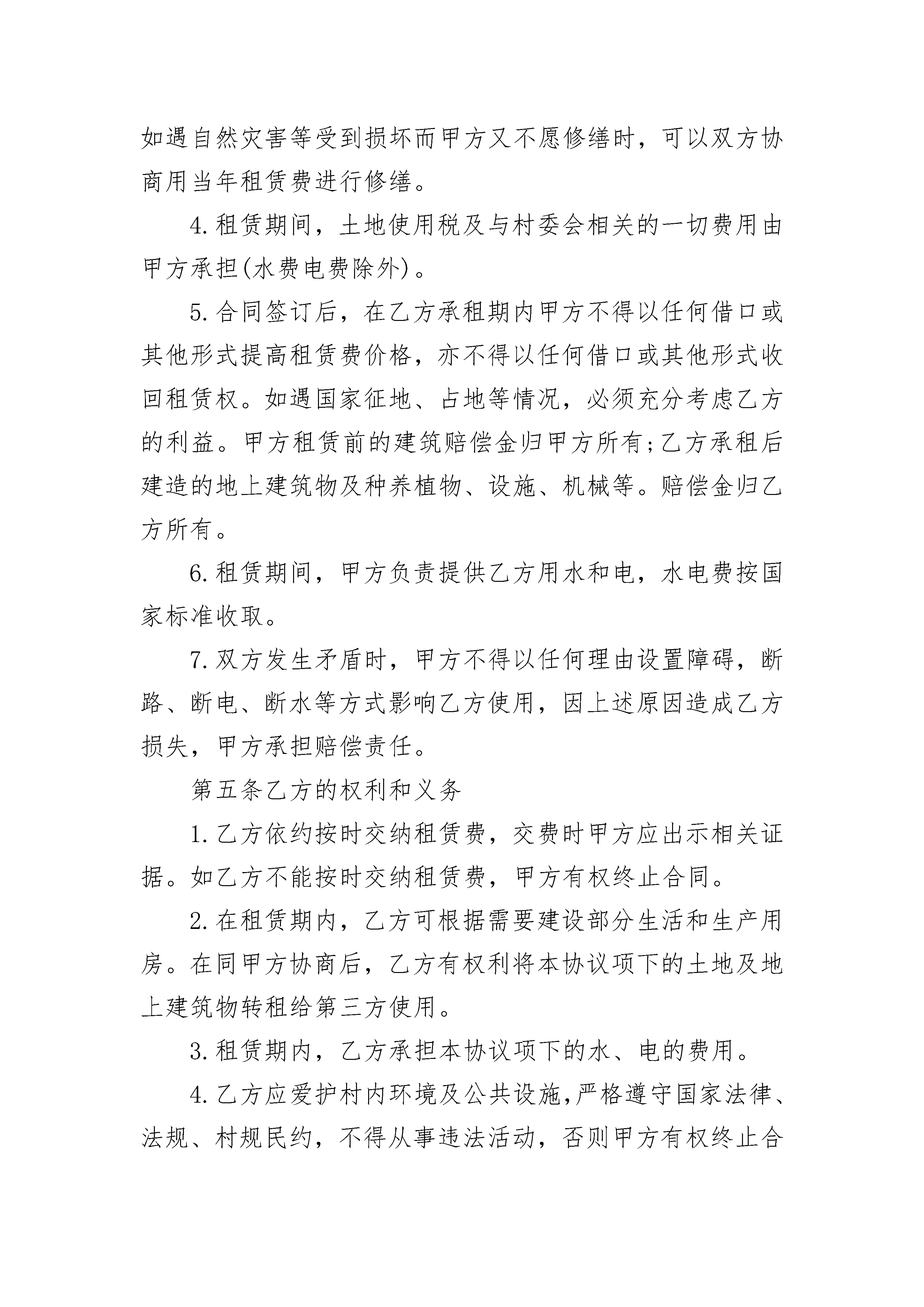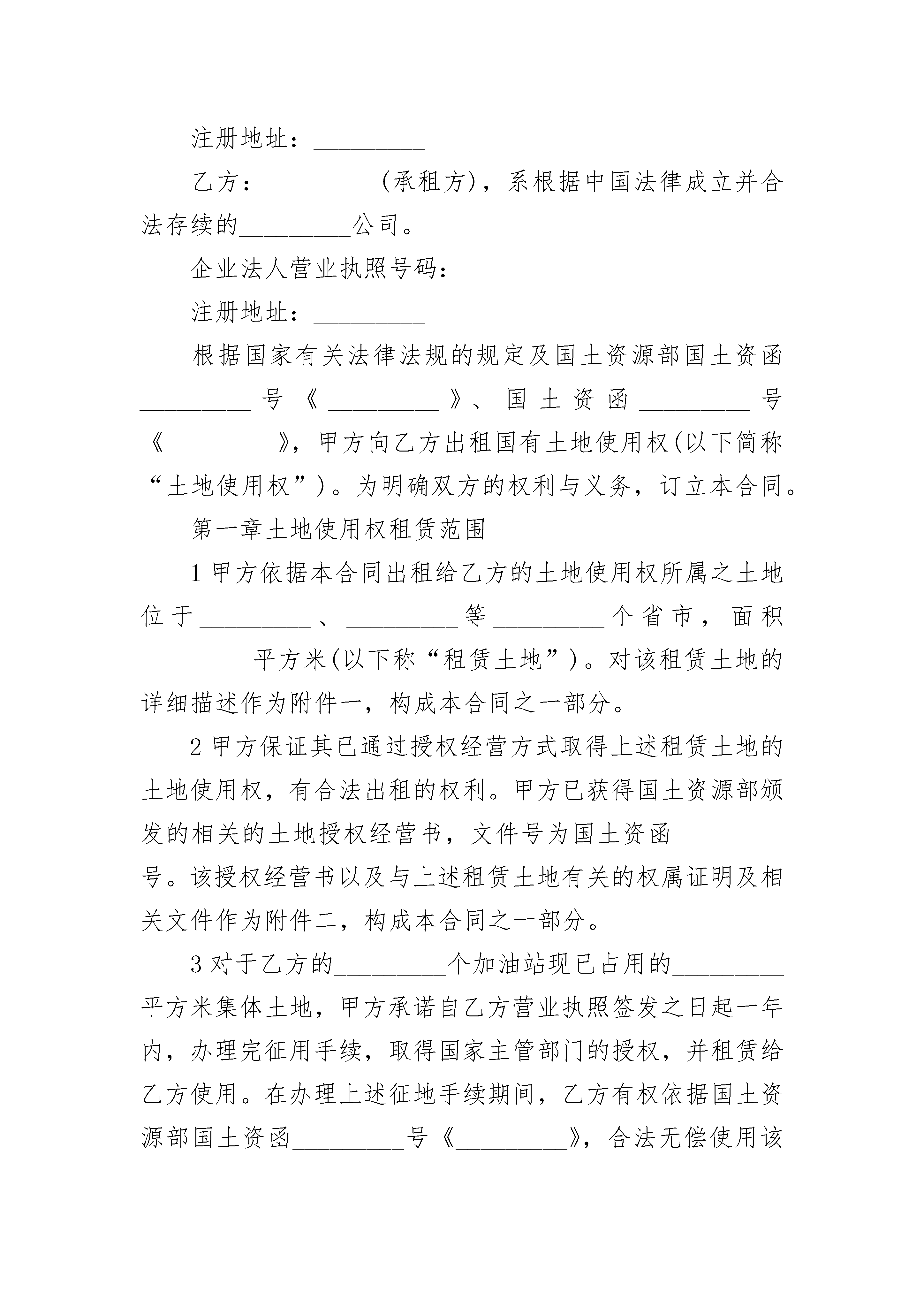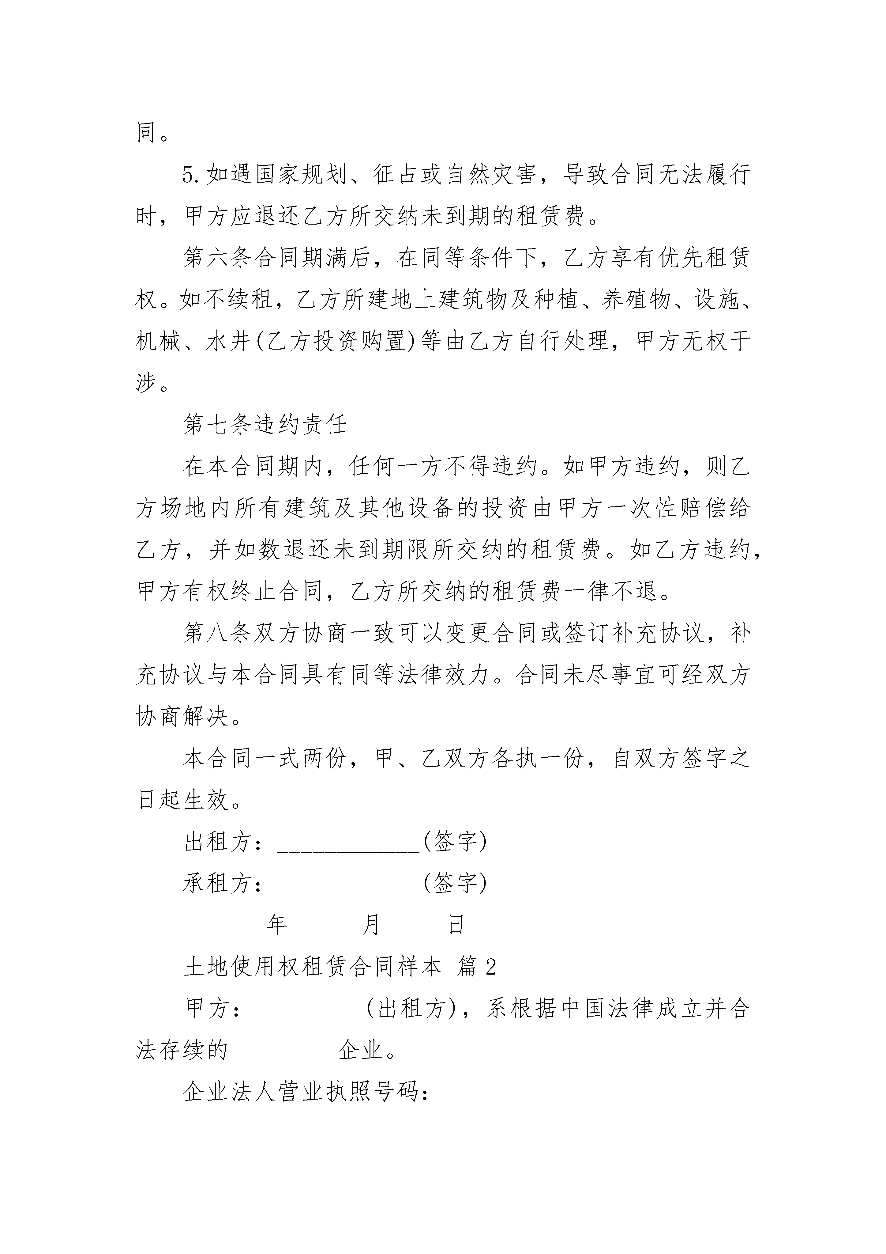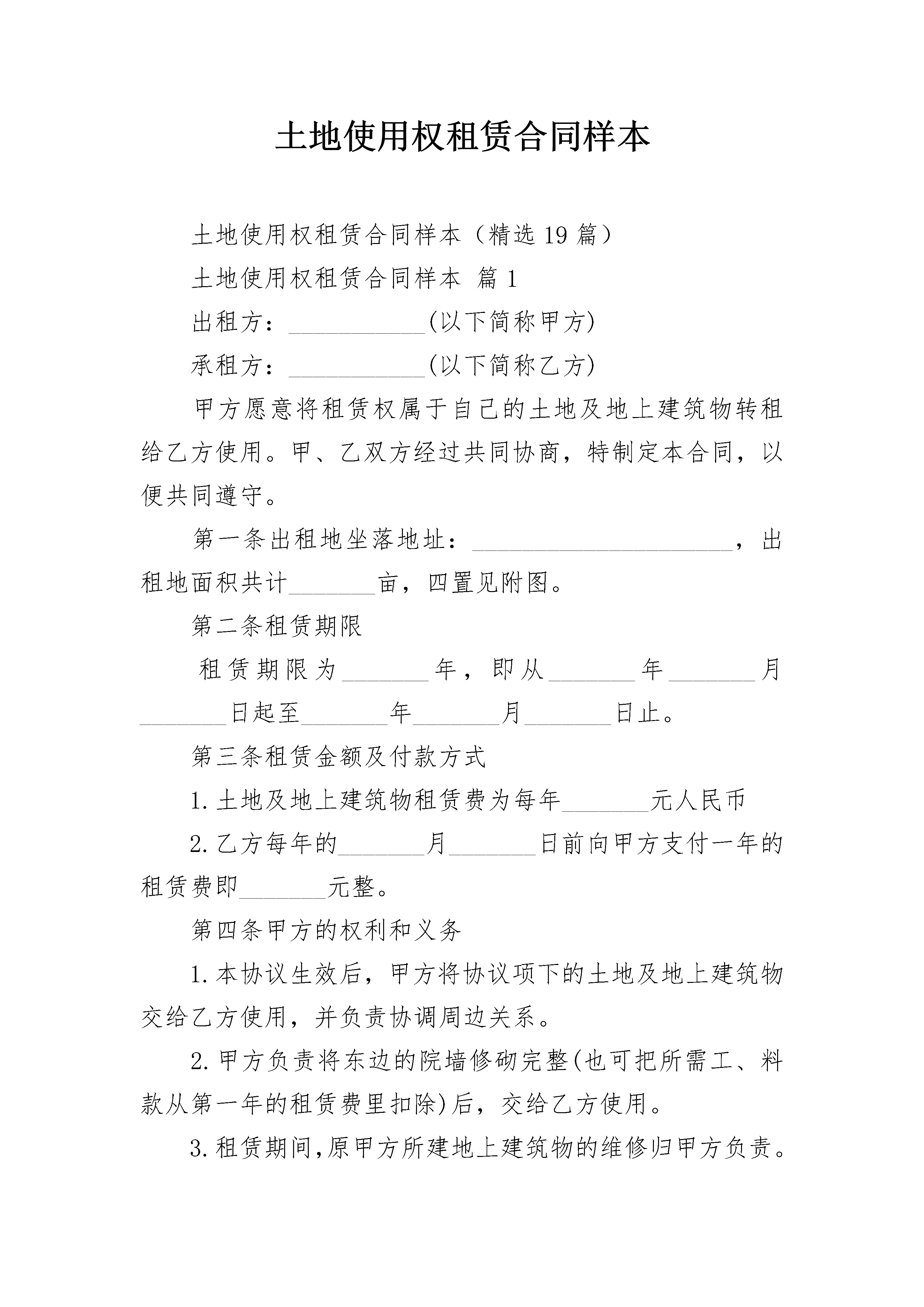 土地使用权租赁合同样本土地使用权租赁合同样本(精选19篇)土地使用权租赁合同样本篇1出租方:___________(以下简称甲方)承租方:___________(以下简称乙方)甲方愿意将租赁权属于自己的土地及地上建筑物转租给乙方使用。甲、乙双方经过共同协商,特制定本合同,以便共同遵守。第一条出租地坐落地址:_____________________,出租地面积共计_______亩,四置见附图。第二条租赁期限租赁期限为_______年,即从_______年_______月_______日起至_______年_______月_______日止。第三条租赁金额及付款方式1.土地及地上建筑物租赁费为每年_______元人民币2.乙方每年的_______月_______日前向甲方支付一年的租赁费即_______元整。第四条甲方的权利和义务1.本协议生效后,甲方将协议项下的土地及地上建筑物交给乙方使用,并负责协调周边关系。2.甲方负责将东边的院墙修砌完整(也可把所需工、料款从第一年的租赁费里扣除)后,交给乙方使用。3.租赁期间,原甲方所建地上建筑物的维修归甲方负责。如遇自然灾害等受到损坏而甲方又不愿修缮时,可以双方协商用当年租赁费进行修缮。4.租赁期间,土地使用税及与村委会相关的一切费用由甲方承担(水费电费除外)。5.合同签订后,在乙方承租期内甲方不得以任何借口或其他形式提高租赁费价格,亦不得以任何借口或其他形式收回租赁权。如遇国家征地、占地等情况,必须充分考虑乙方的利益。甲方租赁前的建筑赔偿金归甲方所有;乙方承租后建造的地上建筑物及种养植物、设施、机械等。赔偿金归乙方所有。6.租赁期间,甲方负责提供乙方用水和电,水电费按国家标准收取。7.双方发生矛盾时,甲方不得以任何理由设置障碍,断路、断电、断水等方式影响乙方使用,因上述原因造成乙方损失,甲方承担赔偿责任。第五条乙方的权利和义务1.乙方依约按时交纳租赁费,交费时甲方应出示相关证据。如乙方不能按时交纳租赁费,甲方有权终止合同。2.在租赁期内,乙方可根据需要建设部分生活和生产用房。在同甲方协商后,乙方有权利将本协议项下的土地及地上建筑物转租给第三方使用。3.租赁期内,乙方承担本协议项下的水、电的费用。4.乙方应爱护村内环境及公共设施,严格遵守国家法律、法规、村规民约,不得从事违法活动,否则甲方有权终止合同。5.如遇国家规划、征占或自然灾害,导致合同无法履行时,甲方应退还乙方所交纳未到期的租赁费。第六条合同期满后,在同等条件下,乙方享有优先租赁权。如不续租,乙方所建地上建筑物及种植、养殖物、设施、机械、水井(乙方投资购置)等由乙方自行处理,甲方无权干涉。第七条违约责任在本合同期内,任何一方不得违约。如甲方违约,则乙方场地内所有建筑及其他设备的投资由甲方一次性赔偿给乙方,并如数退还未到期限所交纳的租赁费。如乙方违约,甲方有权终止合同,乙方所交纳的租赁费一律不退。第八条双方协商一致可以变更合同或签订补充协议,补充协议与本合同具有同等法律效力。合同未尽事宜可经双方协商解决。本合同一式两份,甲、乙双方各执一份,自双方签字之日起生效。出租方:____________(签字)承租方:____________(签字)_______年______月_____日土地使用权租赁合同样本篇2甲方:_________(出租方),系根据中国法律成立并合法存续的_________企业。企业法人营业执照号码:_________注册地址:_________乙方:_________(承租方),系根据中国法律成立并合法存续的_________公司。企业法人营业执照号码:_________注册地址:_________根据国家有关法律法规的规定及国土资源部国土资函_________号《_________》、国土资函_________号《_________》,甲方向乙方出租国有土地使用权(以下简称“土地使用权”)。为明确双方的权利与义务,订立本合同。第一章土地使用权租赁范围1甲方依据本合同出租给乙方的土地使用权所属之土地位于_________、_________等_________个省市,面积_________平方米(以下称“租赁土地”)。对该租赁土地的详细描述作为附件一,构成本合同之一部分。2甲方保证其已通过授权经营方式取得上述租赁土地的土地使用权,有合法出租的权利。甲方已获得国土资源部颁发的相关的土地授权经营书,文件号为国土资函_________号。该授权经营书以及与上述租赁土地有关的权属证明及相关文件作为附件二,构成本合同之一部分。3对于乙方的_________个加油站现已占用的_________平方米集体土地,甲方承诺自乙方营业执照签发之日起一年内,办理完征用手续,取得国家主管部门的授权,并租赁给乙方使用。在办理上述征地