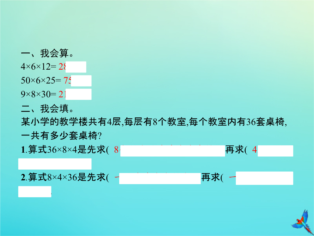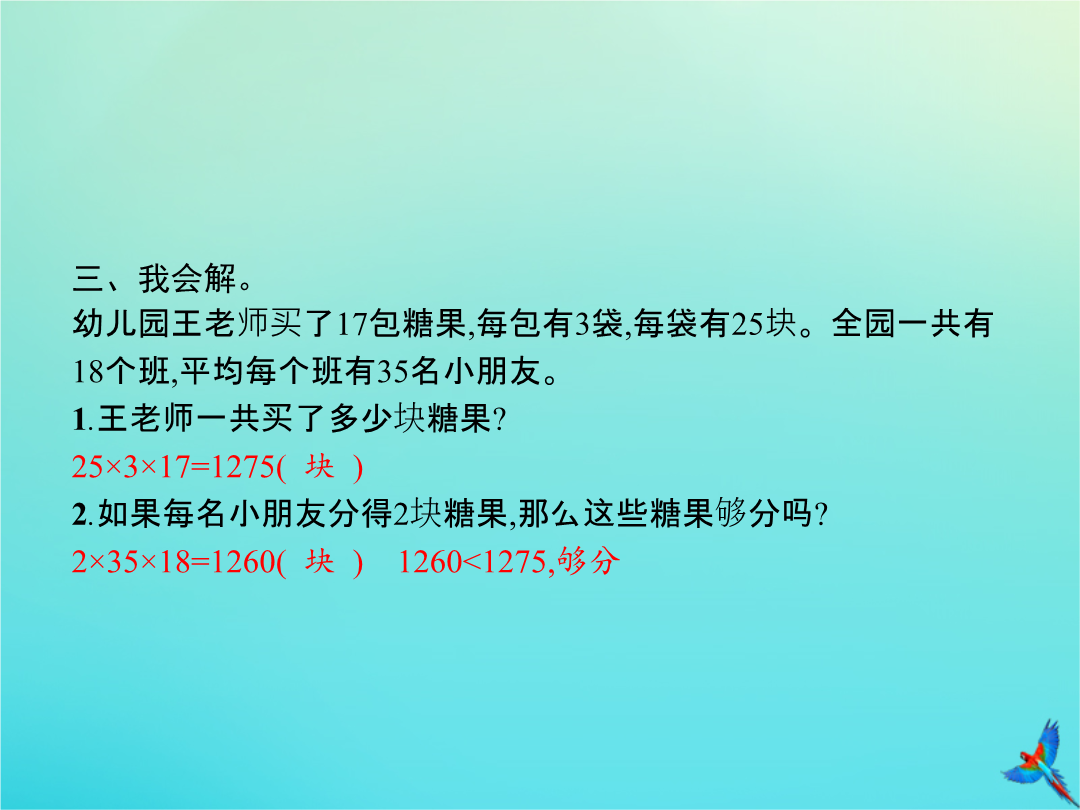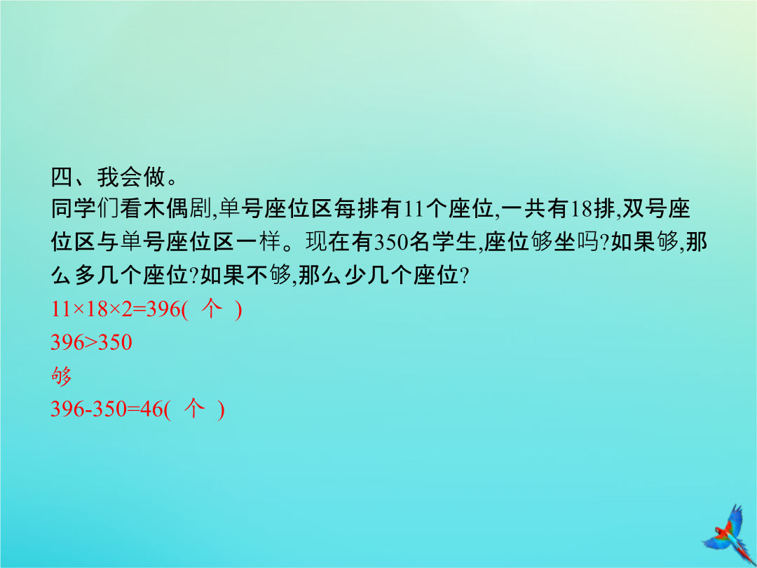 第4课时解决问题(一)一、我会算。4×6×12=28850×6×25=75009×8×30=2160二、我会填。某小学的教学楼共有4层,每层有8个教室,每个教室内有36套桌椅,一共有多少套桌椅?1.算式36×8×4是先求(8个教室共有多少套桌椅),再求(4层一共有多少套桌椅)。2.算式8×4×36是先求(一共有多少个教室),再求(一共有多少套桌椅)。三、我会解。幼儿园王老师买了17包糖果,每包有3袋,每袋有25块。全园一共有18个班,平均每个班有35名小朋友。1.王老师一共买了多少块糖果?25×3×17=1275(块)2.如果每名小朋友分得2块糖果,那么这些糖果够分吗?2×35×18=1260(块)1260<1275,够分四、我会做。同学们看木偶剧,单号座位区每排有11个座位,一共有18排,双号座位区与单号座位区一样。现在有350名学生,座位够坐吗?如果够,那么多几个座位?如果不够,那么少几个座位?11×18×2=396(个)396>350够396-350=46(个)