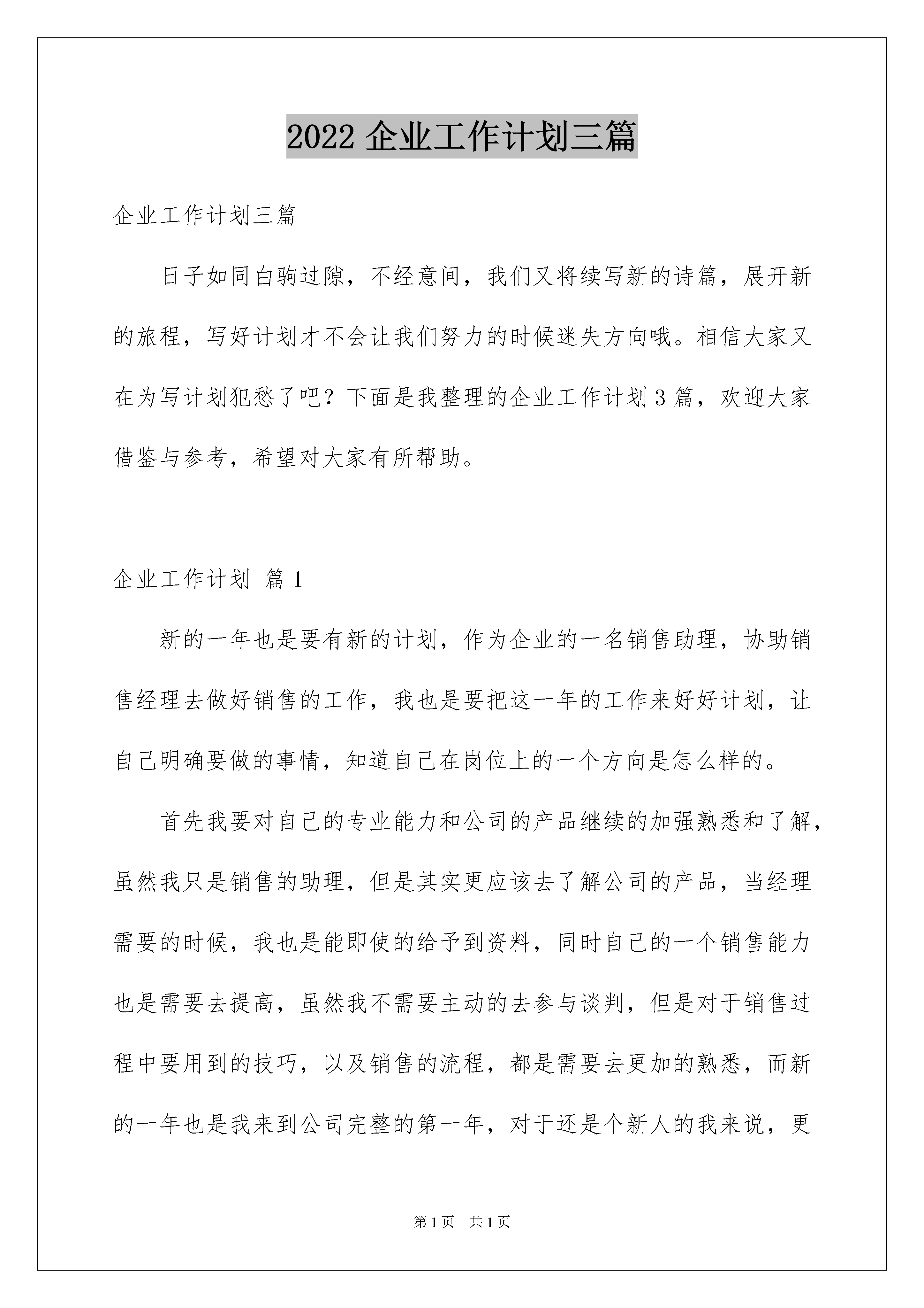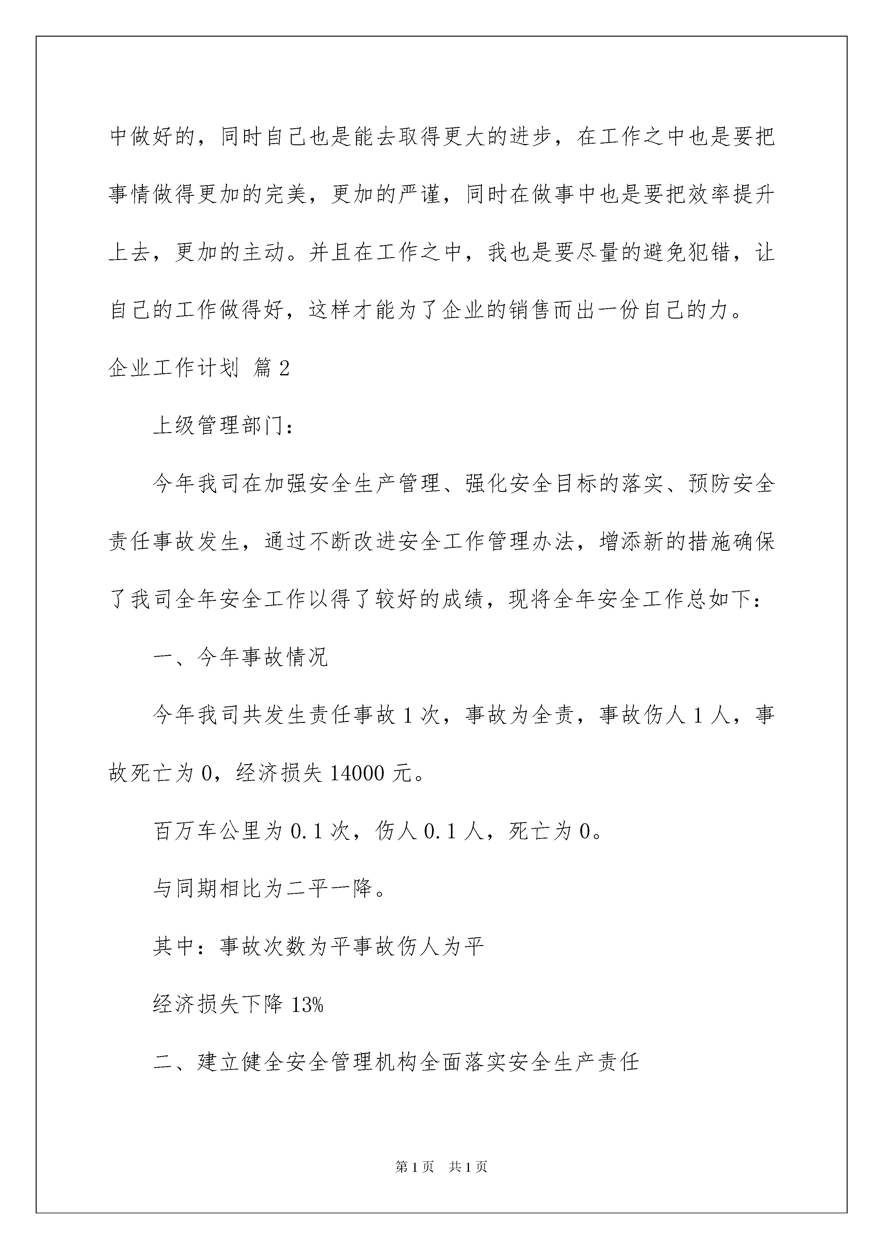 2022企业工作计划三篇企业工作计划三篇日子如同白驹过隙,不经意间,我们又将续写新的诗篇,展开新的旅程,写好计划才不会让我们努力的时候迷失方向哦。相信大家又在为写计划犯愁了吧?下面是我整理的企业工作计划3篇,欢迎大家借鉴与参考,希望对大家有所帮助。企业工作计划篇1新的一年也是要有新的计划,作为企业的一名销售助理,协助销售经理去做好销售的工作,我也是要把这一年的工作来好好计划,让自己明确要做的事情,知道自己在岗位上的一个方向是怎么样的。首先我要对自己的专业能力和公司的产品继续的加强熟悉和了解,虽然我只是销售的助理,但是其实更应该去了解公司的产品,当经理需要的时候,我也是能即使的给予到资料,同时自己的一个销售能力也是需要去提高,虽然我不需要主动的去参与谈判,但是对于销售过程中要用到的技巧,以及销售的流程,都是需要去更加的熟悉,而新的一年也是我来到公司完整的第一年,对于还是个新人的我来说,更是要努力的去提升自己各方面,这样才能协助经理去把销售的任务给完成。对于市场和客户群体要有足够的了解,对于已经拥有的市场情况和老客户资料也是要做好整理和实时的更新,把档案建立好,当经理需要的时候,我也是能及时的拿出来,更好的去把销售工作给做好,同时对于在销售过程中需要使用到的各种规划,方案,产品的详细介绍等相关的资料,我也是要做好整理和优化,只有这些基础的工作都去做好了,那么在销售的过程中也是可以显示出我们的专业性,让客户信任我们,愿意购买我们的产品,和我们企业来合作。协调各方面的一个工作任务,积极的配合经理以及相关的同事去把大家要做的事情做好分配管理,对于部门要做的一些培训和会议,我也是要做好前期的资料收集和准备的工作,让经理在做这些工作的时候,能更快,更好的去做,做好助理该做的一些基础准备工作。同时对于自己的工作也是要去不断反思和总结,让自己的工作方法去进行优化,更好的去把助理工作做好。新年的我,要更加的努力,对于自己之前没做好,或者身上存在的缺点也是要尽快的改正,我想我一定可以在新年的一个助理工作之中做好的,同时自己也是能去取得更大的进步,在工作之中也是要把事情做得更加的完美,更加的严谨,同时在做事中也是要把效率提升上去,更加的主动。并且在工作之中,我也是要尽量的避免犯错,让自己的工作做得好,这样才能为了企业的销售而出一份自己的力。企业工作计划篇2上级管理部门:今年我司在加强安全生产管理、强化安全目标的落实、预防安全责任事故发生,通过不断改进安全工作管理办法,增添新的措施确保了我司全年安全工作以得了较好的成绩,现将全年安全工作总如下:一、今年事故情况今年我司共发生责任事故1次,事故为全责,事故伤人1人,事故死亡为0,经济损失14000元。百万车公里为0.1次,伤人0.1人,死亡为0。与同期相比为二平一降。其中:事故次数为平事故伤人为平经济损失下降13%二、建立健全安全管理机构全面落实安全生产责任为了认真搞好全年安全工作,根据上级管理部门的指示精神,层层签订了安全生产责任书,安全生产责任制在我司得到了普遍落实,不仅如此,公司还与上级管理部门签订了安全生产责任书,安全生产工作真正做到了横向到边、纵向到底。三、继续开展安全宣传教育,努力提高安全意识安全教是安全管理工作的重要内容,今年公司大力响应各级主管部门的要求,加大了对道路交通安全法律、法规、岗位安全操作规程,应急处置能力的宣传教育力度,如今年发生在我县的大山煤矿8.11井下瓦斯燃烧事故和大田煤矿11.21井下透水事故给我司安全管理工作又一次敲响了警钟,公司上下通过会议、发放简报、宣传资料、标语等多种形式向员工、旅客大力宣传《安全生产法》等安全生产法律法规。全年共召开安全生产会议12次,参会1180余人次,出刊简报8期,悬挂标语6幅,发放安全资料840多余份。四、狠抓安全责任制的落实,继续推行安全目标责任管理公司为了鼓励全年安全工作中作出成绩的员工按二o一o年年初与各部门、各岗位签订的安全责任书进行了考核,共评出一等奖员工名,二等奖员工名,三等奖员工名;并给予了奖金及表彰,对安全工作做得差的人员进行了通报和教育,并在年底前完成了与各部门、各岗位签订二o一一年的各项安全责任书。各岗位责任人按签订的责任书内容、岗位的工作职责认真履行好应尽的安全管理义务。五、狠抓春运和节假日的安全管理工作为了认真抓好今年春运和“五一”、“十一”黄金周等重要节假日的各项安全工作,确保旅客高峰期出行的万无一失,公司于元月28日、4月16日、9月27日召开了黄金周安全教育培训专题会,并邀请了县安监局、交通局、交警领导现场参会,传达了上级对黄金周安全工作的指示及要求,根