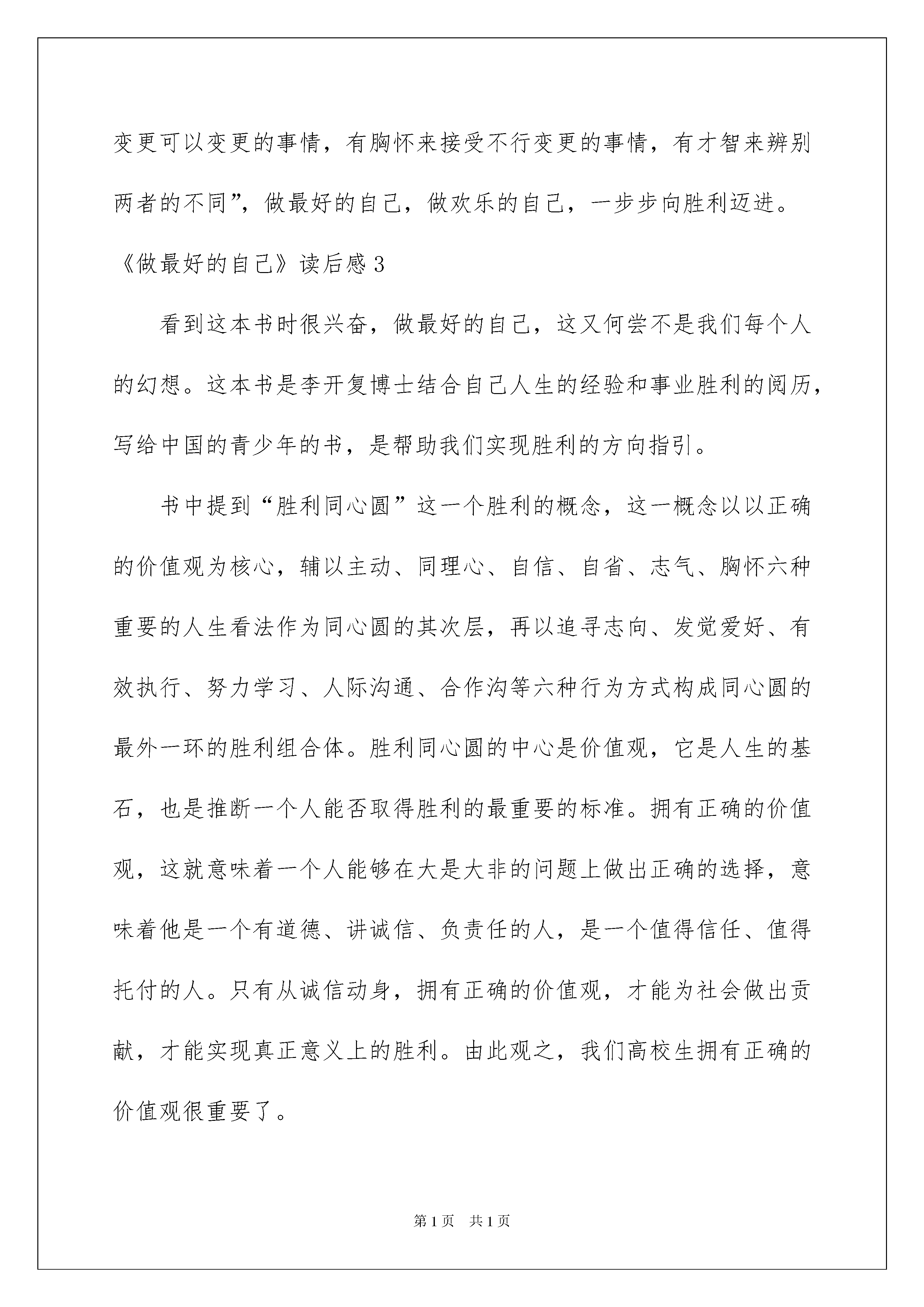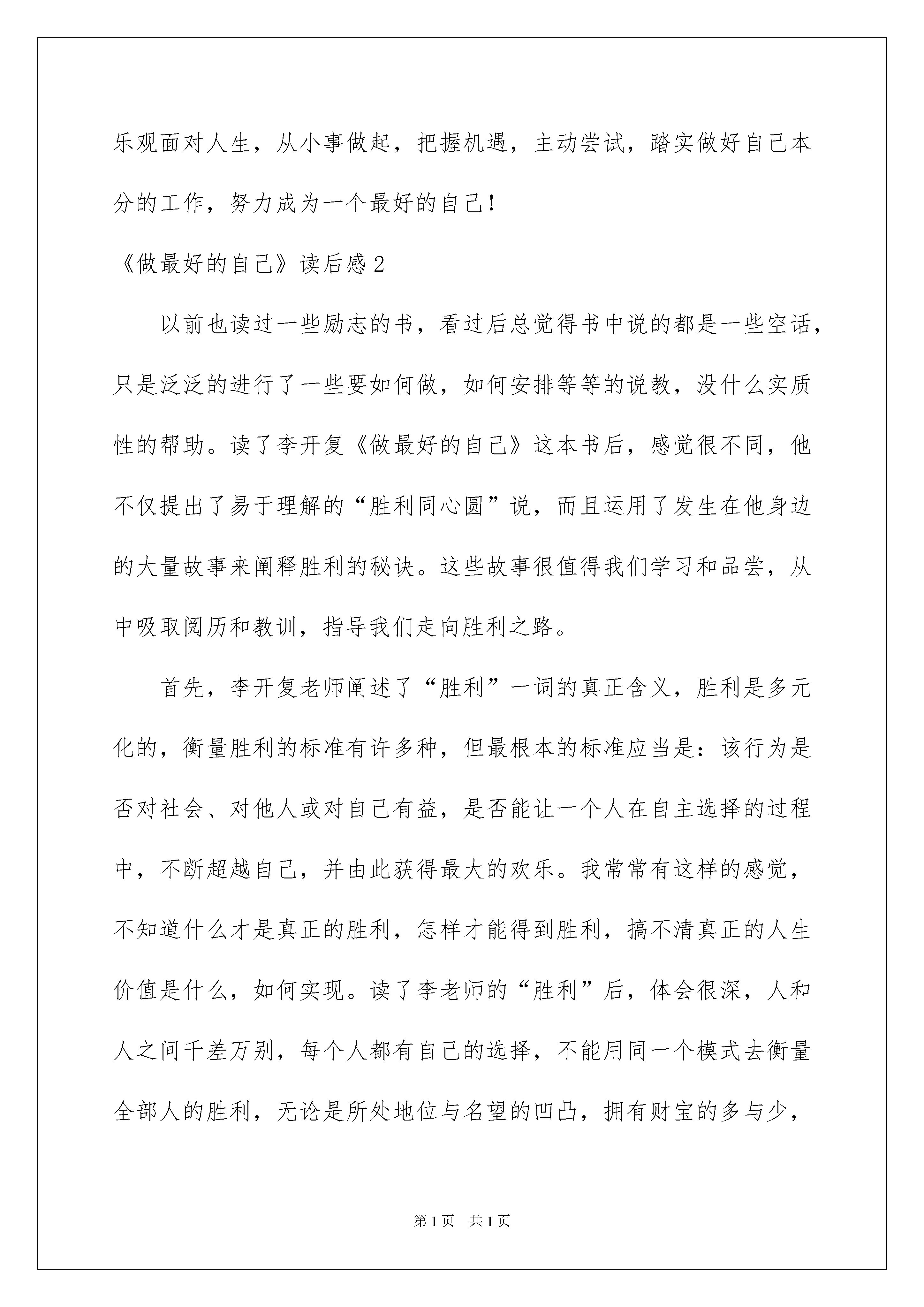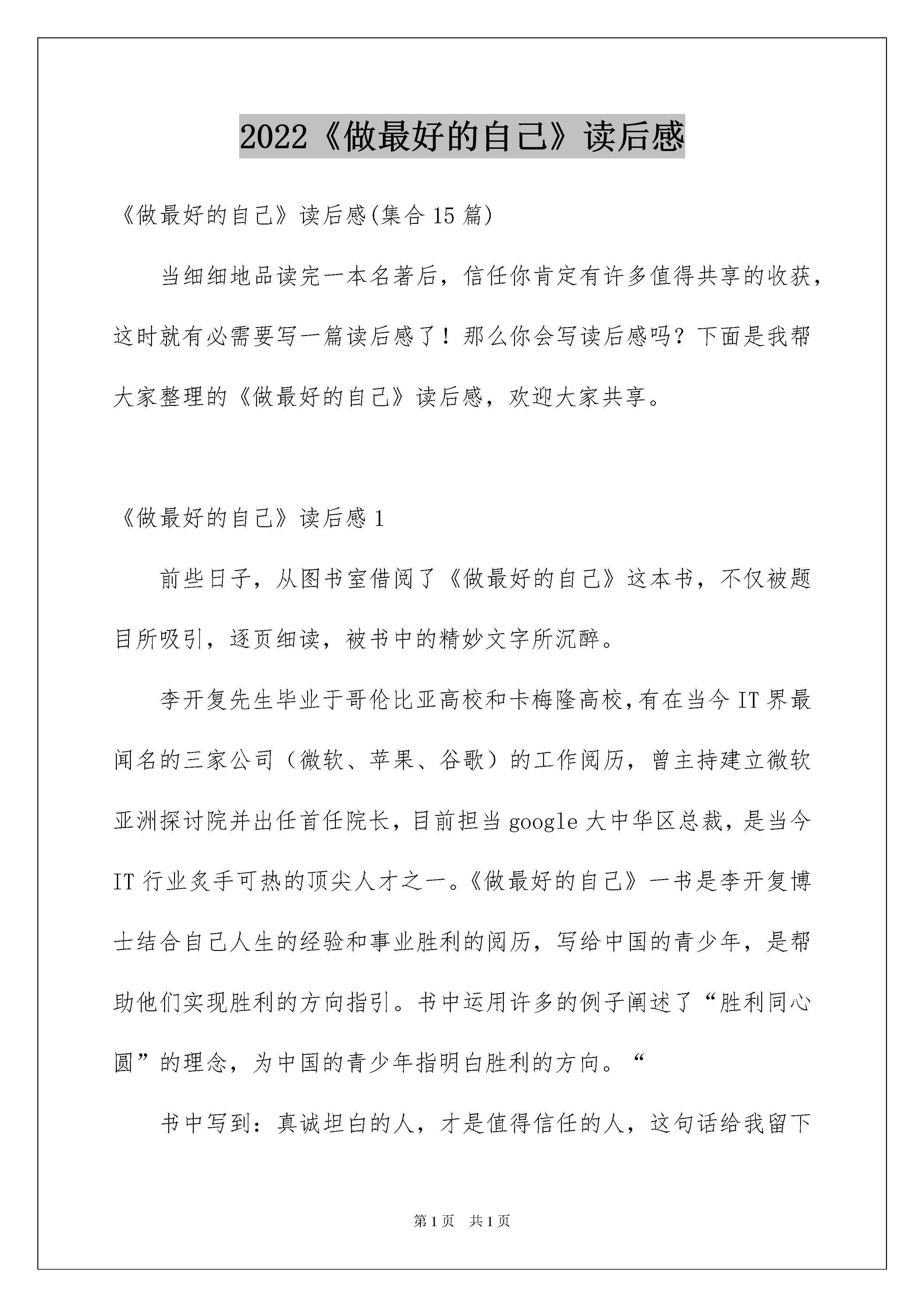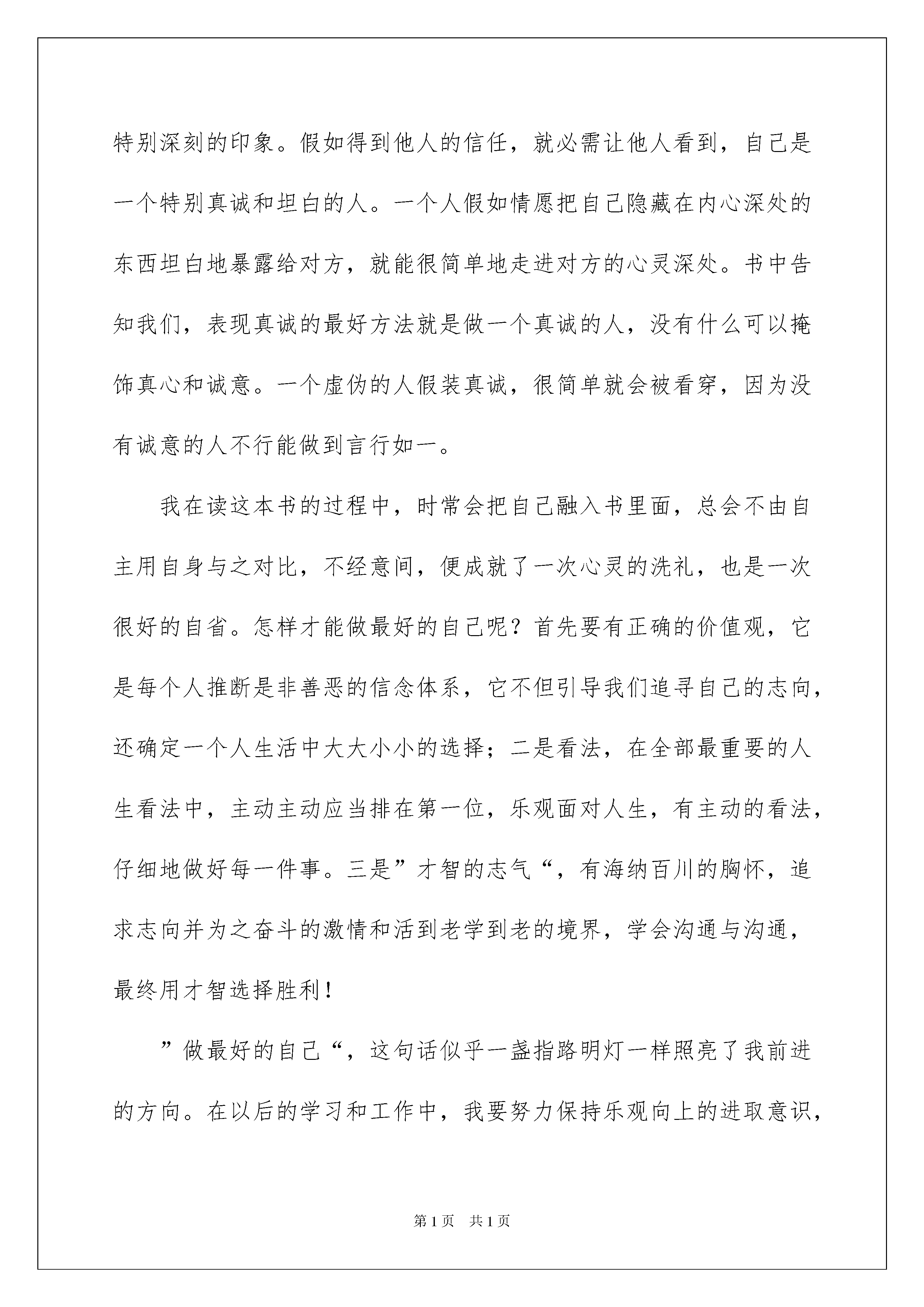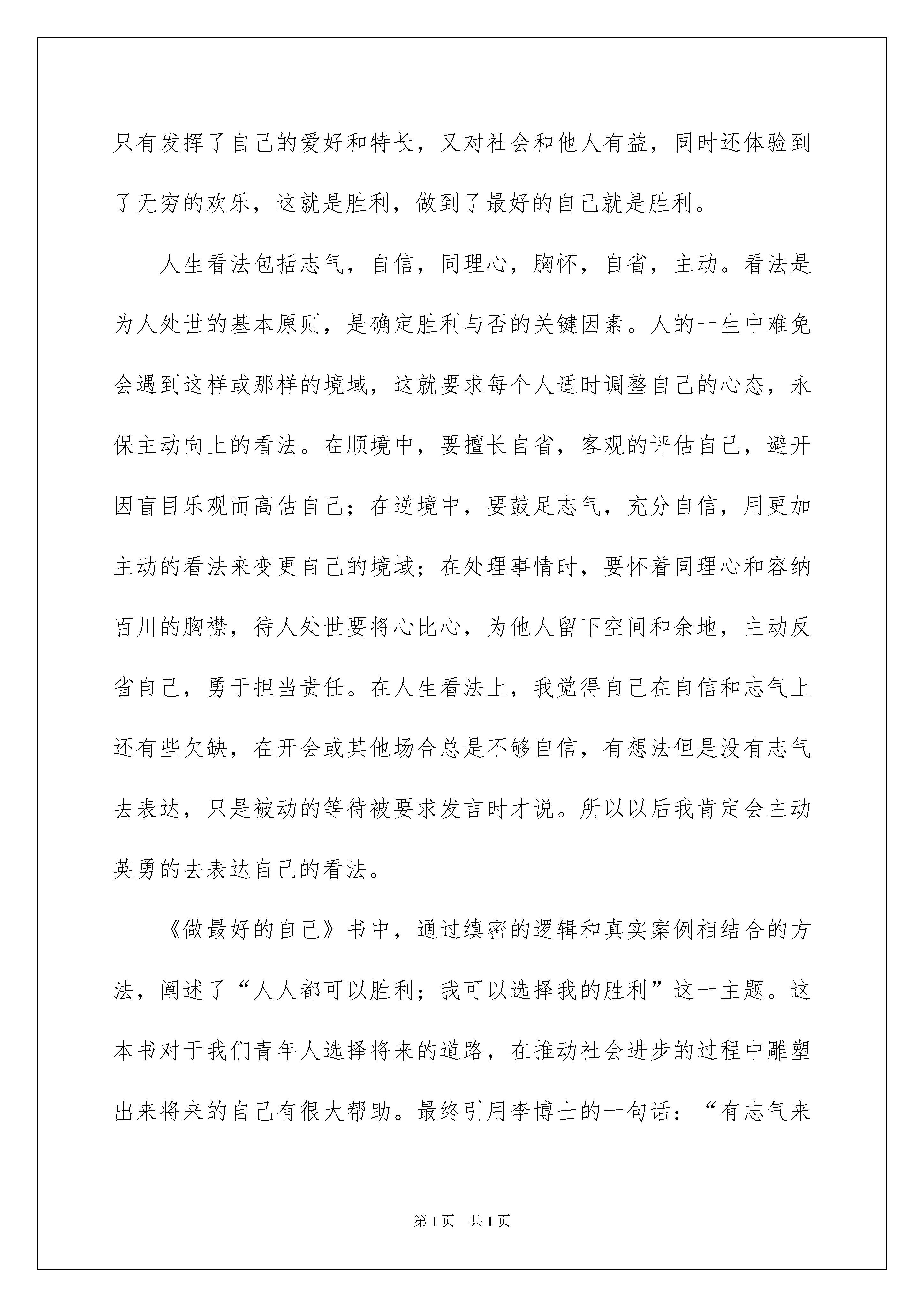 2022《做最好的自己》读后感《做最好的自己》读后感(集合15篇)当细细地品读完一本名著后,信任你肯定有许多值得共享的收获,这时就有必需要写一篇读后感了!那么你会写读后感吗?下面是我帮大家整理的《做最好的自己》读后感,欢迎大家共享。《做最好的自己》读后感1前些日子,从图书室借阅了《做最好的自己》这本书,不仅被题目所吸引,逐页细读,被书中的精妙文字所沉醉。李开复先生毕业于哥伦比亚高校和卡梅隆高校,有在当今IT界最闻名的三家公司(微软、苹果、谷歌)的工作阅历,曾主持建立微软亚洲探讨院并出任首任院长,目前担当google大中华区总裁,是当今IT行业炙手可热的顶尖人才之一。《做最好的自己》一书是李开复博士结合自己人生的经验和事业胜利的阅历,写给中国的青少年,是帮助他们实现胜利的方向指引。书中运用许多的例子阐述了“胜利同心圆”的理念,为中国的青少年指明白胜利的方向。“书中写到:真诚坦白的人,才是值得信任的人,这句话给我留下特别深刻的印象。假如得到他人的信任,就必需让他人看到,自己是一个特别真诚和坦白的人。一个人假如情愿把自己隐藏在内心深处的东西坦白地暴露给对方,就能很简单地走进对方的心灵深处。书中告知我们,表现真诚的最好方法就是做一个真诚的人,没有什么可以掩饰真心和诚意。一个虚伪的人假装真诚,很简单就会被看穿,因为没有诚意的人不行能做到言行如一。我在读这本书的过程中,时常会把自己融入书里面,总会不由自主用自身与之对比,不经意间,便成就了一次心灵的洗礼,也是一次很好的自省。怎样才能做最好的自己呢?首先要有正确的价值观,它是每个人推断是非善恶的信念体系,它不但引导我们追寻自己的志向,还确定一个人生活中大大小小的选择;二是看法,在全部最重要的人生看法中,主动主动应当排在第一位,乐观面对人生,有主动的看法,仔细地做好每一件事。三是”才智的志气“,有海纳百川的胸怀,追求志向并为之奋斗的激情和活到老学到老的境界,学会沟通与沟通,最终用才智选择胜利!”做最好的自己“,这句话似乎一盏指路明灯一样照亮了我前进的方向。在以后的学习和工作中,我要努力保持乐观向上的进取意识,乐观面对人生,从小事做起,把握机遇,主动尝试,踏实做好自己本分的工作,努力成为一个最好的自己!《做最好的自己》读后感2以前也读过一些励志的书,看过后总觉得书中说的都是一些空话,只是泛泛的进行了一些要如何做,如何安排等等的说教,没什么实质性的帮助。读了李开复《做最好的自己》这本书后,感觉很不同,他不仅提出了易于理解的“胜利同心圆”说,而且运用了发生在他身边的大量故事来阐释胜利的秘诀。这些故事很值得我们学习和品尝,从中吸取阅历和教训,指导我们走向胜利之路。首先,李开复老师阐述了“胜利”一词的真正含义,胜利是多元化的,衡量胜利的标准有许多种,但最根本的标准应当是:该行为是否对社会、对他人或对自己有益,是否能让一个人在自主选择的过程中,不断超越自己,并由此获得最大的欢乐。我常常有这样的感觉,不知道什么才是真正的胜利,怎样才能得到胜利,搞不清真正的人生价值是什么,如何实现。读了李老师的“胜利”后,体会很深,人和人之间千差万别,每个人都有自己的选择,不能用同一个模式去衡量全部人的胜利,无论是所处地位与名望的凹凸,拥有财宝的多与少,只有发挥了自己的爱好和特长,又对社会和他人有益,同时还体验到了无穷的欢乐,这就是胜利,做到了最好的自己就是胜利。人生看法包括志气,自信,同理心,胸怀,自省,主动。看法是为人处世的基本原则,是确定胜利与否的关键因素。人的一生中难免会遇到这样或那样的境域,这就要求每个人适时调整自己的心态,永保主动向上的看法。在顺境中,要擅长自省,客观的评估自己,避开因盲目乐观而高估自己;在逆境中,要鼓足志气,充分自信,用更加主动的看法来变更自己的境域;在处理事情时,要怀着同理心和容纳百川的胸襟,待人处世要将心比心,为他人留下空间和余地,主动反省自己,勇于担当责任。在人生看法上,我觉得自己在自信和志气上还有些欠缺,在开会或其他场合总是不够自信,有想法但是没有志气去表达,只是被动的等待被要求发言时才说。所以以后我肯定会主动英勇的去表达自己的看法。《做最好的自己》书中,通过缜密的逻辑和真实案例相结合的方法,阐述了“人人都可以胜利;我可以选择我的胜利”这一主题。这本书对于我们青年人选择将来的道路,在推动社会进步的过程中雕塑出来将来的自己有很大帮助。最终引用李博士的一句话:“有志气来变更可以变更的事情,有胸怀来接受不行变更的事情,有才智来辨别两者的不同”,做最好的自己,做欢乐的自己,一步步向胜利迈进。《做最好的自己》读后感3看到这本书时很兴奋,做最好