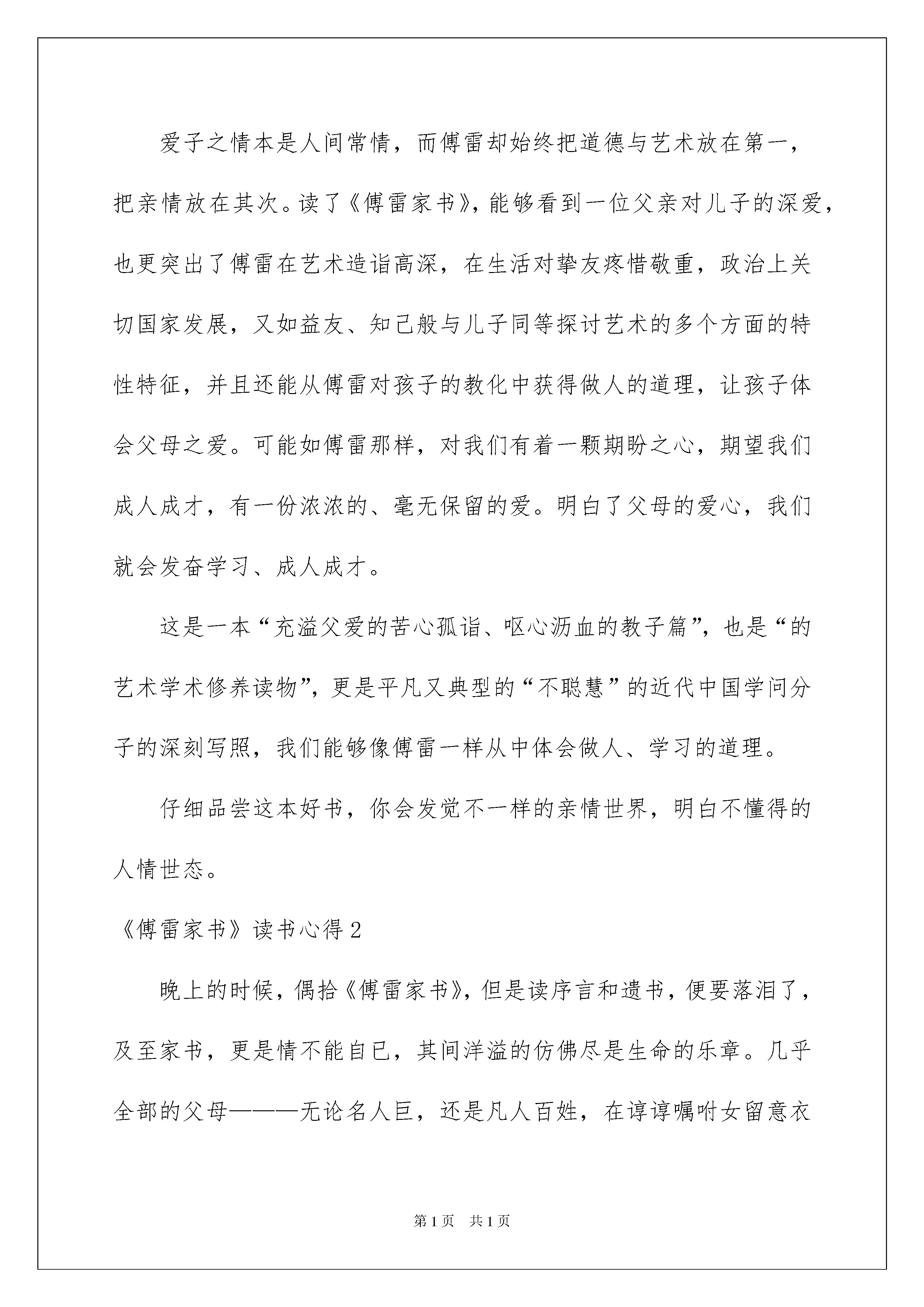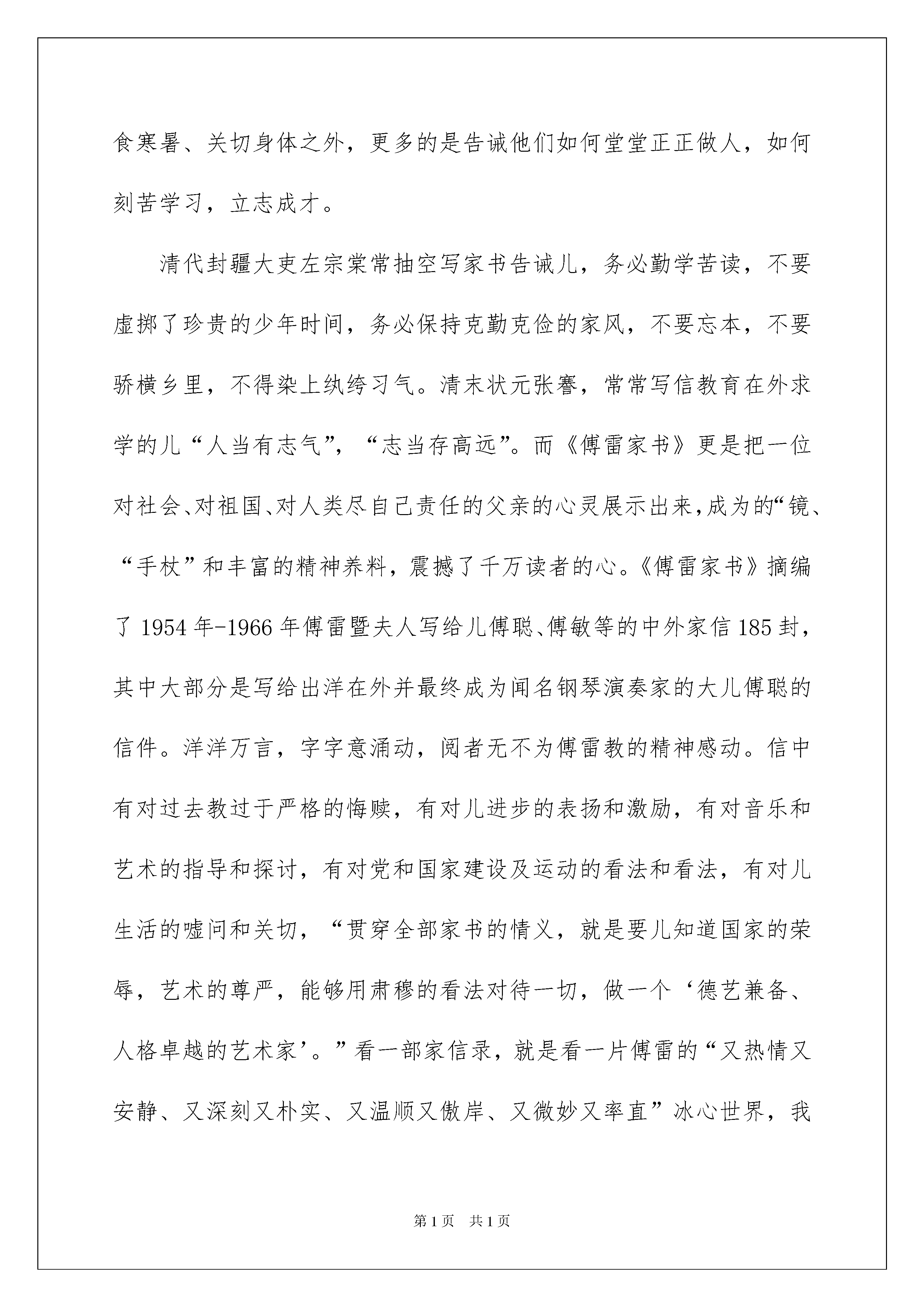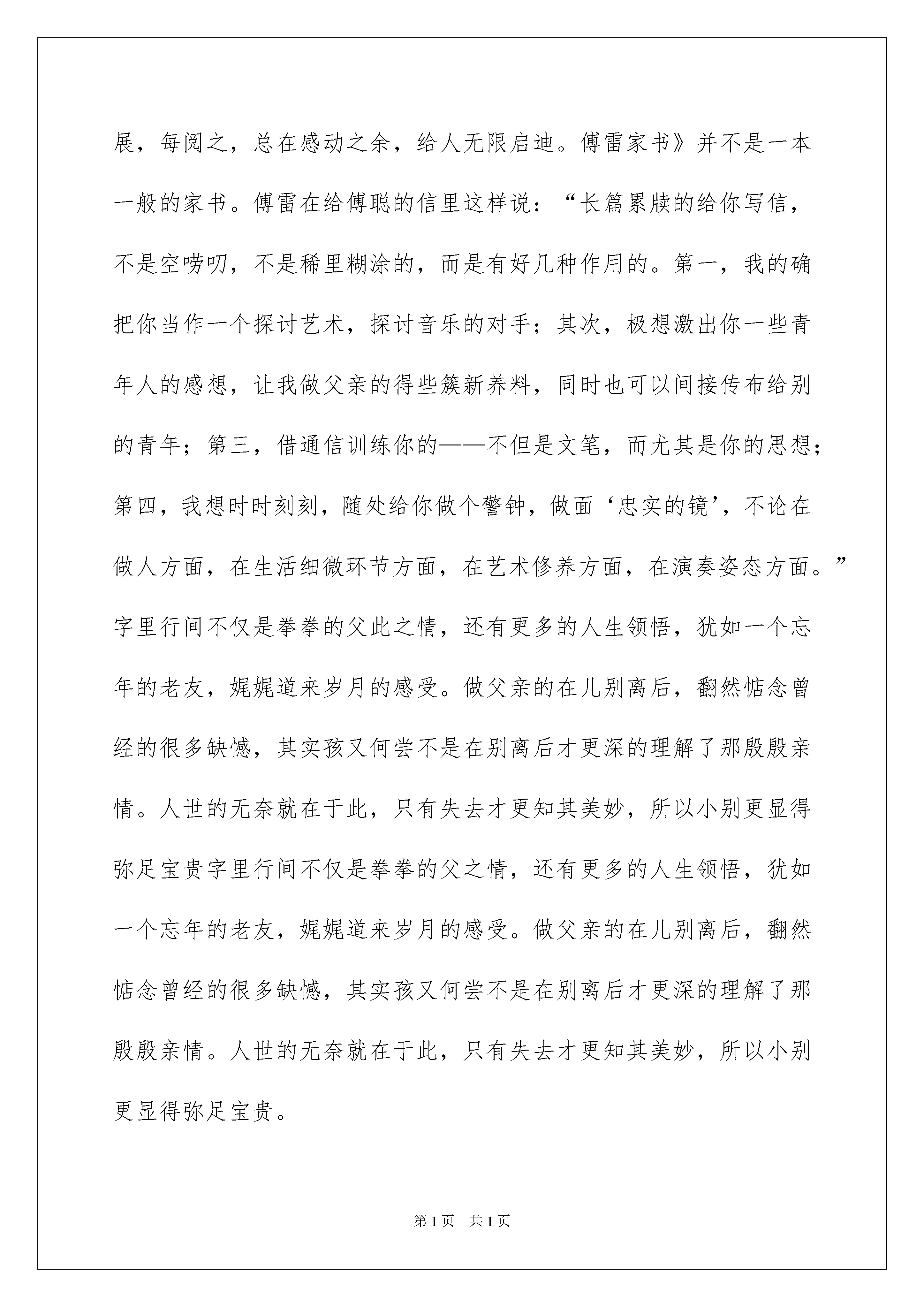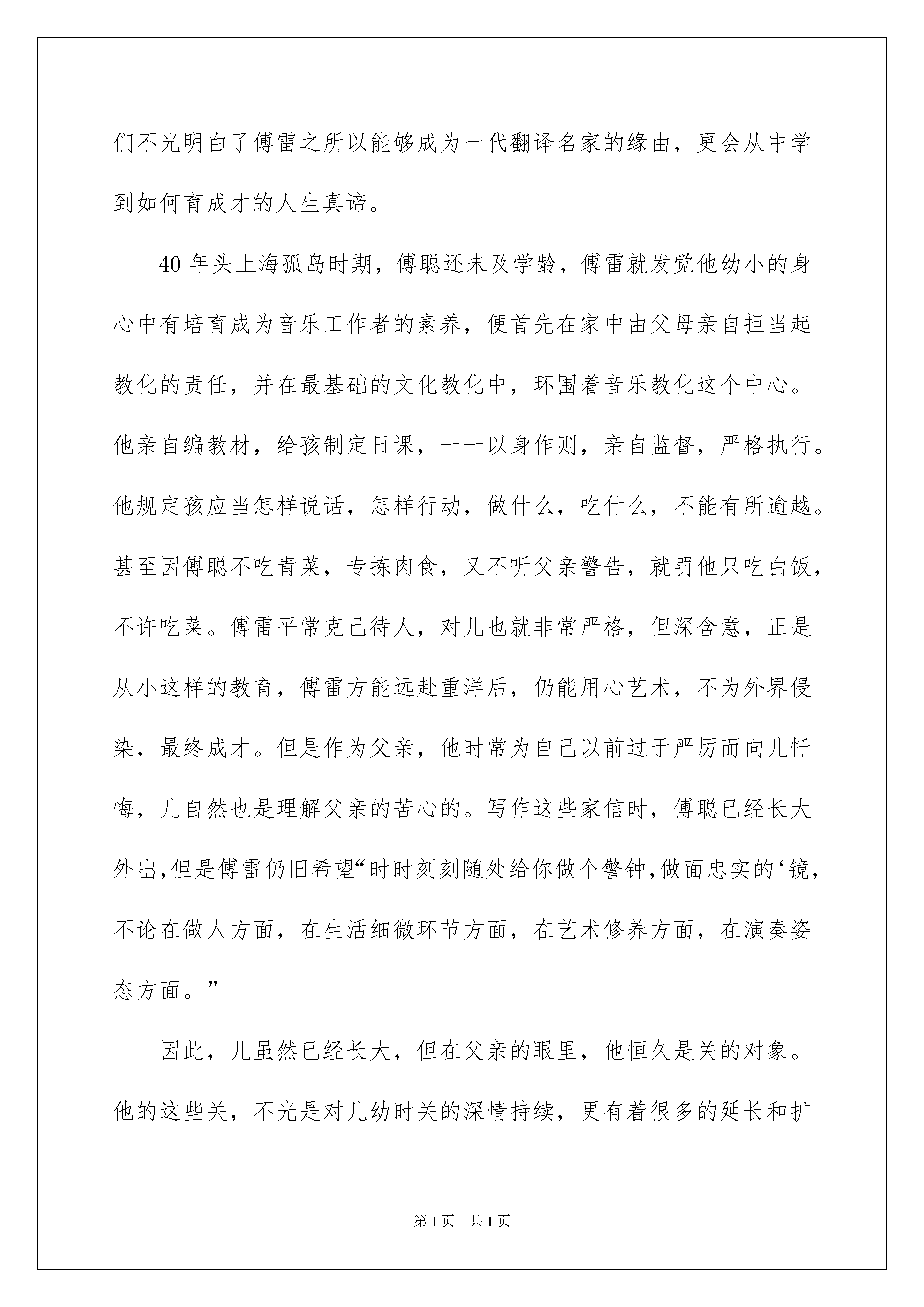 2022《傅雷家书》读书心得《傅雷家书》读书心得当我们受到启发,对生活有了新的感悟时,有这样的时机,要好好记录下来,这样我们就可以提高对思维的训练。那么好的心得体会都具备一些什么特点呢?下面是我收集整理的《傅雷家书》读书心得,仅供参考,希望能够帮助到大家。《傅雷家书》读书心得1拿起这本或许并不太重的书,却觉得沉沉的。了解过傅雷,为他的含冤自杀而感到怜悯,傅雷在学术上是一位学者,在家里是一位严厉、尽责的父亲。这些家书,有三层资料,第一层是傅雷作为一位一般父亲对远在异国他乡的儿子表达四年、关怀之情;其次层是傅雷与儿子犹如益友,知己般倾心地交谈,探讨艺术;第三层就是傅雷作为一名品德高尚、学识丰富的学问分子,仔细引导儿子要具备高尚人格和艺德,启发儿子的爱国情、民族情。《傅雷家书》能够使我们更好地提升自身修养的一本好书,在风云暗涌的年头里,傅雷透过书信亲子爱子,传达出一种高尚的品质。爱子之情本是人间常情,而傅雷却始终把道德与艺术放在第一,把亲情放在其次。读了《傅雷家书》,能够看到一位父亲对儿子的深爱,也更突出了傅雷在艺术造诣高深,在生活对挚友疼惜敬重,政治上关切国家发展,又如益友、知己般与儿子同等探讨艺术的多个方面的特性特征,并且还能从傅雷对孩子的教化中获得做人的道理,让孩子体会父母之爱。可能如傅雷那样,对我们有着一颗期盼之心,期望我们成人成才,有一份浓浓的、毫无保留的爱。明白了父母的爱心,我们就会发奋学习、成人成才。这是一本“充溢父爱的苦心孤诣、呕心沥血的教子篇”,也是“的艺术学术修养读物”,更是平凡又典型的“不聪慧”的近代中国学问分子的深刻写照,我们能够像傅雷一样从中体会做人、学习的道理。仔细品尝这本好书,你会发觉不一样的亲情世界,明白不懂得的人情世态。《傅雷家书》读书心得2晚上的时候,偶拾《傅雷家书》,但是读序言和遗书,便要落泪了,及至家书,更是情不能自已,其间洋溢的仿佛尽是生命的乐章。几乎全部的父母———无论名人巨,还是凡人百姓,在谆谆嘱咐女留意衣食寒暑、关切身体之外,更多的是告诫他们如何堂堂正正做人,如何刻苦学习,立志成才。清代封疆大吏左宗棠常抽空写家书告诫儿,务必勤学苦读,不要虚掷了珍贵的少年时间,务必保持克勤克俭的家风,不要忘本,不要骄横乡里,不得染上纨绔习气。清末状元张謇,常常写信教育在外求学的儿“人当有志气”,“志当存高远”。而《傅雷家书》更是把一位对社会、对祖国、对人类尽自己责任的父亲的心灵展示出来,成为的“镜、“手杖”和丰富的精神养料,震撼了千万读者的心。《傅雷家书》摘编了1954年-1966年傅雷暨夫人写给儿傅聪、傅敏等的中外家信185封,其中大部分是写给出洋在外并最终成为闻名钢琴演奏家的大儿傅聪的信件。洋洋万言,字字意涌动,阅者无不为傅雷教的精神感动。信中有对过去教过于严格的悔赎,有对儿进步的表扬和激励,有对音乐和艺术的指导和探讨,有对党和国家建设及运动的看法和看法,有对儿生活的嘘问和关切,“贯穿全部家书的情义,就是要儿知道国家的荣辱,艺术的尊严,能够用肃穆的看法对待一切,做一个‘德艺兼备、人格卓越的艺术家’。”看一部家信录,就是看一片傅雷的“又热情又安静、又深刻又朴实、又温顺又傲岸、又微妙又率直”冰心世界,我们不光明白了傅雷之所以能够成为一代翻译名家的缘由,更会从中学到如何育成才的人生真谛。40年头上海孤岛时期,傅聪还未及学龄,傅雷就发觉他幼小的身心中有培育成为音乐工作者的素养,便首先在家中由父母亲自担当起教化的责任,并在最基础的文化教化中,环围着音乐教化这个中心。他亲自编教材,给孩制定日课,一一以身作则,亲自监督,严格执行。他规定孩应当怎样说话,怎样行动,做什么,吃什么,不能有所逾越。甚至因傅聪不吃青菜,专拣肉食,又不听父亲警告,就罚他只吃白饭,不许吃菜。傅雷平常克己待人,对儿也就非常严格,但深含意,正是从小这样的教育,傅雷方能远赴重洋后,仍能用心艺术,不为外界侵染,最终成才。但是作为父亲,他时常为自己以前过于严厉而向儿忏悔,儿自然也是理解父亲的苦心的。写作这些家信时,傅聪已经长大外出,但是傅雷仍旧希望“时时刻刻随处给你做个警钟,做面忠实的‘镜,不论在做人方面,在生活细微环节方面,在艺术修养方面,在演奏姿态方面。”因此,儿虽然已经长大,但在父亲的眼里,他恒久是关的对象。他的这些关,不光是对儿幼时关的深情持续,更有着很多的延长和扩展,每阅之,总在感动之余,给人无限启迪。傅雷家书》并不是一本一般的家书。傅雷在给傅聪的信里这样说:“长篇累牍的给你写信,不是空唠叨,不是稀里糊涂的,而是有好几种作用的。第一,我的确把你当作一个探讨艺术,探讨音乐的对手;其次,极想
