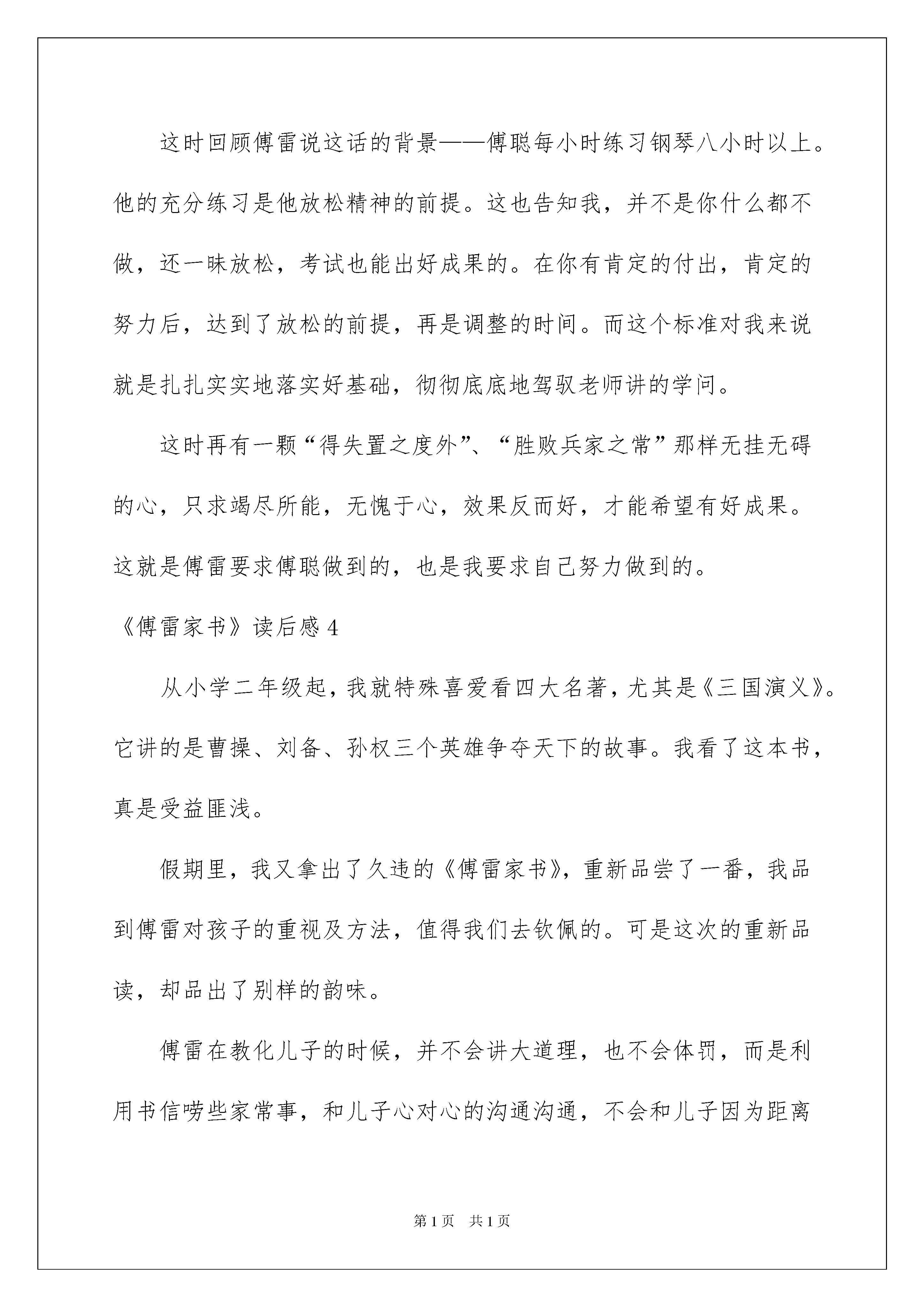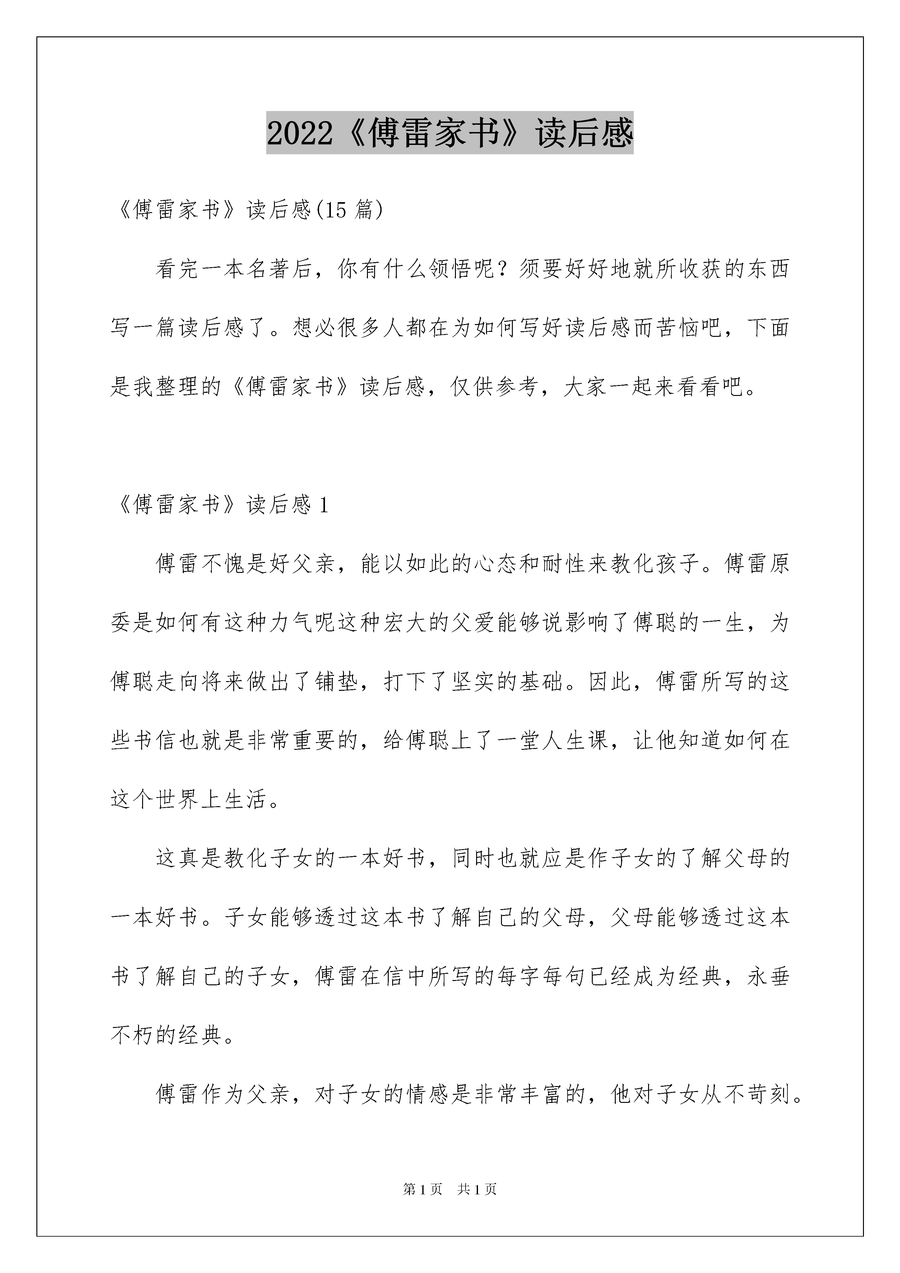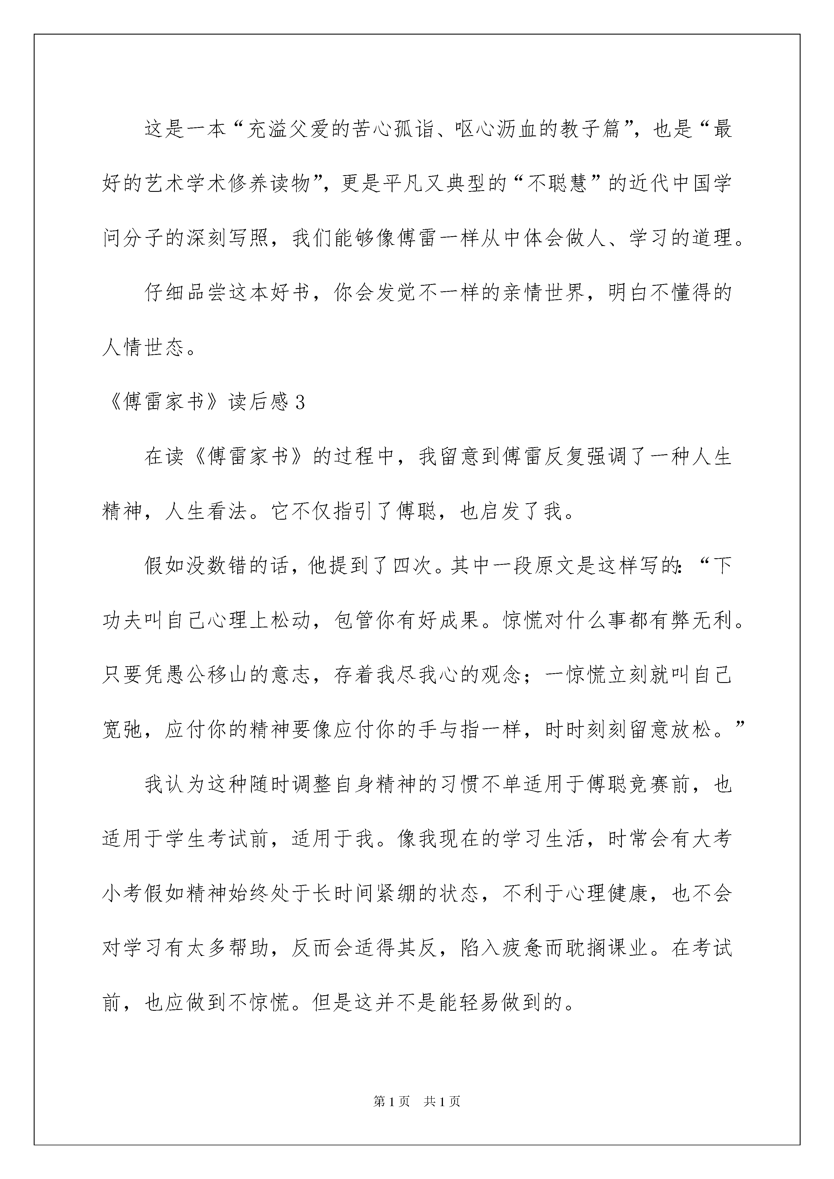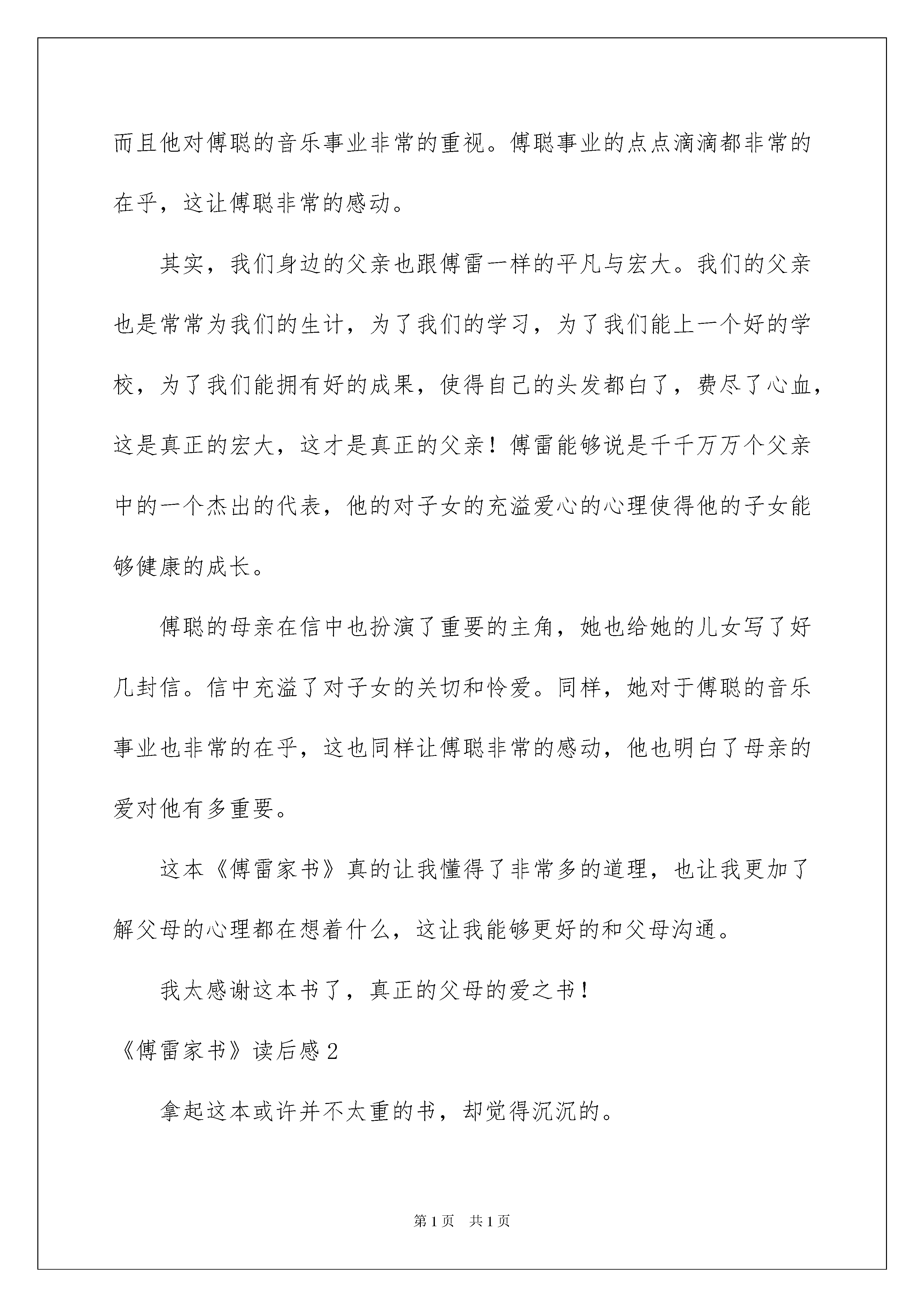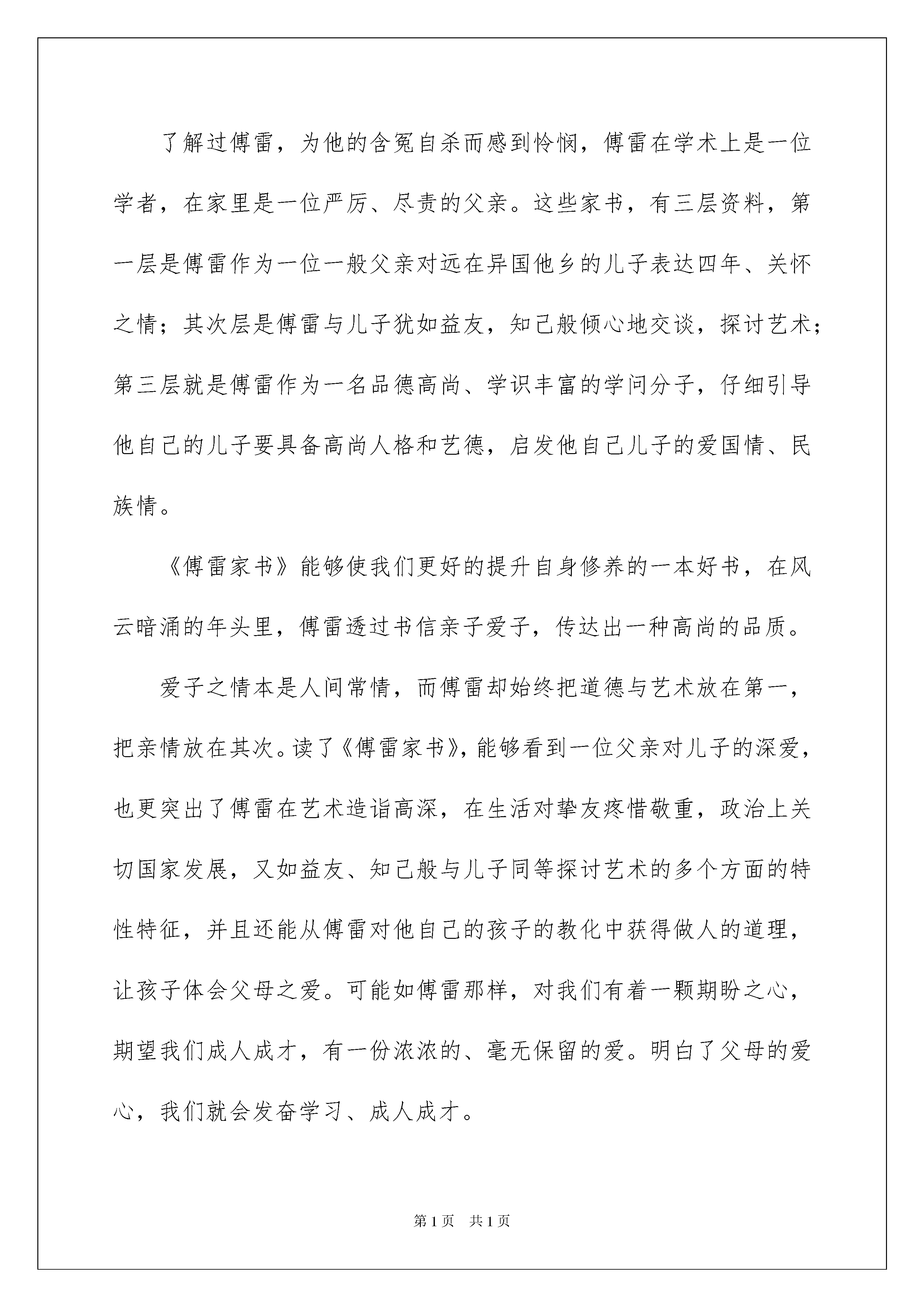 2022《傅雷家书》读后感《傅雷家书》读后感(15篇)看完一本名著后,你有什么领悟呢?须要好好地就所收获的东西写一篇读后感了。想必很多人都在为如何写好读后感而苦恼吧,下面是我整理的《傅雷家书》读后感,仅供参考,大家一起来看看吧。《傅雷家书》读后感1傅雷不愧是好父亲,能以如此的心态和耐性来教化孩子。傅雷原委是如何有这种力气呢这种宏大的父爱能够说影响了傅聪的一生,为傅聪走向将来做出了铺垫,打下了坚实的基础。因此,傅雷所写的这些书信也就是非常重要的,给傅聪上了一堂人生课,让他知道如何在这个世界上生活。这真是教化子女的一本好书,同时也就应是作子女的了解父母的一本好书。子女能够透过这本书了解自己的父母,父母能够透过这本书了解自己的子女,傅雷在信中所写的每字每句已经成为经典,永垂不朽的经典。傅雷作为父亲,对子女的情感是非常丰富的,他对子女从不苛刻。而且他对傅聪的音乐事业非常的重视。傅聪事业的点点滴滴都非常的在乎,这让傅聪非常的感动。其实,我们身边的父亲也跟傅雷一样的平凡与宏大。我们的父亲也是常常为我们的生计,为了我们的学习,为了我们能上一个好的学校,为了我们能拥有好的成果,使得自己的头发都白了,费尽了心血,这是真正的宏大,这才是真正的父亲!傅雷能够说是千千万万个父亲中的一个杰出的代表,他的对子女的充溢爱心的心理使得他的子女能够健康的成长。傅聪的母亲在信中也扮演了重要的主角,她也给她的儿女写了好几封信。信中充溢了对子女的关切和怜爱。同样,她对于傅聪的音乐事业也非常的在乎,这也同样让傅聪非常的感动,他也明白了母亲的爱对他有多重要。这本《傅雷家书》真的让我懂得了非常多的道理,也让我更加了解父母的心理都在想着什么,这让我能够更好的和父母沟通。我太感谢这本书了,真正的父母的爱之书!《傅雷家书》读后感2拿起这本或许并不太重的书,却觉得沉沉的。了解过傅雷,为他的含冤自杀而感到怜悯,傅雷在学术上是一位学者,在家里是一位严厉、尽责的父亲。这些家书,有三层资料,第一层是傅雷作为一位一般父亲对远在异国他乡的儿子表达四年、关怀之情;其次层是傅雷与儿子犹如益友,知己般倾心地交谈,探讨艺术;第三层就是傅雷作为一名品德高尚、学识丰富的学问分子,仔细引导他自己的儿子要具备高尚人格和艺德,启发他自己儿子的爱国情、民族情。《傅雷家书》能够使我们更好的提升自身修养的一本好书,在风云暗涌的年头里,傅雷透过书信亲子爱子,传达出一种高尚的品质。爱子之情本是人间常情,而傅雷却始终把道德与艺术放在第一,把亲情放在其次。读了《傅雷家书》,能够看到一位父亲对儿子的深爱,也更突出了傅雷在艺术造诣高深,在生活对挚友疼惜敬重,政治上关切国家发展,又如益友、知己般与儿子同等探讨艺术的多个方面的特性特征,并且还能从傅雷对他自己的孩子的教化中获得做人的道理,让孩子体会父母之爱。可能如傅雷那样,对我们有着一颗期盼之心,期望我们成人成才,有一份浓浓的、毫无保留的爱。明白了父母的爱心,我们就会发奋学习、成人成才。这是一本“充溢父爱的苦心孤诣、呕心沥血的教子篇”,也是“最好的艺术学术修养读物”,更是平凡又典型的“不聪慧”的近代中国学问分子的深刻写照,我们能够像傅雷一样从中体会做人、学习的道理。仔细品尝这本好书,你会发觉不一样的亲情世界,明白不懂得的人情世态。《傅雷家书》读后感3在读《傅雷家书》的过程中,我留意到傅雷反复强调了一种人生精神,人生看法。它不仅指引了傅聪,也启发了我。假如没数错的话,他提到了四次。其中一段原文是这样写的:“下功夫叫自己心理上松动,包管你有好成果。惊慌对什么事都有弊无利。只要凭愚公移山的意志,存着我尽我心的观念;一惊慌立刻就叫自己宽弛,应付你的精神要像应付你的手与指一样,时时刻刻留意放松。”我认为这种随时调整自身精神的习惯不单适用于傅聪竞赛前,也适用于学生考试前,适用于我。像我现在的学习生活,时常会有大考小考假如精神始终处于长时间紧绷的状态,不利于心理健康,也不会对学习有太多帮助,反而会适得其反,陷入疲惫而耽搁课业。在考试前,也应做到不惊慌。但是这并不是能轻易做到的。这时回顾傅雷说这话的背景——傅聪每小时练习钢琴八小时以上。他的充分练习是他放松精神的前提。这也告知我,并不是你什么都不做,还一昧放松,考试也能出好成果的。在你有肯定的付出,肯定的努力后,达到了放松的前提,再是调整的时间。而这个标准对我来说就是扎扎实实地落实好基础,彻彻底底地驾驭老师讲的学问。这时再有一颗“得失置之度外”、“胜败兵家之常”那样无挂无碍的心,只求竭尽所能,无愧于心,效果反而好,才能希望有好成果。这就是傅雷要求傅聪做到的,也是我要求自己努力做到的。《傅雷家书