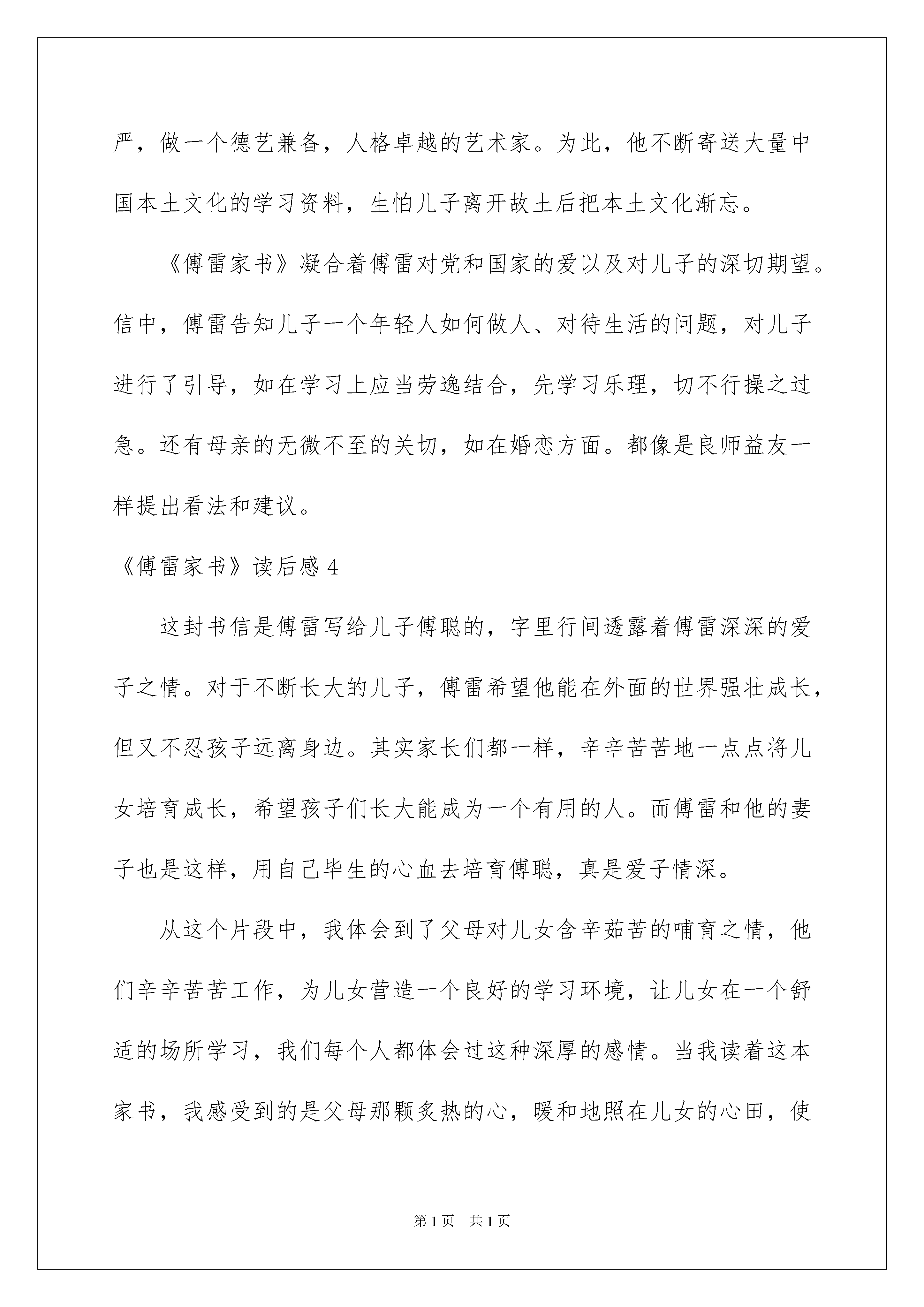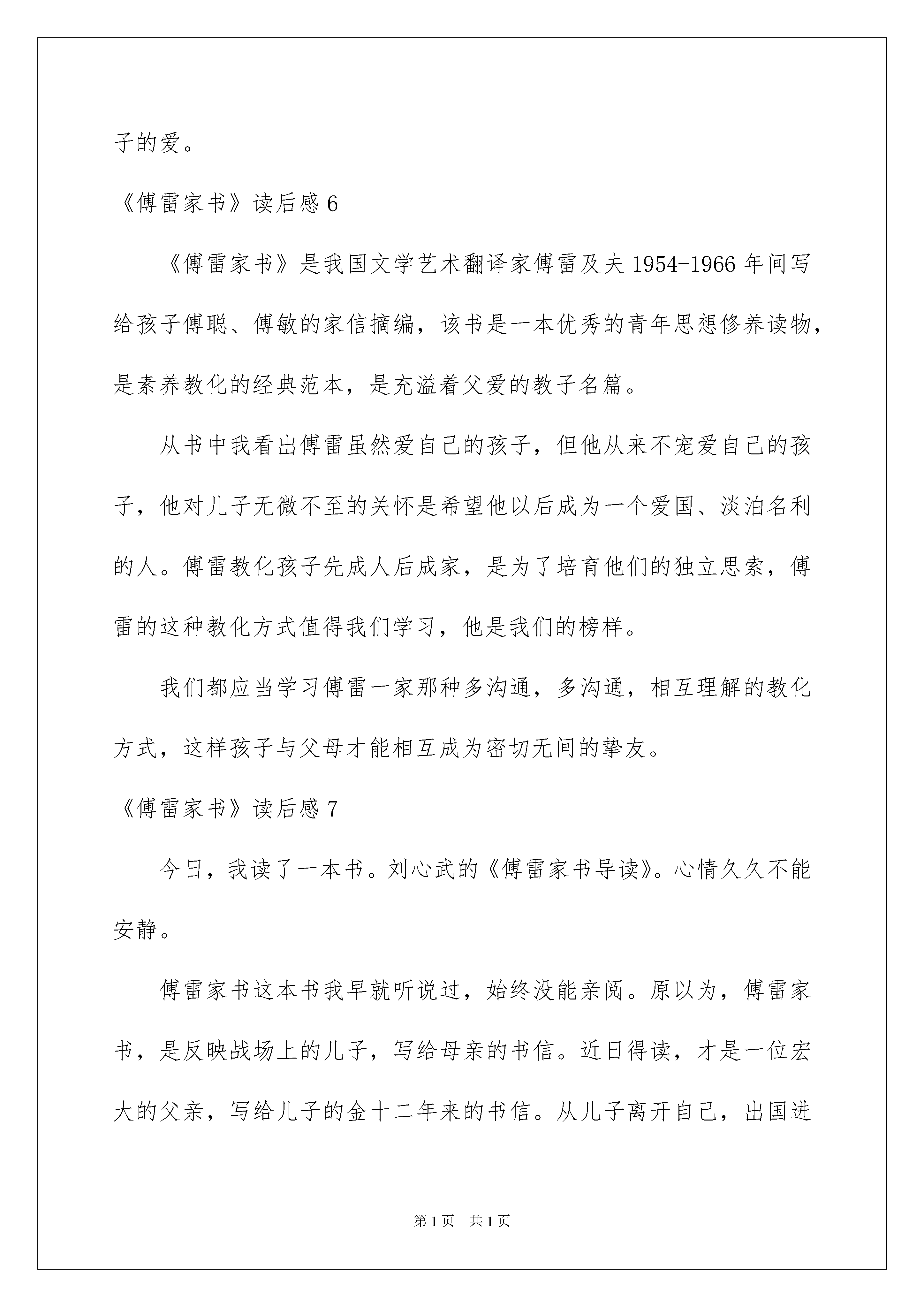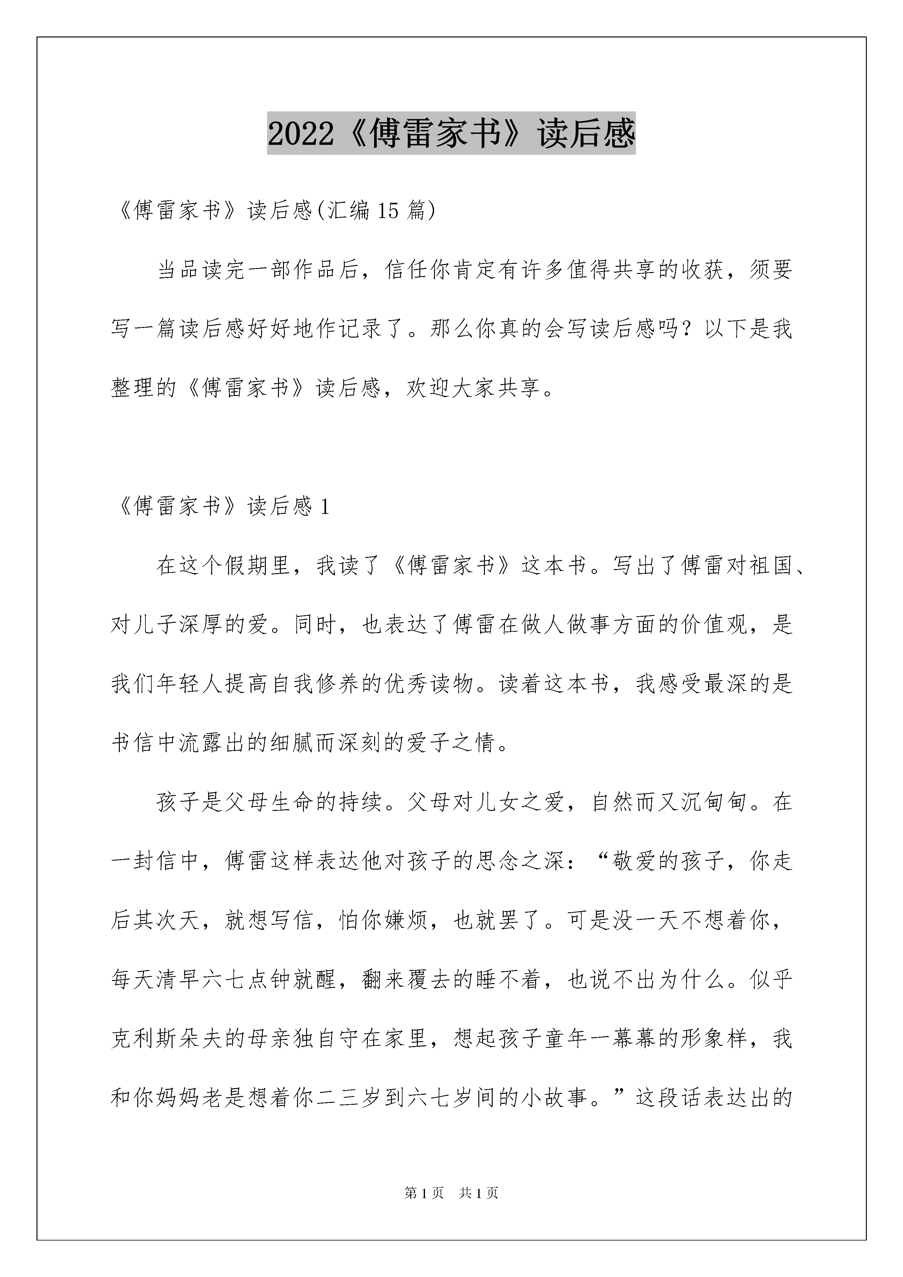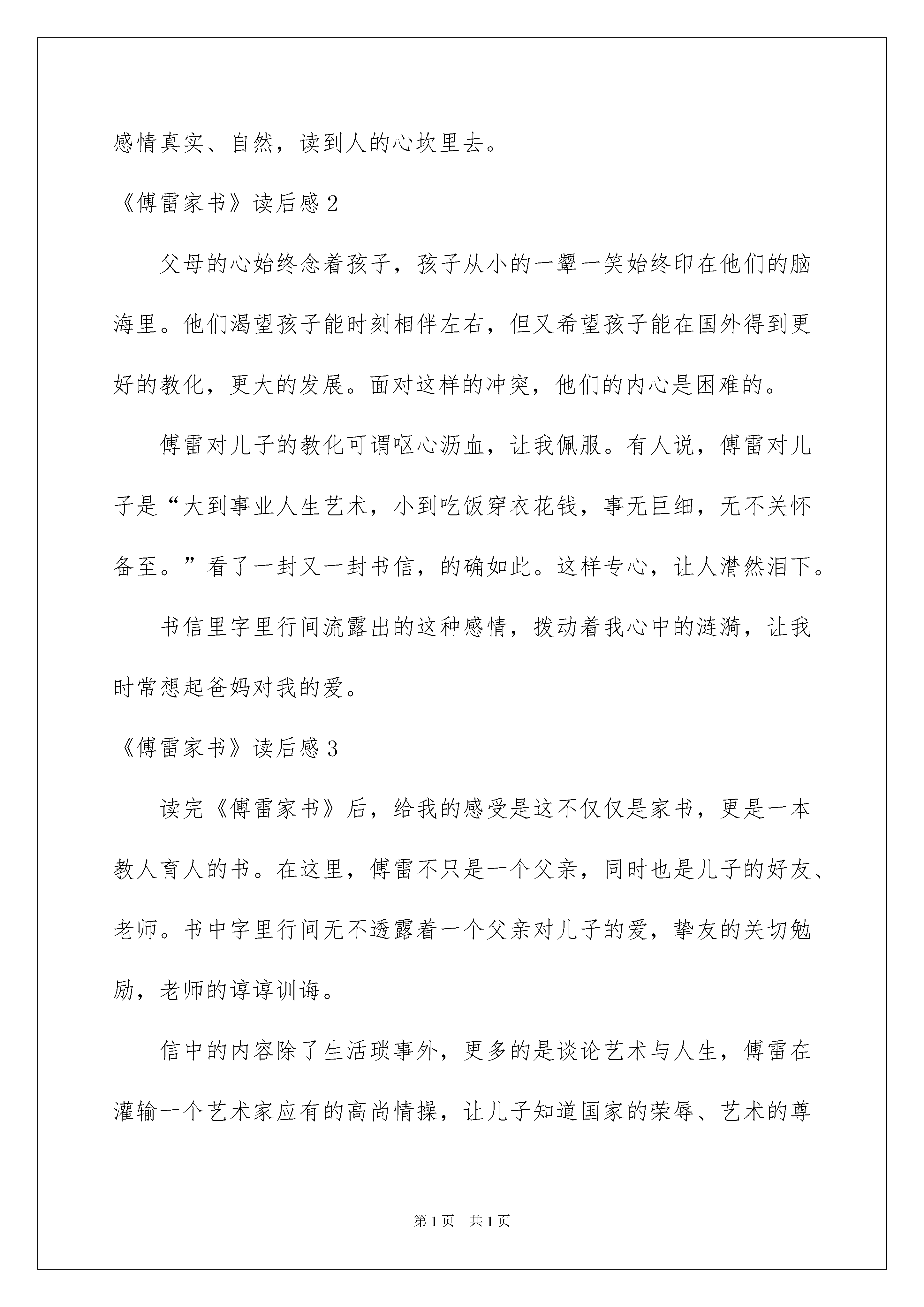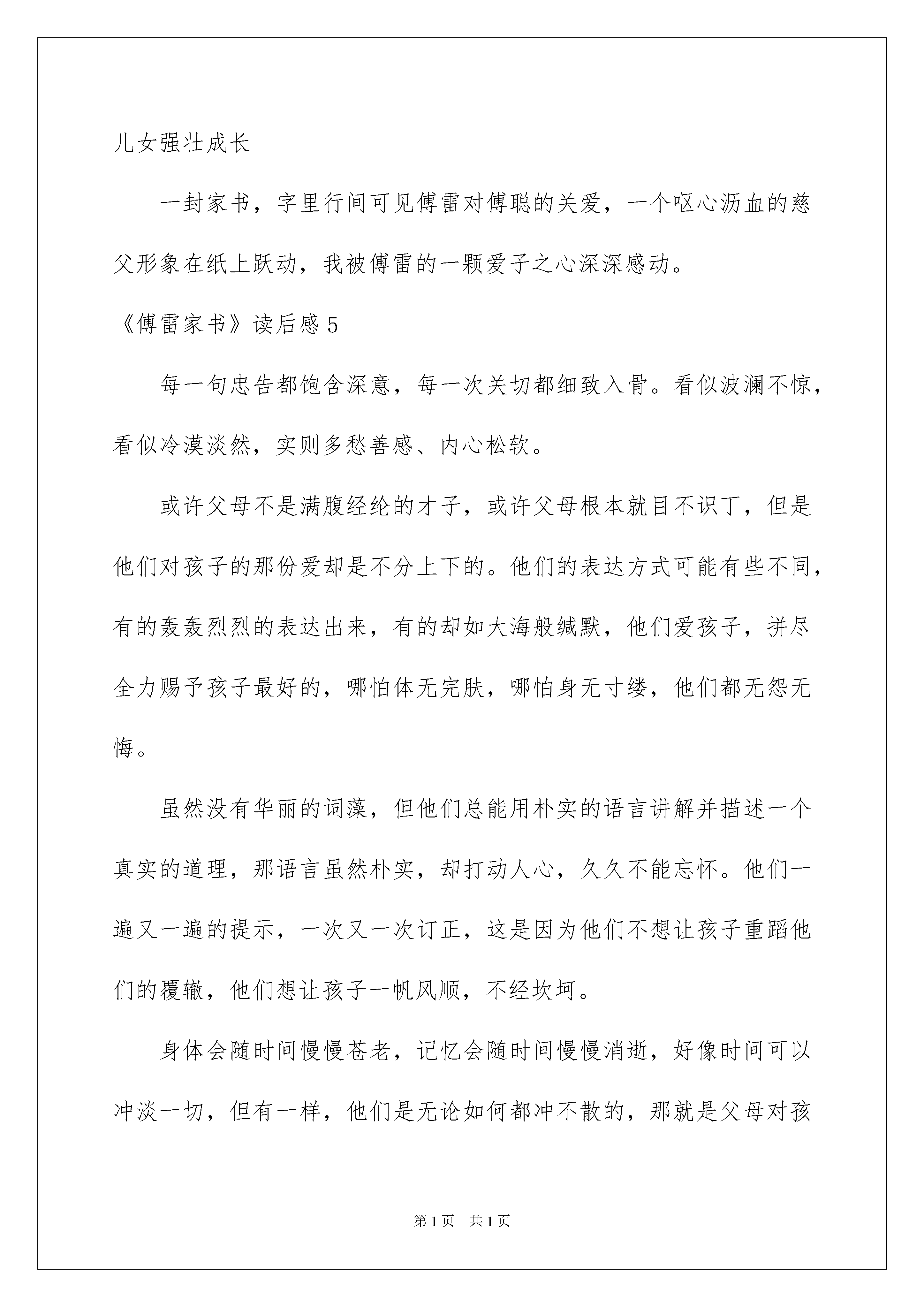 2022《傅雷家书》读后感《傅雷家书》读后感(汇编15篇)当品读完一部作品后,信任你肯定有许多值得共享的收获,须要写一篇读后感好好地作记录了。那么你真的会写读后感吗?以下是我整理的《傅雷家书》读后感,欢迎大家共享。《傅雷家书》读后感1在这个假期里,我读了《傅雷家书》这本书。写出了傅雷对祖国、对儿子深厚的爱。同时,也表达了傅雷在做人做事方面的价值观,是我们年轻人提高自我修养的优秀读物。读着这本书,我感受最深的是书信中流露出的细腻而深刻的爱子之情。孩子是父母生命的持续。父母对儿女之爱,自然而又沉甸甸。在一封信中,傅雷这样表达他对孩子的思念之深:“敬爱的孩子,你走后其次天,就想写信,怕你嫌烦,也就罢了。可是没一天不想着你,每天清早六七点钟就醒,翻来覆去的睡不着,也说不出为什么。似乎克利斯朵夫的母亲独自守在家里,想起孩子童年一幕幕的形象样,我和你妈妈老是想着你二三岁到六七岁间的小故事。”这段话表达出的感情真实、自然,读到人的心坎里去。《傅雷家书》读后感2父母的心始终念着孩子,孩子从小的一颦一笑始终印在他们的脑海里。他们渴望孩子能时刻相伴左右,但又希望孩子能在国外得到更好的教化,更大的发展。面对这样的冲突,他们的内心是困难的。傅雷对儿子的教化可谓呕心沥血,让我佩服。有人说,傅雷对儿子是“大到事业人生艺术,小到吃饭穿衣花钱,事无巨细,无不关怀备至。”看了一封又一封书信,的确如此。这样专心,让人潸然泪下。书信里字里行间流露出的这种感情,拨动着我心中的涟漪,让我时常想起爸妈对我的爱。《傅雷家书》读后感3读完《傅雷家书》后,给我的感受是这不仅仅是家书,更是一本教人育人的书。在这里,傅雷不只是一个父亲,同时也是儿子的好友、老师。书中字里行间无不透露着一个父亲对儿子的爱,挚友的关切勉励,老师的谆谆训诲。信中的内容除了生活琐事外,更多的是谈论艺术与人生,傅雷在灌输一个艺术家应有的高尚情操,让儿子知道国家的荣辱、艺术的尊严,做一个德艺兼备,人格卓越的艺术家。为此,他不断寄送大量中国本土文化的学习资料,生怕儿子离开故土后把本土文化渐忘。《傅雷家书》凝合着傅雷对党和国家的爱以及对儿子的深切期望。信中,傅雷告知儿子一个年轻人如何做人、对待生活的问题,对儿子进行了引导,如在学习上应当劳逸结合,先学习乐理,切不行操之过急。还有母亲的无微不至的关切,如在婚恋方面。都像是良师益友一样提出看法和建议。《傅雷家书》读后感4这封书信是傅雷写给儿子傅聪的,字里行间透露着傅雷深深的爱子之情。对于不断长大的儿子,傅雷希望他能在外面的世界强壮成长,但又不忍孩子远离身边。其实家长们都一样,辛辛苦苦地一点点将儿女培育成长,希望孩子们长大能成为一个有用的人。而傅雷和他的妻子也是这样,用自己毕生的心血去培育傅聪,真是爱子情深。从这个片段中,我体会到了父母对儿女含辛茹苦的哺育之情,他们辛辛苦苦工作,为儿女营造一个良好的学习环境,让儿女在一个舒适的场所学习,我们每个人都体会过这种深厚的感情。当我读着这本家书,我感受到的是父母那颗炙热的心,暖和地照在儿女的心田,使儿女强壮成长一封家书,字里行间可见傅雷对傅聪的关爱,一个呕心沥血的慈父形象在纸上跃动,我被傅雷的一颗爱子之心深深感动。《傅雷家书》读后感5每一句忠告都饱含深意,每一次关切都细致入骨。看似波澜不惊,看似冷漠淡然,实则多愁善感、内心松软。或许父母不是满腹经纶的才子,或许父母根本就目不识丁,但是他们对孩子的那份爱却是不分上下的。他们的表达方式可能有些不同,有的轰轰烈烈的表达出来,有的却如大海般缄默,他们爱孩子,拼尽全力赐予孩子最好的,哪怕体无完肤,哪怕身无寸缕,他们都无怨无悔。虽然没有华丽的词藻,但他们总能用朴实的语言讲解并描述一个真实的道理,那语言虽然朴实,却打动人心,久久不能忘怀。他们一遍又一遍的提示,一次又一次订正,这是因为他们不想让孩子重蹈他们的覆辙,他们想让孩子一帆风顺,不经坎坷。身体会随时间慢慢苍老,记忆会随时间慢慢消逝,好像时间可以冲淡一切,但有一样,他们是无论如何都冲不散的,那就是父母对孩子的爱。《傅雷家书》读后感6《傅雷家书》是我国文学艺术翻译家傅雷及夫1954-1966年间写给孩子傅聪、傅敏的家信摘编,该书是一本优秀的青年思想修养读物,是素养教化的经典范本,是充溢着父爱的教子名篇。从书中我看出傅雷虽然爱自己的孩子,但他从来不宠爱自己的孩子,他对儿子无微不至的关怀是希望他以后成为一个爱国、淡泊名利的人。傅雷教化孩子先成人后成家,是为了培育他们的独立思索,傅雷的这种教化方式值得我们学习,他是我们的榜样。我们都应当学习傅雷一家那种多沟通,多沟通,相互理解的教化方式,这样孩