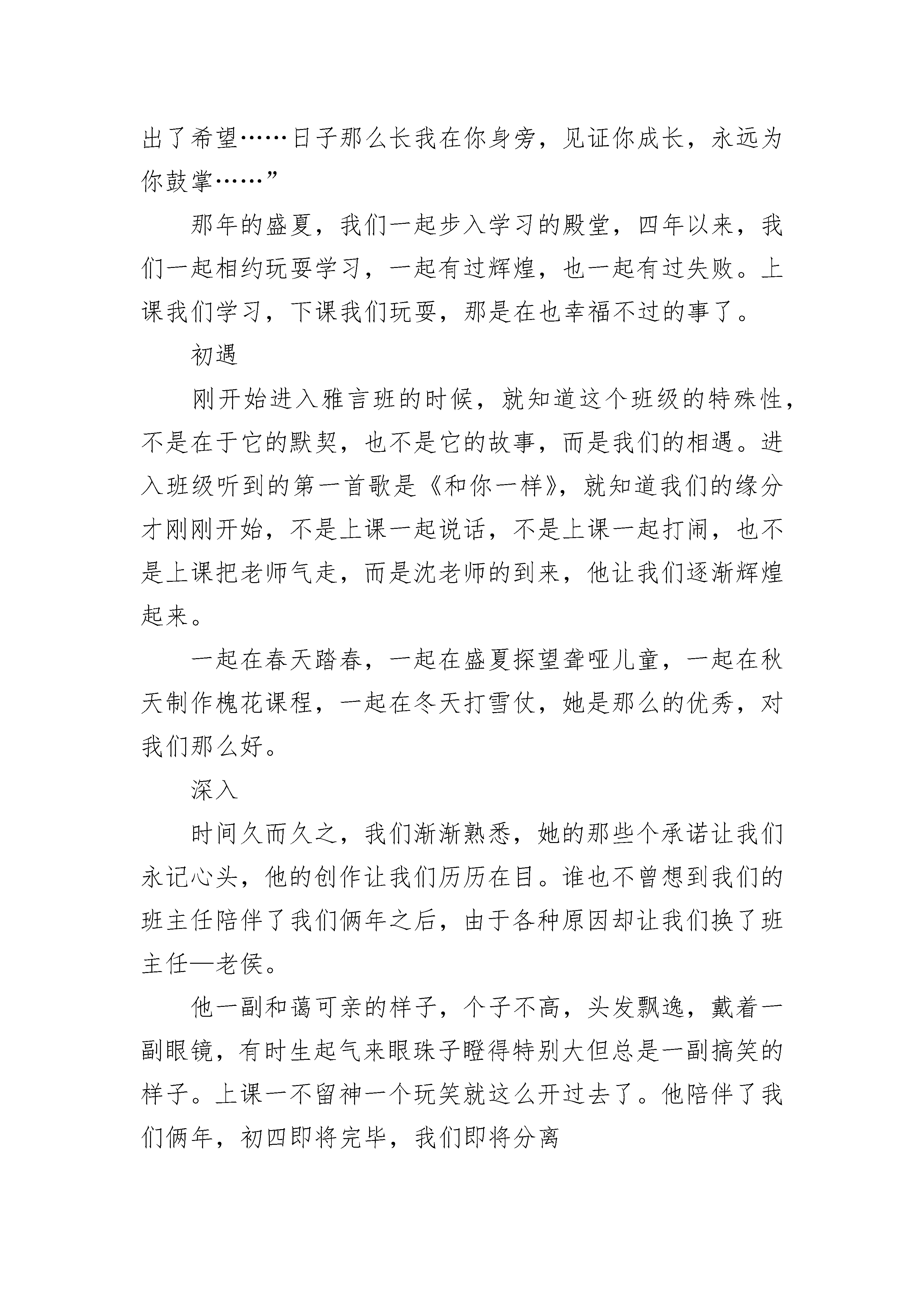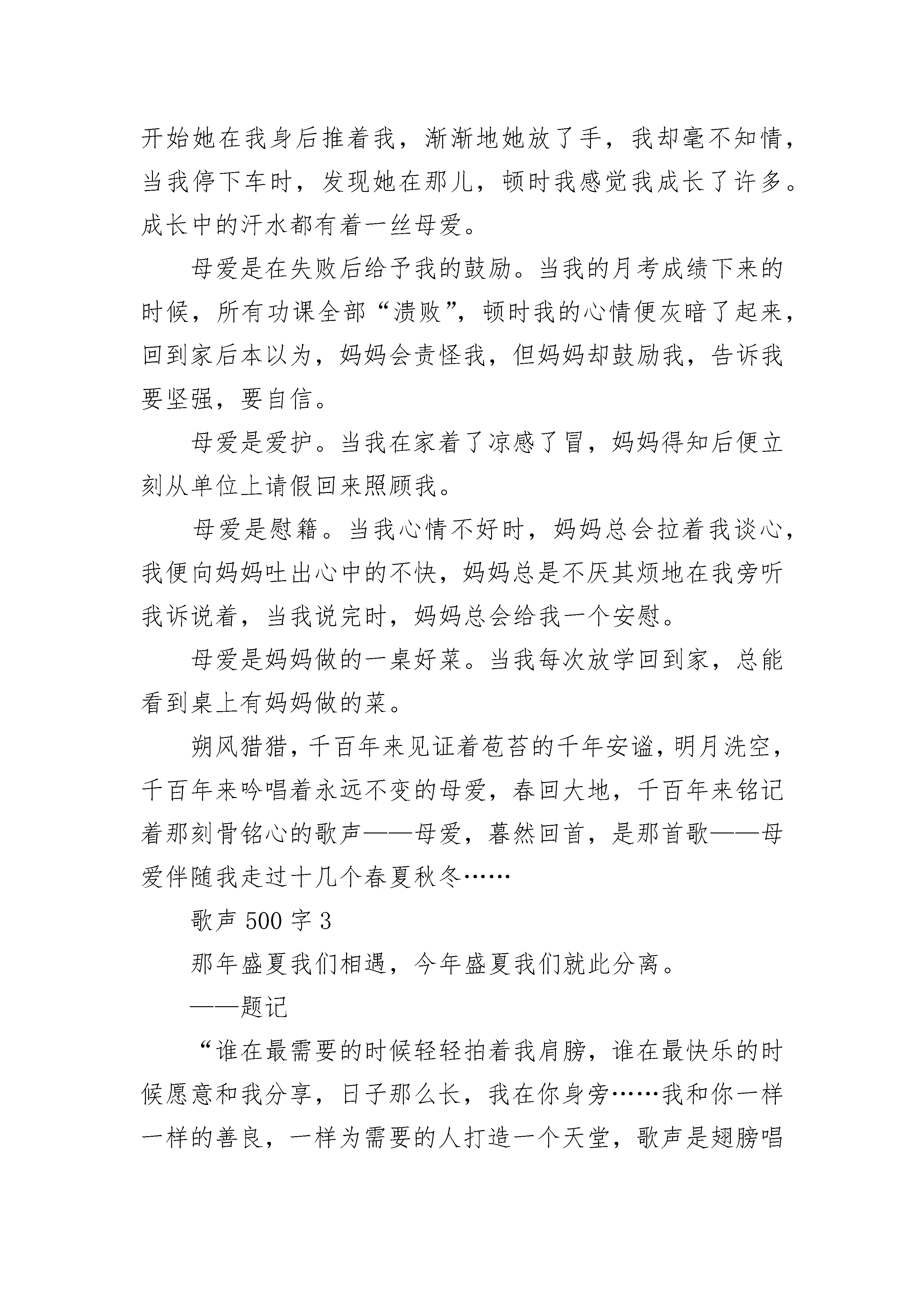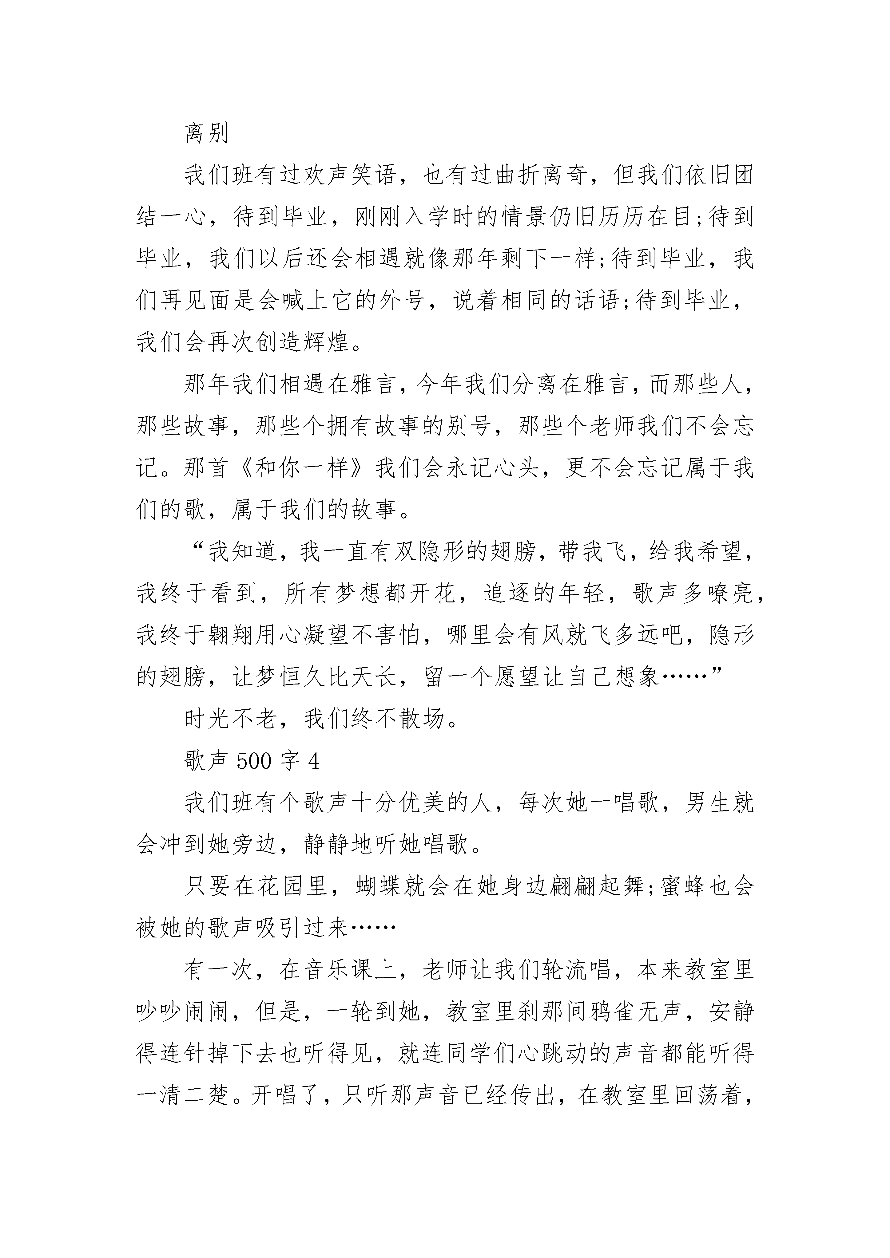歌声500字初中作文作为高等动物的人类,可以通过许多介质来表达情感。书信、报纸、电视、网络等成为了解他人的渠道。但是有一种声音,它所传达的信息要远远大于这些现代化的媒介。那就是歌声。在一首好的歌曲中,不仅表达了词作者的文学修养与情感经历,更是把曲作者的艺术细胞与音乐感体现得淋漓尽致。当然,这一切最终要通过一个懂得的人来演唱。好词配好曲,必须经过歌手的富有魅力的嗓音来加工才能成为好歌。歌曲并不是现代才出现的,早在几千年前,古人就开始吟诗写词,并用小调唱出来。到了元朝,曲变成了一项专长的艺术,一时间,元曲响彻大江南北。而曲中却大多不乏人情世故,像是一个受尽苦难的人平静地将自身经历娓娓道来。发展到现代,歌曲的形式便被丰富了许多,而最受大众喜爱的恐怕非流行音乐莫属了吧!流行音乐自打出现之日起便决定着它今后将一发不可收。因为流行音乐的通俗、简单、唱法多样,又不缺少韵味,它被许多人所接受。而有些热衷于流行音乐的“粉丝”也最终成了受人追捧的创作者。朴树,便是其中的一个经典。刚提起朴树这个名字时,我也像许多人那样,认为不过是一个普通的哗众取宠的网络歌手。而当我第一次认真地听完他所演唱的《平凡之路》时,我的内心极为震撼。这首歌的“不平凡”让我想了解朴树是怎样的一个“平凡人”。朴树,原名濮树,受其哥哥濮石的影响,从高中起热爱音乐。在经历许多波折后,陷入对自己人生的思考,曾抑郁多年。也曾是当年身价排行第二的“最佳新人”。当他陷入对人生的思考而抑郁时,是音乐让他重新走了出来。通过这首《平凡之路》让人们了解这些年他的心路历程,以及他现在的立世态度。是啊!正如歌中所说“我曾经毁了我的一切,想挣扎无法自拔”。在经过漫长的与心魔的斗争后,“我曾经像你像他像那野草野花,绝望着渴望着也哭也笑也平凡着”。他终于回归平凡。歌声承载着人的感情寄托,通过歌词,可以了解词人的情感经历,而真正赋予歌曲灵魂的则是演唱者的有“经历”的“沧桑”的嗓音。声音是自然界中最富有灵魂的信息媒介,而歌声却是属于人类特有的表达情感的方式。想要了解一个人的经历,不必去翻阅他的简历,单单认真地分析他的一首歌,你便能从中体会到歌者的灵魂。歌声中有另一个你所不知道的世界。歌声500字2有一支儿歌,在脑海回荡,永远不会忘记,这首歌叫:母爱。母爱是一杯提神的清茶,还记得在为了备战期末考试时夜夜不知时间地读书,但妈妈却轻轻推开房门,手上捧着淡淡的清茶小心翼翼地走到我旁边,温柔的拍拍我的肩膀,说:“困了吧,想去睡觉就去睡觉吧,如果不想就把这杯清茶喝下去吧。”淡淡的茶香含着一丝母爱的味道。母爱是为了成长而放手,那时,母亲带我去练习骑车,开始她在我身后推着我,渐渐地她放了手,我却毫不知情,当我停下车时,发现她在那儿,顿时我感觉我成长了许多。成长中的汗水都有着一丝母爱。母爱是在失败后给予我的鼓励。当我的月考成绩下来的时候,所有功课全部“溃败”,顿时我的心情便灰暗了起来,回到家后本以为,妈妈会责怪我,但妈妈却鼓励我,告诉我要坚强,要自信。母爱是爱护。当我在家着了凉感了冒,妈妈得知后便立刻从单位上请假回来照顾我。母爱是慰籍。当我心情不好时,妈妈总会拉着我谈心,我便向妈妈吐出心中的不快,妈妈总是不厌其烦地在我旁听我诉说着,当我说完时,妈妈总会给我一个安慰。母爱是妈妈做的一桌好菜。当我每次放学回到家,总能看到桌上有妈妈做的菜。朔风猎猎,千百年来见证着苞苔的千年安谧,明月洗空,千百年来吟唱着永远不变的母爱,春回大地,千百年来铭记着那刻骨铭心的歌声——母爱,暮然回首,是那首歌——母爱伴随我走过十几个春夏秋冬……歌声500字3那年盛夏我们相遇,今年盛夏我们就此分离。——题记“谁在最需要的时候轻轻拍着我肩膀,谁在最快乐的时候愿意和我分享,日子那么长,我在你身旁……我和你一样一样的善良,一样为需要的人打造一个天堂,歌声是翅膀唱出了希望……日子那么长我在你身旁,见证你成长,永远为你鼓掌……”那年的盛夏,我们一起步入学习的殿堂,四年以来,我们一起相约玩耍学习,一起有过辉煌,也一起有过失败。上课我们学习,下课我们玩耍,那是在也幸福不过的事了。初遇刚开始进入雅言班的时候,就知道这个班级的特殊性,不是在于它的默契,也不是它的故事,而是我们的相遇。进入班级听到的第一首歌是《和你一样》,就知道我们的缘分才刚刚开始,不是上课一起说话,不是上课一起打闹,也不是上课把老师气走,而是沈老师的到来,他让我们逐渐辉煌起来。一起在春天踏春,一起在盛夏探望聋哑儿童,一起在秋天制作槐花课程,一起在冬天打雪仗,她是那么的优秀,对我们那么好。深入时间久而久之,我们渐渐熟悉,她的那些个承诺让我们永记心头,他的创作让我们历历在目。谁也不曾想到我们的班主任陪伴了我们俩年之后,由于各种原因却让我们换了班主任—老侯。他一副和蔼可亲的样子,个子不高,头发飘逸,戴着一副眼镜,