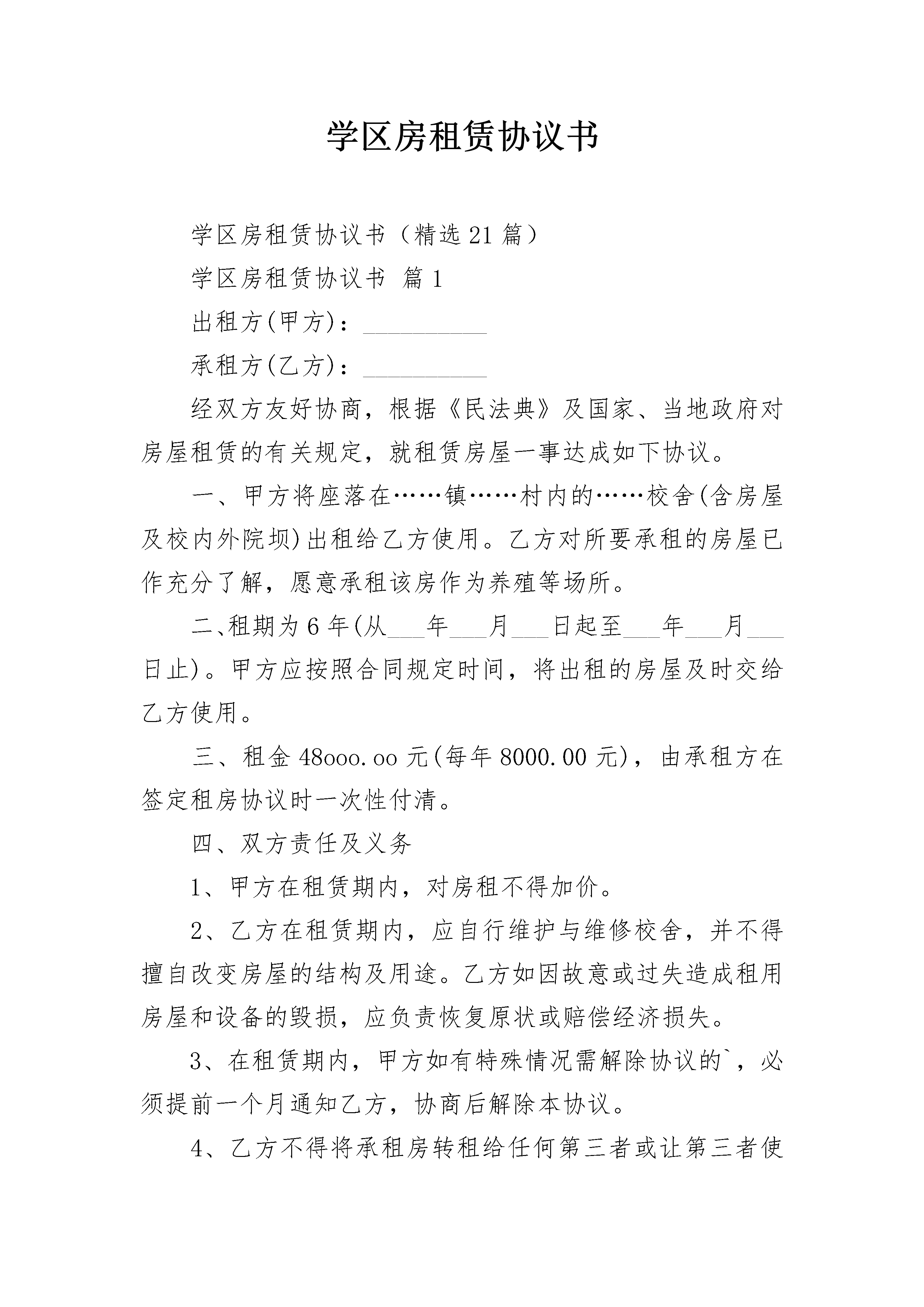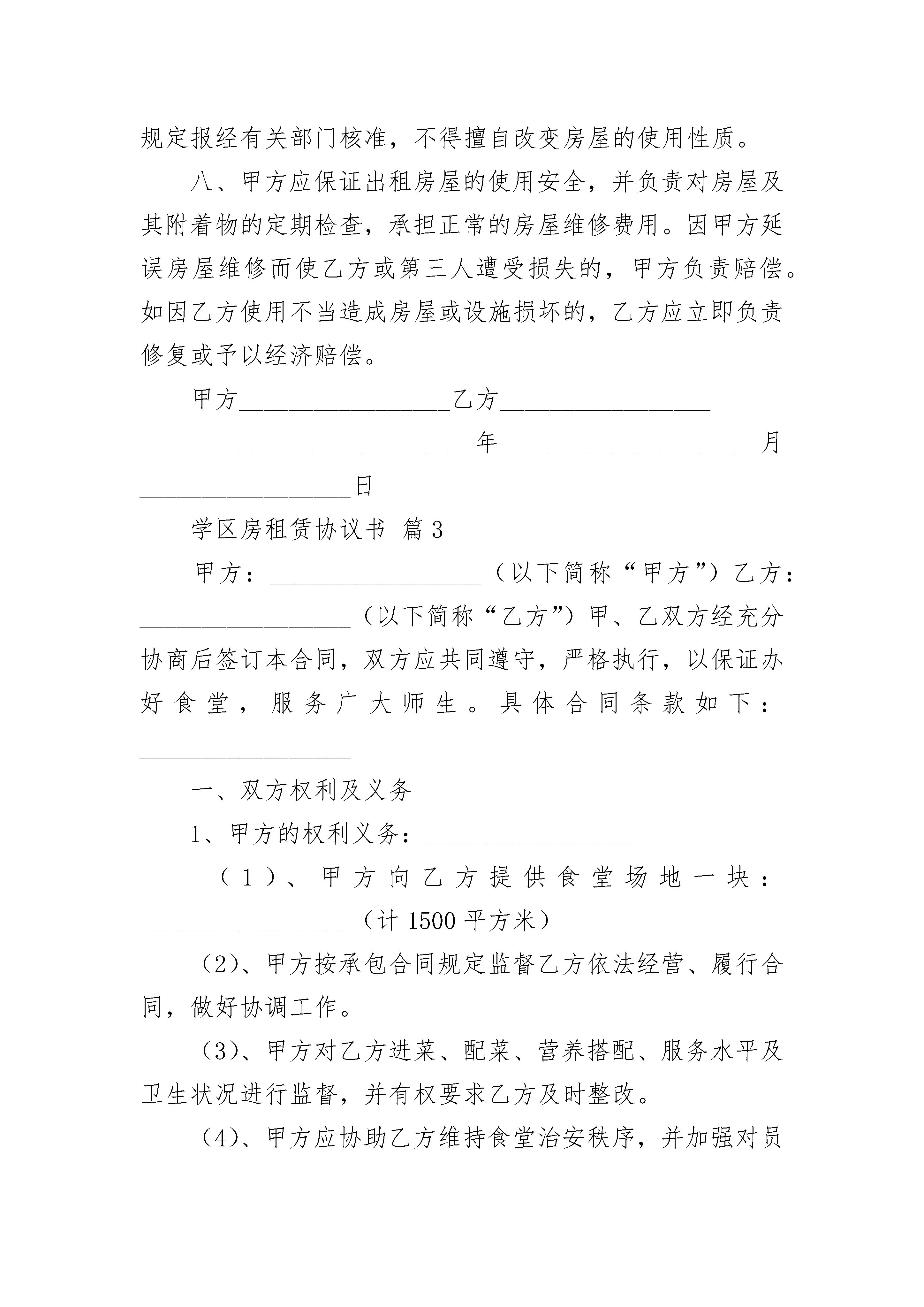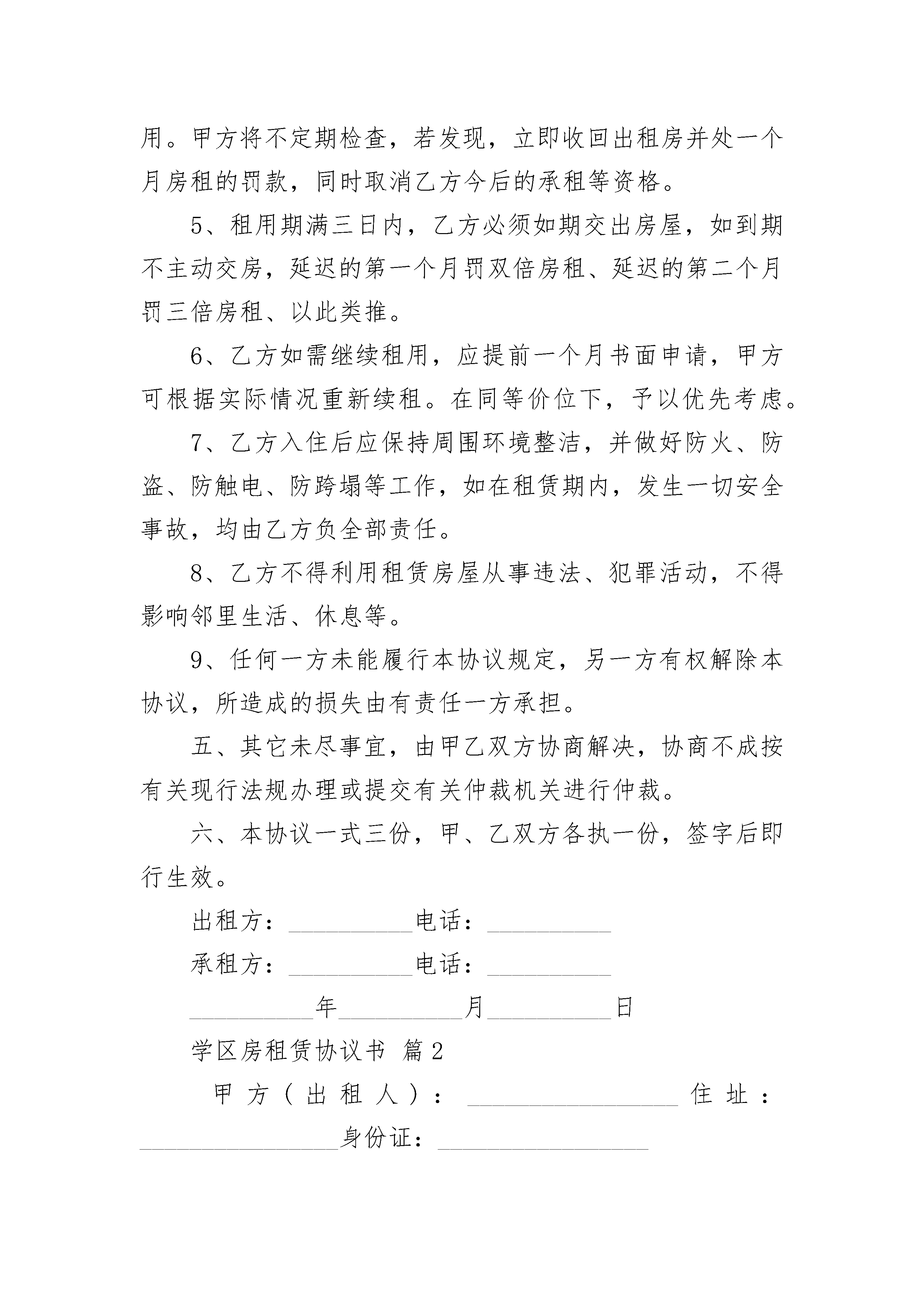 学区房租赁协议书学区房租赁协议书(精选21篇)学区房租赁协议书篇1出租方(甲方):__________承租方(乙方):__________经双方友好协商,根据《民法典》及国家、当地政府对房屋租赁的有关规定,就租赁房屋一事达成如下协议。一、甲方将座落在……镇……村内的……校舍(含房屋及校内外院坝)出租给乙方使用。乙方对所要承租的房屋已作充分了解,愿意承租该房作为养殖等场所。二、租期为6年(从___年___月___日起至___年___月___日止)。甲方应按照合同规定时间,将出租的房屋及时交给乙方使用。三、租金48ooo.oo元(每年8000.00元),由承租方在签定租房协议时一次性付清。四、双方责任及义务1、甲方在租赁期内,对房租不得加价。2、乙方在租赁期内,应自行维护与维修校舍,并不得擅自改变房屋的结构及用途。乙方如因故意或过失造成租用房屋和设备的毁损,应负责恢复原状或赔偿经济损失。3、在租赁期内,甲方如有特殊情况需解除协议的`,必须提前一个月通知乙方,协商后解除本协议。4、乙方不得将承租房转租给任何第三者或让第三者使用。甲方将不定期检查,若发现,立即收回出租房并处一个月房租的罚款,同时取消乙方今后的承租等资格。5、租用期满三日内,乙方必须如期交出房屋,如到期不主动交房,延迟的第一个月罚双倍房租、延迟的第二个月罚三倍房租、以此类推。6、乙方如需继续租用,应提前一个月书面申请,甲方可根据实际情况重新续租。在同等价位下,予以优先考虑。7、乙方入住后应保持周围环境整洁,并做好防火、防盗、防触电、防跨塌等工作,如在租赁期内,发生一切安全事故,均由乙方负全部责任。8、乙方不得利用租赁房屋从事违法、犯罪活动,不得影响邻里生活、休息等。9、任何一方未能履行本协议规定,另一方有权解除本协议,所造成的损失由有责任一方承担。五、其它未尽事宜,由甲乙双方协商解决,协商不成按有关现行法规办理或提交有关仲裁机关进行仲裁。六、本协议一式三份,甲、乙双方各执一份,签字后即行生效。出租方:__________电话:__________承租方:__________电话:____________________年__________月__________日学区房租赁协议书篇2甲方(出租人):_________________住址:________________身份证:_________________乙方(承租人):_________________住址:_________________身份证:________________丙方(中介方):_________________根据国家、省有关法律、法规和本市的有关规定,甲、乙双方在自愿、公平、诚实信用、等价有偿原则的基础上,经充分协商,同意就下列房屋租赁事项,订立本合同,并共同遵守。一、甲方自愿将座落在本市_________________区_________________房屋,使用面积_________________平方米,房产证号_________________,出租给乙方使用。乙方已对甲方所要出租的房屋做了充分了解,愿意承租该房屋。二、该房屋租赁期自_________________年_________________月_________________日起至_________________年_________________月_________________日止。三、该房屋每月租金总额(大写)_________________,¥_________________元。四、该房屋租金_________________年内不变。自第_________________年起,月租金为_________________。五、乙方必须按时向甲方缴纳租金。付款的时间及方式_________________。六、乙方保证所租赁的房屋权作为_________________房使用。七、租赁期内,乙方未事先征得甲方的书面同意,并按规定报经有关部门核准,不得擅自改变房屋的使用性质。八、甲方应保证出租房屋的使用安全,并负责对房屋及其附着物的定期检查,承担正常的房屋维修费用。因甲方延误房屋维修而使乙方或第三人遭受损失的,甲方负责赔偿。如因乙方使用不当造成房屋或设施损坏的,乙方应立即负责修复或予以经济赔偿。甲方_________________乙方__________________________________年_________________月_________________日学区房租赁协议书篇3甲方:_________________(以下简称“甲方”)乙方:_________________(以下简称“乙方”)甲、乙双方经充分协商后签订本合同,双方应共同遵守,严格执行,以保证办好食堂,服务广大师生。具