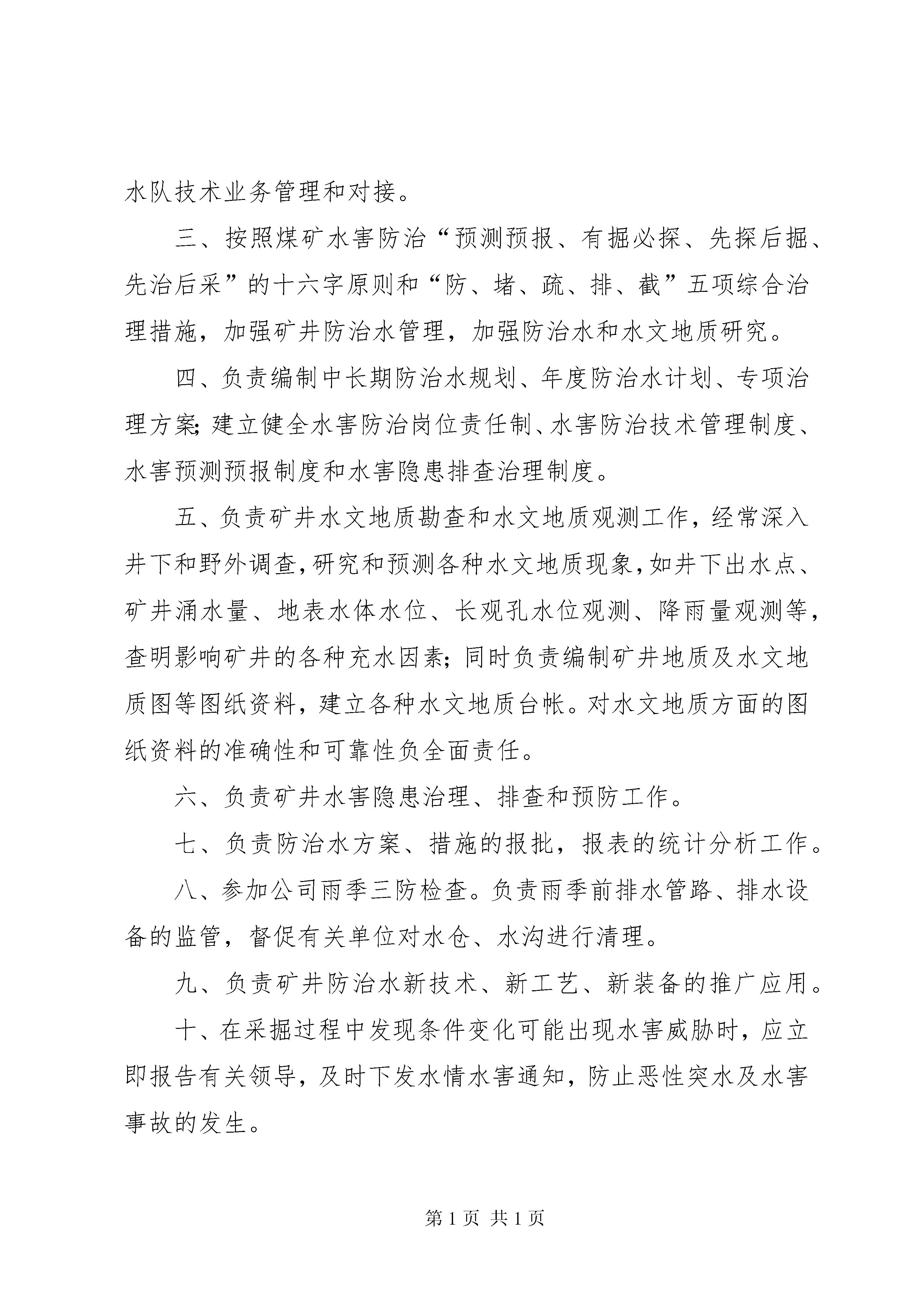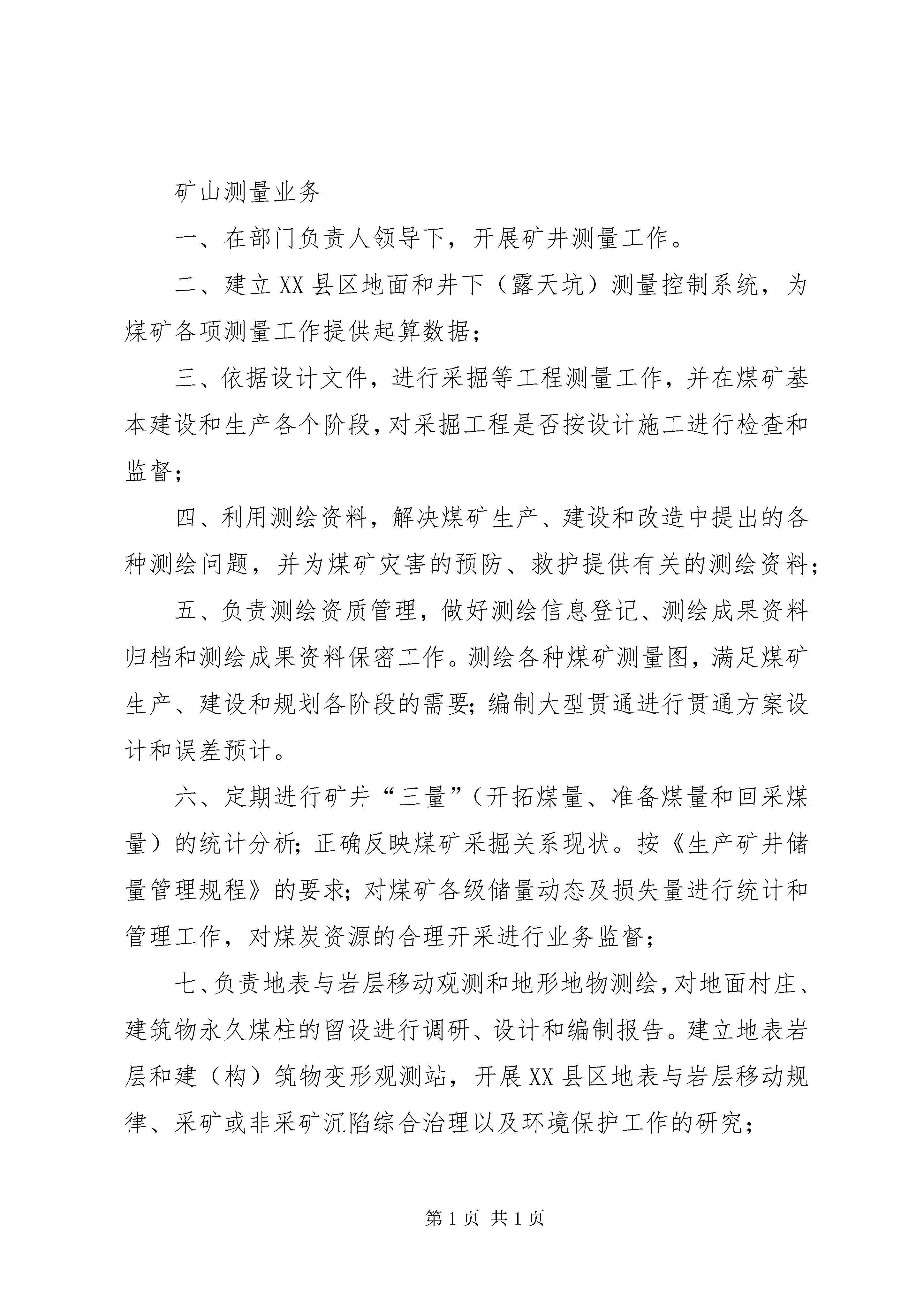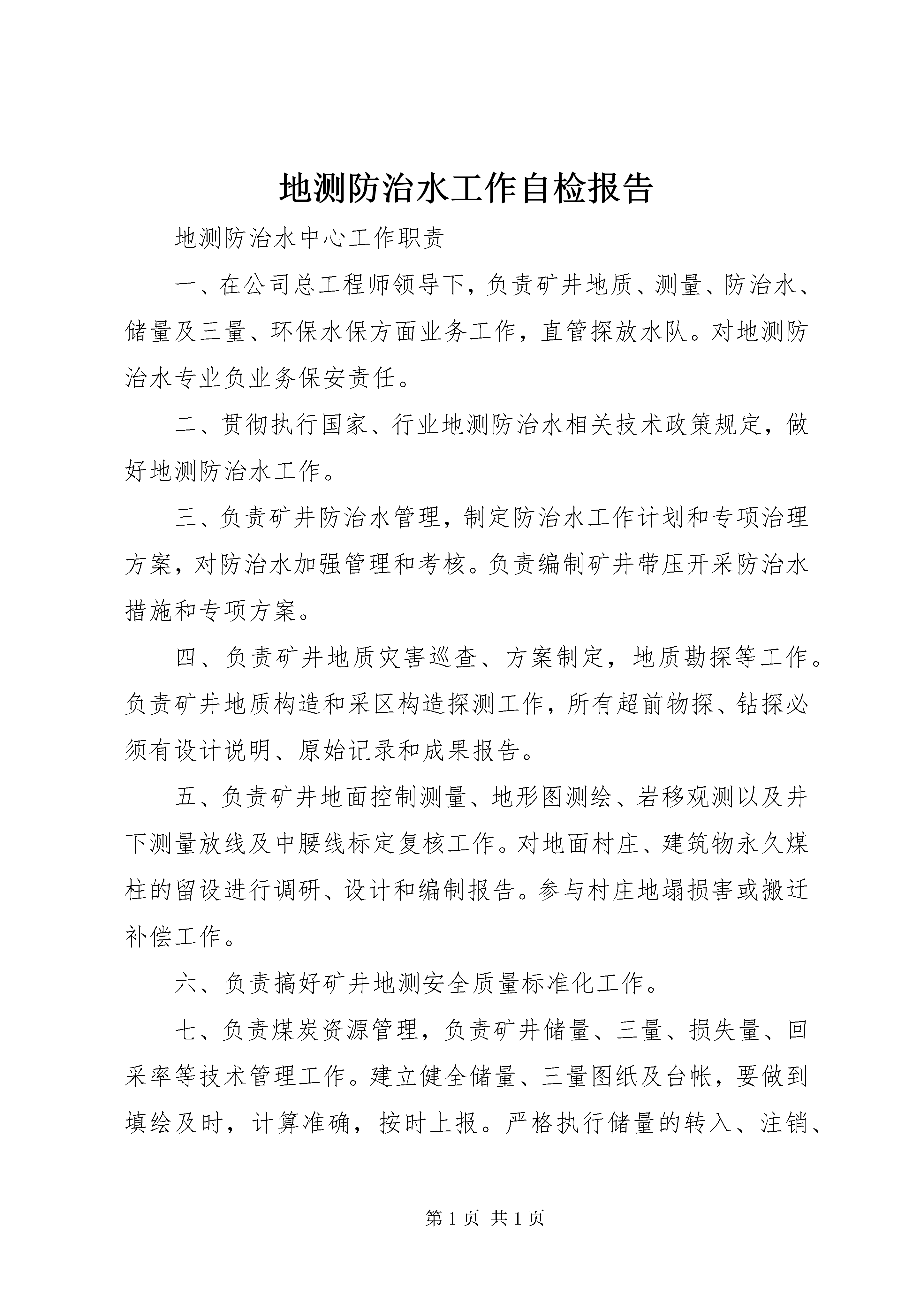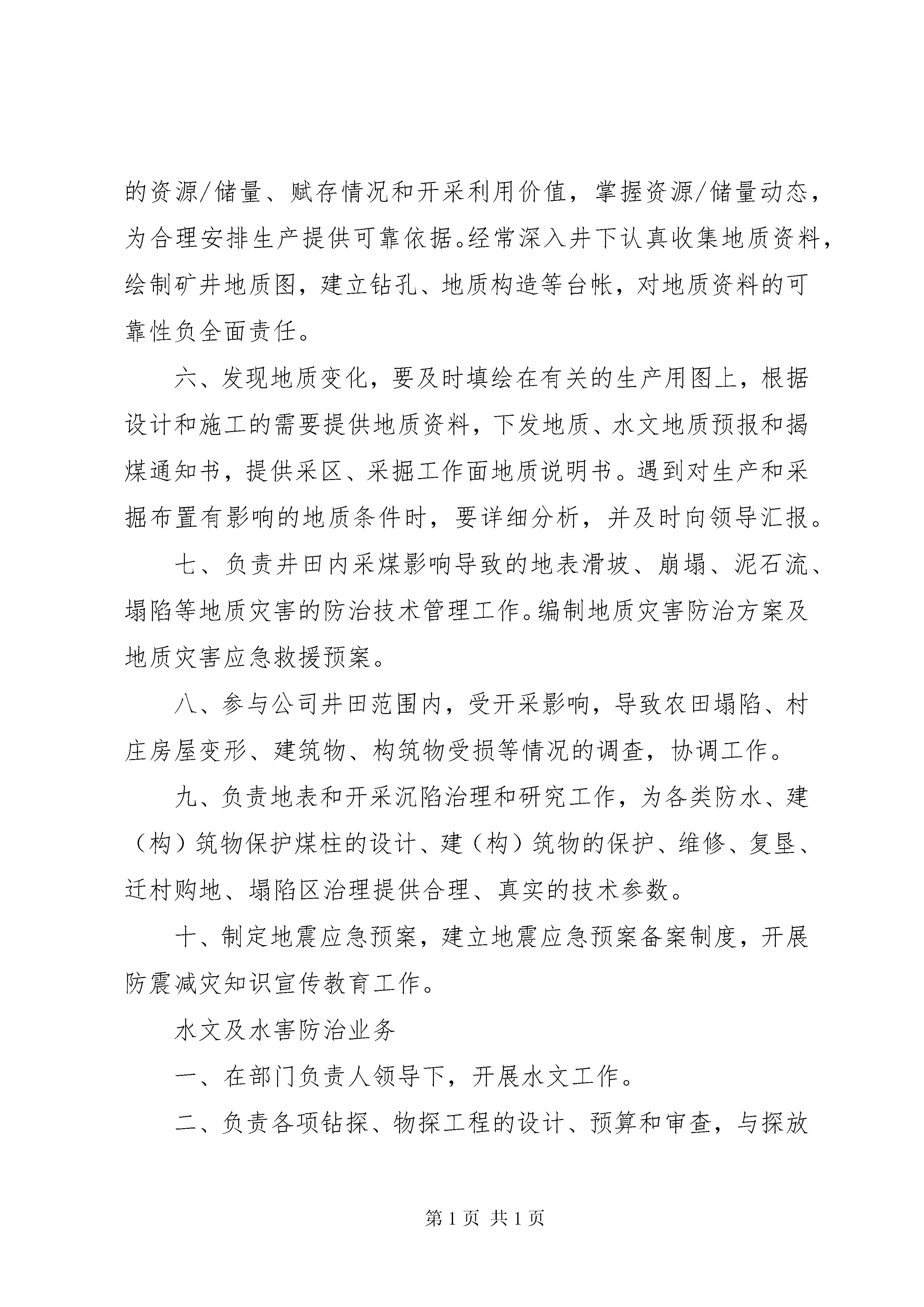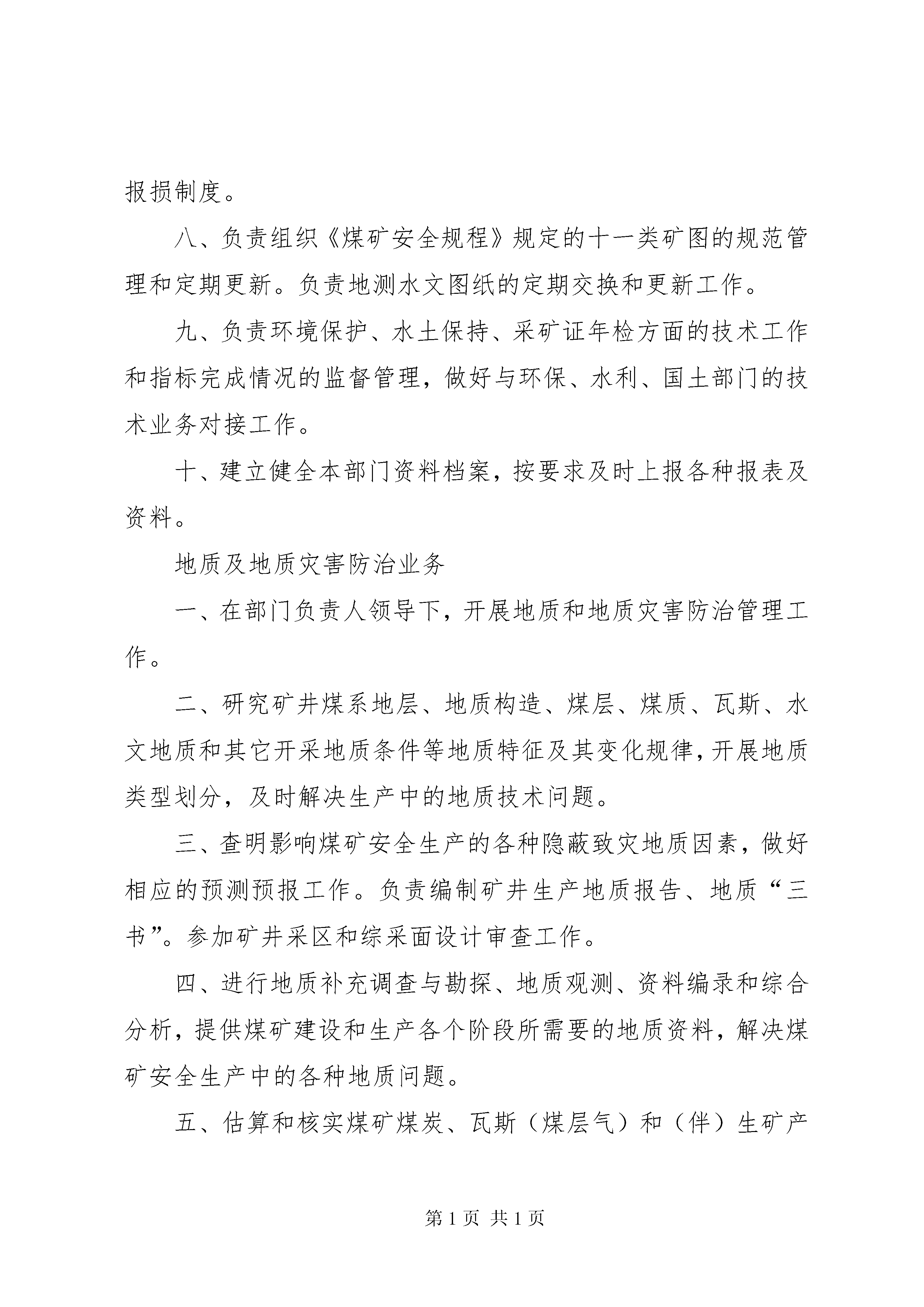 地测防治水工作自检报告地测防治水中心工作职责一、在公司总工程师领导下,负责矿井地质、测量、防治水、储量及三量、环保水保方面业务工作,直管探放水队。对地测防治水专业负业务保安责任。二、贯彻执行国家、行业地测防治水相关技术政策规定,做好地测防治水工作。三、负责矿井防治水管理,制定防治水工作计划和专项治理方案,对防治水加强管理和考核。负责编制矿井带压开采防治水措施和专项方案。四、负责矿井地质灾害巡查、方案制定,地质勘探等工作。负责矿井地质构造和采区构造探测工作,所有超前物探、钻探必须有设计说明、原始记录和成果报告。五、负责矿井地面控制测量、地形图测绘、岩移观测以及井下测量放线及中腰线标定复核工作。对地面村庄、建筑物永久煤柱的留设进行调研、设计和编制报告。参与村庄地塌损害或搬迁补偿工作。六、负责搞好矿井地测安全质量标准化工作。七、负责煤炭资源管理,负责矿井储量、三量、损失量、回采率等技术管理工作。建立健全储量、三量图纸及台帐,要做到填绘及时,计算准确,按时上报。严格执行储量的转入、注销、报损制度。八、负责组织《煤矿安全规程》规定的十一类矿图的规范管理和定期更新。负责地测水文图纸的定期交换和更新工作。九、负责环境保护、水土保持、采矿证年检方面的技术工作和指标完成情况的监督管理,做好与环保、水利、国土部门的技术业务对接工作。十、建立健全本部门资料档案,按要求及时上报各种报表及资料。地质及地质灾害防治业务一、在部门负责人领导下,开展地质和地质灾害防治管理工作。二、研究矿井煤系地层、地质构造、煤层、煤质、瓦斯、水文地质和其它开采地质条件等地质特征及其变化规律,开展地质类型划分,及时解决生产中的地质技术问题。三、查明影响煤矿安全生产的各种隐蔽致灾地质因素,做好相应的预测预报工作。负责编制矿井生产地质报告、地质“三书”。参加矿井采区和综采面设计审查工作。四、进行地质补充调查与勘探、地质观测、资料编录和综合分析,提供煤矿建设和生产各个阶段所需要的地质资料,解决煤矿安全生产中的各种地质问题。五、估算和核实煤矿煤炭、瓦斯(煤层气)和(伴)生矿产的资源/储量、赋存情况和开采利用价值,掌握资源/储量动态,为合理安排生产提供可靠依据。经常深入井下认真收集地质资料,绘制矿井地质图,建立钻孔、地质构造等台帐,对地质资料的可靠性负全面责任。六、发现地质变化,要及时填绘在有关的生产用图上,根据设计和施工的需要提供地质资料,下发地质、水文地质预报和揭煤通知书,提供采区、采掘工作面地质说明书。遇到对生产和采掘布置有影响的地质条件时,要详细分析,并及时向领导汇报。七、负责井田内采煤影响导致的地表滑坡、崩塌、泥石流、塌陷等地质灾害的防治技术管理工作。编制地质灾害防治方案及地质灾害应急救援预案。八、参与公司井田范围内,受开采影响,导致农田塌陷、村庄房屋变形、建筑物、构筑物受损等情况的调查,协调工作。九、负责地表和开采沉陷治理和研究工作,为各类防水、建(构)筑物保护煤柱的设计、建(构)筑物的保护、维修、复垦、迁村购地、塌陷区治理提供合理、真实的技术参数。十、制定地震应急预案,建立地震应急预案备案制度,开展防震减灾知识宣传教育工作。水文及水害防治业务一、在部门负责人领导下,开展水文工作。二、负责各项钻探、物探工程的设计、预算和审查,与探放水队技术业务管理和对接。三、按照煤矿水害防治“预测预报、有掘必探、先探后掘、先治后采”的十六字原则和“防、堵、疏、排、截”五项综合治理措施,加强矿井防治水管理,加强防治水和水文地质研究。四、负责编制中长期防治水规划、年度防治水计划、专项治理方案;建立健全水害防治岗位责任制、水害防治技术管理制度、水害预测预报制度和水害隐患排查治理制度。五、负责矿井水文地质勘查和水文地质观测工作,经常深入井下和野外调查,研究和预测各种水文地质现象,如井下出水点、矿井涌水量、地表水体水位、长观孔水位观测、降雨量观测等,查明影响矿井的各种充水因素;同时负责编制矿井地质及水文地质图等图纸资料,建立各种水文地质台帐。对水文地质方面的图纸资料的准确性和可靠性负全面责任。六、负责矿井水害隐患治理、排查和预防工作。七、负责防治水方案、措施的报批,报表的统计分析工作。八、参加公司雨季三防检查。负责雨季前排水管路、排水设备的监管,督促有关单位对水仓、水沟进行清理。九、负责矿井防治水新技术、新工艺、新装备的推广应用。十、在采掘过程中发现条件变化可能出现水害威胁时,应立即报告有关领导,及时下发水情水害通知,防止恶性突水及水害事故的发生。矿山测量业务一、在部门负责人领导下,开展矿井测量工作。二、建立XX县区地面和井下(露天坑)测量控制系统,为煤矿各项测量工作提供起算数据;三、依据设计文件,进行采掘等工程测量工作,并在煤矿基本建设和生产各个阶段,对采掘工程是否按设计