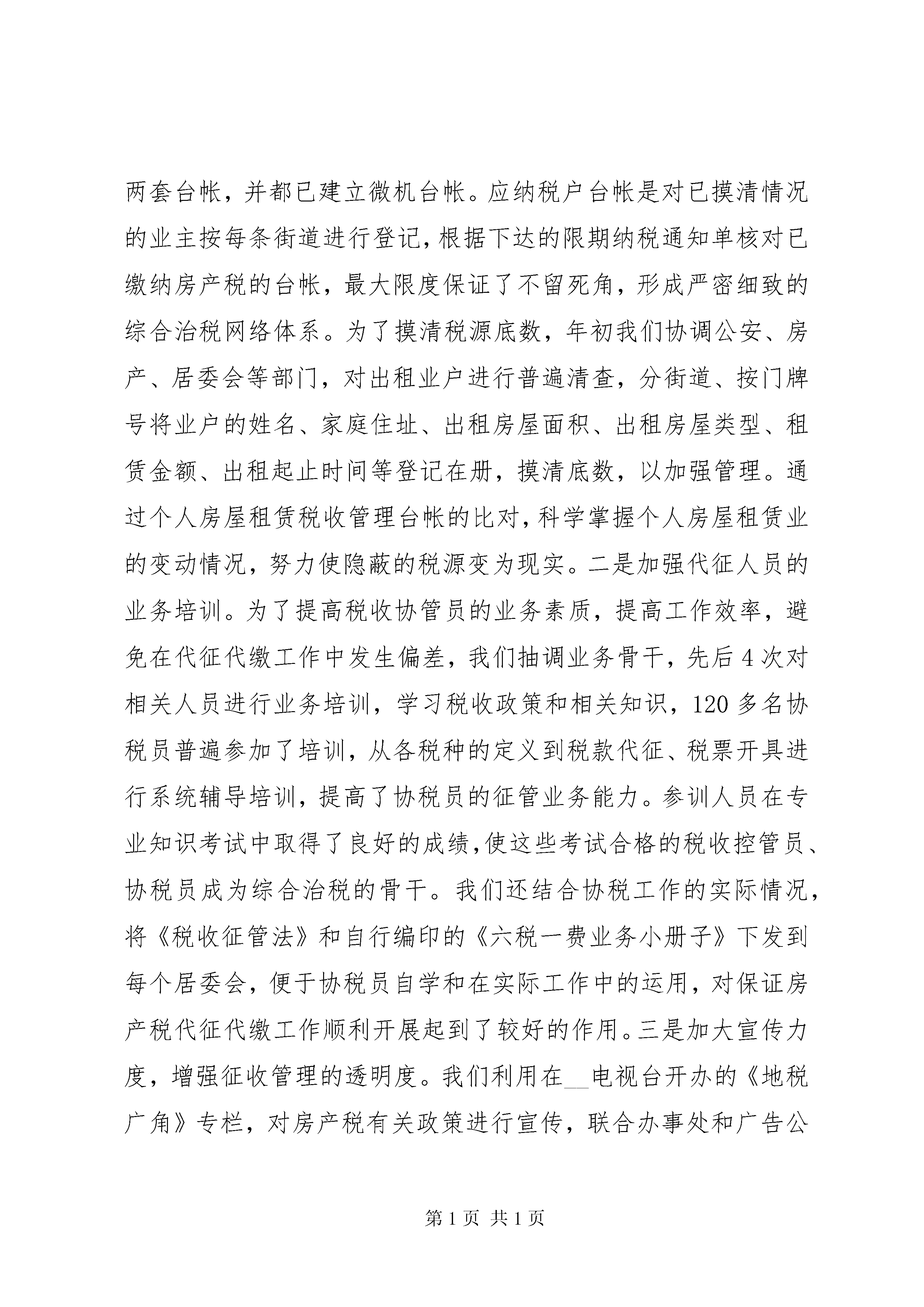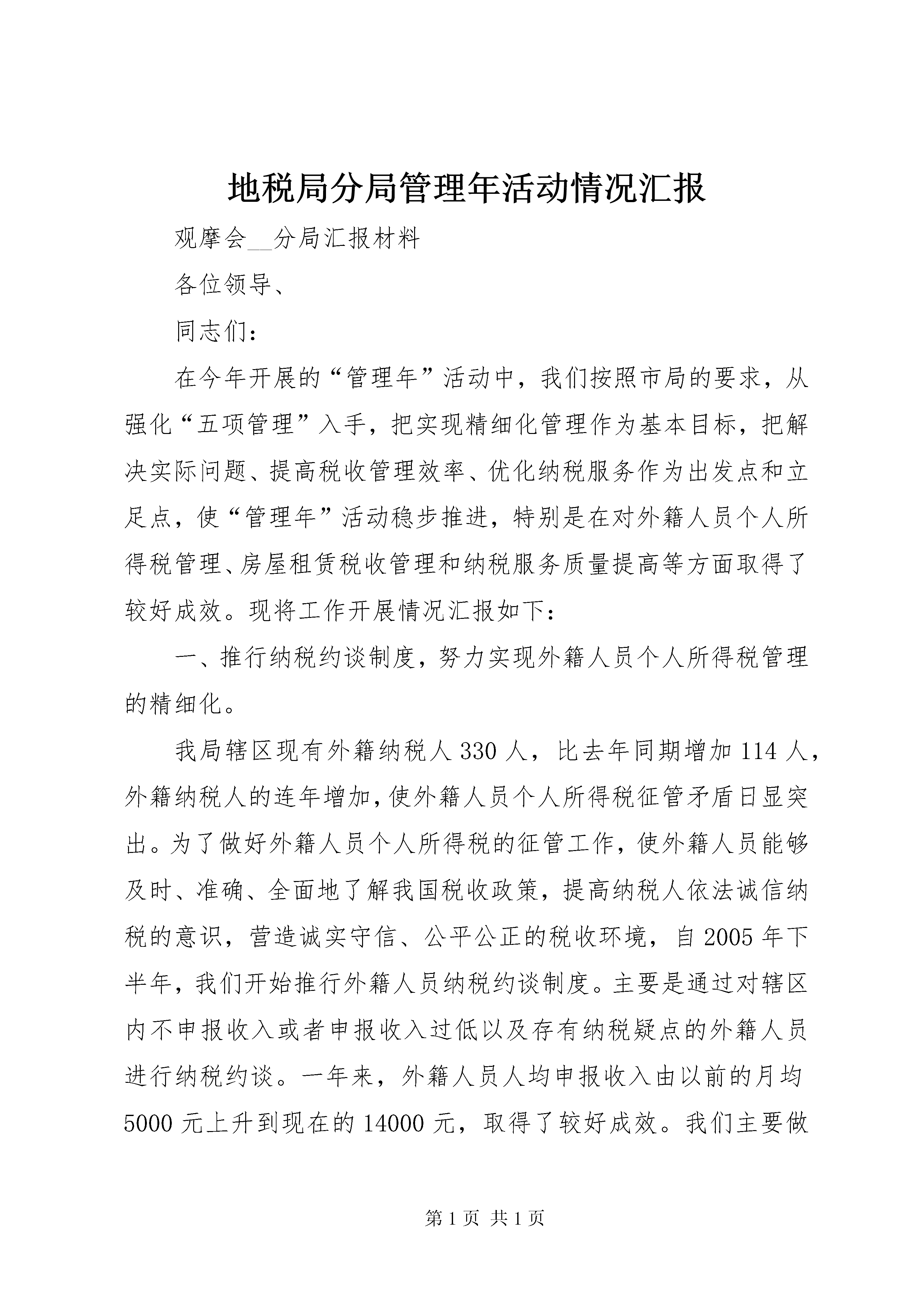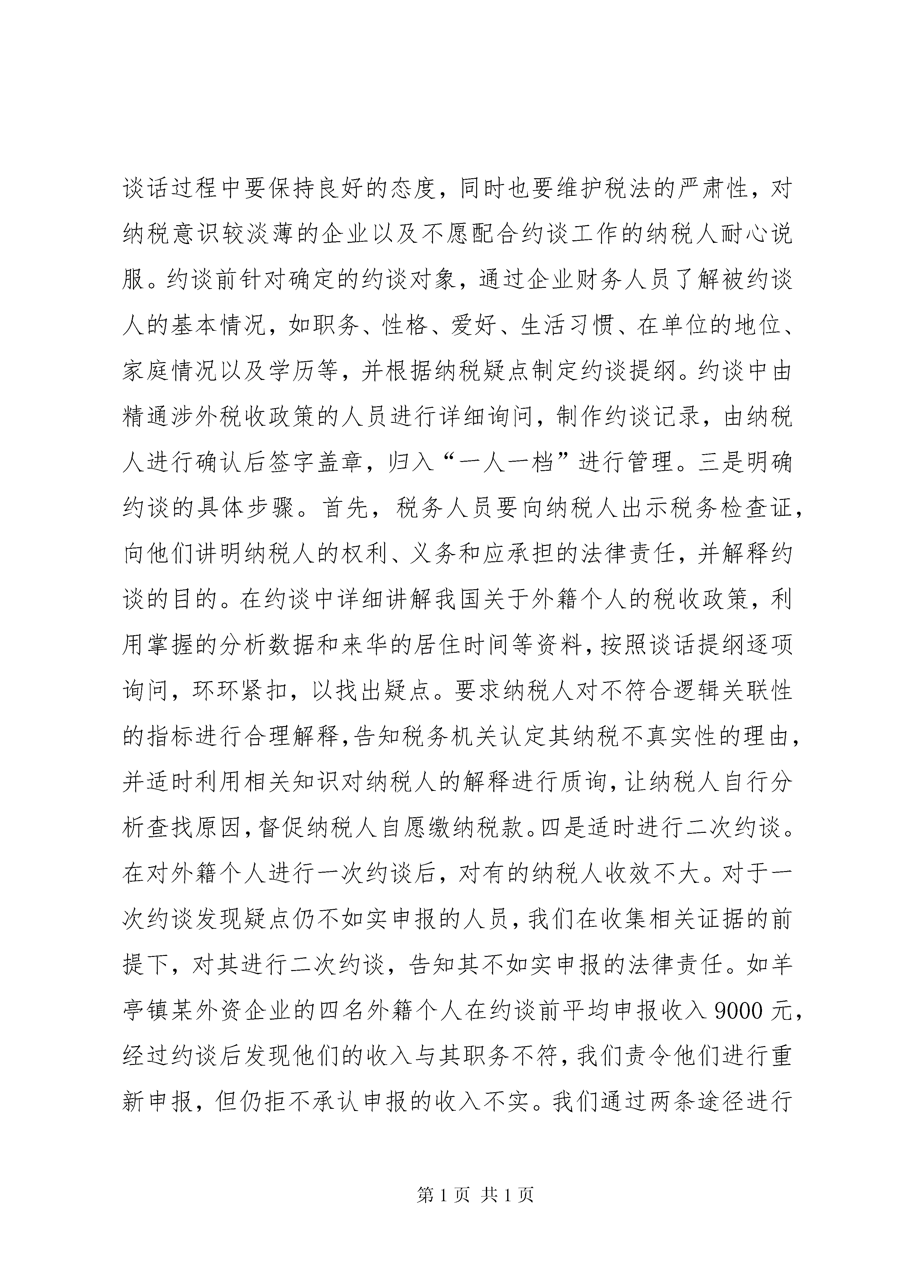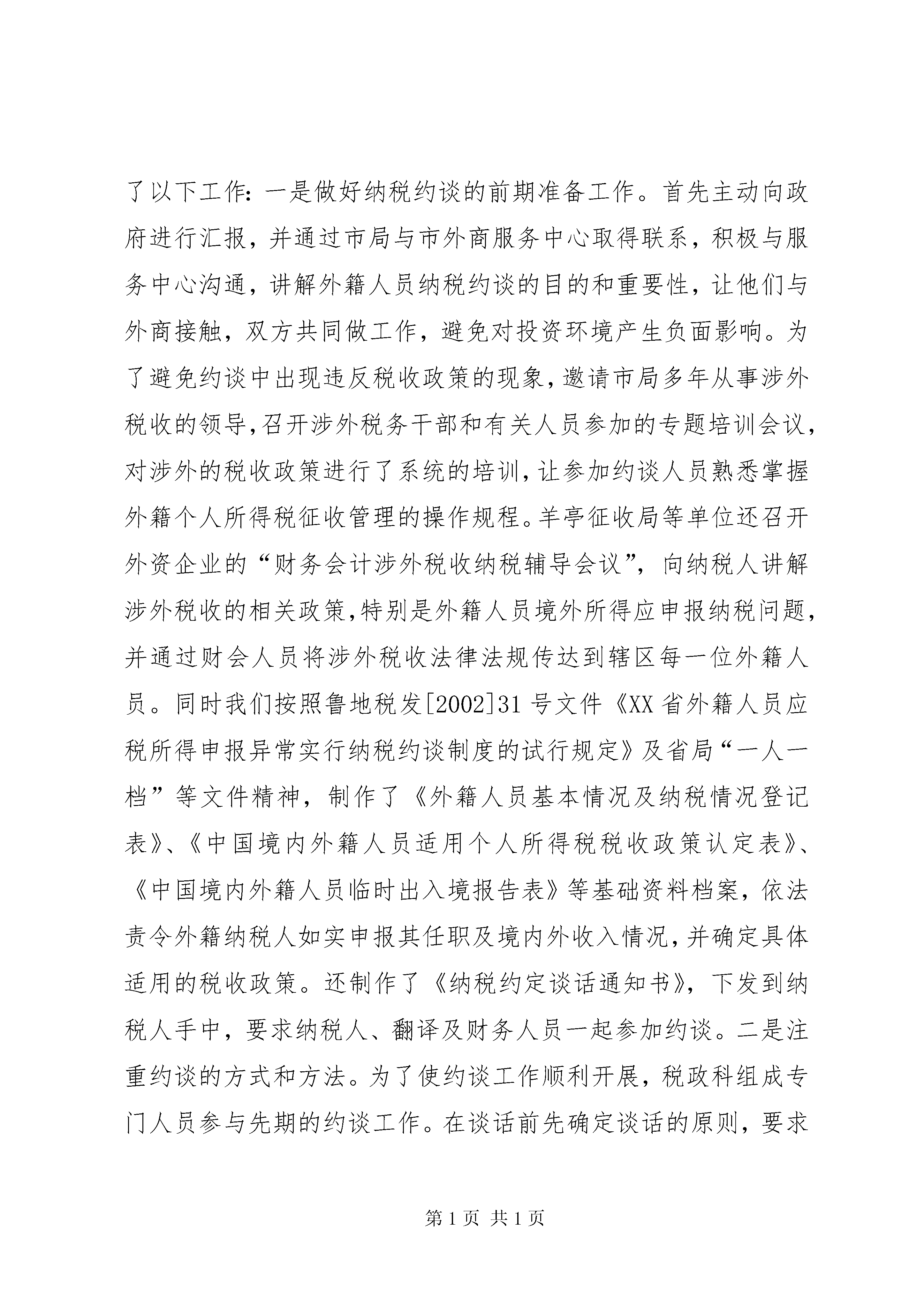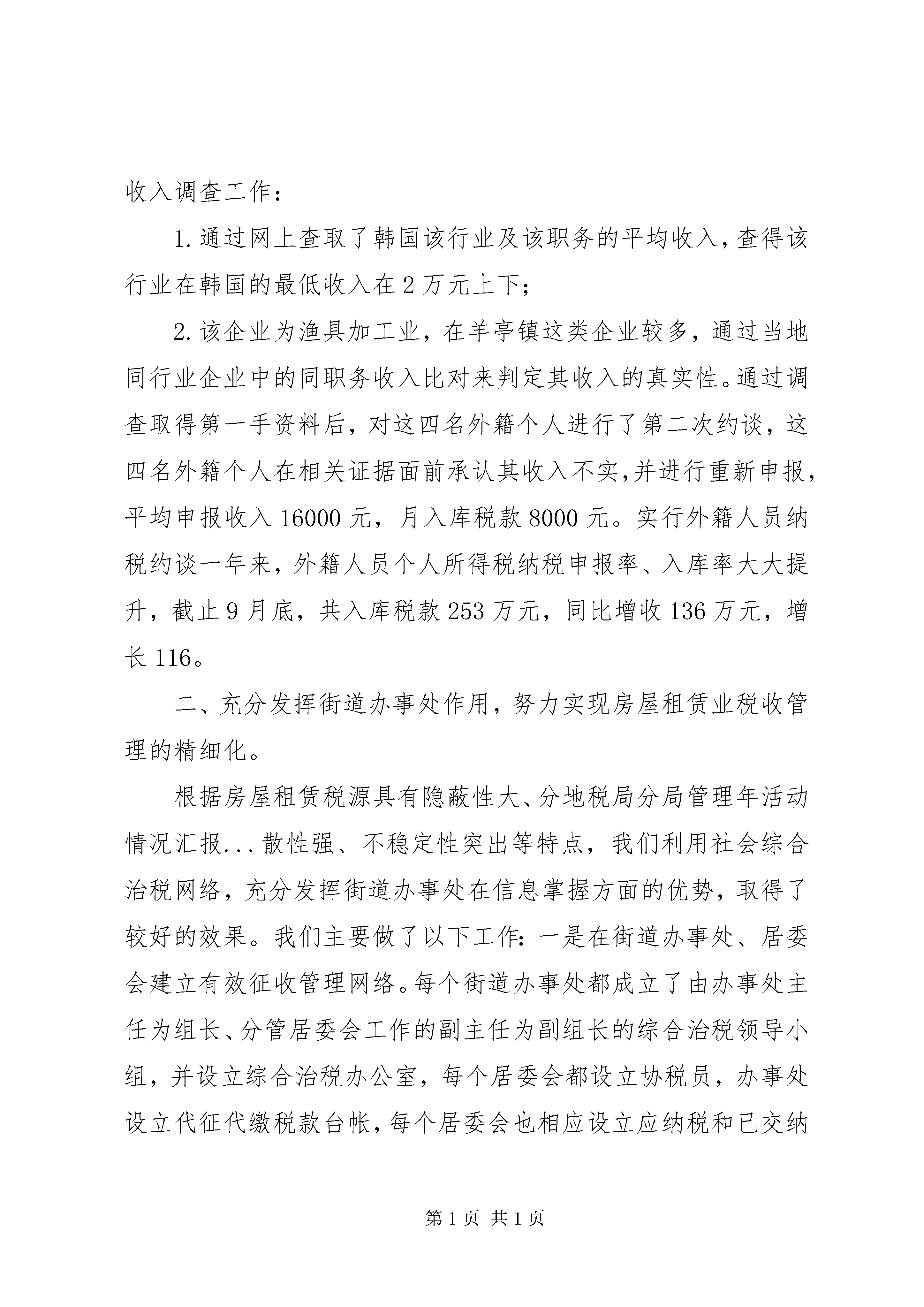 地税局分局管理年活动情况汇报观摩会__分局汇报材料各位领导、同志们:在今年开展的“管理年”活动中,我们按照市局的要求,从强化“五项管理”入手,把实现精细化管理作为基本目标,把解决实际问题、提高税收管理效率、优化纳税服务作为出发点和立足点,使“管理年”活动稳步推进,特别是在对外籍人员个人所得税管理、房屋租赁税收管理和纳税服务质量提高等方面取得了较好成效。现将工作开展情况汇报如下:一、推行纳税约谈制度,努力实现外籍人员个人所得税管理的精细化。我局辖区现有外籍纳税人330人,比去年同期增加114人,外籍纳税人的连年增加,使外籍人员个人所得税征管矛盾日显突出。为了做好外籍人员个人所得税的征管工作,使外籍人员能够及时、准确、全面地了解我国税收政策,提高纳税人依法诚信纳税的意识,营造诚实守信、公平公正的税收环境,自2005年下半年,我们开始推行外籍人员纳税约谈制度。主要是通过对辖区内不申报收入或者申报收入过低以及存有纳税疑点的外籍人员进行纳税约谈。一年来,外籍人员人均申报收入由以前的月均5000元上升到现在的14000元,取得了较好成效。我们主要做了以下工作:一是做好纳税约谈的前期准备工作。首先主动向政府进行汇报,并通过市局与市外商服务中心取得联系,积极与服务中心沟通,讲解外籍人员纳税约谈的目的和重要性,让他们与外商接触,双方共同做工作,避免对投资环境产生负面影响。为了避免约谈中出现违反税收政策的现象,邀请市局多年从事涉外税收的领导,召开涉外税务干部和有关人员参加的专题培训会议,对涉外的税收政策进行了系统的培训,让参加约谈人员熟悉掌握外籍个人所得税征收管理的操作规程。羊亭征收局等单位还召开外资企业的“财务会计涉外税收纳税辅导会议”,向纳税人讲解涉外税收的相关政策,特别是外籍人员境外所得应申报纳税问题,并通过财会人员将涉外税收法律法规传达到辖区每一位外籍人员。同时我们按照鲁地税发[2002]31号文件《XX省外籍人员应税所得申报异常实行纳税约谈制度的试行规定》及省局“一人一档”等文件精神,制作了《外籍人员基本情况及纳税情况登记表》、《中国境内外籍人员适用个人所得税税收政策认定表》、《中国境内外籍人员临时出入境报告表》等基础资料档案,依法责令外籍纳税人如实申报其任职及境内外收入情况,并确定具体适用的税收政策。还制作了《纳税约定谈话通知书》,下发到纳税人手中,要求纳税人、翻译及财务人员一起参加约谈。二是注重约谈的方式和方法。为了使约谈工作顺利开展,税政科组成专门人员参与先期的约谈工作。在谈话前先确定谈话的原则,要求谈话过程中要保持良好的态度,同时也要维护税法的严肃性,对纳税意识较淡薄的企业以及不愿配合约谈工作的纳税人耐心说服。约谈前针对确定的约谈对象,通过企业财务人员了解被约谈人的基本情况,如职务、性格、爱好、生活习惯、在单位的地位、家庭情况以及学历等,并根据纳税疑点制定约谈提纲。约谈中由精通涉外税收政策的人员进行详细询问,制作约谈记录,由纳税人进行确认后签字盖章,归入“一人一档”进行管理。三是明确约谈的具体步骤。首先,税务人员要向纳税人出示税务检查证,向他们讲明纳税人的权利、义务和应承担的法律责任,并解释约谈的目的。在约谈中详细讲解我国关于外籍个人的税收政策,利用掌握的分析数据和来华的居住时间等资料,按照谈话提纲逐项询问,环环紧扣,以找出疑点。要求纳税人对不符合逻辑关联性的指标进行合理解释,告知税务机关认定其纳税不真实性的理由,并适时利用相关知识对纳税人的解释进行质询,让纳税人自行分析查找原因,督促纳税人自愿缴纳税款。四是适时进行二次约谈。在对外籍个人进行一次约谈后,对有的纳税人收效不大。对于一次约谈发现疑点仍不如实申报的人员,我们在收集相关证据的前提下,对其进行二次约谈,告知其不如实申报的法律责任。如羊亭镇某外资企业的四名外籍个人在约谈前平均申报收入9000元,经过约谈后发现他们的收入与其职务不符,我们责令他们进行重新申报,但仍拒不承认申报的收入不实。我们通过两条途径进行收入调查工作:1.通过网上查取了韩国该行业及该职务的平均收入,查得该行业在韩国的最低收入在2万元上下;2.该企业为渔具加工业,在羊亭镇这类企业较多,通过当地同行业企业中的同职务收入比对来判定其收入的真实性。通过调查取得第一手资料后,对这四名外籍个人进行了第二次约谈,这四名外籍个人在相关证据面前承认其收入不实,并进行重新申报,平均申报收入16000元,月入库税款8000元。实行外籍人员纳税约谈一年来,外籍人员个人所得税纳税申报率、入库率大大提升,截止9月底,共入库税款253万元,同比增收136万元,增长116。二、充分发挥街道办事处作用,努力实现房屋租赁业税收管理的精细化。根据房屋租赁税源具有隐蔽性大、分地税局分局管理年活动情况汇报...散性强、不稳
