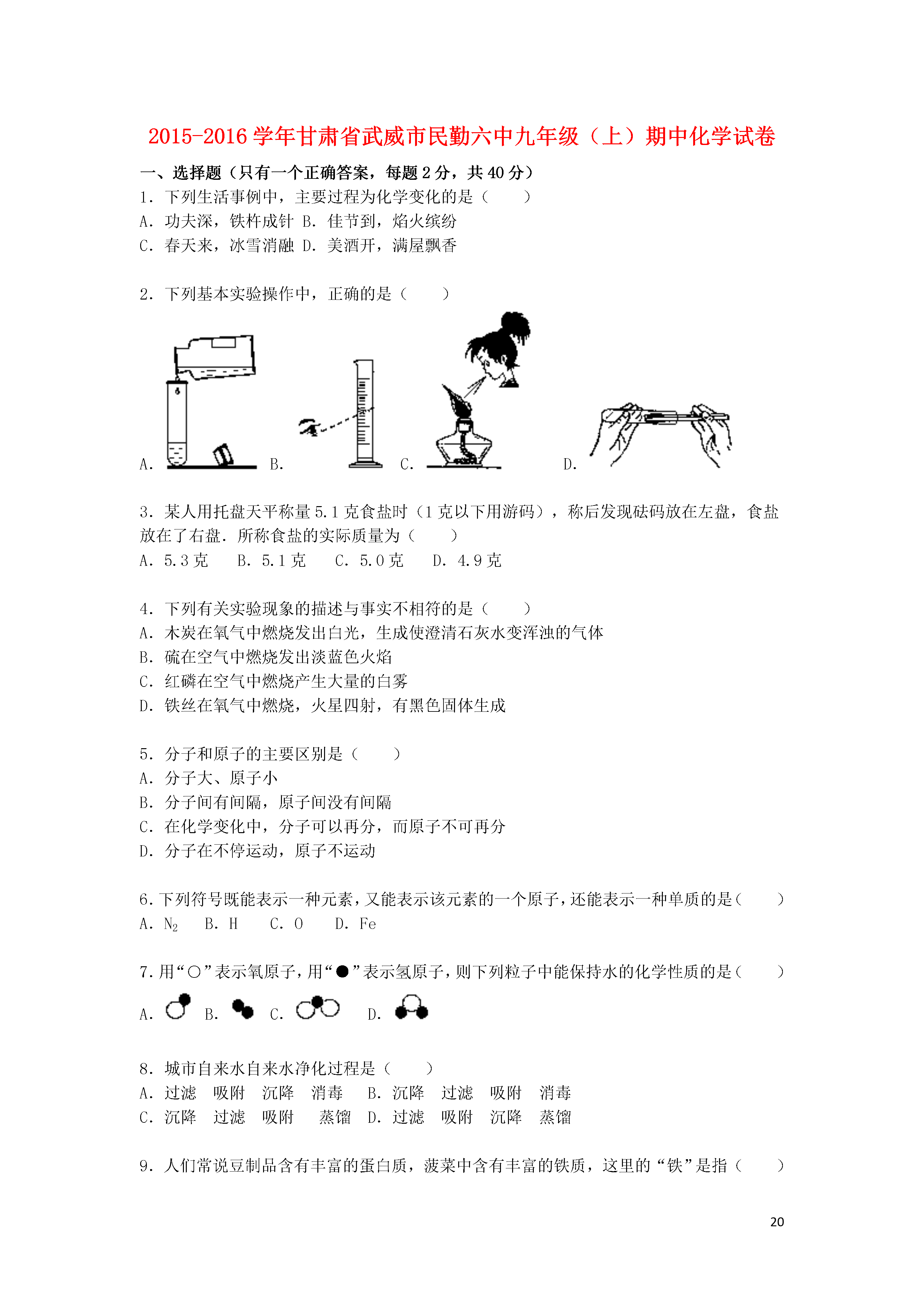 试题-甘肃-2015_甘肃省武威市民勤六中2015-2016学年九年级化学上学期期中试题(含解析) 新人教版.doc