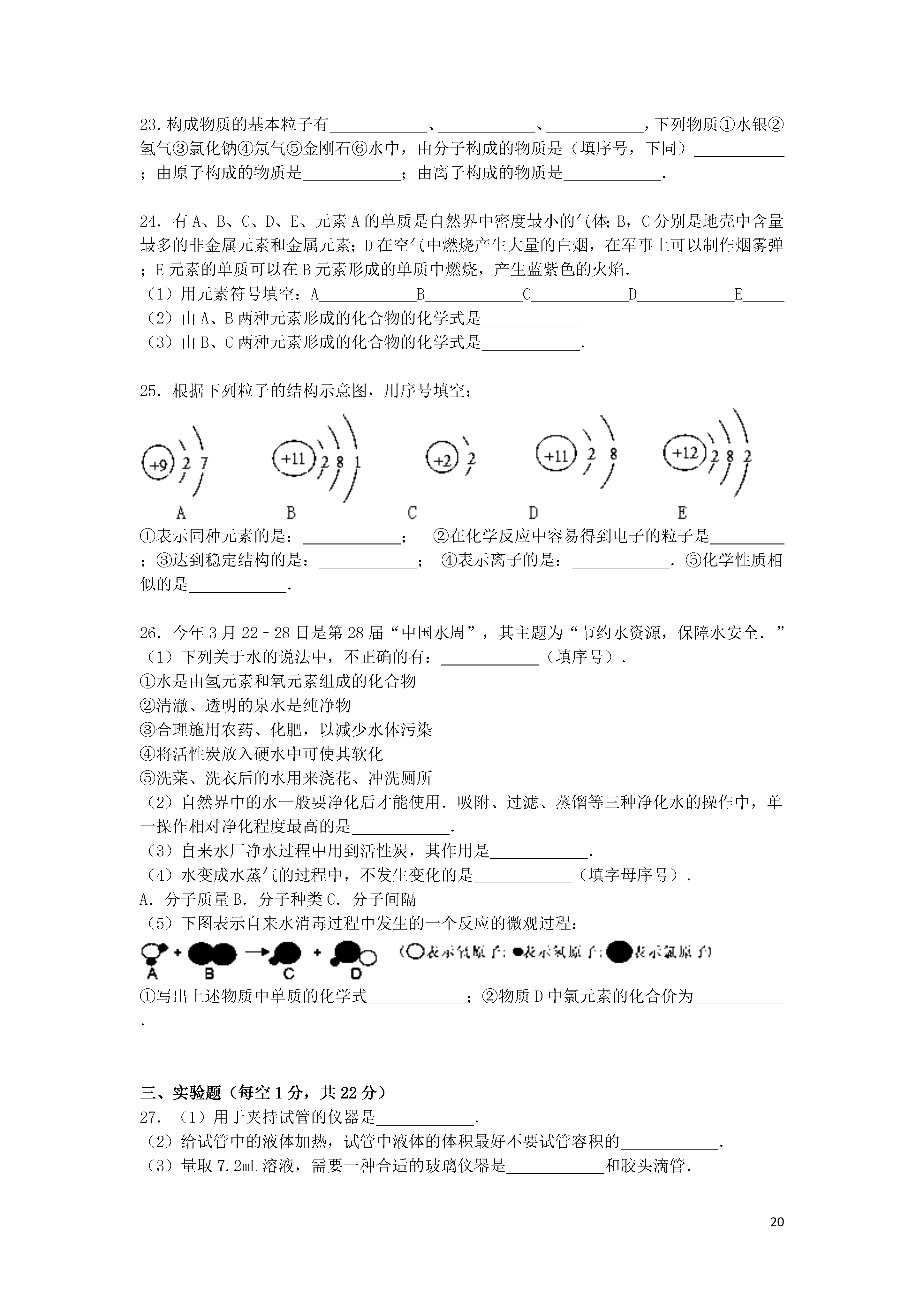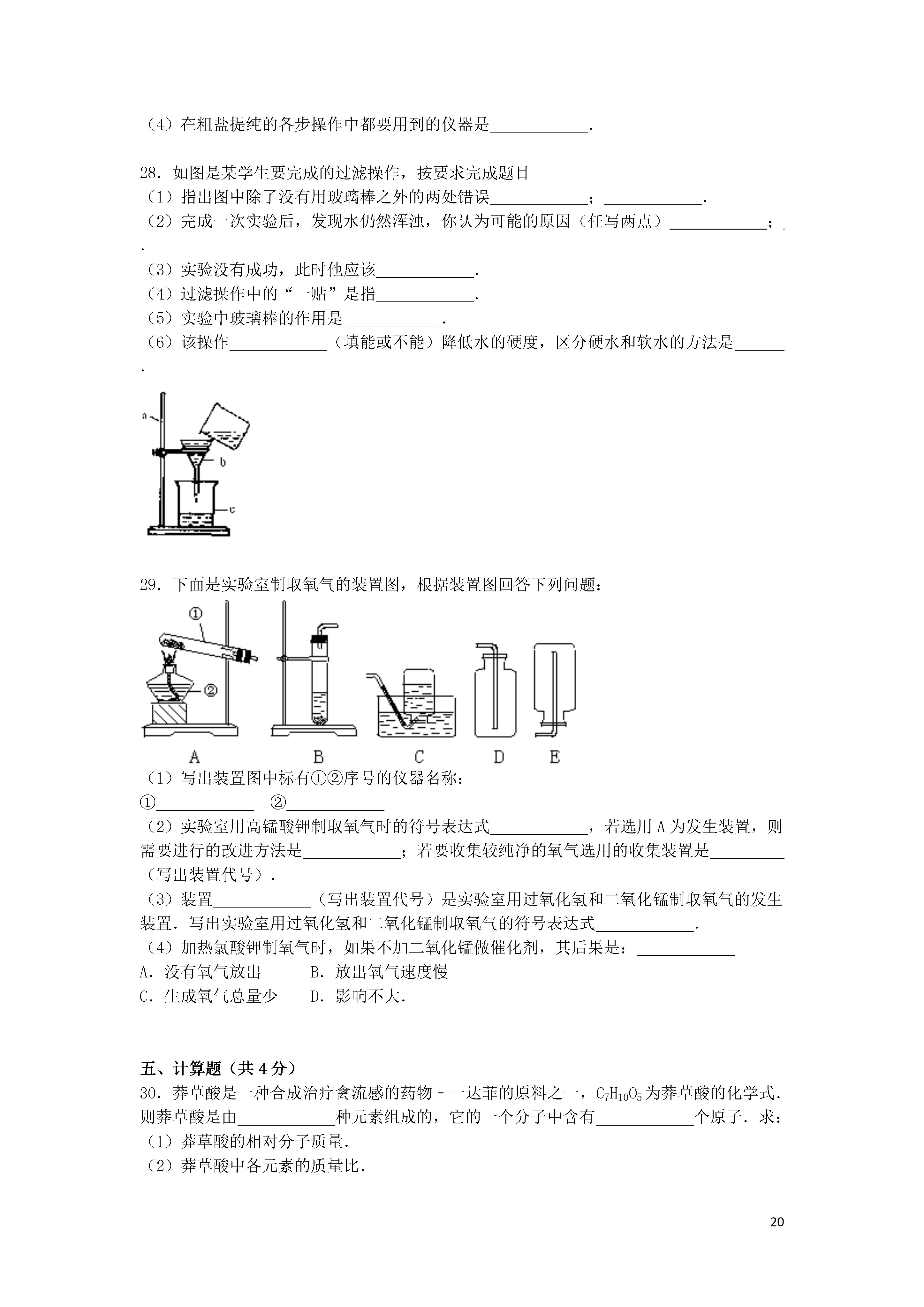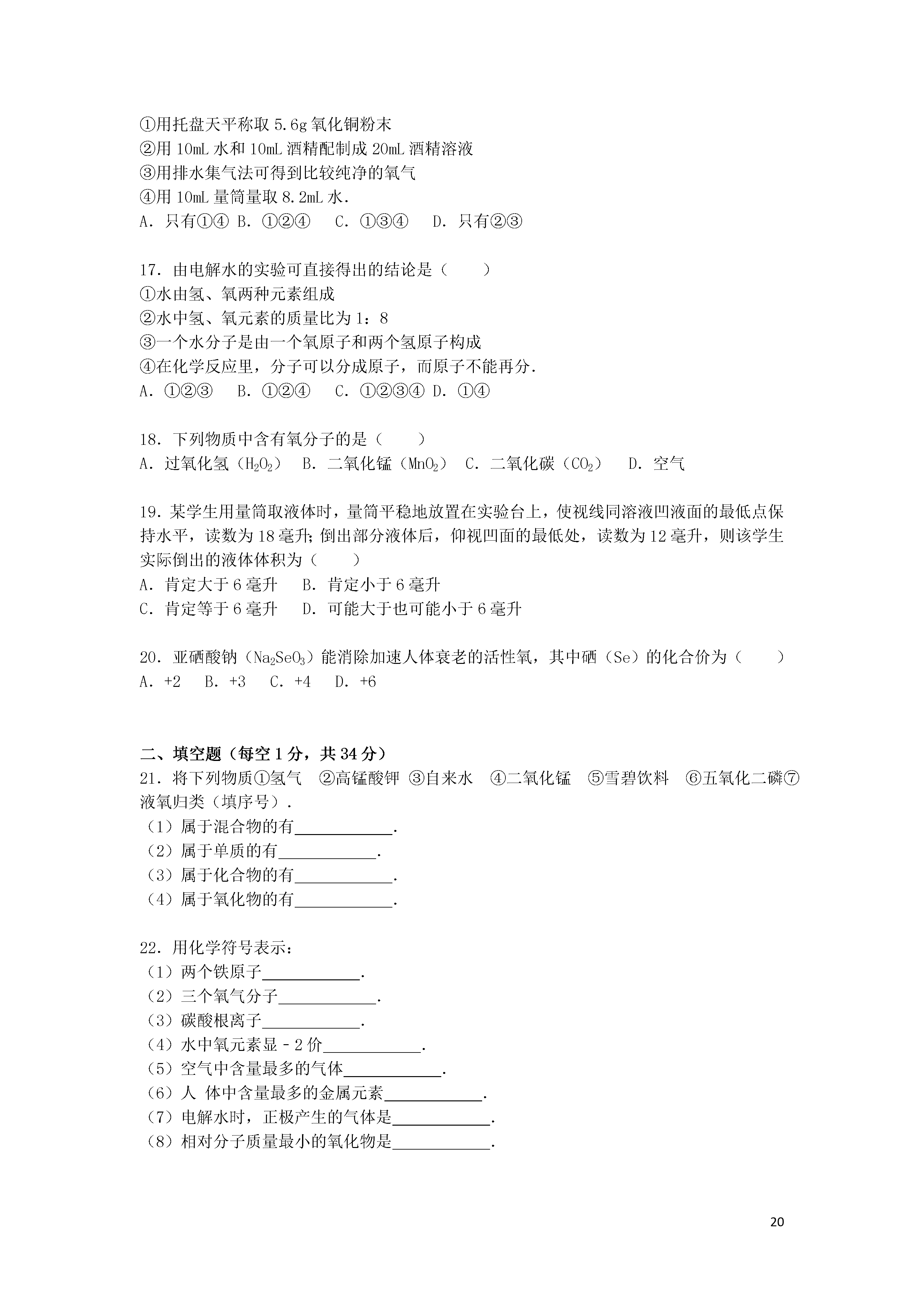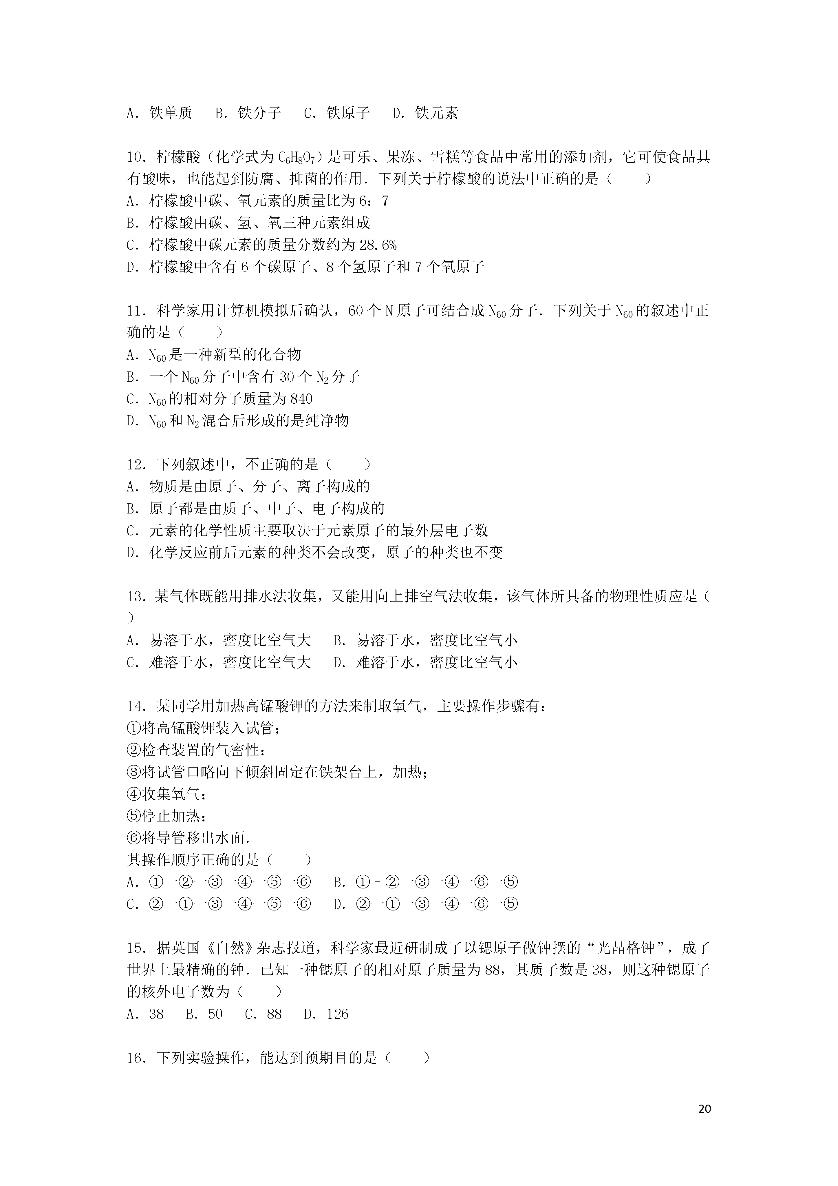 202015-2016学年甘肃省武威市民勤六中九年级(上)期中化学试卷一、选择题(只有一个正确答案,每题2分,共40分)1.下列生活事例中,主要过程为化学变化的是()A.功夫深,铁杵成针B.佳节到,焰火缤纷C.春天来,冰雪消融D.美酒开,满屋飘香2.下列基本实验操作中,正确的是()A.B.C.D.3.某人用托盘天平称量5.1克食盐时(1克以下用游码),称后发现砝码放在左盘,食盐放在了右盘.所称食盐的实际质量为()A.5.3克B.5.1克C.5.0克D.4.9克4.下列有关实验现象的描述与事实不相符的是()A.木炭在氧气中燃烧发出白光,生成使澄清石灰水变浑浊的气体B.硫在空气中燃烧发出淡蓝色火焰C.红磷在空气中燃烧产生大量的白雾D.铁丝在氧气中燃烧,火星四射,有黑色固体生成5.分子和原子的主要区别是()A.分子大、原子小B.分子间有间隔,原子间没有间隔C.在化学变化中,分子可以再分,而原子不可再分D.分子在不停运动,原子不运动6.下列符号既能表示一种元素,又能表示该元素的一个原子,还能表示一种单质的是()A.N2B.HC.OD.Fe7.用“○”表示氧原子,用“●”表示氢原子,则下列粒子中能保持水的化学性质的是()A.B.C.D.8.城市自来水自来水净化过程是()A.过滤吸附沉降消毒B.沉降过滤吸附消毒C.沉降过滤吸附蒸馏D.过滤吸附沉降蒸馏9.人们常说豆制品含有丰富的蛋白质,菠菜中含有丰富的铁质,这里的“铁”是指()A.铁单质B.铁分子C.铁原子D.铁元素10.柠檬酸(化学式为C6H8O7)是可乐、果冻、雪糕等食品中常用的添加剂,它可使食品具有酸味,也能起到防腐、抑菌的作用.下列关于柠檬酸的说法中正确的是()A.柠檬酸中碳、氧元素的质量比为6:7B.柠檬酸由碳、氢、氧三种元素组成C.柠檬酸中碳元素的质量分数约为28.6%D.柠檬酸中含有6个碳原子、8个氢原子和7个氧原子11.科学家用计算机模拟后确认,60个N原子可结合成N60分子.下列关于N60的叙述中正确的是()A.N60是一种新型的化合物B.一个N60分子中含有30个N2分子C.N60的相对分子质量为840D.N60和N2混合后形成的是纯净物12.下列叙述中,不正确的是()A.物质是由原子、分子、离子构成的B.原子都是由质子、中子、电子构成的C.元素的化学性质主要取决于元素原子的最外层电子数D.化学反应前后元素的种类不会改变,原子的种类也不变13.某气体既能用排水法收集,又能用向上排空气法收集,该气体所具备的物理性质应是()A.易溶于水,密度比空气大B.易溶于水,密度比空气小C.难溶于水,密度比空气大D.难溶于水,密度比空气小14.某同学用加热高锰酸钾的方法来制取氧气,主要操作步骤有:①将高锰酸钾装入试管;②检查装置的气密性;③将试管口略向下倾斜固定在铁架台上,加热;④收集氧气;⑤停止加热;⑥将导管移出水面.其操作顺序正确的是()A.①一②一③一④一⑤一⑥B.①﹣②一③一④一⑥一⑤C.②一①一③一④一⑤一⑥D.②一①一③一④一⑥一⑤15.据英国《自然》杂志报道,科学家最近研制成了以锶原子做钟摆的“光晶格钟”,成了世界上最精确的钟.已知一种锶原子的相对原子质量为88,其质子数是38,则这种锶原子的核外电子数为()A.38B.50C.88D.12616.下列实验操作,能达到预期目的是()①用托盘天平称取5.6g氧化铜粉末②用10mL水和10mL酒精配制成20mL酒精溶液③用排水集气法可得到比较纯净的氧气④用10mL量筒量取8.2mL水.A.只有①④B.①②④C.①③④D.只有②③17.由电解水的实验可直接得出的结论是()①水由氢、氧两种元素组成②水中氢、氧元素的质量比为1:8③一个水分子是由一个氧原子和两个氢原子构成④在化学反应里,分子可以分成原子,而原子不能再分.A.①②③B.①②④C.①②③④D.①④18.下列物质中含有氧分子的是()A.过氧化氢(H2O2)B.二氧化锰(MnO2)C.二氧化碳(CO2)D.空气19.某学生用量筒取液体时,量筒平稳地放置在实验台上,使视线同溶液凹液面的最低点保持水平,读数为18毫升;倒出部分液体后,仰视凹面的最低处,读数为12毫升,则该学生实际倒出的液体体积为()A.肯定大于6毫升B.肯定小于6毫升C.肯定等于6毫升D.可能大于也可能小于6毫升20.亚硒酸钠(Na2SeO3)能消除加速人体衰老的活性氧,其中硒(Se)的化合价为()A.+2B.+3C.+4D.+6二、填空题(每空1分,共34分)21.将下列物质①氢气②高锰酸钾③自来水