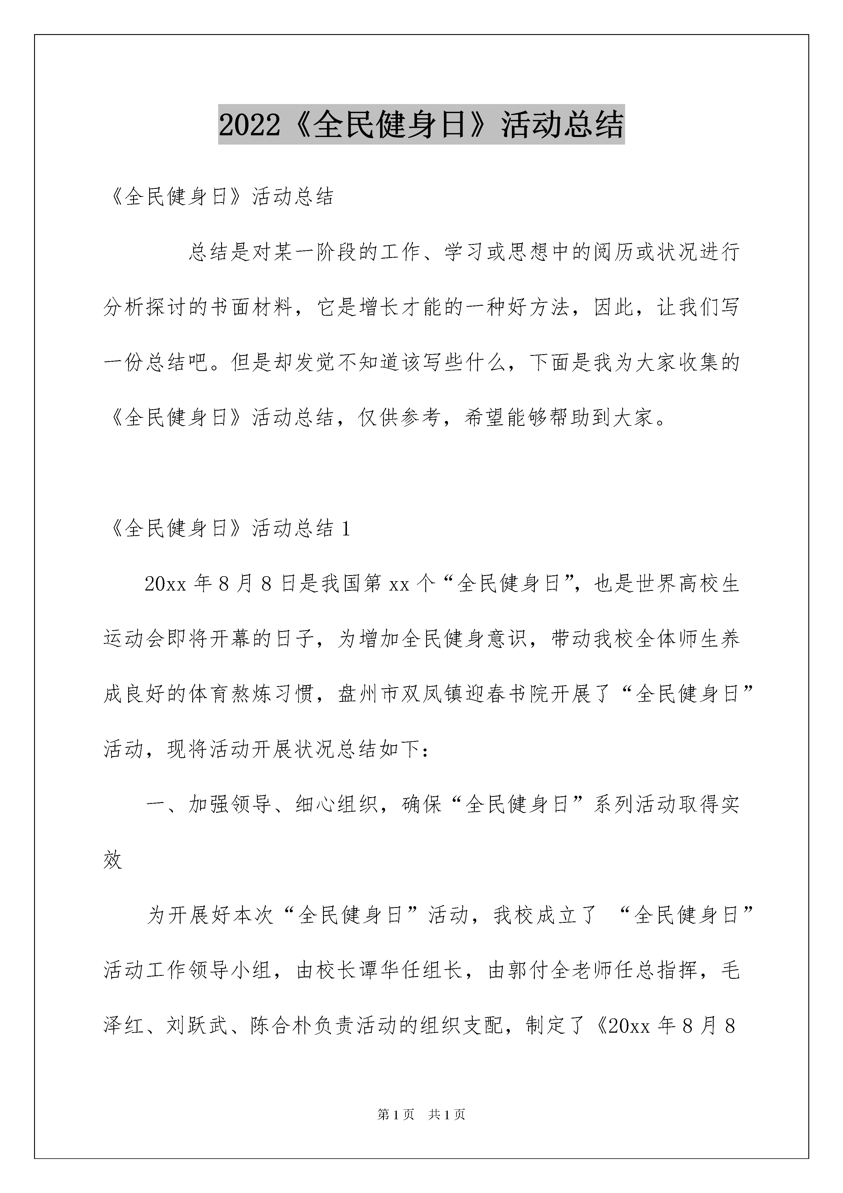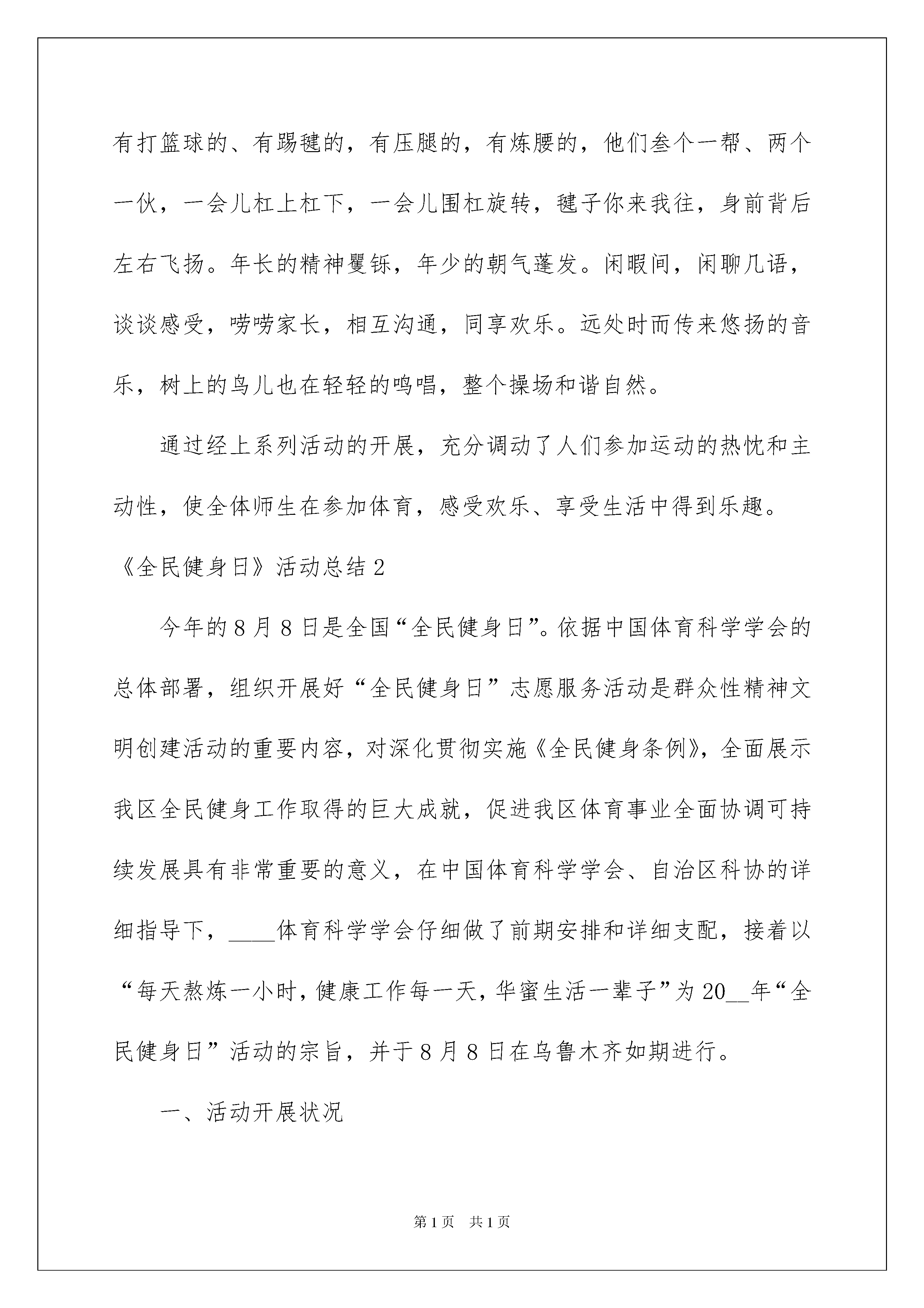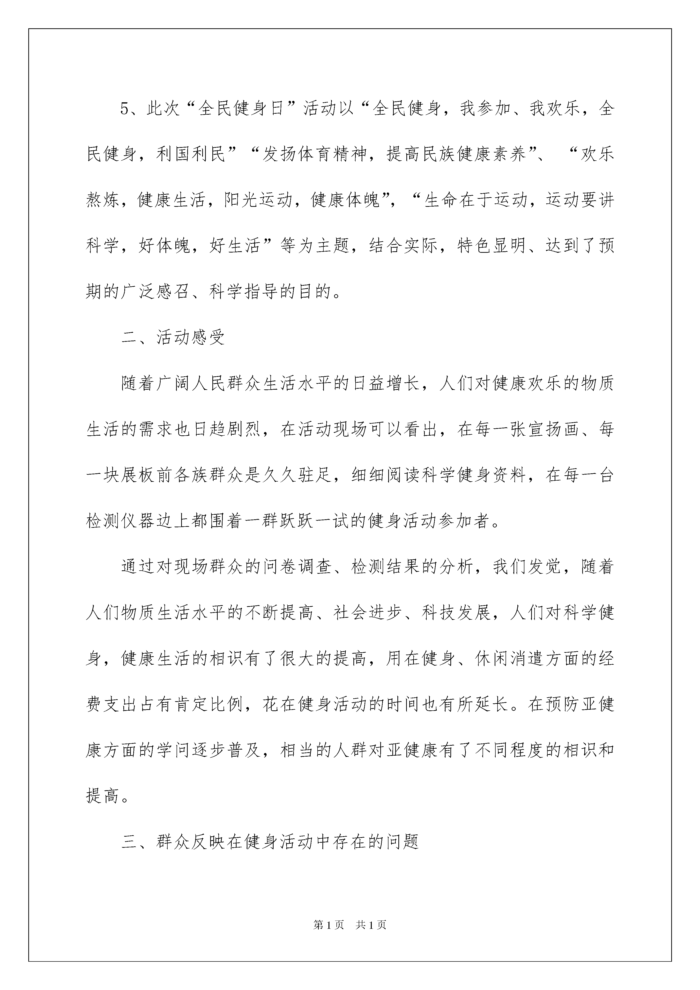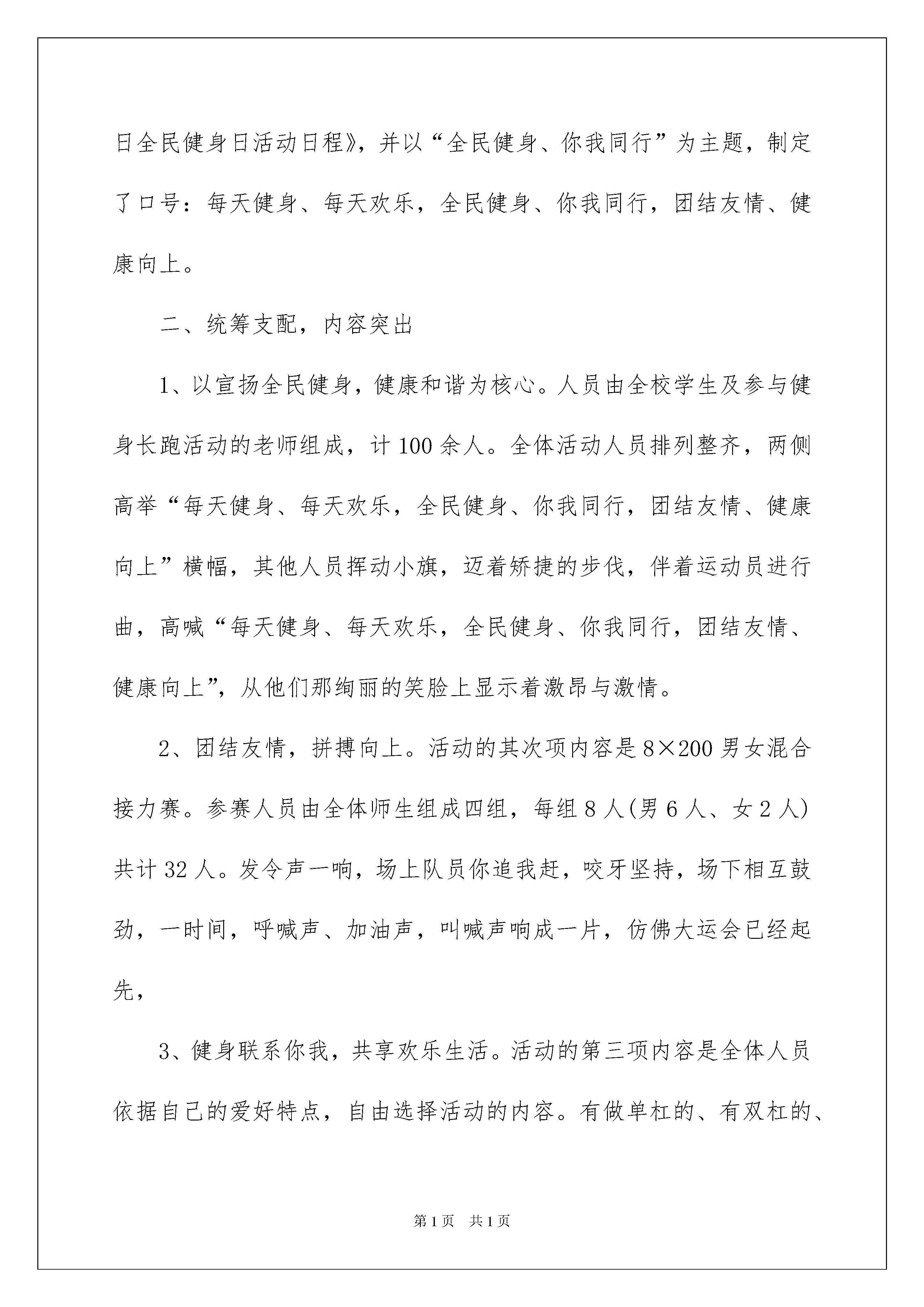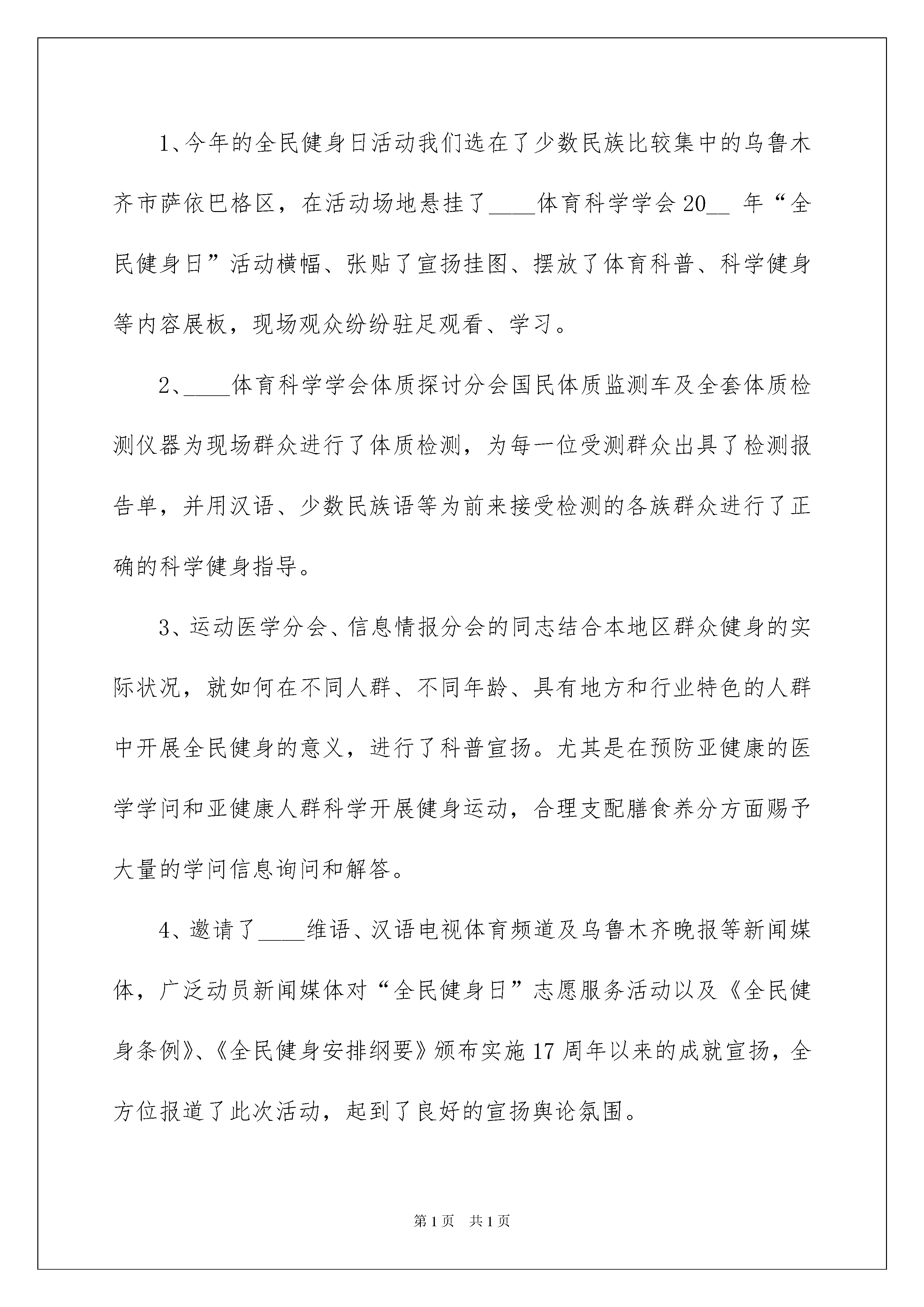 2022《全民健身日》活动总结《全民健身日》活动总结总结是对某一阶段的工作、学习或思想中的阅历或状况进行分析探讨的书面材料,它是增长才能的一种好方法,因此,让我们写一份总结吧。但是却发觉不知道该写些什么,下面是我为大家收集的《全民健身日》活动总结,仅供参考,希望能够帮助到大家。《全民健身日》活动总结120xx年8月8日是我国第xx个“全民健身日”,也是世界高校生运动会即将开幕的日子,为增加全民健身意识,带动我校全体师生养成良好的体育熬炼习惯,盘州市双凤镇迎春书院开展了“全民健身日”活动,现将活动开展状况总结如下:一、加强领导、细心组织,确保“全民健身日”系列活动取得实效为开展好本次“全民健身日”活动,我校成立了“全民健身日”活动工作领导小组,由校长谭华任组长,由郭付全老师任总指挥,毛泽红、刘跃武、陈合朴负责活动的组织支配,制定了《20xx年8月8日全民健身日活动日程》,并以“全民健身、你我同行”为主题,制定了口号:每天健身、每天欢乐,全民健身、你我同行,团结友情、健康向上。二、统筹支配,内容突出1、以宣扬全民健身,健康和谐为核心。人员由全校学生及参与健身长跑活动的老师组成,计100余人。全体活动人员排列整齐,两侧高举“每天健身、每天欢乐,全民健身、你我同行,团结友情、健康向上”横幅,其他人员挥动小旗,迈着矫捷的步伐,伴着运动员进行曲,高喊“每天健身、每天欢乐,全民健身、你我同行,团结友情、健康向上”,从他们那绚丽的笑脸上显示着激昂与激情。2、团结友情,拼搏向上。活动的其次项内容是8×200男女混合接力赛。参赛人员由全体师生组成四组,每组8人(男6人、女2人)共计32人。发令声一响,场上队员你追我赶,咬牙坚持,场下相互鼓劲,一时间,呼喊声、加油声,叫喊声响成一片,仿佛大运会已经起先,3、健身联系你我,共享欢乐生活。活动的第三项内容是全体人员依据自己的爱好特点,自由选择活动的内容。有做单杠的、有双杠的、有打篮球的、有踢毽的,有压腿的,有炼腰的,他们叁个一帮、两个一伙,一会儿杠上杠下,一会儿围杠旋转,毽子你来我往,身前背后左右飞扬。年长的精神矍铄,年少的朝气蓬发。闲暇间,闲聊几语,谈谈感受,唠唠家长,相互沟通,同享欢乐。远处时而传来悠扬的音乐,树上的鸟儿也在轻轻的鸣唱,整个操场和谐自然。通过经上系列活动的开展,充分调动了人们参加运动的热忱和主动性,使全体师生在参加体育,感受欢乐、享受生活中得到乐趣。《全民健身日》活动总结2今年的8月8日是全国“全民健身日”。依据中国体育科学学会的总体部署,组织开展好“全民健身日”志愿服务活动是群众性精神文明创建活动的重要内容,对深化贯彻实施《全民健身条例》,全面展示我区全民健身工作取得的巨大成就,促进我区体育事业全面协调可持续发展具有非常重要的意义,在中国体育科学学会、自治区科协的详细指导下,____体育科学学会仔细做了前期安排和详细支配,接着以“每天熬炼一小时,健康工作每一天,华蜜生活一辈子”为20__年“全民健身日”活动的宗旨,并于8月8日在乌鲁木齐如期进行。一、活动开展状况1、今年的全民健身日活动我们选在了少数民族比较集中的乌鲁木齐市萨依巴格区,在活动场地悬挂了____体育科学学会20__年“全民健身日”活动横幅、张贴了宣扬挂图、摆放了体育科普、科学健身等内容展板,现场观众纷纷驻足观看、学习。2、____体育科学学会体质探讨分会国民体质监测车及全套体质检测仪器为现场群众进行了体质检测,为每一位受测群众出具了检测报告单,并用汉语、少数民族语等为前来接受检测的各族群众进行了正确的科学健身指导。3、运动医学分会、信息情报分会的同志结合本地区群众健身的实际状况,就如何在不同人群、不同年龄、具有地方和行业特色的人群中开展全民健身的意义,进行了科普宣扬。尤其是在预防亚健康的医学学问和亚健康人群科学开展健身运动,合理支配膳食养分方面赐予大量的学问信息询问和解答。4、邀请了____维语、汉语电视体育频道及乌鲁木齐晚报等新闻媒体,广泛动员新闻媒体对“全民健身日”志愿服务活动以及《全民健身条例》、《全民健身安排纲要》颁布实施17周年以来的成就宣扬,全方位报道了此次活动,起到了良好的宣扬舆论氛围。5、此次“全民健身日”活动以“全民健身,我参加、我欢乐,全民健身,利国利民”“发扬体育精神,提高民族健康素养”、“欢乐熬炼,健康生活,阳光运动,健康体魄”,“生命在于运动,运动要讲科学,好体魄,好生活”等为主题,结合实际,特色显明、达到了预期的广泛感召、科学指导的目的。二、活动感受随着广阔人民群众生活水平的日益增长,人们对健康欢乐的物质生活的需求也日趋剧烈,在活动现场
