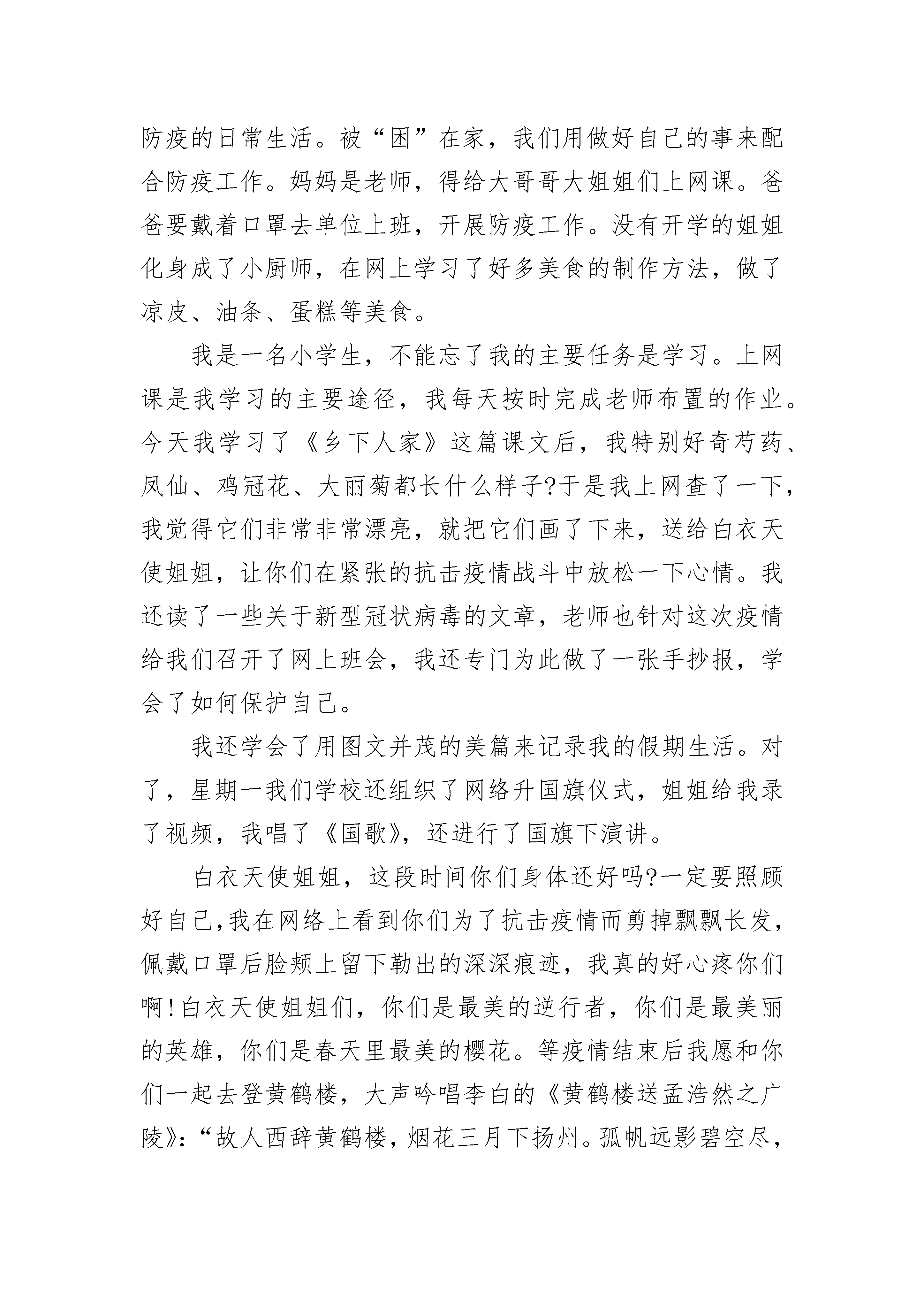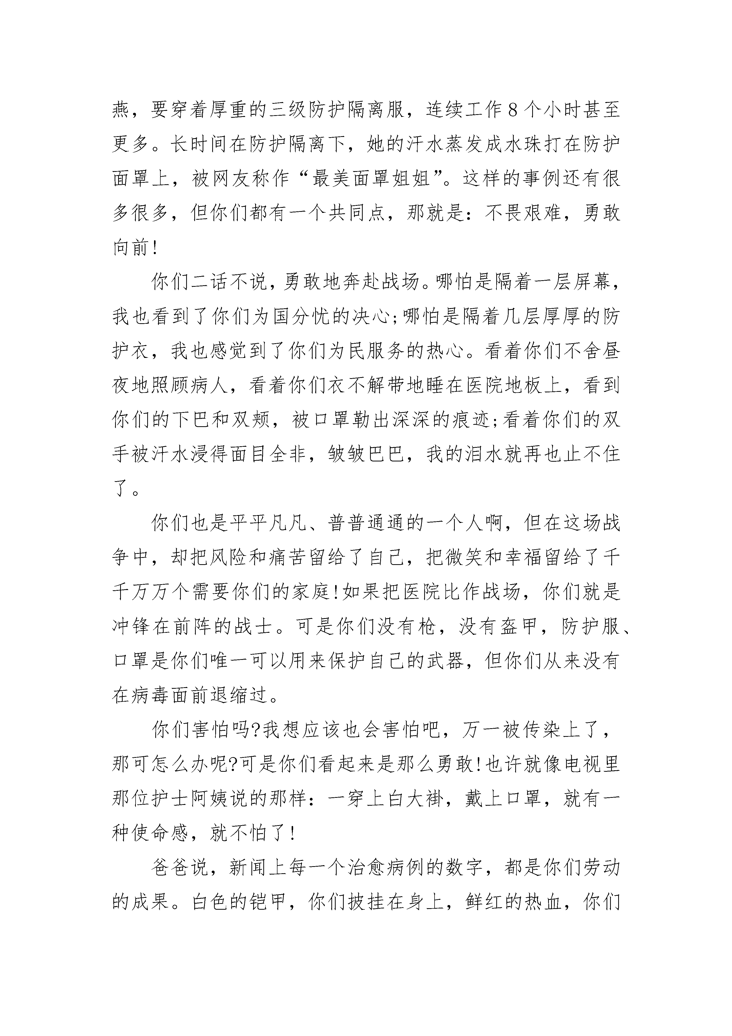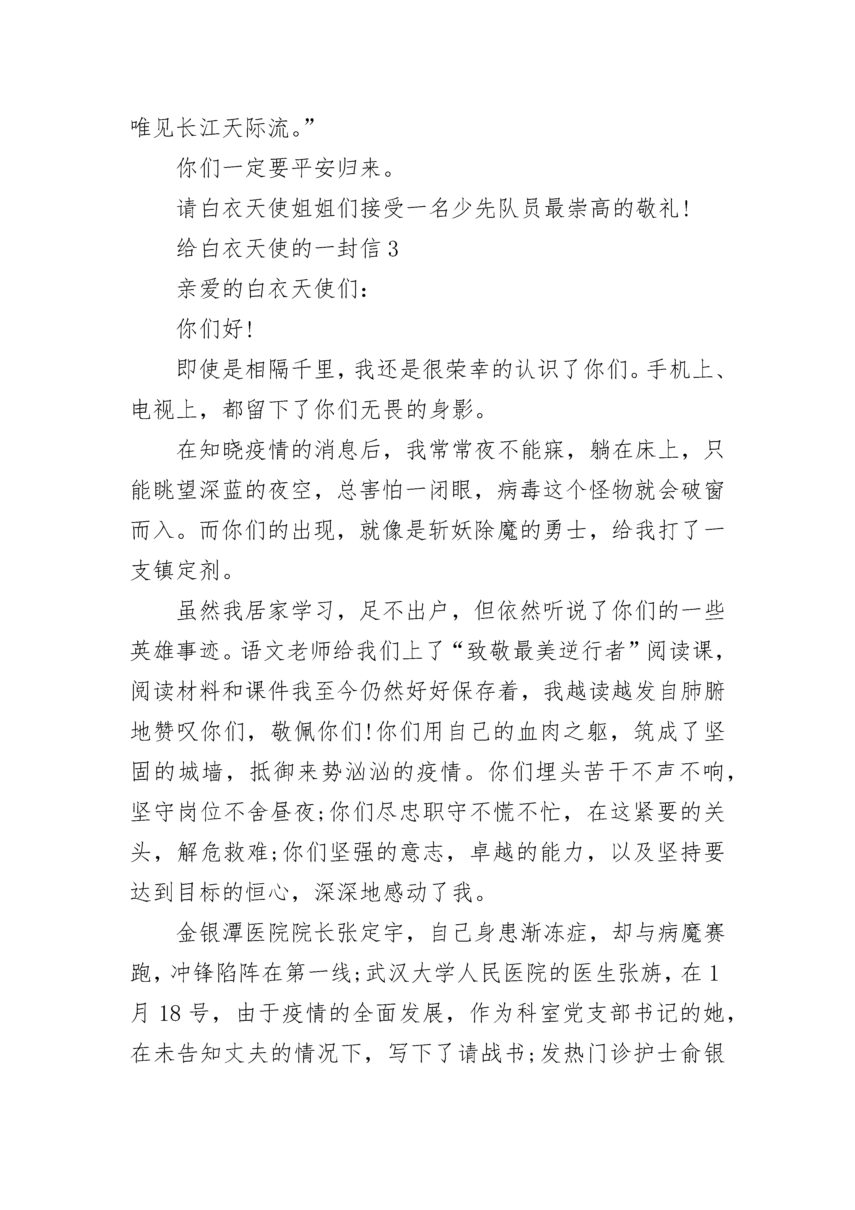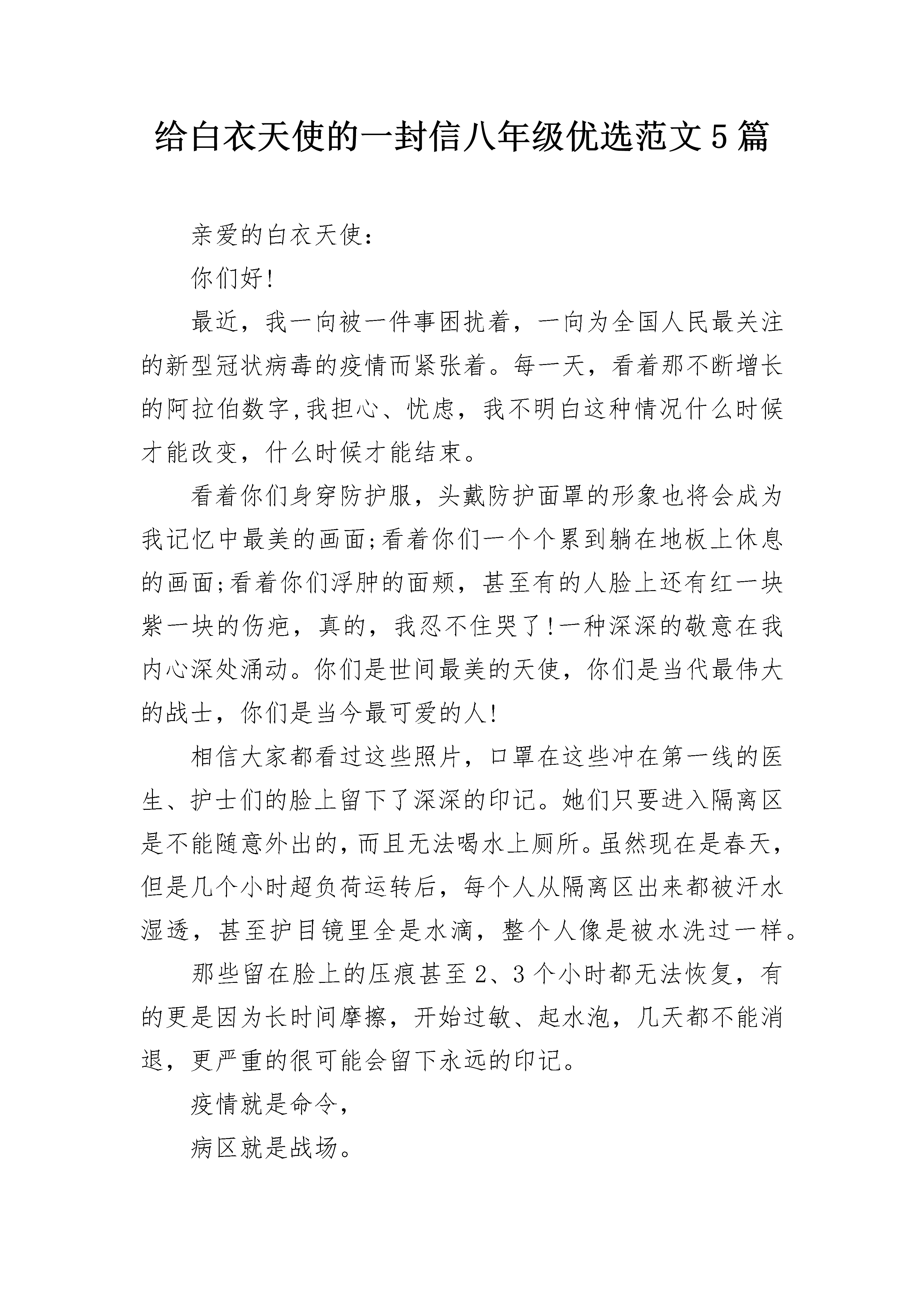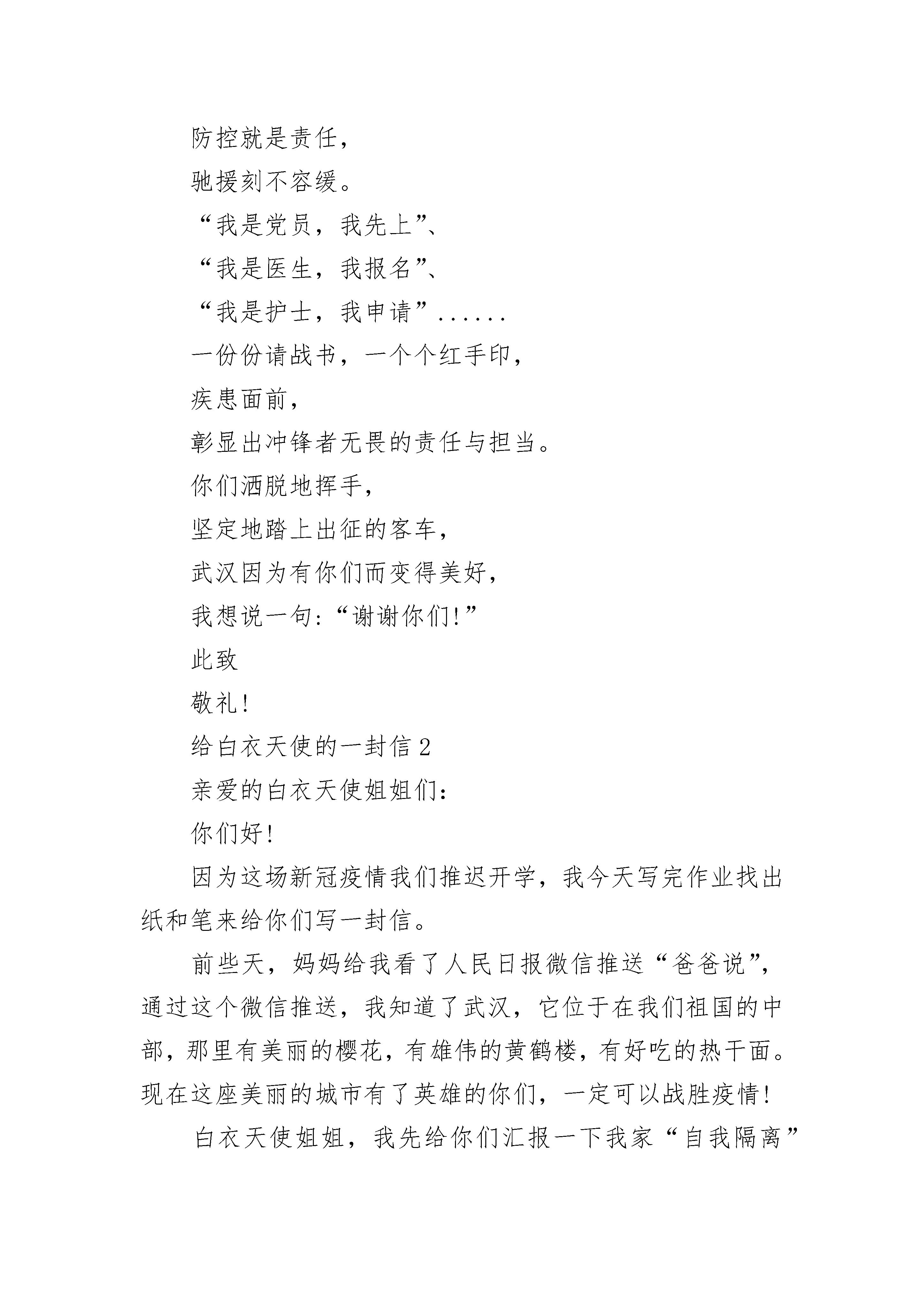 给白衣天使的一封信八年级优选范文5篇亲爱的白衣天使:你们好!最近,我一向被一件事困扰着,一向为全国人民最关注的新型冠状病毒的疫情而紧张着。每一天,看着那不断增长的阿拉伯数字,我担心、忧虑,我不明白这种情况什么时候才能改变,什么时候才能结束。看着你们身穿防护服,头戴防护面罩的形象也将会成为我记忆中最美的画面;看着你们一个个累到躺在地板上休息的画面;看着你们浮肿的面颊,甚至有的人脸上还有红一块紫一块的伤疤,真的,我忍不住哭了!一种深深的敬意在我内心深处涌动。你们是世间最美的天使,你们是当代最伟大的战士,你们是当今最可爱的人!相信大家都看过这些照片,口罩在这些冲在第一线的医生、护士们的脸上留下了深深的印记。她们只要进入隔离区是不能随意外出的,而且无法喝水上厕所。虽然现在是春天,但是几个小时超负荷运转后,每个人从隔离区出来都被汗水湿透,甚至护目镜里全是水滴,整个人像是被水洗过一样。那些留在脸上的压痕甚至2、3个小时都无法恢复,有的更是因为长时间摩擦,开始过敏、起水泡,几天都不能消退,更严重的很可能会留下永远的印记。疫情就是命令,病区就是战场。防控就是责任,驰援刻不容缓。“我是党员,我先上”、“我是医生,我报名”、“我是护士,我申请”......一份份请战书,一个个红手印,疾患面前,彰显出冲锋者无畏的责任与担当。你们洒脱地挥手,坚定地踏上出征的客车,武汉因为有你们而变得美好,我想说一句:“谢谢你们!”此致敬礼!给白衣天使的一封信2亲爱的白衣天使姐姐们:你们好!因为这场新冠疫情我们推迟开学,我今天写完作业找出纸和笔来给你们写一封信。前些天,妈妈给我看了人民日报微信推送“爸爸说”,通过这个微信推送,我知道了武汉,它位于在我们祖国的中部,那里有美丽的樱花,有雄伟的黄鹤楼,有好吃的热干面。现在这座美丽的城市有了英雄的你们,一定可以战胜疫情!白衣天使姐姐,我先给你们汇报一下我家“自我隔离”防疫的日常生活。被“困”在家,我们用做好自己的事来配合防疫工作。妈妈是老师,得给大哥哥大姐姐们上网课。爸爸要戴着口罩去单位上班,开展防疫工作。没有开学的姐姐化身成了小厨师,在网上学习了好多美食的制作方法,做了凉皮、油条、蛋糕等美食。我是一名小学生,不能忘了我的主要任务是学习。上网课是我学习的主要途径,我每天按时完成老师布置的作业。今天我学习了《乡下人家》这篇课文后,我特别好奇芍药、凤仙、鸡冠花、大丽菊都长什么样子?于是我上网查了一下,我觉得它们非常非常漂亮,就把它们画了下来,送给白衣天使姐姐,让你们在紧张的抗击疫情战斗中放松一下心情。我还读了一些关于新型冠状病毒的文章,老师也针对这次疫情给我们召开了网上班会,我还专门为此做了一张手抄报,学会了如何保护自己。我还学会了用图文并茂的美篇来记录我的假期生活。对了,星期一我们学校还组织了网络升国旗仪式,姐姐给我录了视频,我唱了《国歌》,还进行了国旗下演讲。白衣天使姐姐,这段时间你们身体还好吗?一定要照顾好自己,我在网络上看到你们为了抗击疫情而剪掉飘飘长发,佩戴口罩后脸颊上留下勒出的深深痕迹,我真的好心疼你们啊!白衣天使姐姐们,你们是最美的逆行者,你们是最美丽的英雄,你们是春天里最美的樱花。等疫情结束后我愿和你们一起去登黄鹤楼,大声吟唱李白的《黄鹤楼送孟浩然之广陵》:“故人西辞黄鹤楼,烟花三月下扬州。孤帆远影碧空尽,唯见长江天际流。”你们一定要平安归来。请白衣天使姐姐们接受一名少先队员最崇高的敬礼!给白衣天使的一封信3亲爱的白衣天使们:你们好!即使是相隔千里,我还是很荣幸的认识了你们。手机上、电视上,都留下了你们无畏的身影。在知晓疫情的消息后,我常常夜不能寐,躺在床上,只能眺望深蓝的夜空,总害怕一闭眼,病毒这个怪物就会破窗而入。而你们的出现,就像是斩妖除魔的勇士,给我打了一支镇定剂。虽然我居家学习,足不出户,但依然听说了你们的一些英雄事迹。语文老师给我们上了“致敬最美逆行者”阅读课,阅读材料和课件我至今仍然好好保存着,我越读越发自肺腑地赞叹你们,敬佩你们!你们用自己的血肉之躯,筑成了坚固的城墙,抵御来势汹汹的疫情。你们埋头苦干不声不响,坚守岗位不舍昼夜;你们尽忠职守不慌不忙,在这紧要的关头,解危救难;你们坚强的意志,卓越的能力,以及坚持要达到目标的恒心,深深地感动了我。金银潭医院院长张定宇,自己身患渐冻症,却与病魔赛跑,冲锋陷阵在第一线;武汉大学人民医院的医生张旃,在1月18号,由于疫情的全面发展,作为科室党支部书记的她,在未告知丈夫的情况下,写下了请战书;发热门诊护士俞银燕,要穿着厚重的三级防护隔离服,连续工作8个小时甚至更多。长时间在防护隔离下,她的汗水蒸发成水珠打在防护面罩上,被网友称作“最美面罩姐姐”。这样的事例还有很多很多,但你们都有一个共同点,那就是:不畏艰难,勇敢向前!你们二话不说,勇敢地奔赴战场。哪怕是