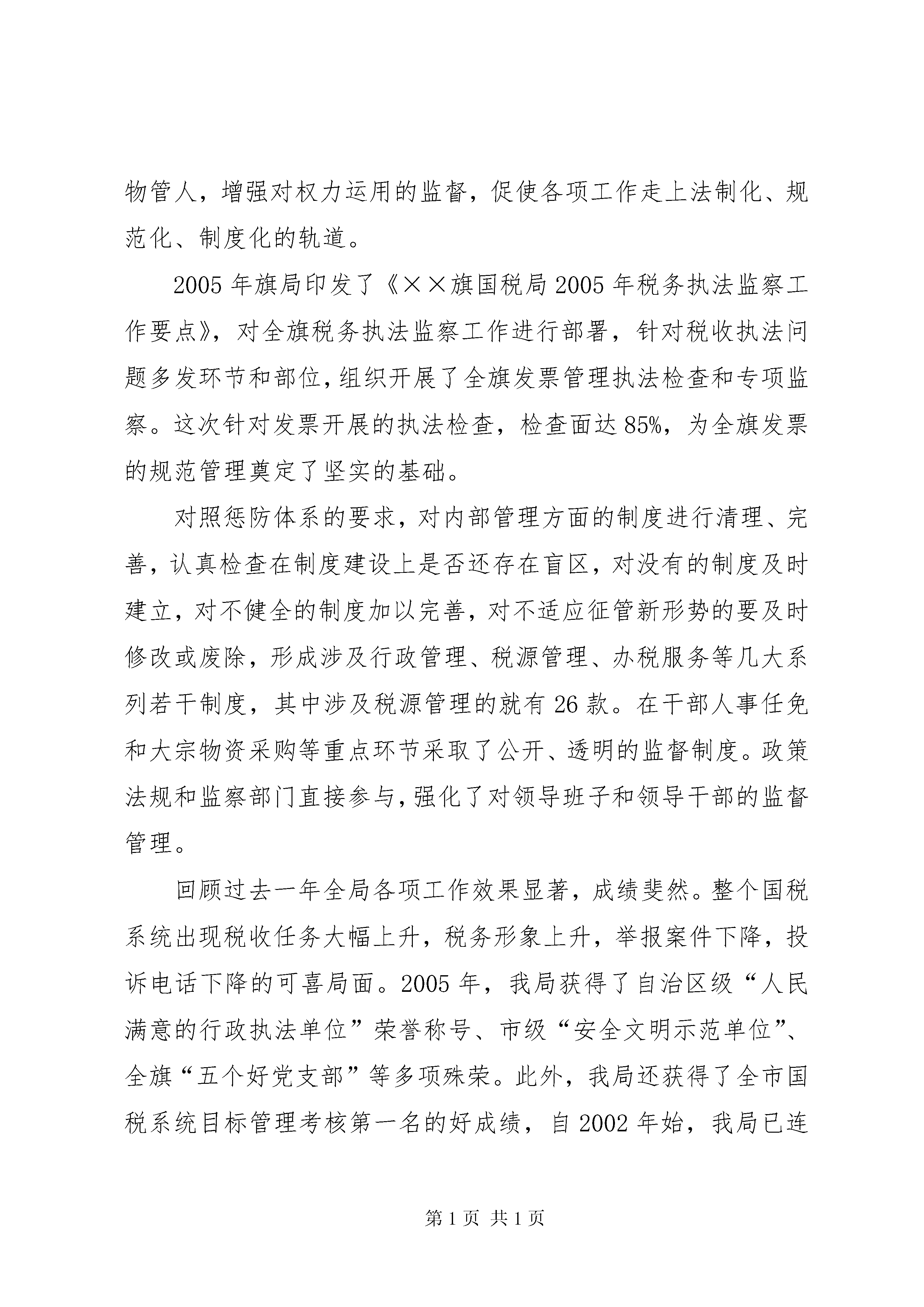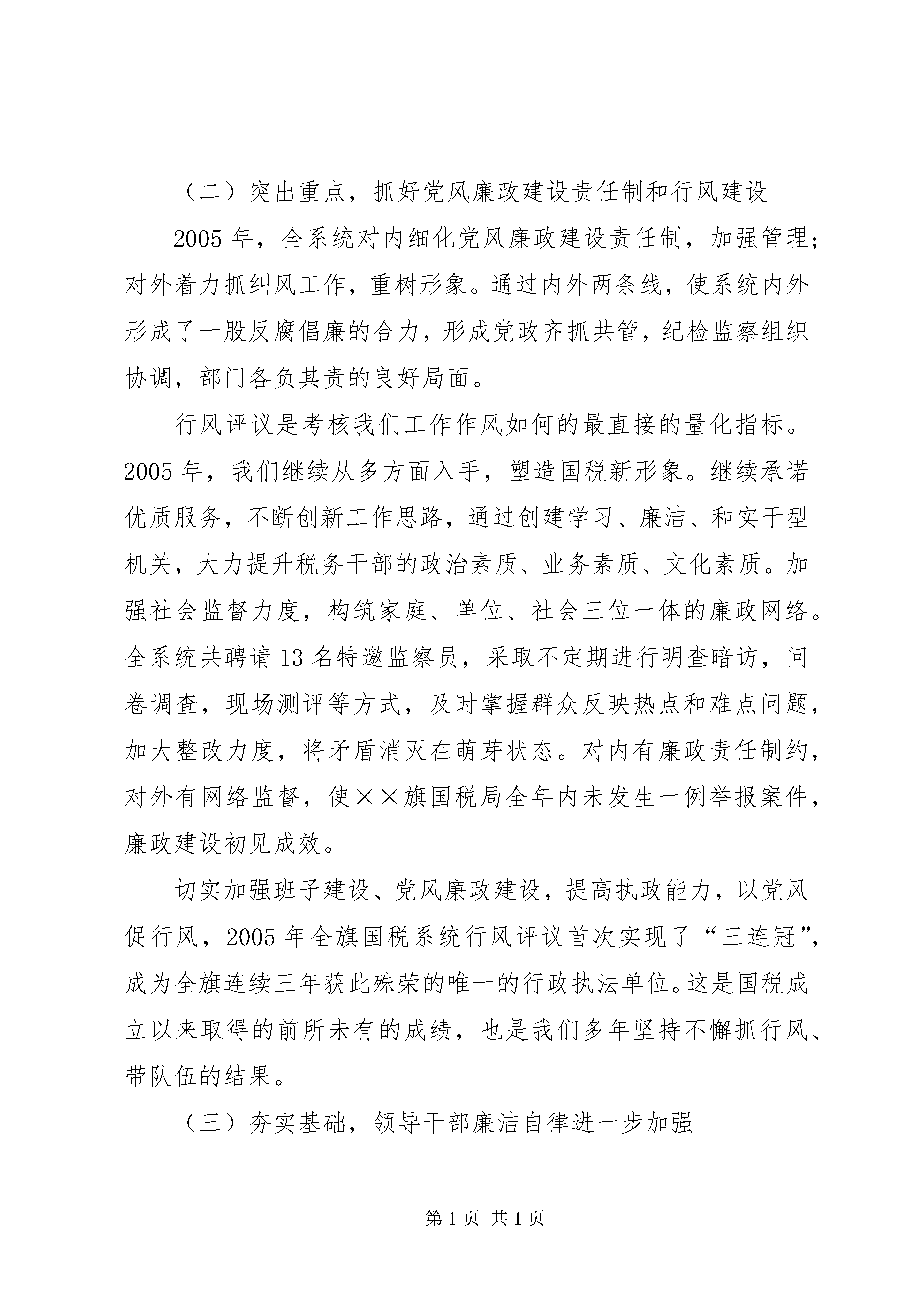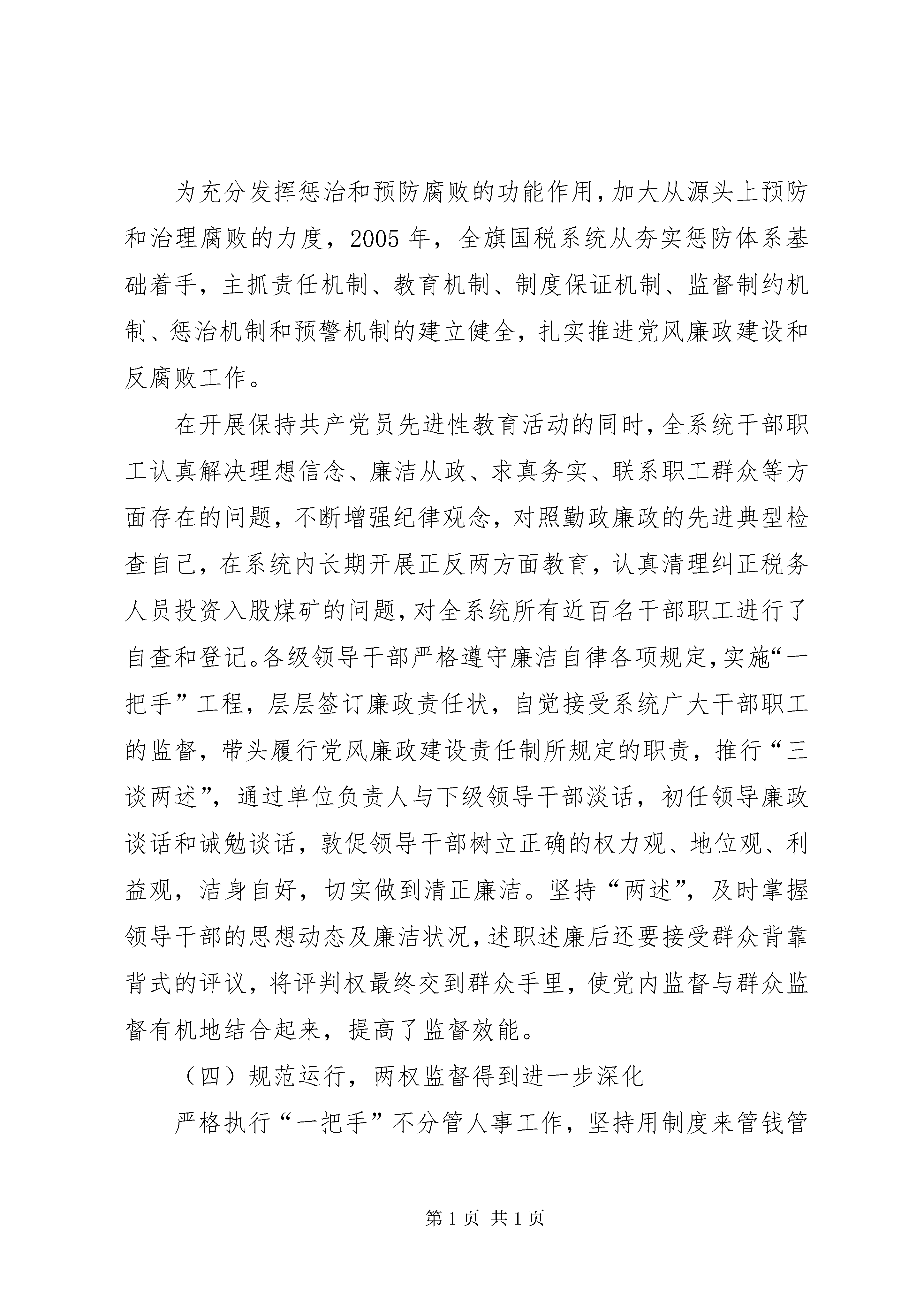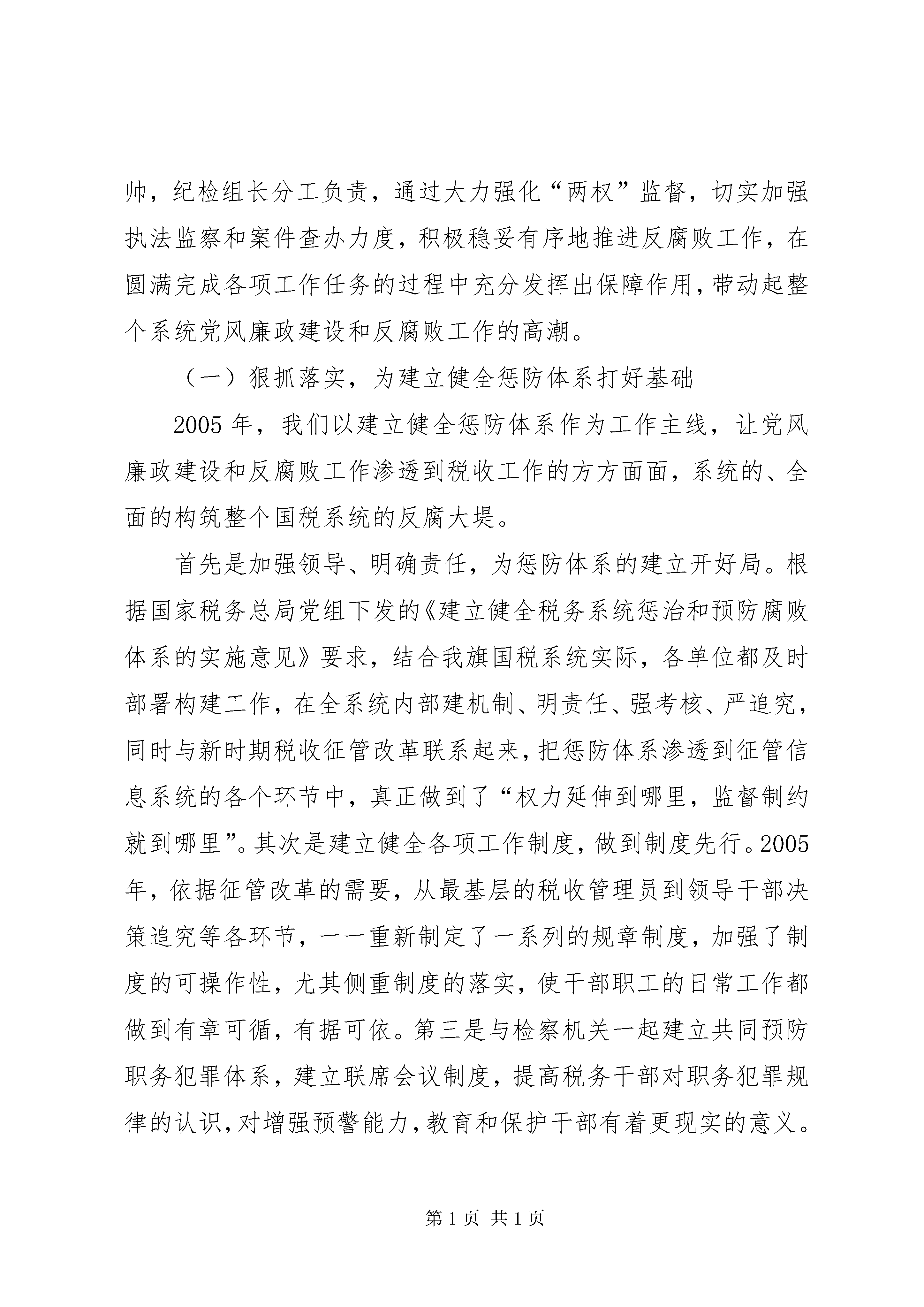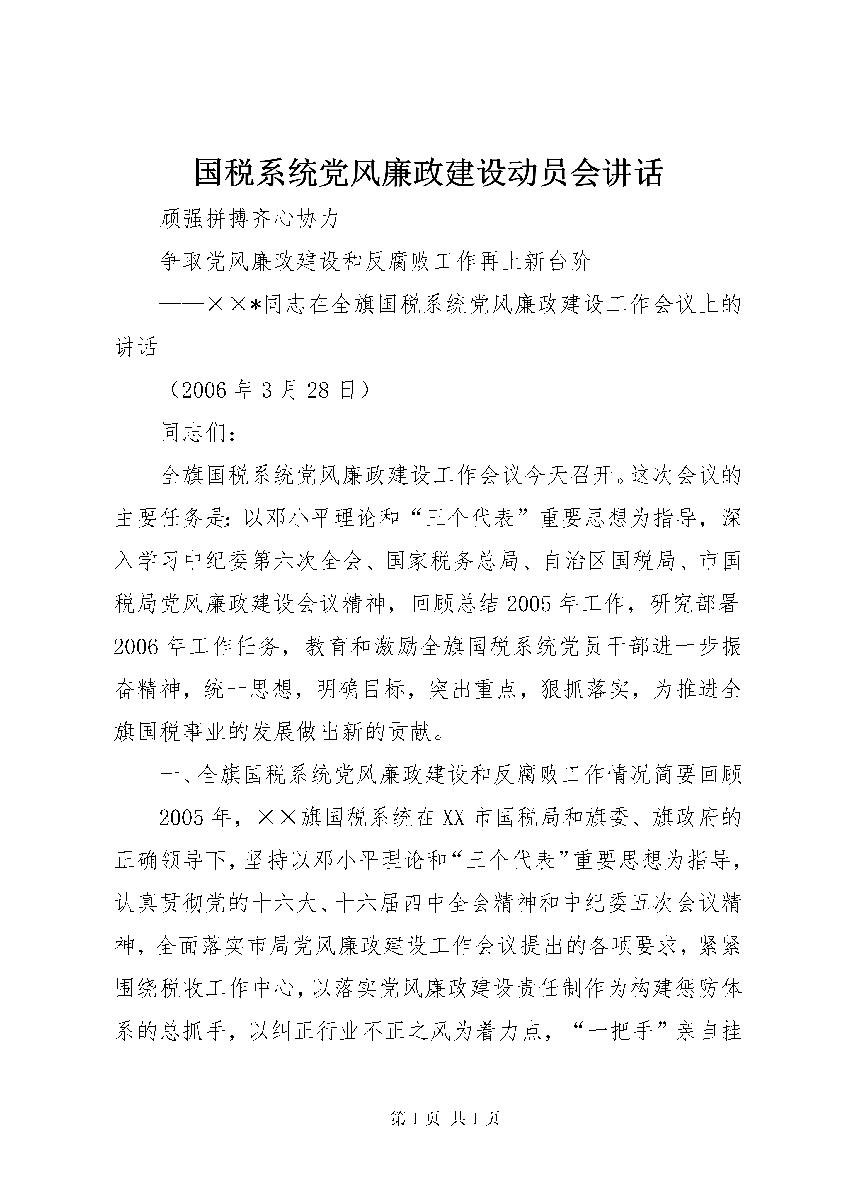 国税系统党风廉政建设动员会讲话顽强拼搏齐心协力争取党风廉政建设和反腐败工作再上新台阶——××*同志在全旗国税系统党风廉政建设工作会议上的讲话(2006年3月28日)同志们:全旗国税系统党风廉政建设工作会议今天召开。这次会议的主要任务是:以邓小平理论和“三个代表”重要思想为指导,深入学习中纪委第六次全会、国家税务总局、自治区国税局、市国税局党风廉政建设会议精神,回顾总结2005年工作,研究部署2006年工作任务,教育和激励全旗国税系统党员干部进一步振奋精神,统一思想,明确目标,突出重点,狠抓落实,为推进全旗国税事业的发展做出新的贡献。一、全旗国税系统党风廉政建设和反腐败工作情况简要回顾2005年,××旗国税系统在XX市国税局和旗委、旗政府的正确领导下,坚持以邓小平理论和“三个代表”重要思想为指导,认真贯彻党的十六大、十六届四中全会精神和中纪委五次会议精神,全面落实市局党风廉政建设工作会议提出的各项要求,紧紧围绕税收工作中心,以落实党风廉政建设责任制作为构建惩防体系的总抓手,以纠正行业不正之风为着力点,“一把手”亲自挂帅,纪检组长分工负责,通过大力强化“两权”监督,切实加强执法监察和案件查办力度,积极稳妥有序地推进反腐败工作,在圆满完成各项工作任务的过程中充分发挥出保障作用,带动起整个系统党风廉政建设和反腐败工作的高潮。(一)狠抓落实,为建立健全惩防体系打好基础2005年,我们以建立健全惩防体系作为工作主线,让党风廉政建设和反腐败工作渗透到税收工作的方方面面,系统的、全面的构筑整个国税系统的反腐大堤。首先是加强领导、明确责任,为惩防体系的建立开好局。根据国家税务总局党组下发的《建立健全税务系统惩治和预防腐败体系的实施意见》要求,结合我旗国税系统实际,各单位都及时部署构建工作,在全系统内部建机制、明责任、强考核、严追究,同时与新时期税收征管改革联系起来,把惩防体系渗透到征管信息系统的各个环节中,真正做到了“权力延伸到哪里,监督制约就到哪里”。其次是建立健全各项工作制度,做到制度先行。2005年,依据征管改革的需要,从最基层的税收管理员到领导干部决策追究等各环节,一一重新制定了一系列的规章制度,加强了制度的可操作性,尤其侧重制度的落实,使干部职工的日常工作都做到有章可循,有据可依。第三是与检察机关一起建立共同预防职务犯罪体系,建立联席会议制度,提高税务干部对职务犯罪规律的认识,对增强预警能力,教育和保护干部有着更现实的意义。(二)突出重点,抓好党风廉政建设责任制和行风建设2005年,全系统对内细化党风廉政建设责任制,加强管理;对外着力抓纠风工作,重树形象。通过内外两条线,使系统内外形成了一股反腐倡廉的合力,形成党政齐抓共管,纪检监察组织协调,部门各负其责的良好局面。行风评议是考核我们工作作风如何的最直接的量化指标。2005年,我们继续从多方面入手,塑造国税新形象。继续承诺优质服务,不断创新工作思路,通过创建学习、廉洁、和实干型机关,大力提升税务干部的政治素质、业务素质、文化素质。加强社会监督力度,构筑家庭、单位、社会三位一体的廉政网络。全系统共聘请13名特邀监察员,采取不定期进行明查暗访,问卷调查,现场测评等方式,及时掌握群众反映热点和难点问题,加大整改力度,将矛盾消灭在萌芽状态。对内有廉政责任制约,对外有网络监督,使××旗国税局全年内未发生一例举报案件,廉政建设初见成效。切实加强班子建设、党风廉政建设,提高执政能力,以党风促行风,2005年全旗国税系统行风评议首次实现了“三连冠”,成为全旗连续三年获此殊荣的唯一的行政执法单位。这是国税成立以来取得的前所未有的成绩,也是我们多年坚持不懈抓行风、带队伍的结果。(三)夯实基础,领导干部廉洁自律进一步加强为充分发挥惩治和预防腐败的功能作用,加大从源头上预防和治理腐败的力度,2005年,全旗国税系统从夯实惩防体系基础着手,主抓责任机制、教育机制、制度保证机制、监督制约机制、惩治机制和预警机制的建立健全,扎实推进党风廉政建设和反腐败工作。在开展保持共产党员先进性教育活动的同时,全系统干部职工认真解决理想信念、廉洁从政、求真务实、联系职工群众等方面存在的问题,不断增强纪律观念,对照勤政廉政的先进典型检查自己,在系统内长期开展正反两方面教育,认真清理纠正税务人员投资入股煤矿的问题,对全系统所有近百名干部职工进行了自查和登记。各级领导干部严格遵守廉洁自律各项规定,实施“一把手”工程,层层签订廉政责任状,自觉接受系统广大干部职工的监督,带头履行党风廉政建设责任制所规定的职责,推行“三谈两述”,通过单位负责人与下级领导干部淡话,初任领导廉政谈话和诫勉谈话,敦促领导干部树立正确的权力观、地位观、利益观,洁身自好,切实做到清正廉洁。坚持“两述”,及时掌握领导干部的思想动态及廉洁状况,