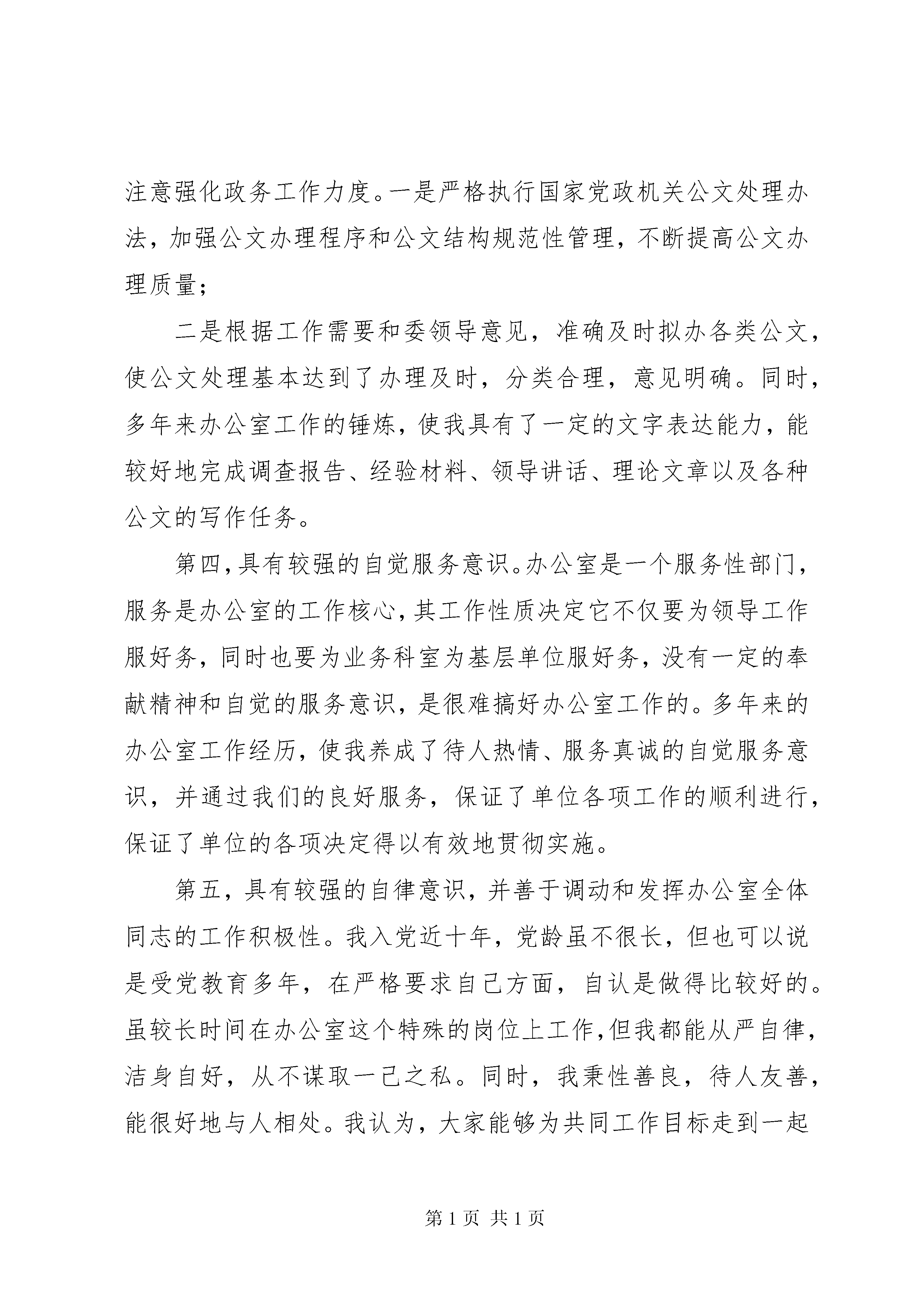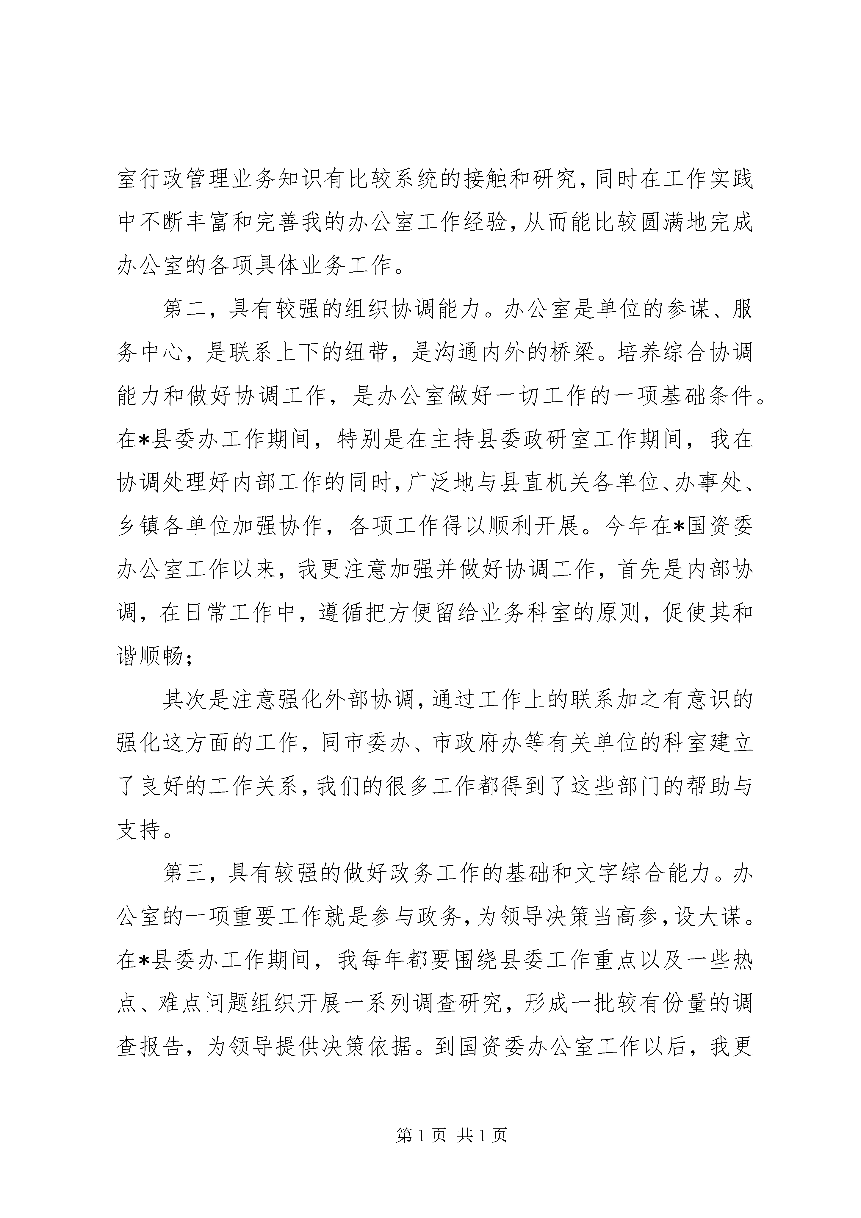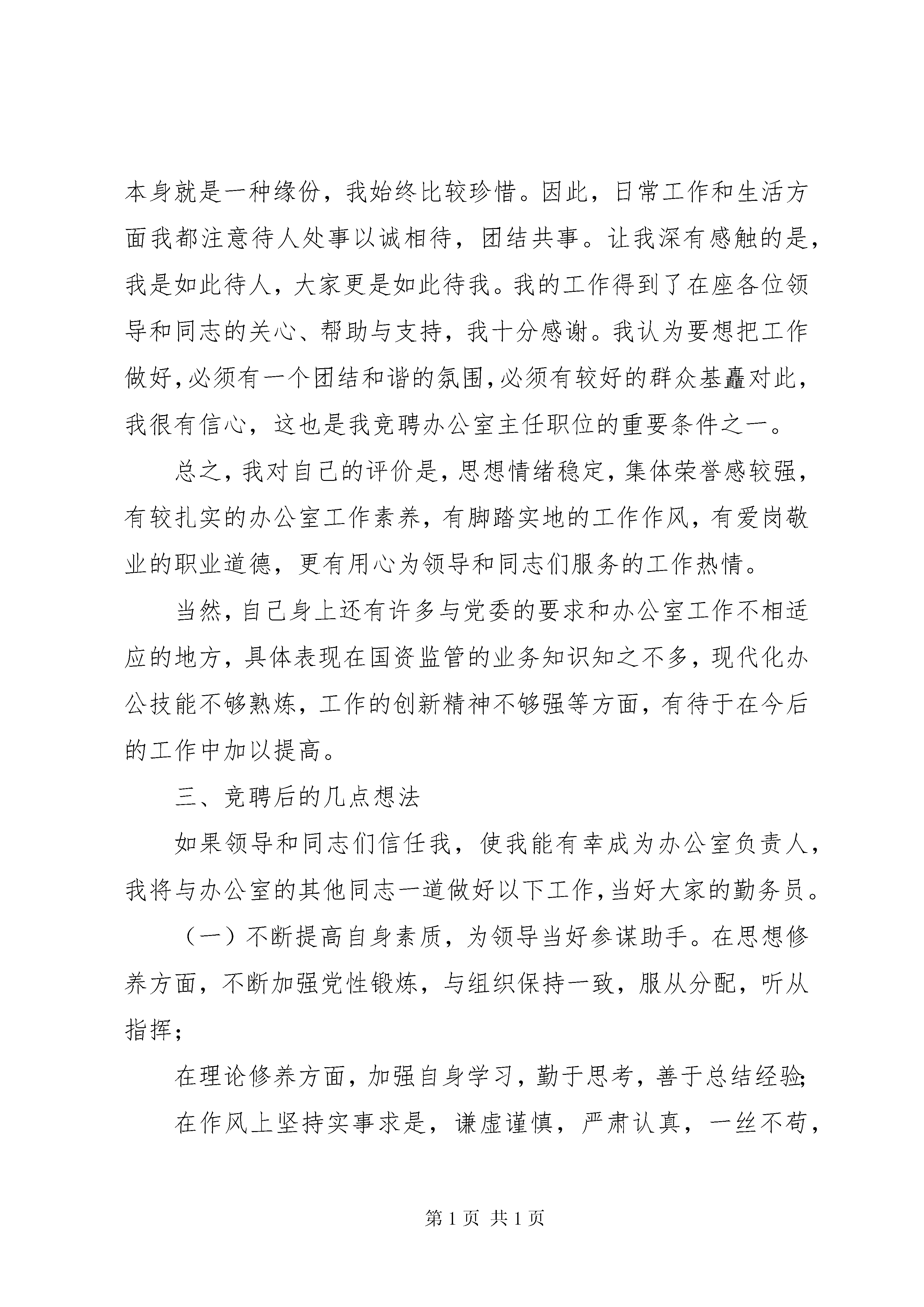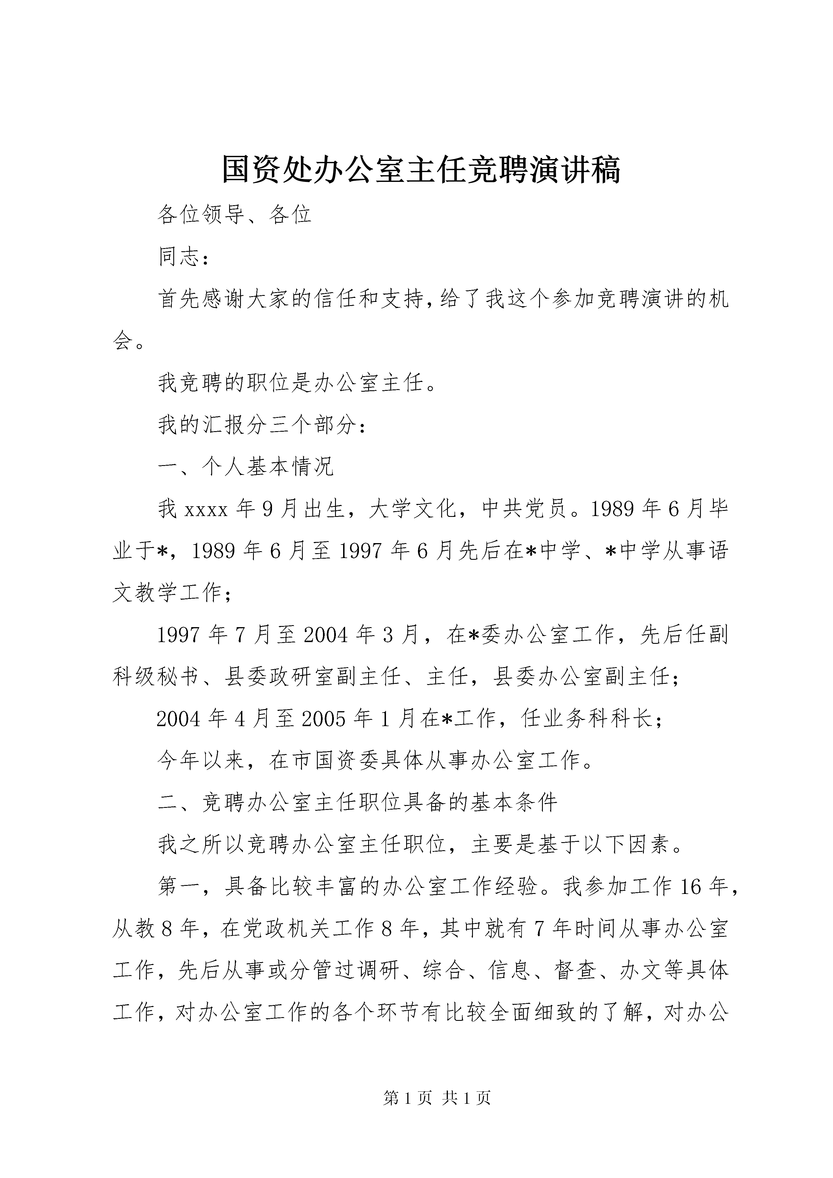 国资处办公室主任竞聘演讲稿各位领导、各位同志:首先感谢大家的信任和支持,给了我这个参加竞聘演讲的机会。我竞聘的职位是办公室主任。我的汇报分三个部分:一、个人基本情况我xxxx年9月出生,大学文化,中共党员。1989年6月毕业于*,1989年6月至1997年6月先后在*中学、*中学从事语文教学工作;1997年7月至2004年3月,在*委办公室工作,先后任副科级秘书、县委政研室副主任、主任,县委办公室副主任;2004年4月至2005年1月在*工作,任业务科科长;今年以来,在市国资委具体从事办公室工作。二、竞聘办公室主任职位具备的基本条件我之所以竞聘办公室主任职位,主要是基于以下因素。第一,具备比较丰富的办公室工作经验。我参加工作16年,从教8年,在党政机关工作8年,其中就有7年时间从事办公室工作,先后从事或分管过调研、综合、信息、督查、办文等具体工作,对办公室工作的各个环节有比较全面细致的了解,对办公室行政管理业务知识有比较系统的接触和研究,同时在工作实践中不断丰富和完善我的办公室工作经验,从而能比较圆满地完成办公室的各项具体业务工作。第二,具有较强的组织协调能力。办公室是单位的参谋、服务中心,是联系上下的纽带,是沟通内外的桥梁。培养综合协调能力和做好协调工作,是办公室做好一切工作的一项基础条件。在*县委办工作期间,特别是在主持县委政研室工作期间,我在协调处理好内部工作的同时,广泛地与县直机关各单位、办事处、乡镇各单位加强协作,各项工作得以顺利开展。今年在*国资委办公室工作以来,我更注意加强并做好协调工作,首先是内部协调,在日常工作中,遵循把方便留给业务科室的原则,促使其和谐顺畅;其次是注意强化外部协调,通过工作上的联系加之有意识的强化这方面的工作,同市委办、市政府办等有关单位的科室建立了良好的工作关系,我们的很多工作都得到了这些部门的帮助与支持。第三,具有较强的做好政务工作的基础和文字综合能力。办公室的一项重要工作就是参与政务,为领导决策当高参,设大谋。在*县委办工作期间,我每年都要围绕县委工作重点以及一些热点、难点问题组织开展一系列调查研究,形成一批较有份量的调查报告,为领导提供决策依据。到国资委办公室工作以后,我更注意强化政务工作力度。一是严格执行国家党政机关公文处理办法,加强公文办理程序和公文结构规范性管理,不断提高公文办理质量;二是根据工作需要和委领导意见,准确及时拟办各类公文,使公文处理基本达到了办理及时,分类合理,意见明确。同时,多年来办公室工作的锤炼,使我具有了一定的文字表达能力,能较好地完成调查报告、经验材料、领导讲话、理论文章以及各种公文的写作任务。第四,具有较强的自觉服务意识。办公室是一个服务性部门,服务是办公室的工作核心,其工作性质决定它不仅要为领导工作服好务,同时也要为业务科室为基层单位服好务,没有一定的奉献精神和自觉的服务意识,是很难搞好办公室工作的。多年来的办公室工作经历,使我养成了待人热情、服务真诚的自觉服务意识,并通过我们的良好服务,保证了单位各项工作的顺利进行,保证了单位的各项决定得以有效地贯彻实施。第五,具有较强的自律意识,并善于调动和发挥办公室全体同志的工作积极性。我入党近十年,党龄虽不很长,但也可以说是受党教育多年,在严格要求自己方面,自认是做得比较好的。虽较长时间在办公室这个特殊的岗位上工作,但我都能从严自律,洁身自好,从不谋取一己之私。同时,我秉性善良,待人友善,能很好地与人相处。我认为,大家能够为共同工作目标走到一起本身就是一种缘份,我始终比较珍惜。因此,日常工作和生活方面我都注意待人处事以诚相待,团结共事。让我深有感触的是,我是如此待人,大家更是如此待我。我的工作得到了在座各位领导和同志的关心、帮助与支持,我十分感谢。我认为要想把工作做好,必须有一个团结和谐的氛围,必须有较好的群众基矗对此,我很有信心,这也是我竞聘办公室主任职位的重要条件之一。总之,我对自己的评价是,思想情绪稳定,集体荣誉感较强,有较扎实的办公室工作素养,有脚踏实地的工作作风,有爱岗敬业的职业道德,更有用心为领导和同志们服务的工作热情。当然,自己身上还有许多与党委的要求和办公室工作不相适应的地方,具体表现在国资监管的业务知识知之不多,现代化办公技能不够熟炼,工作的创新精神不够强等方面,有待于在今后的工作中加以提高。三、竞聘后的几点想法如果领导和同志们信任我,使我能有幸成为办公室负责人,我将与办公室的其他同志一道做好以下工作,当好大家的勤务员。(一)不断提高自身素质,为领导当好参谋助手。在思想修养方面,不断加强党性锻炼,与组织保持一致,服从分配,听从指挥;在理论修养方面,加强自身学习,勤于思考,善于总结经验;在作风上坚持实事求是,谦虚谨慎,严肃认真,一丝不苟,精益求精;在具体工作中,注重落实